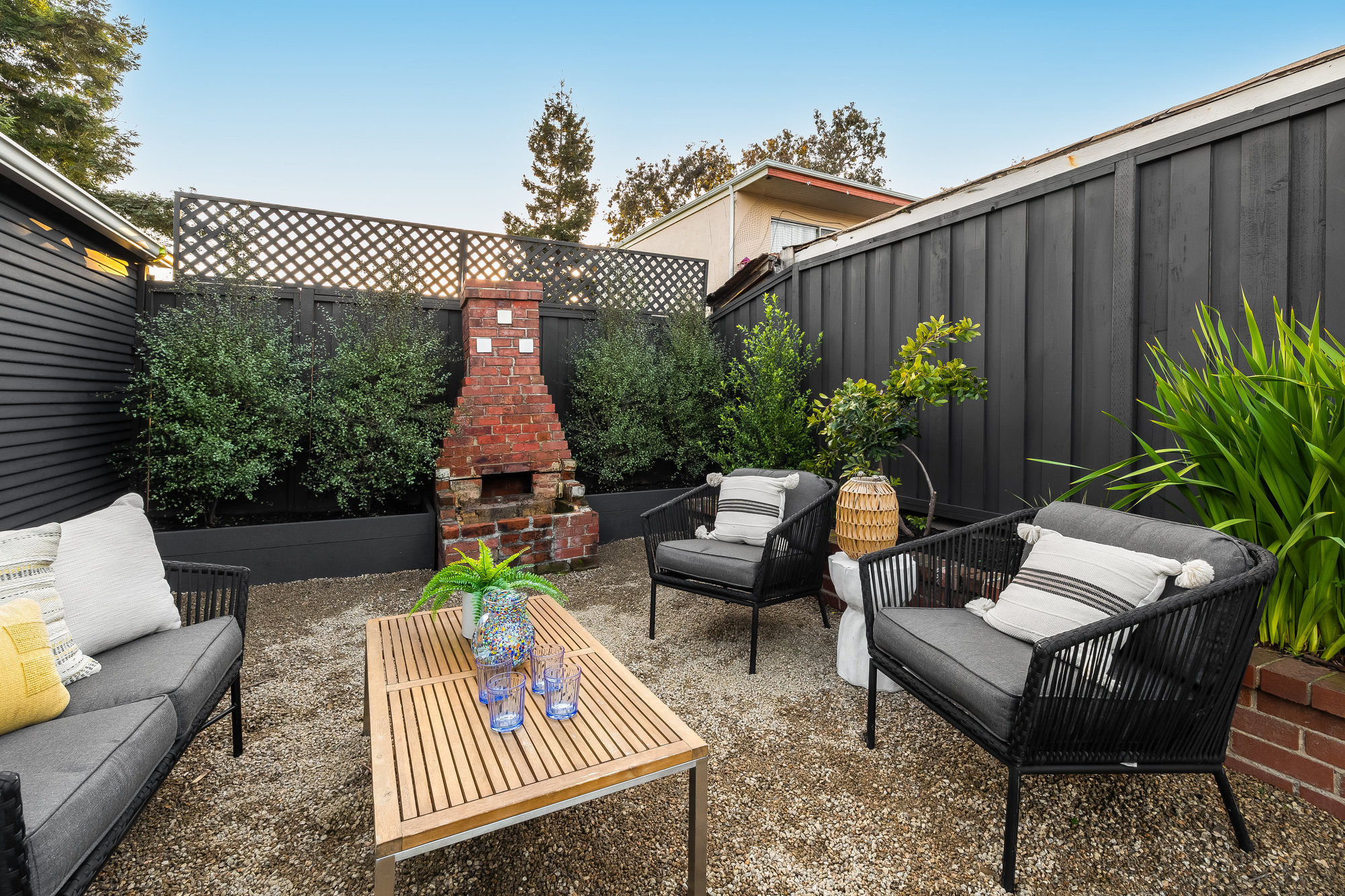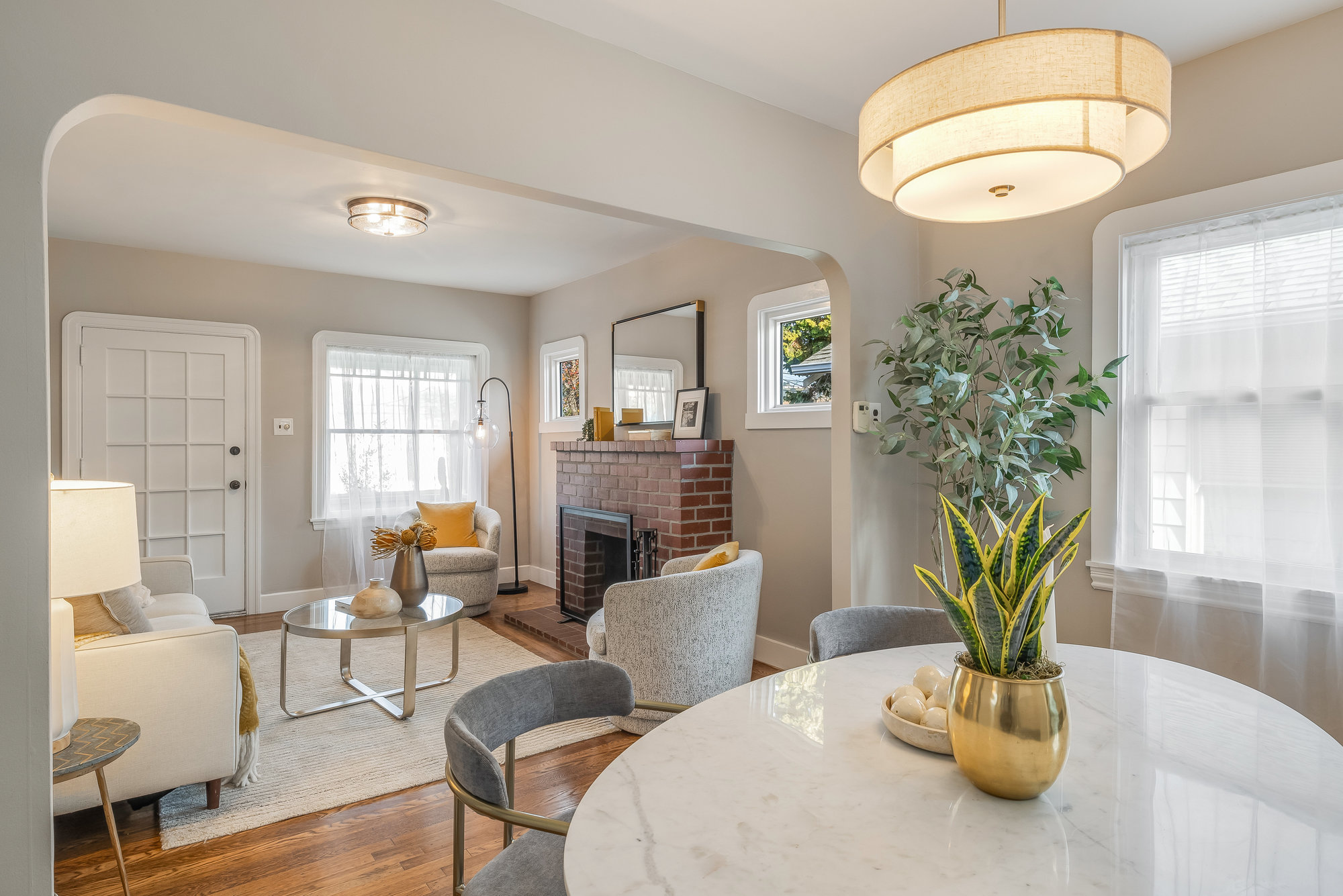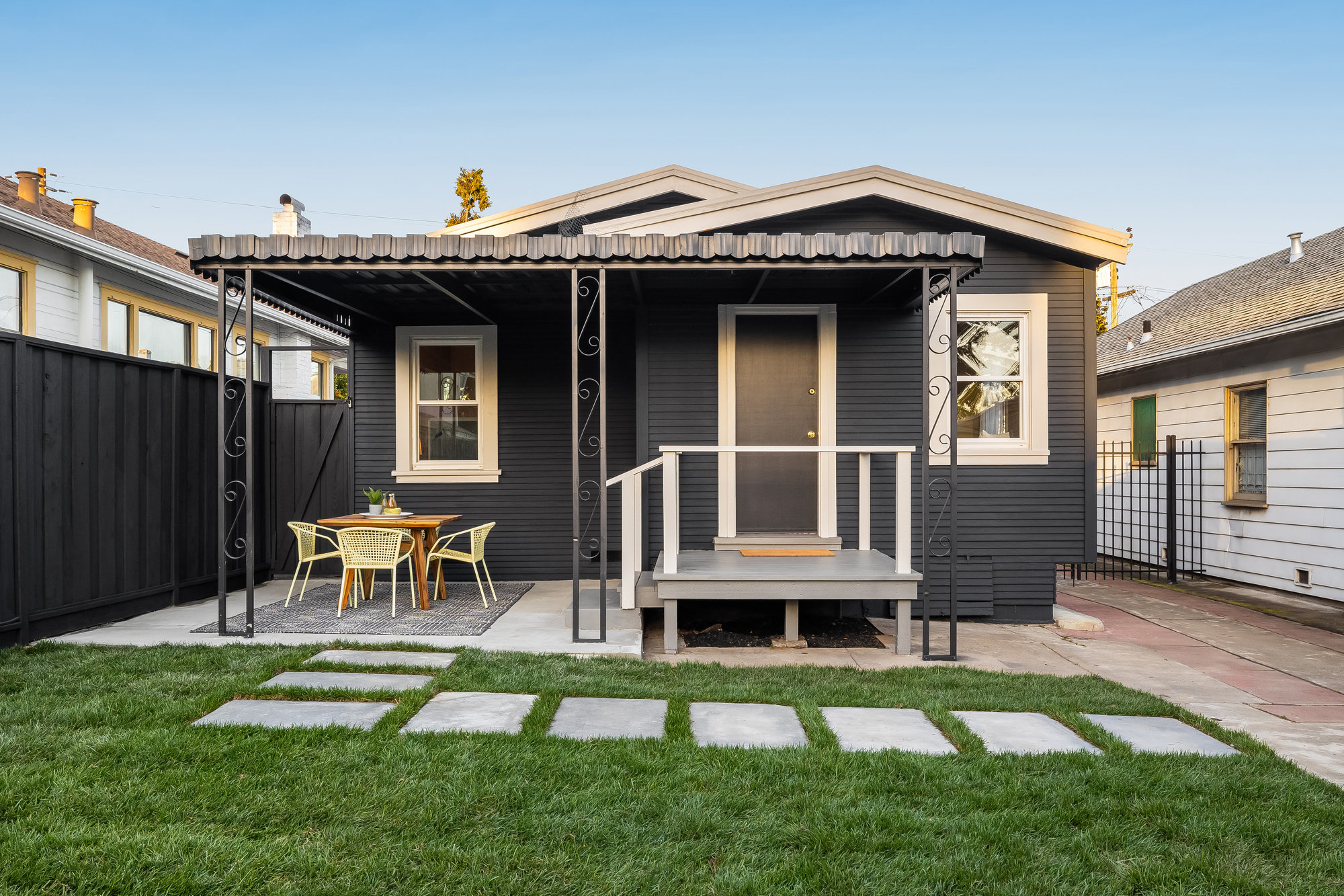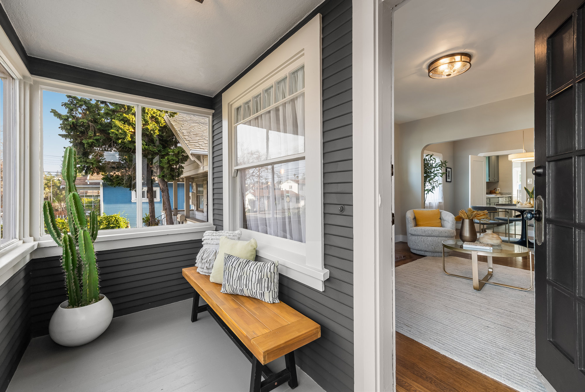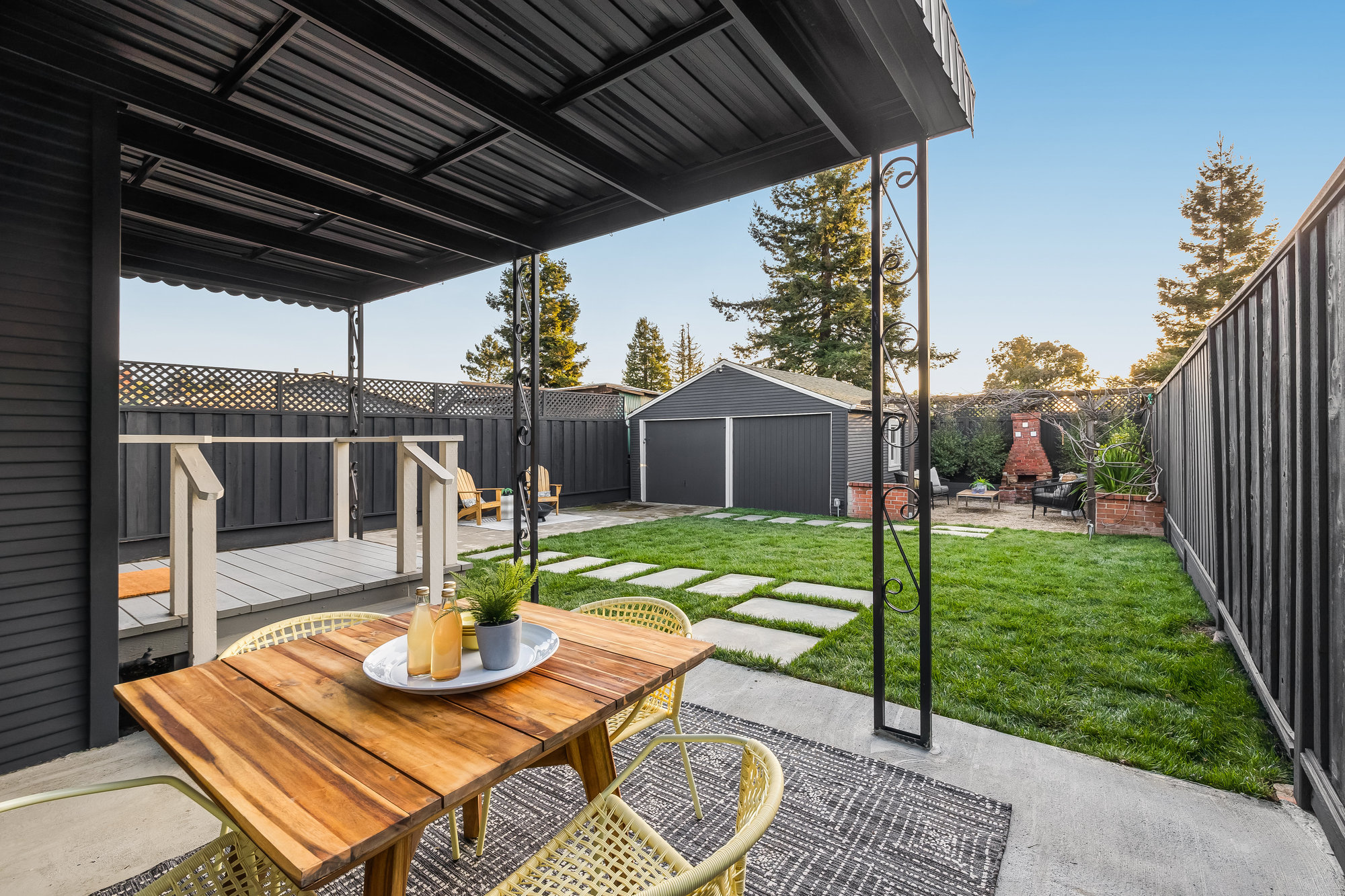 Enclosed front porch ideal for storm watching. Cozy living room with wood-burning fireplace and dining room. Kitchen featuring stone counters, gas range, stainless appliances and abundant cabinet space opening to a family room leading onto the rear gardens. Two ideally sized bedrooms. Hall bath with wainscoting walls, classic pedestal sink, shower over tub and subway tile shower surround. Covered rear patio leading to expansive grassy yard with floating steps and additional lounge area. Large, two-car detached garage with flex-space for hobbies, activities or potential expansion. Additional features include a laundry closet with washer and dryer, and wiring for future EV charger. Just blocks from the fabulous Laurel District cafes, bars, markets and bakeries, and quick access to I-580 to the Bay Bridge and San Francisco.