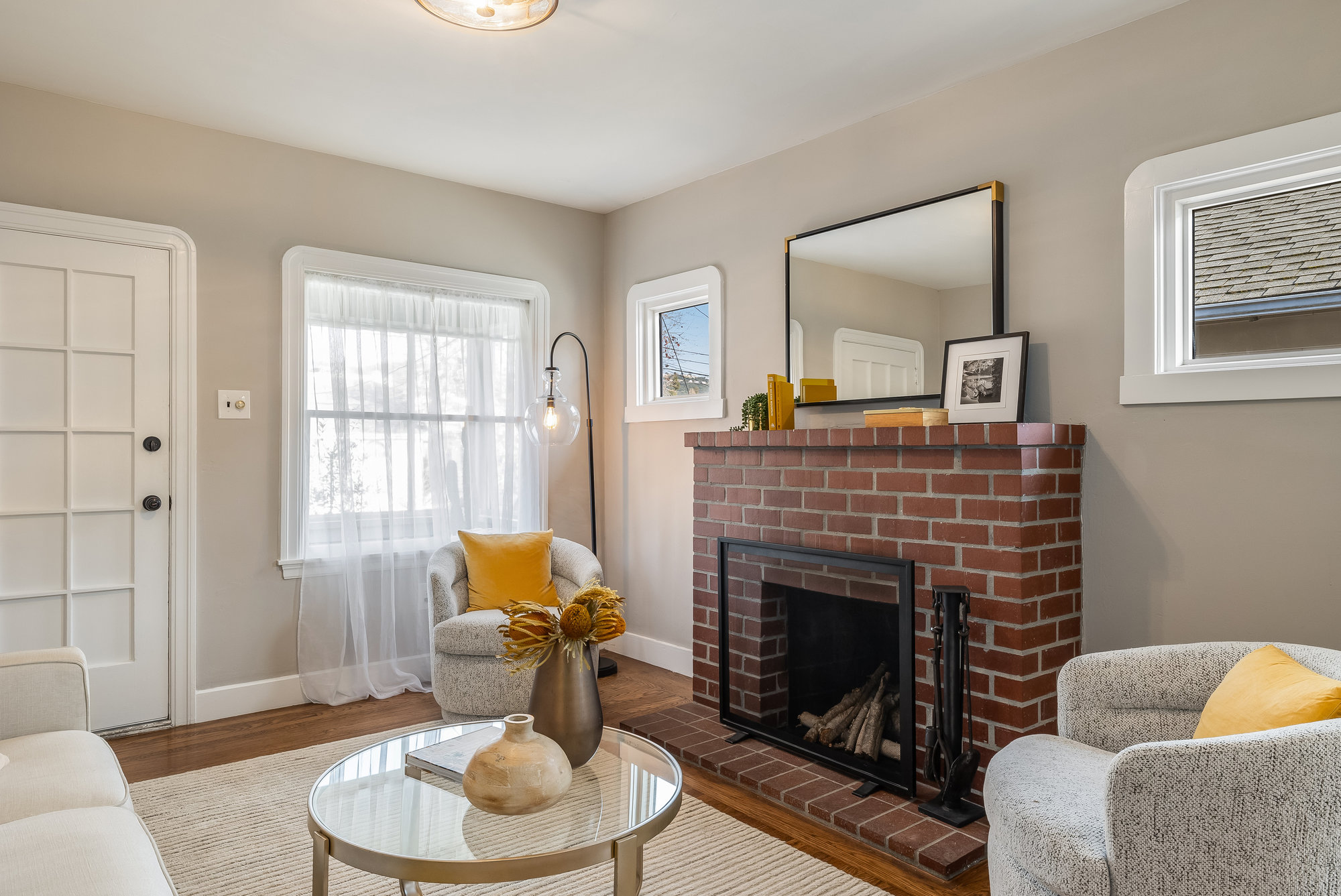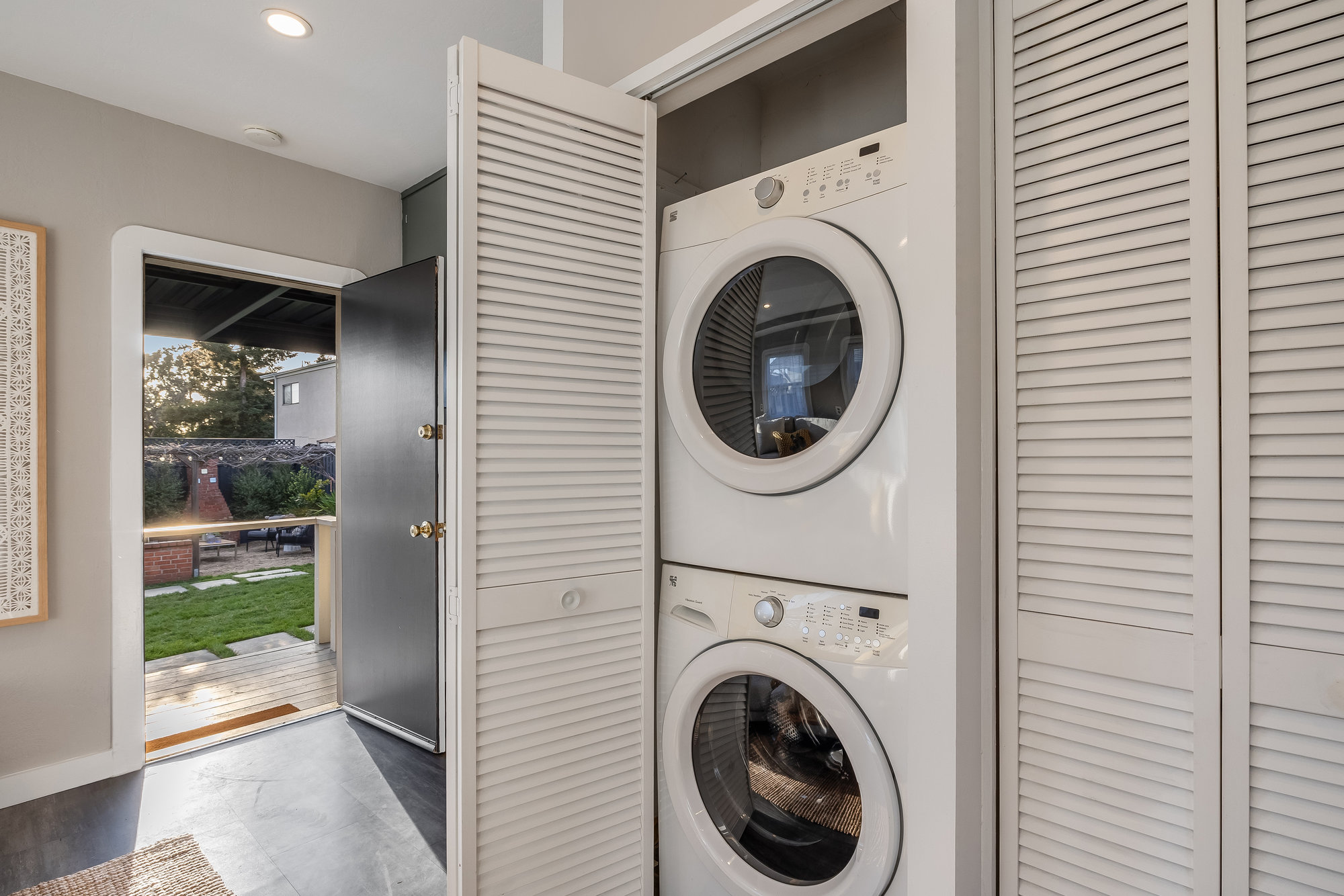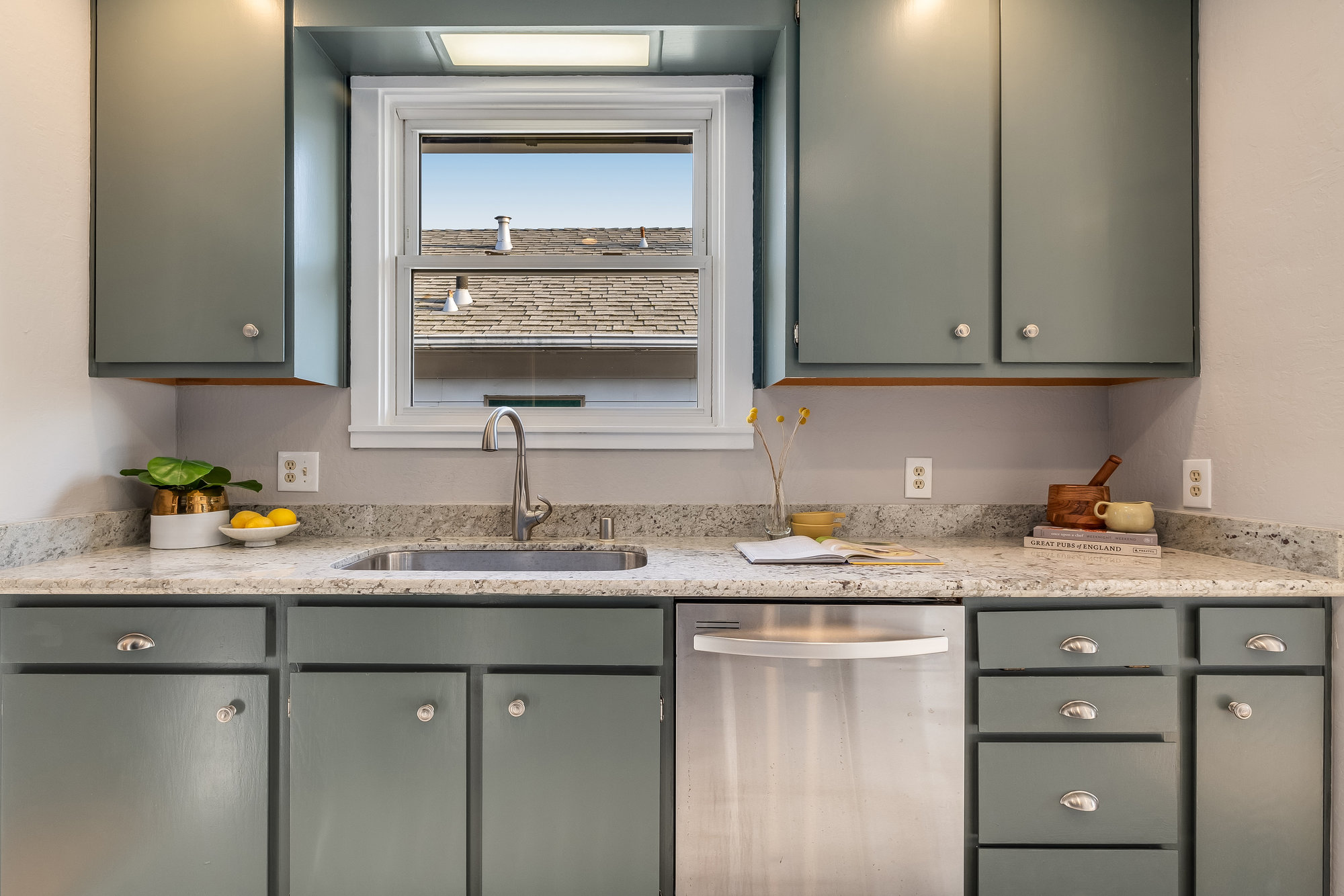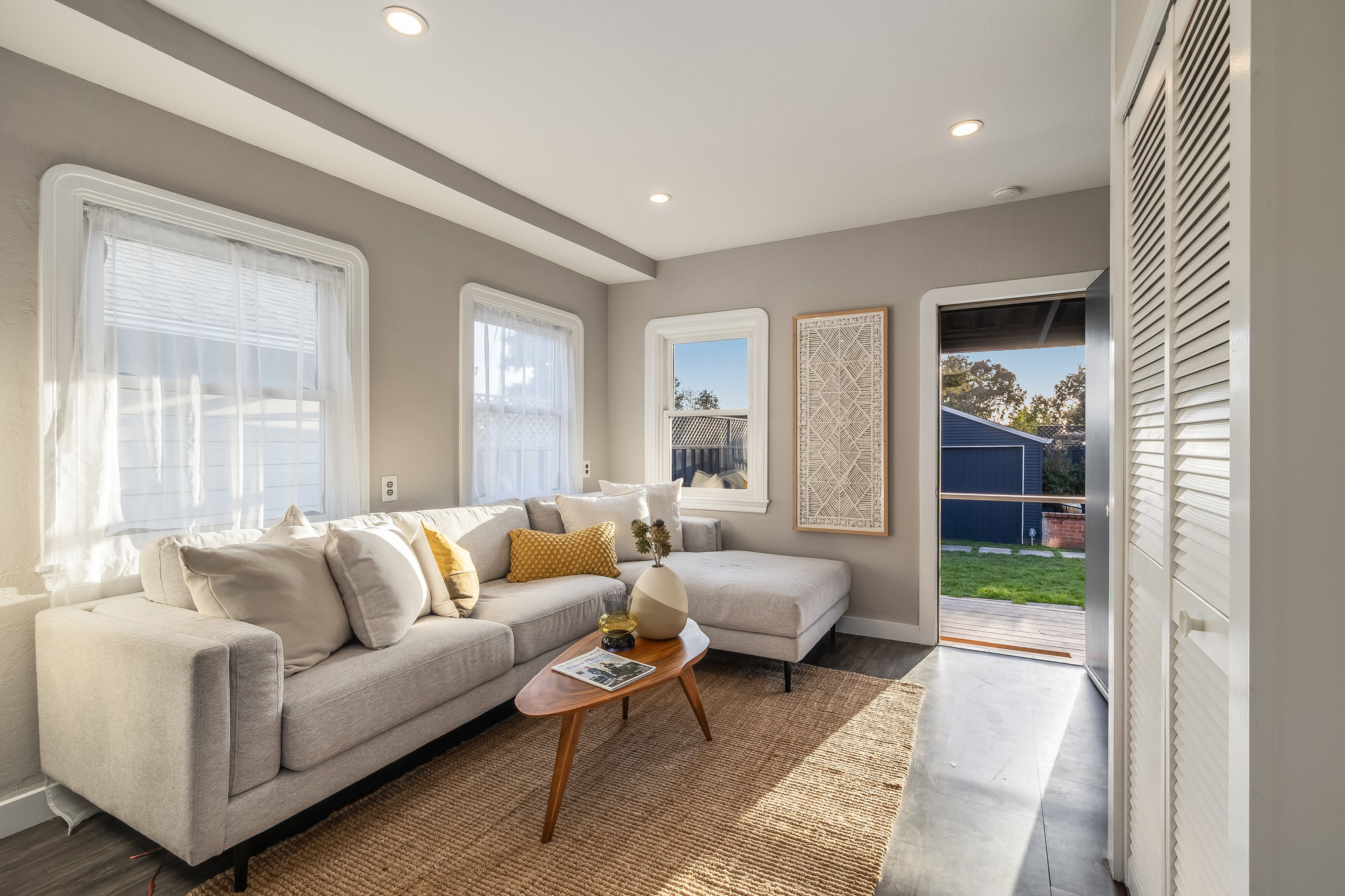 Enclosed front porch ideal for storm watching. Cozy living room with wood-burning fireplace and dining room. Kitchen featuring stone counters, gas range, stainless appliances and abundant cabinet space opening to a family room leading onto the rear gardens. Two ideally sized bedrooms. Hall bath with wainscoting walls, classic pedestal sink, shower over tub and subway tile shower surround. Covered rear patio leading to expansive grassy yard with floating steps and additional lounge area. Large, two-car detached garage with flex-space for hobbies, activities or potential expansion. Additional features include a laundry closet with washer and dryer, and wiring for future EV charger. Just blocks from the fabulous Laurel District cafes, bars, markets and bakeries, and quick access to I-580 to the Bay Bridge and San Francisco.