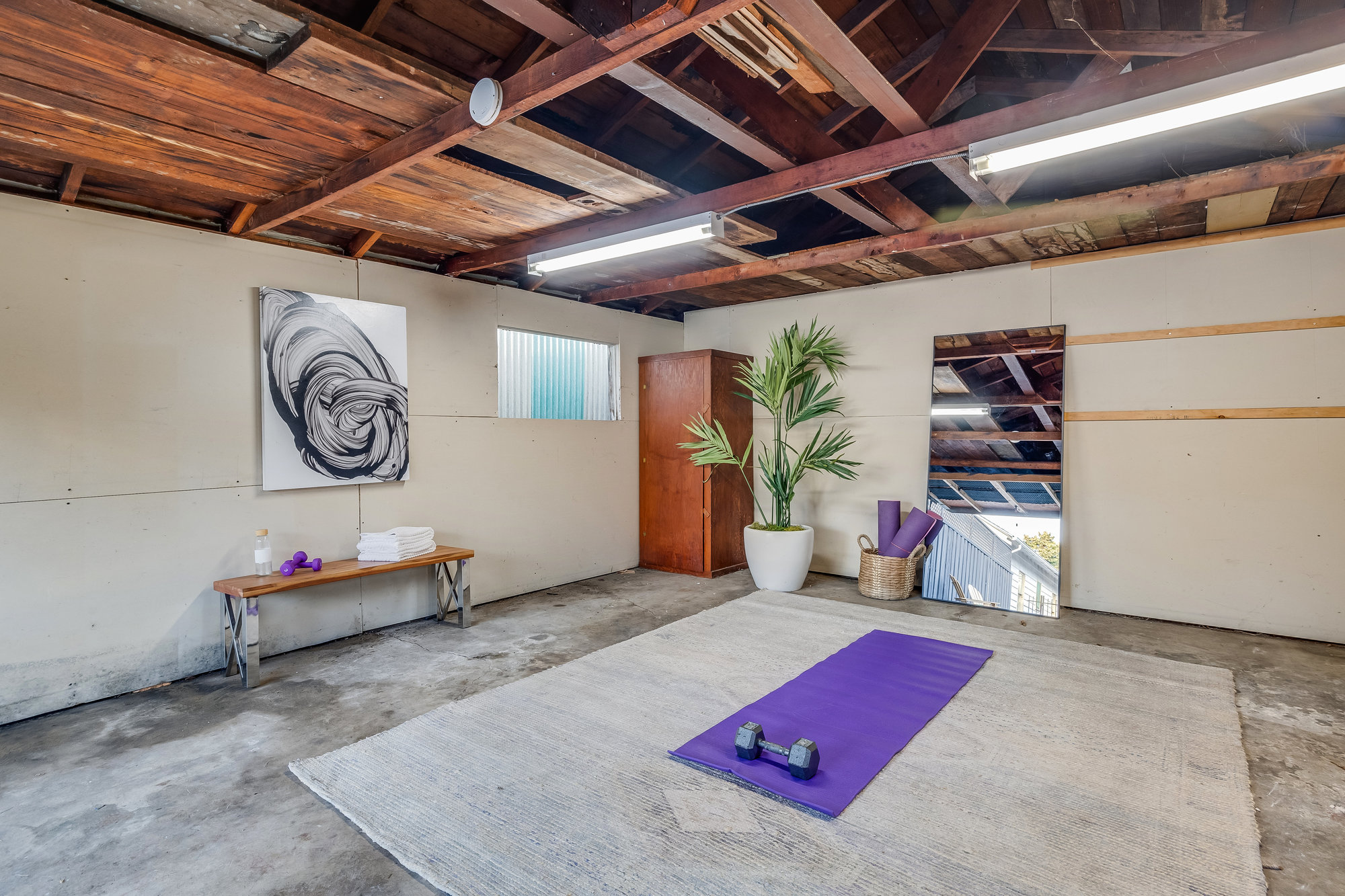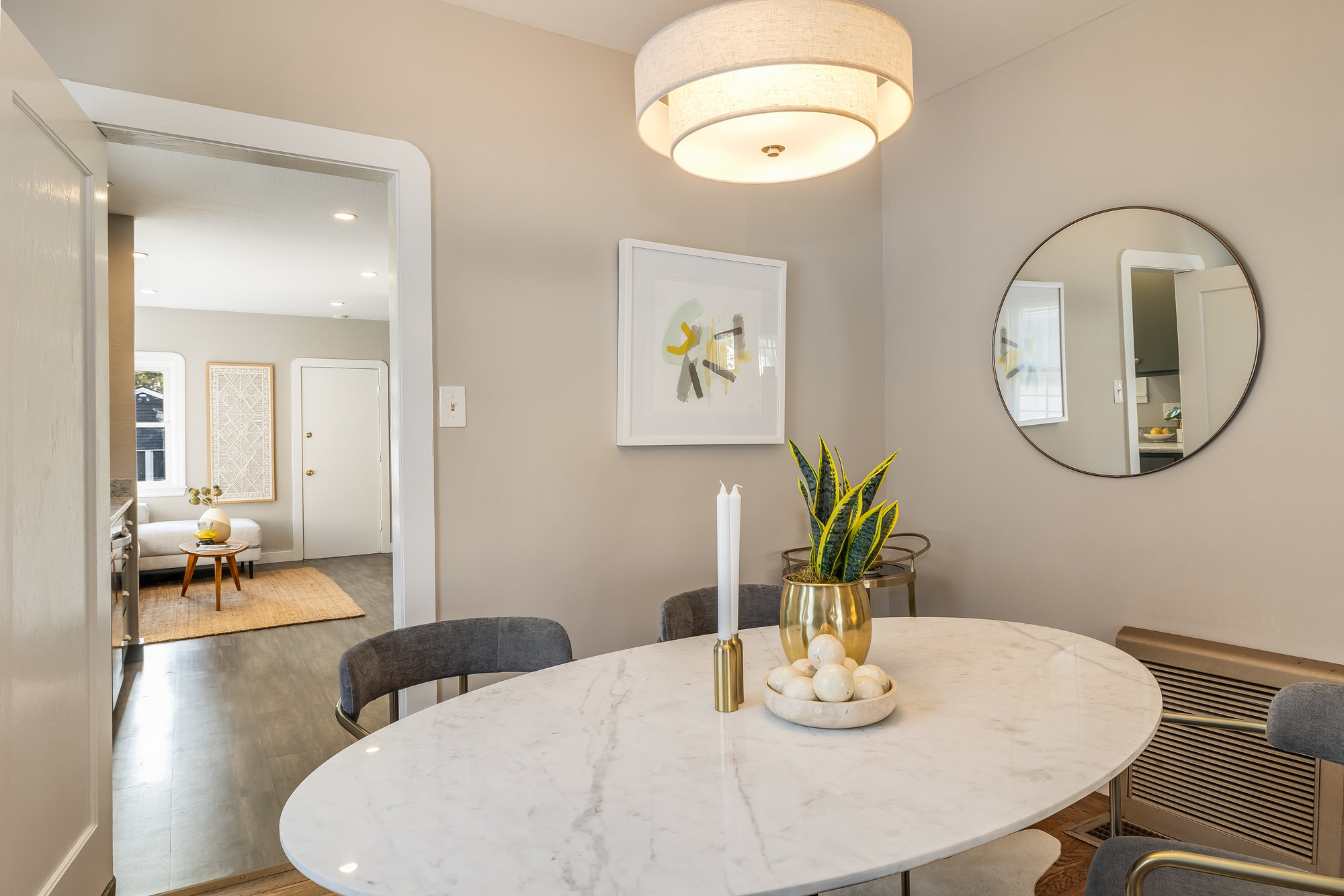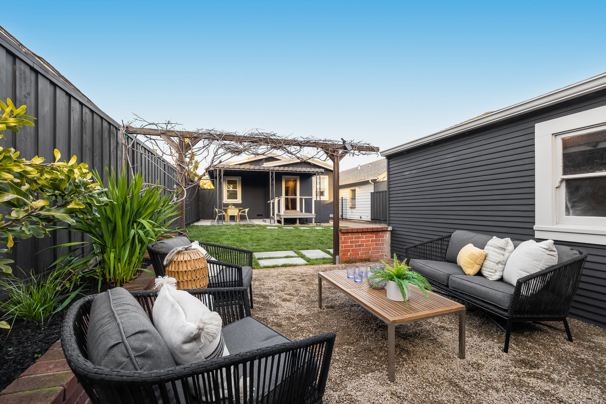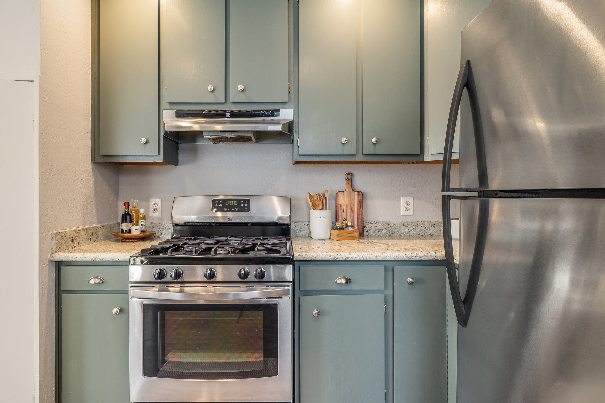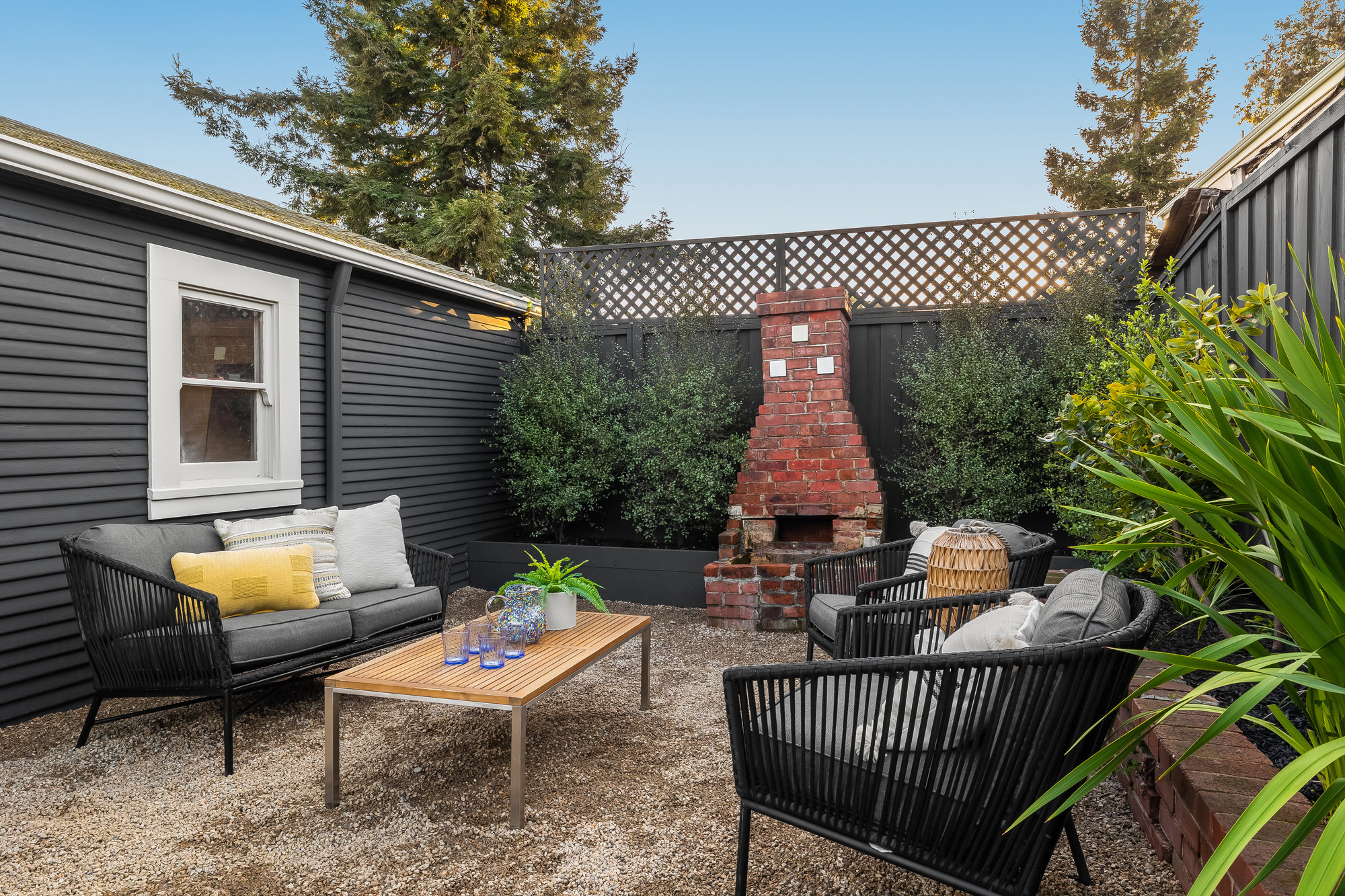 Enclosed front porch ideal for storm watching. Cozy living room with wood-burning fireplace and dining room. Kitchen featuring stone counters, gas range, stainless appliances and abundant cabinet space opening to a family room leading onto the rear gardens. Two ideally sized bedrooms. Hall bath with wainscoting walls, classic pedestal sink, shower over tub and subway tile shower surround. Covered rear patio leading to expansive grassy yard with floating steps and additional lounge area. Large, two-car detached garage with flex-space for hobbies, activities or potential expansion. Additional features include a laundry closet with washer and dryer, and wiring for future EV charger. Just blocks from the fabulous Laurel District cafes, bars, markets and bakeries, and quick access to I-580 to the Bay Bridge and San Francisco.