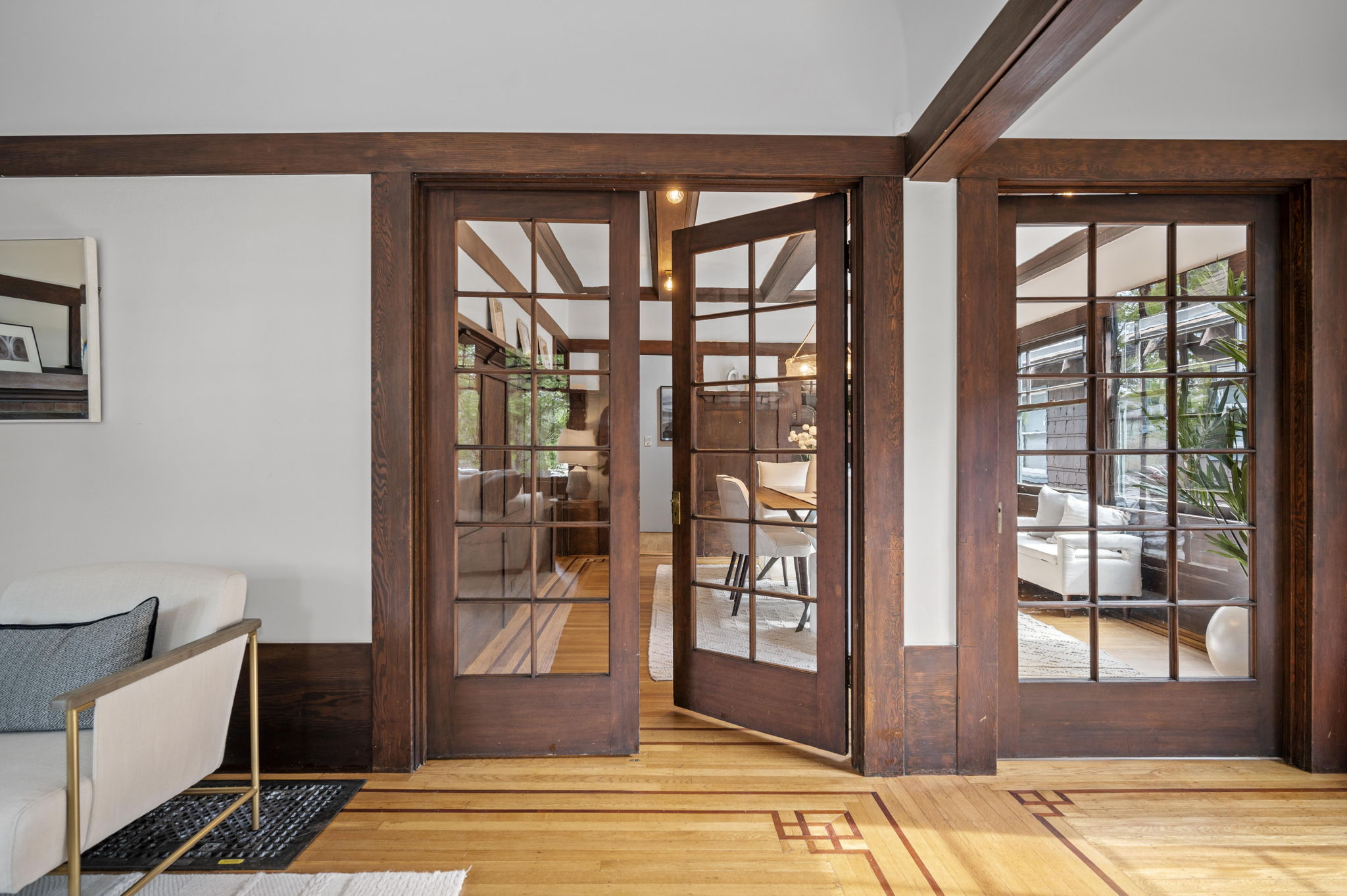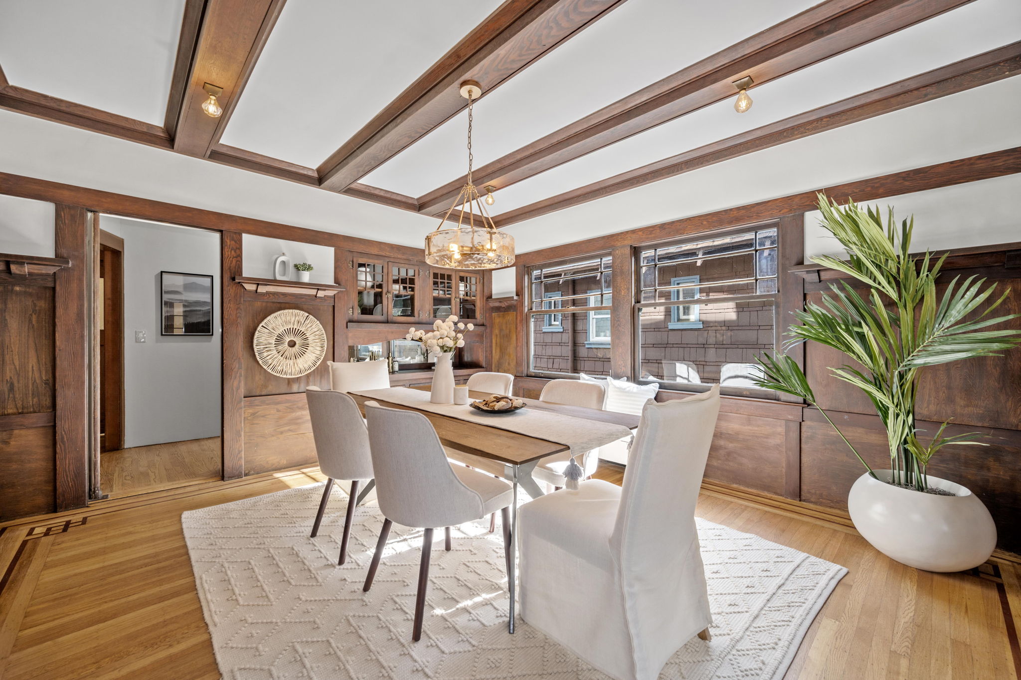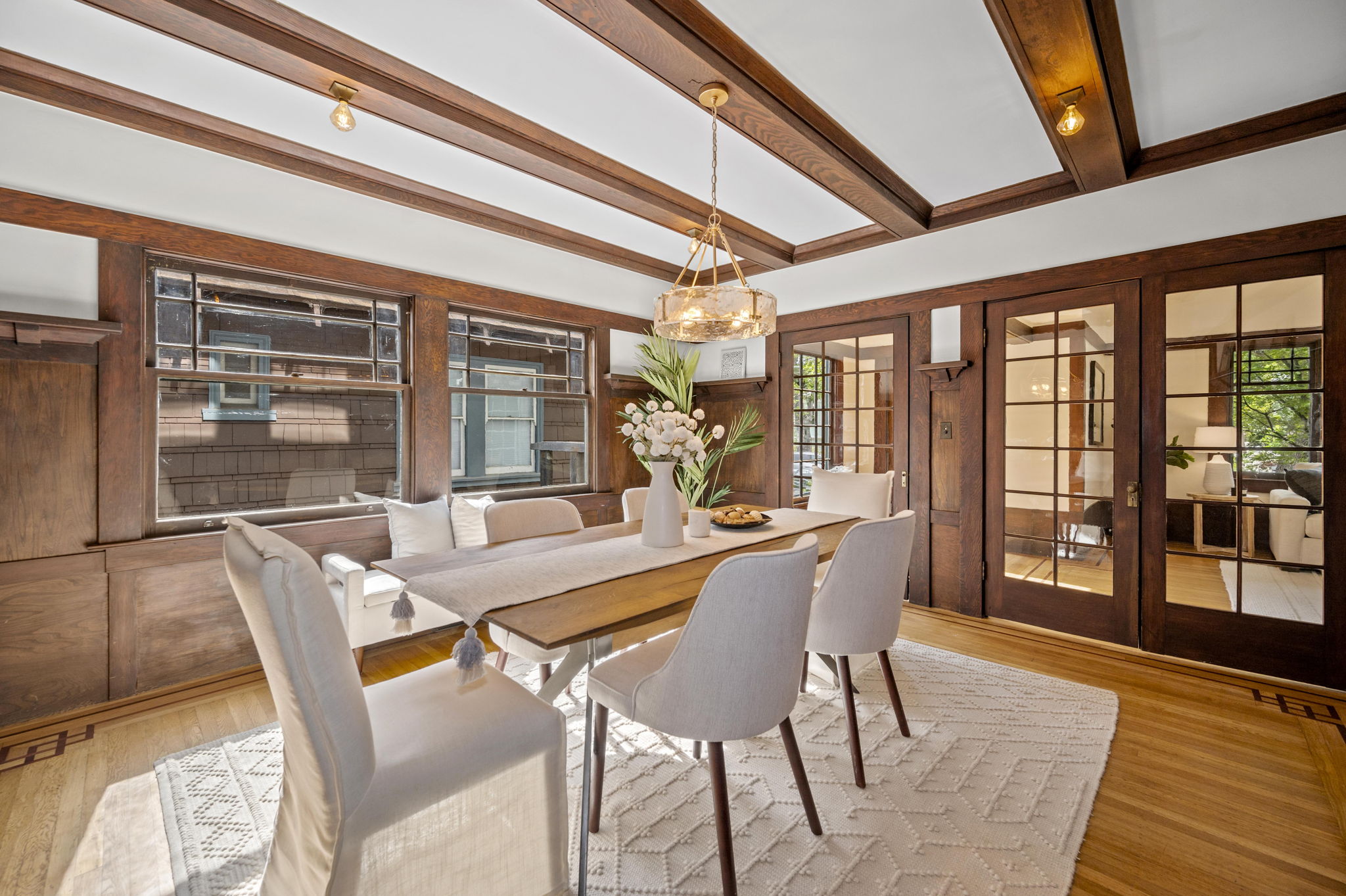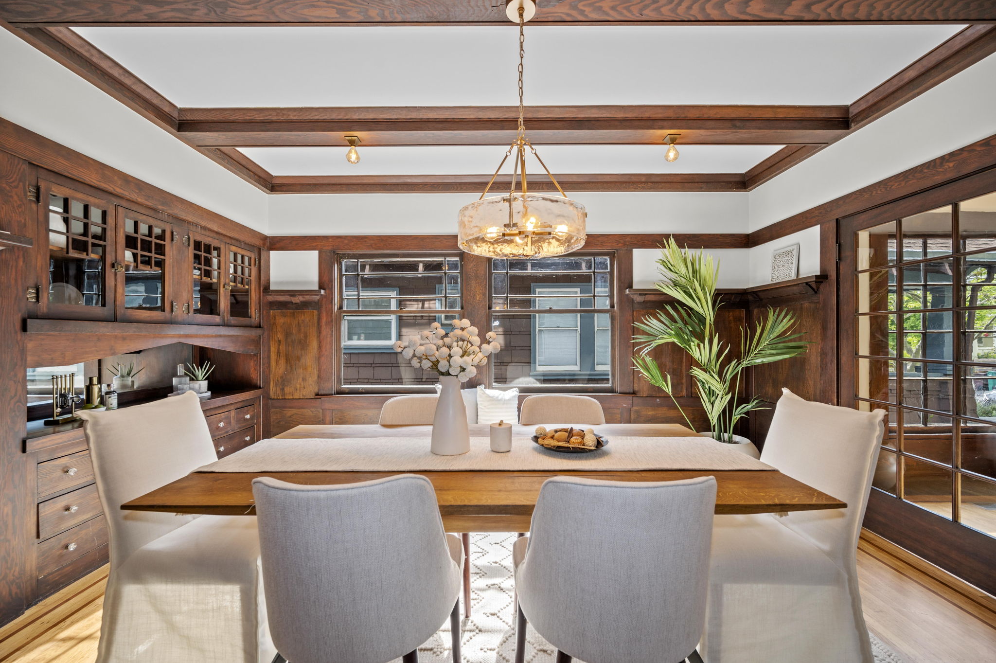 The stunning dining room features an 18 window pane door, box beam ceilings and built-ins perfectly preserved in their original detail. The charming living room features large windows, wood burning fireplace and hardwood floors with ebony inlays.