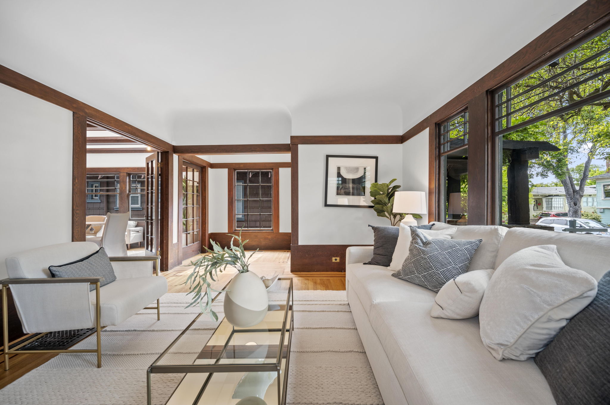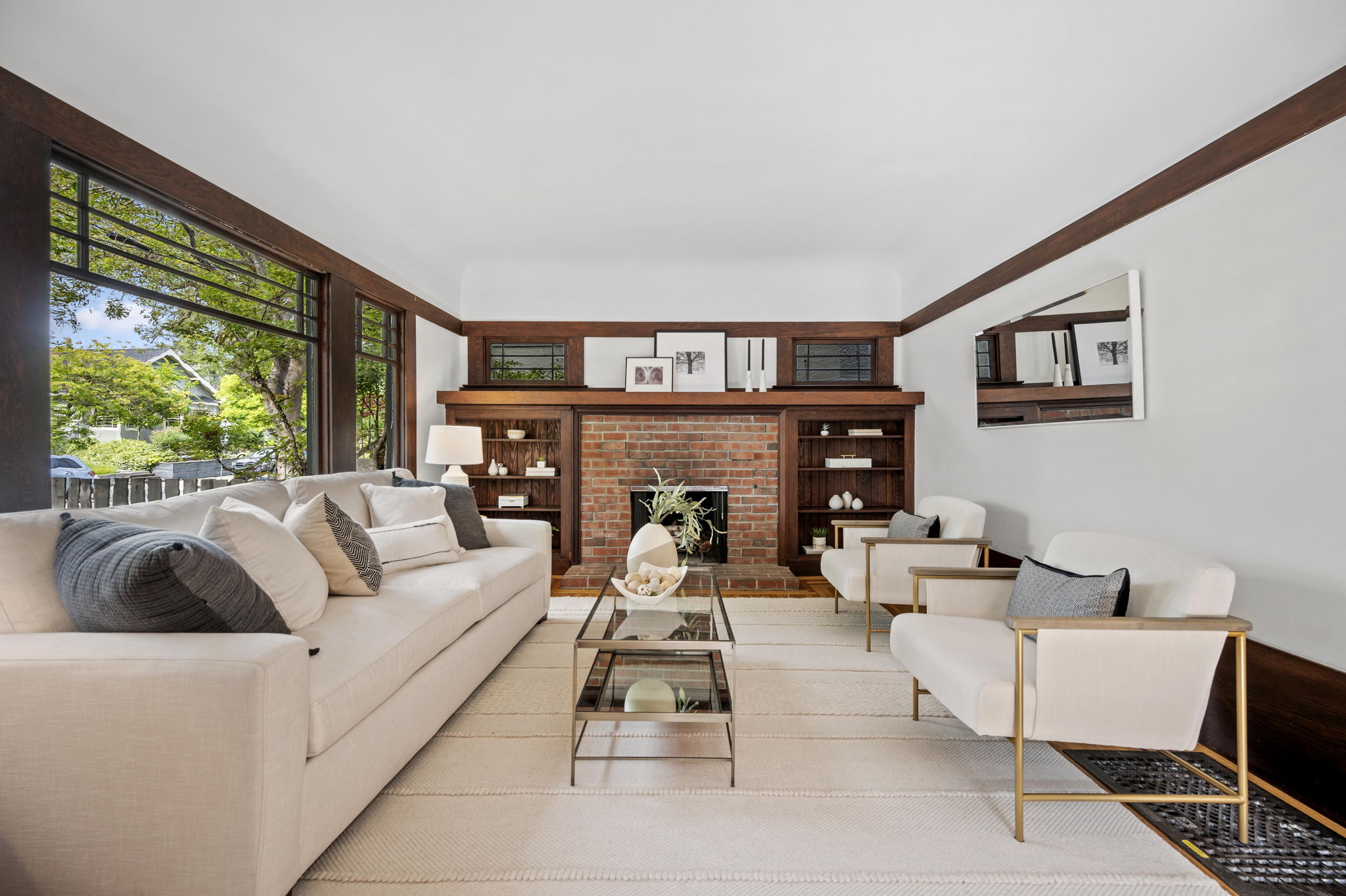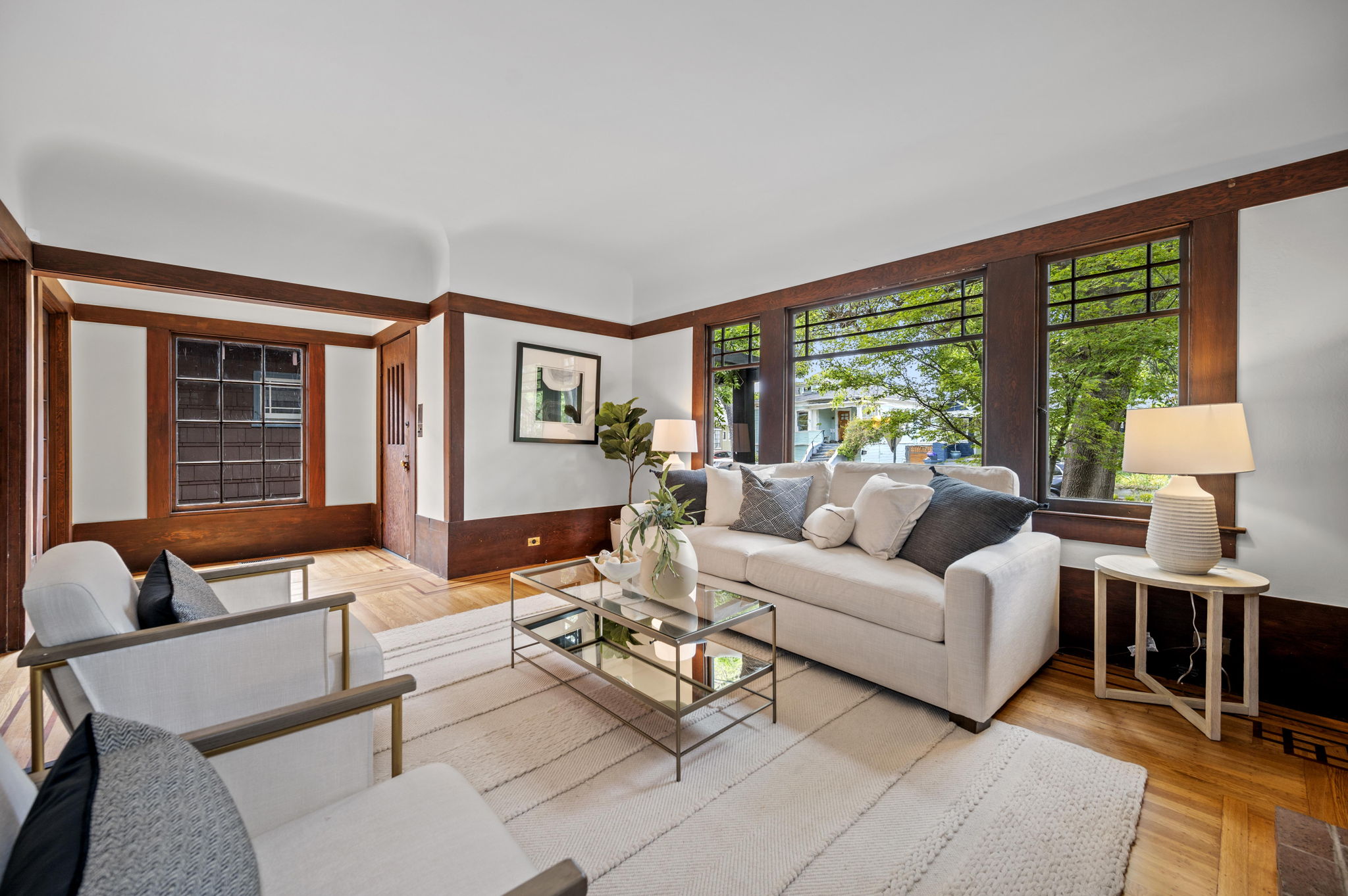 The stunning dining room features an 18 window pane door, box beam ceilings and built-ins perfectly preserved in their original detail. The charming living room features large windows, wood burning fireplace and hardwood floors with ebony inlays.