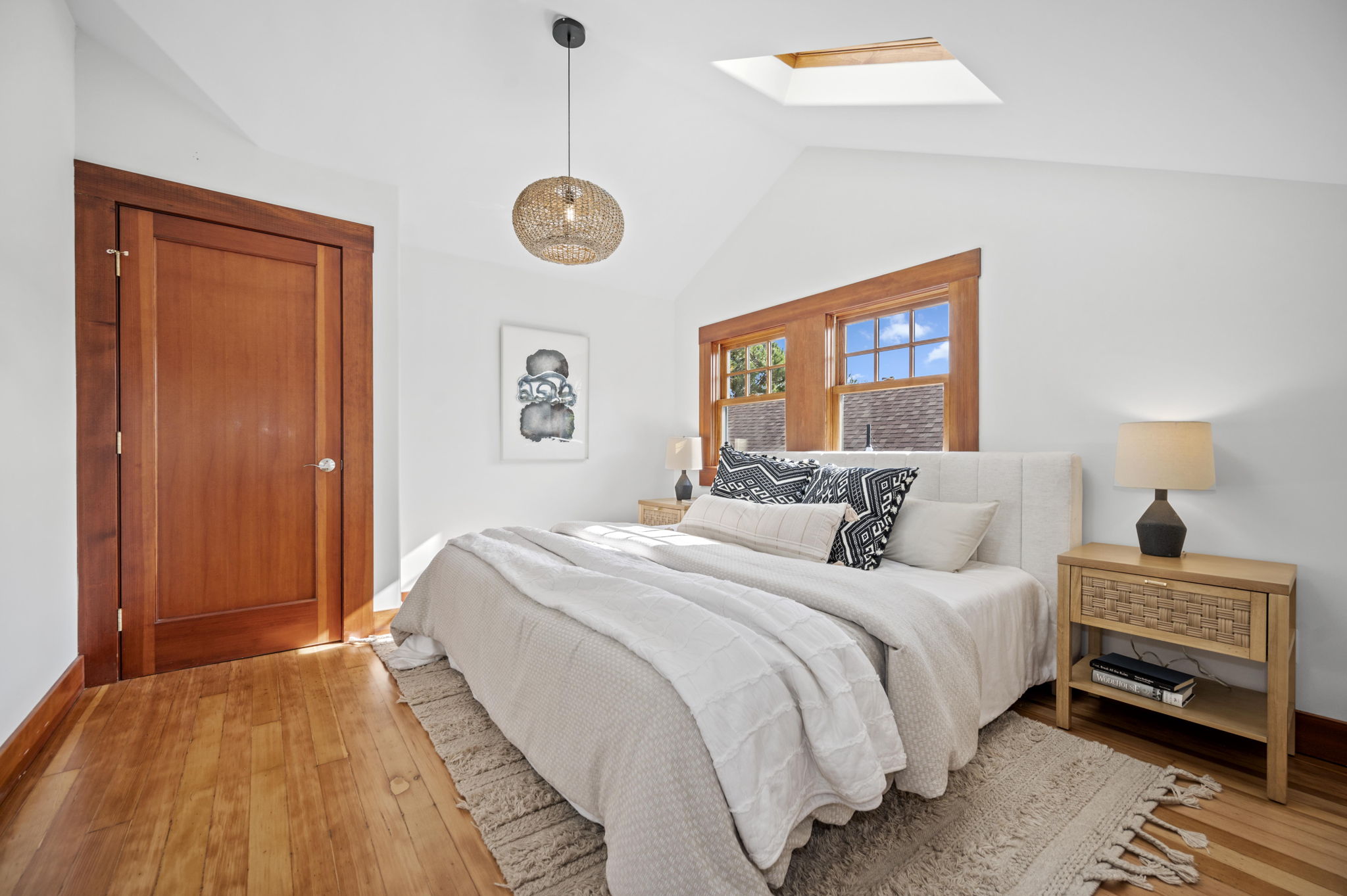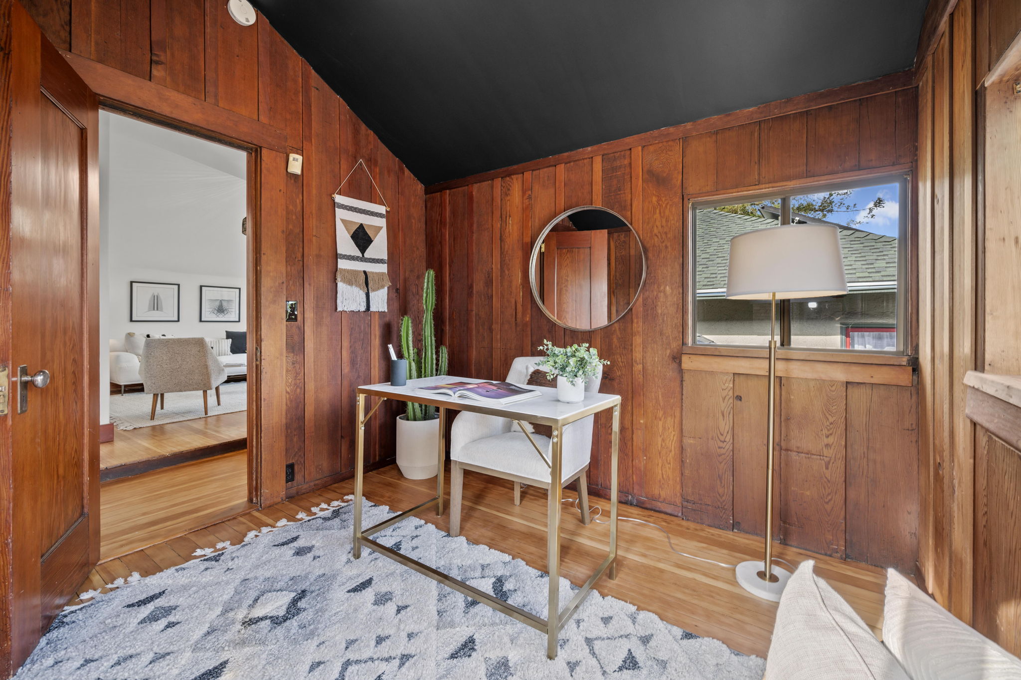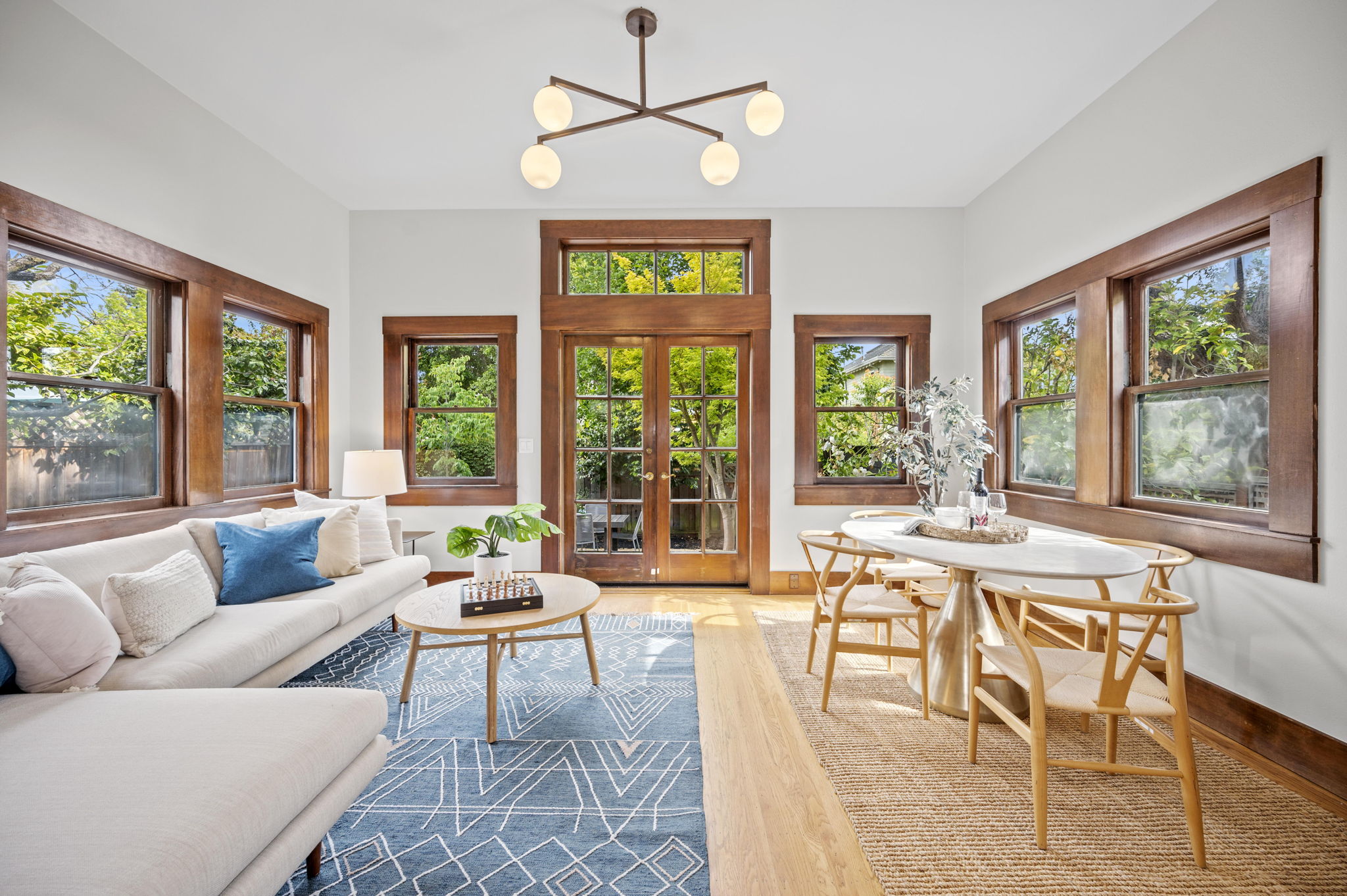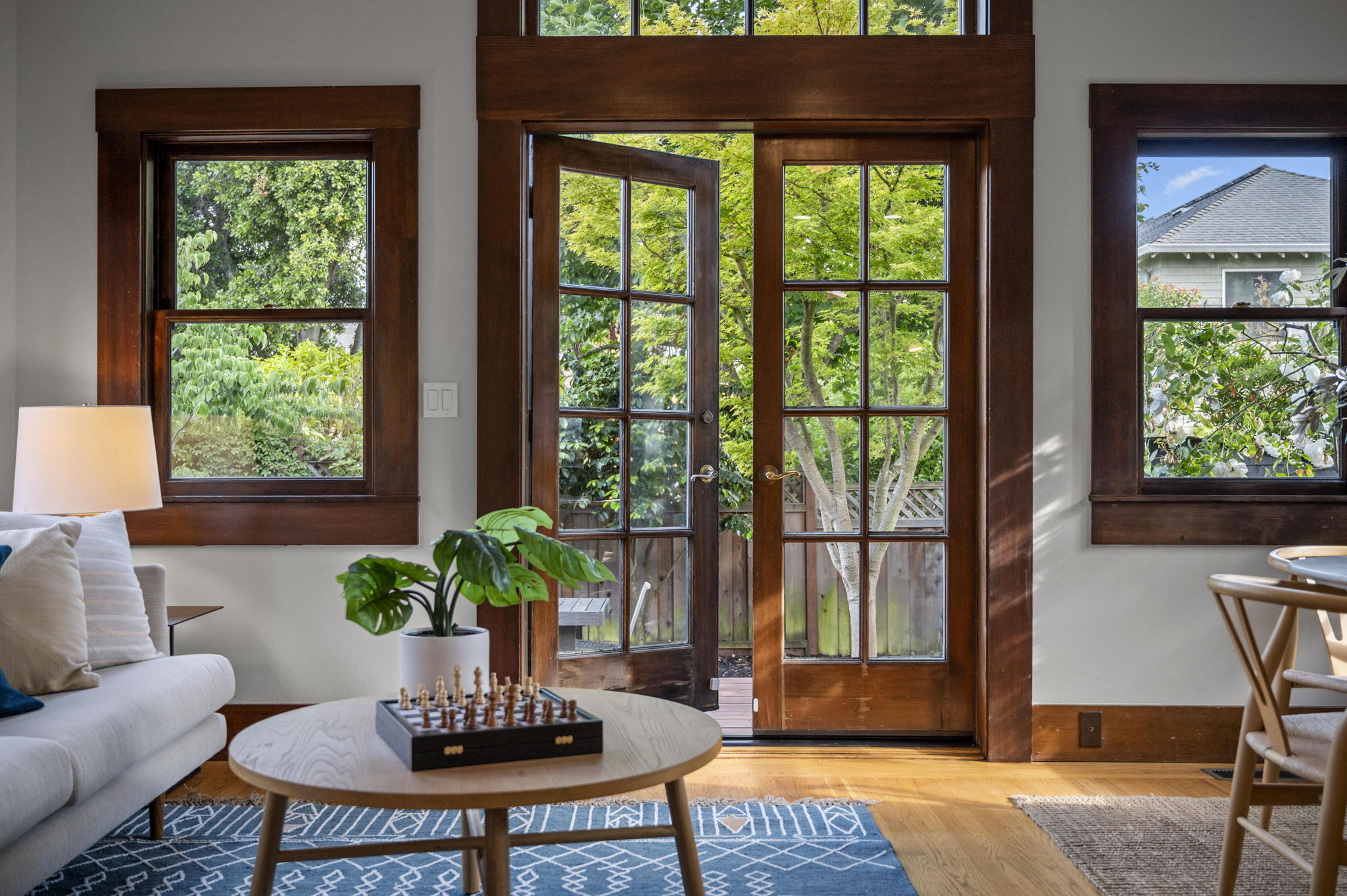 The stunning dining room features an 18 window pane door, box beam ceilings and built-ins perfectly preserved in their original detail. The charming living room features large windows, wood burning fireplace and hardwood floors with ebony inlays.