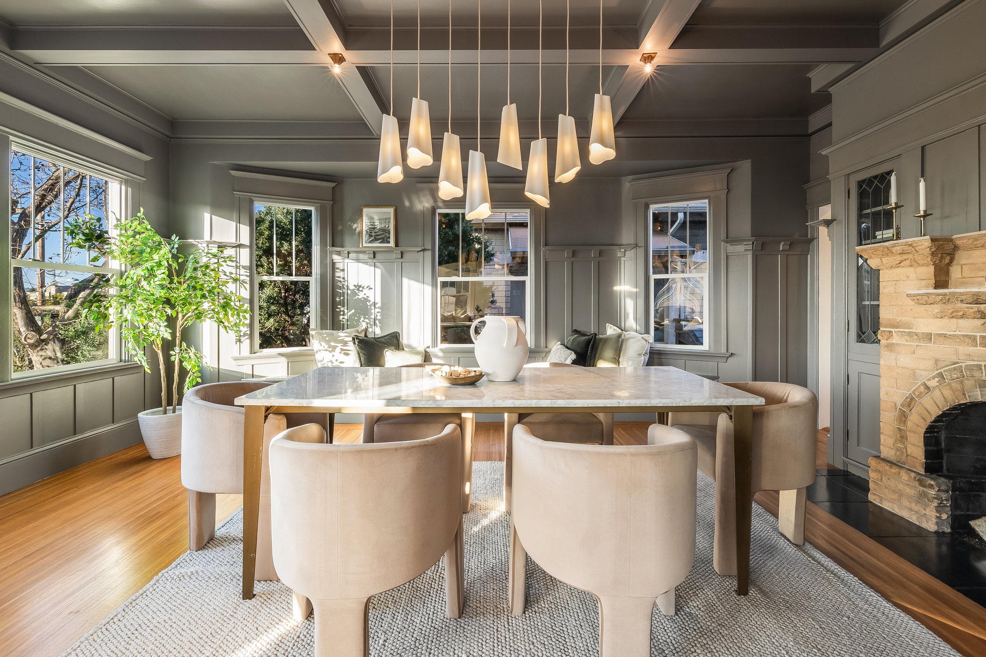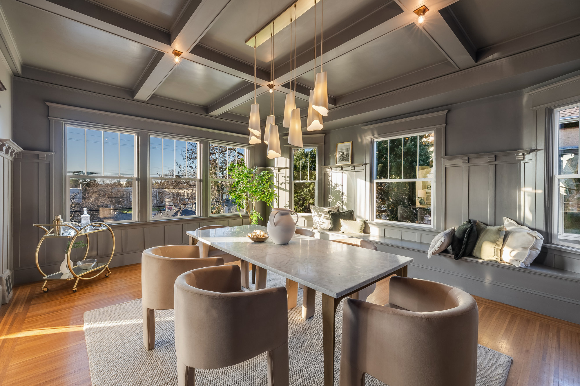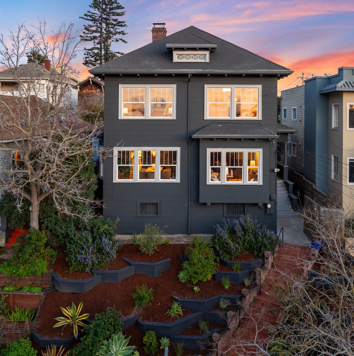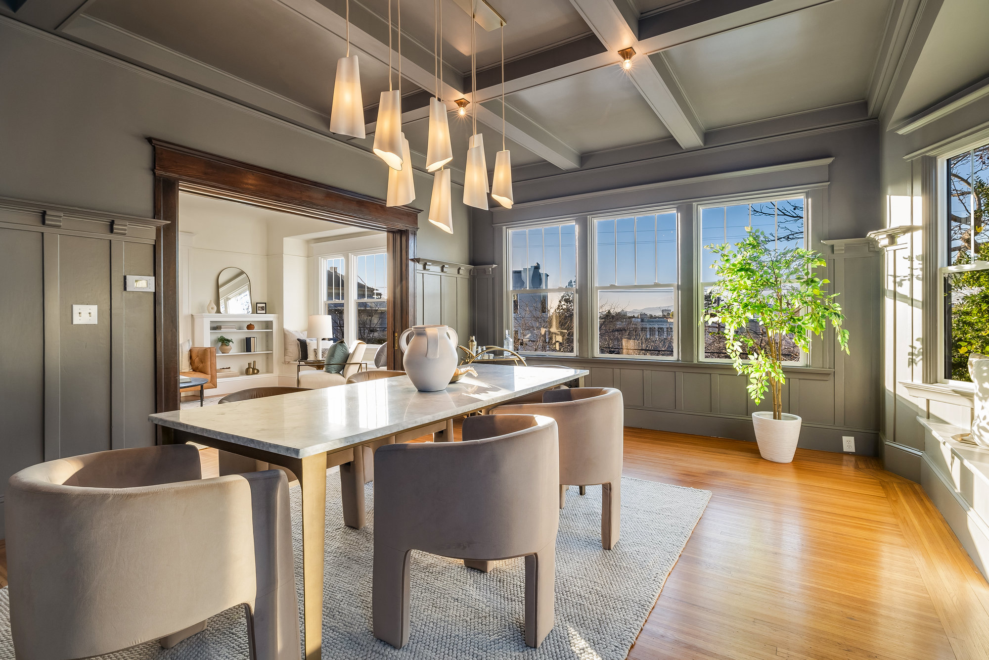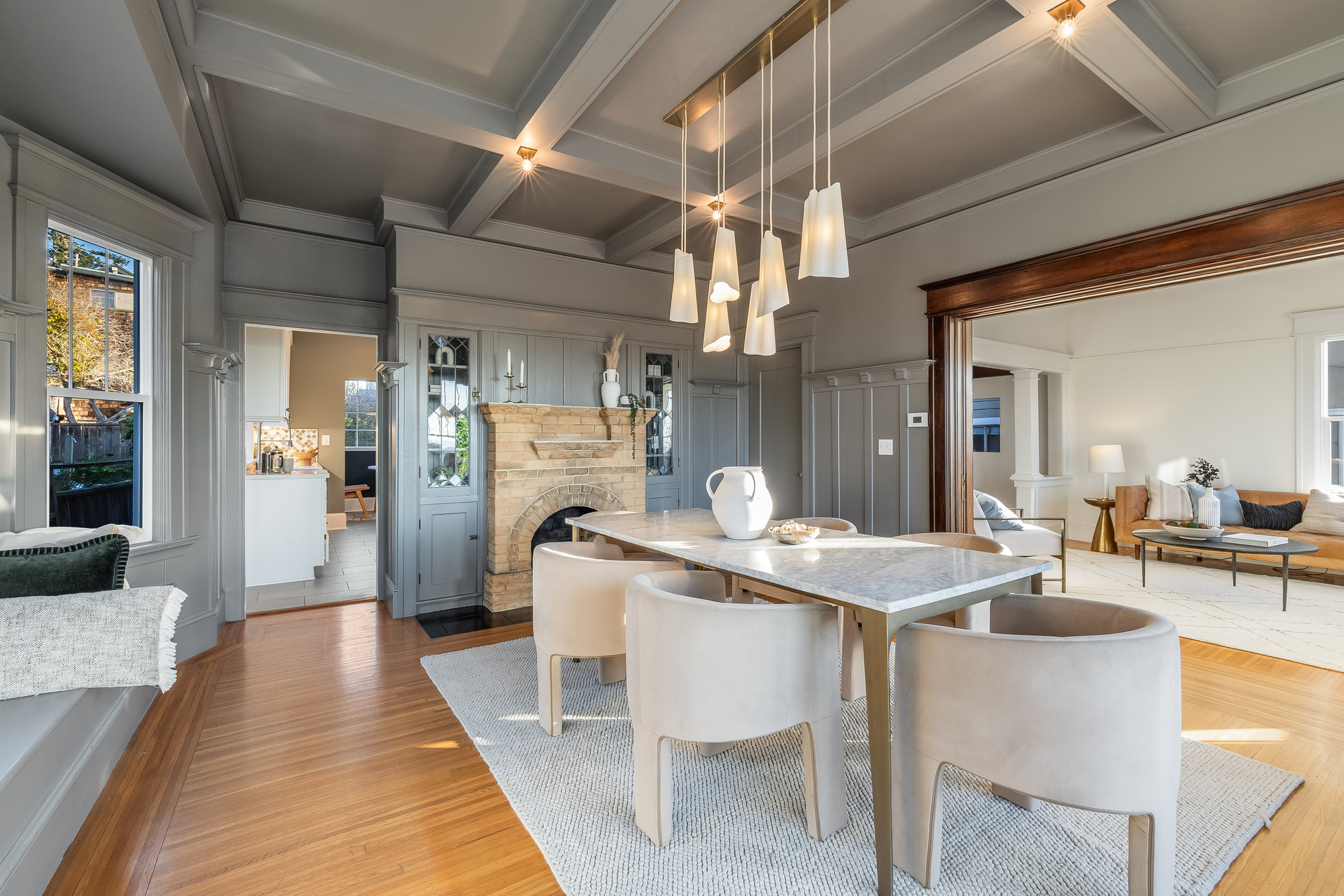 This stunning two-story Craftsman blends classic charm with modern refinement, offering a warm, light-filled retreat just blocks from Piedmont Avenue’s best shops and dining. Step into the inviting foyer, where a wood-paneled accent wall and mission-style staircase set the tone for timeless craftsmanship. The living room showcases picturesque neighborhood views, while the dramatic dining room features vintage built-ins, a decorative fireplace, box-beam ceilings, and a striking chandelier—a space designed for gathering. The chef’s kitchen balances function and beauty with quartz countertops, a center island, stainless steel appliances, and a command center. Glass doors open to the private rear gardens, and an updated half bath completes the main level. Upstairs, three bedrooms, two baths, and a sunporch create a tranquil retreat. The primary suite offers Oakland views, a walk-in closet, and a designer bath with matte gold fixtures, a frameless glass shower, and curated tiles. Outside, enjoy a spacious deck for entertaining and fresh grass for play—all just moments from Blue Bottle Coffee and the best of Piedmont Avenue.