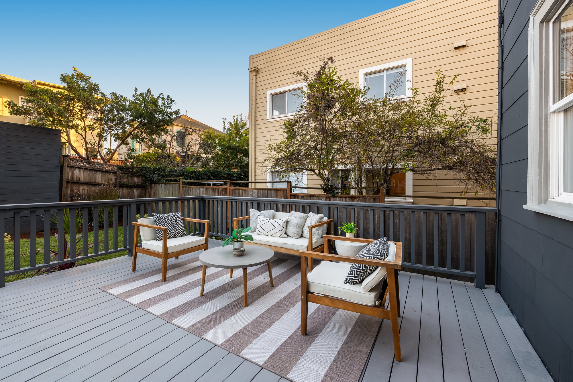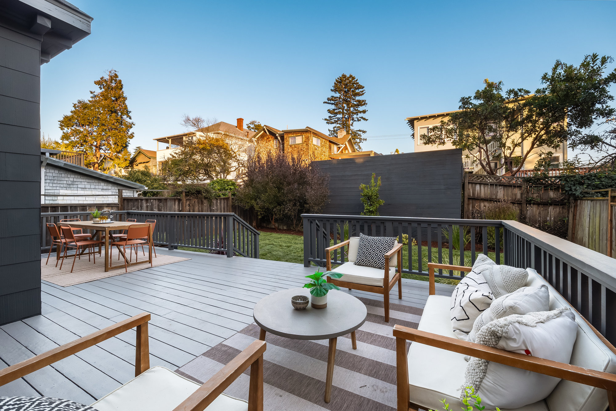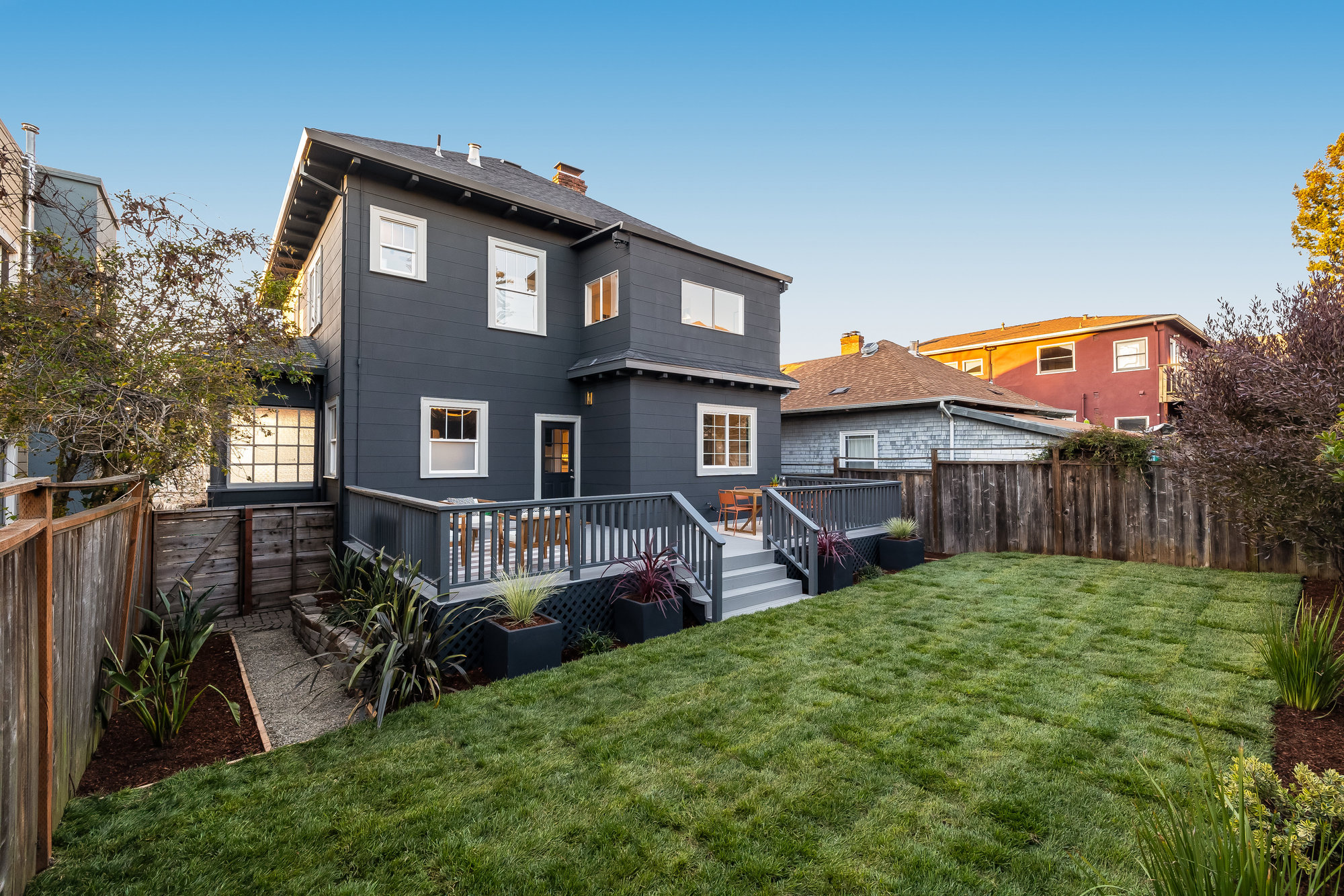 — Private rear gardens with deck and grassy area for play