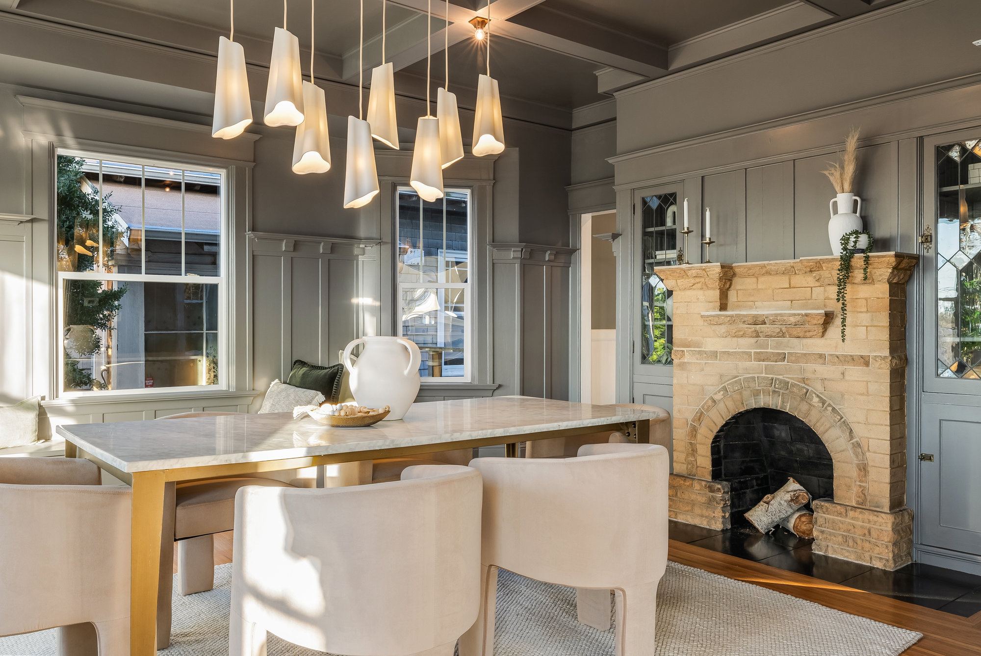 — Stunning dining room with beamed ceilings