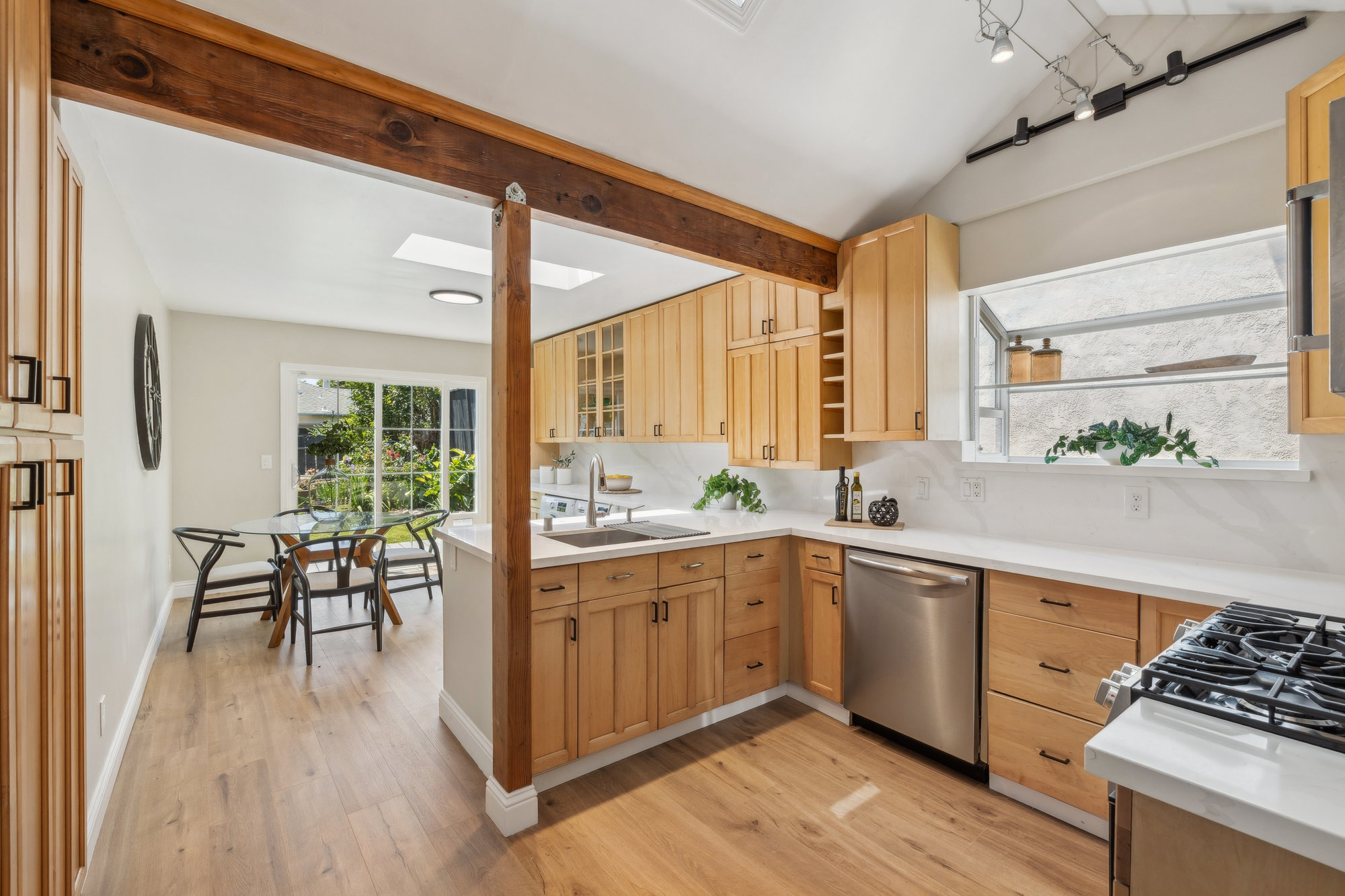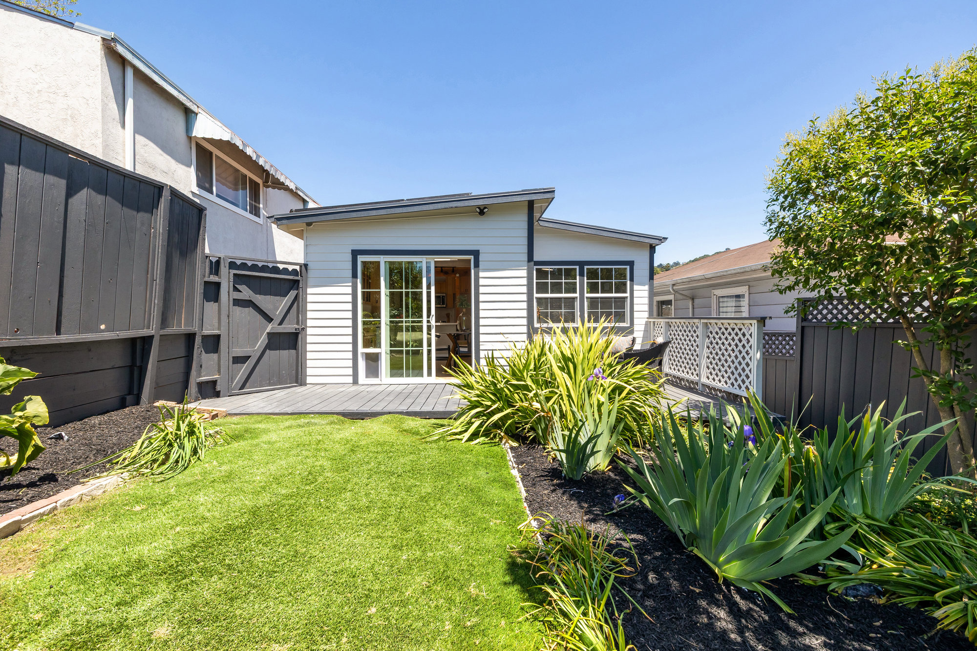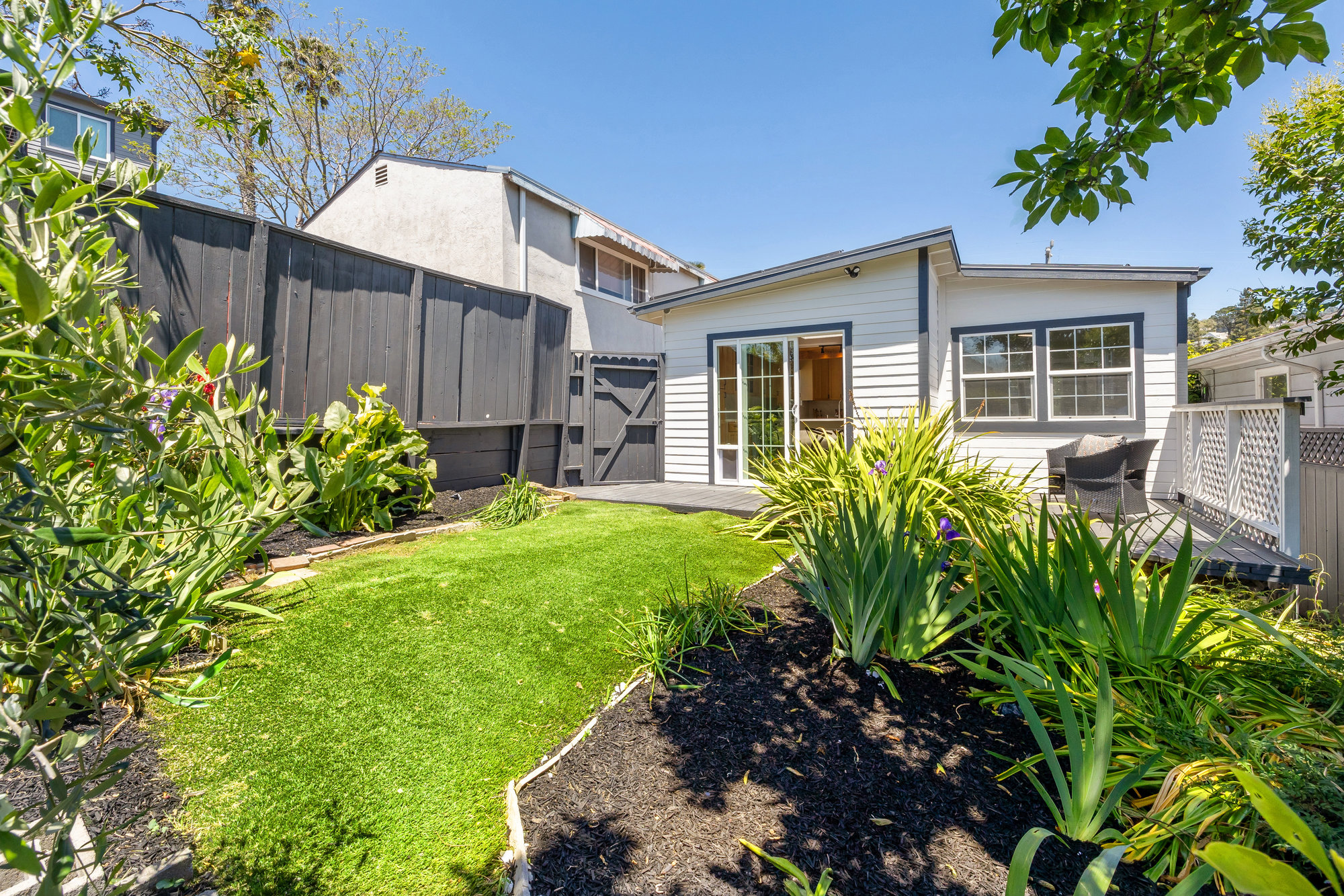 Tucked in the heart of Laurel Heights, this three-bedroom home offers soaring ceilings, abundant natural light, and thoughtful updates that create a welcoming and versatile space to call home. The living room makes a bold first impression with vaulted ceilings, walls of glass, and transom windows that draw in the sun throughout the day. A wood-burning stove adds cozy charm, while the updated bathroom features modern designer finishes with timeless appeal. The light-filled kitchen offers quartz countertops, ample cabinetry, and a clean, contemporary feel—opening directly onto a family room that leads to private gardens through double glass doors. Out back, the fenced yard blends turf and mature landscaping to create a space that’s equal parts play-friendly and peaceful. A separate bonus room on the lower level adds flexibility for a home office, gym, creative studio, or guest retreat.