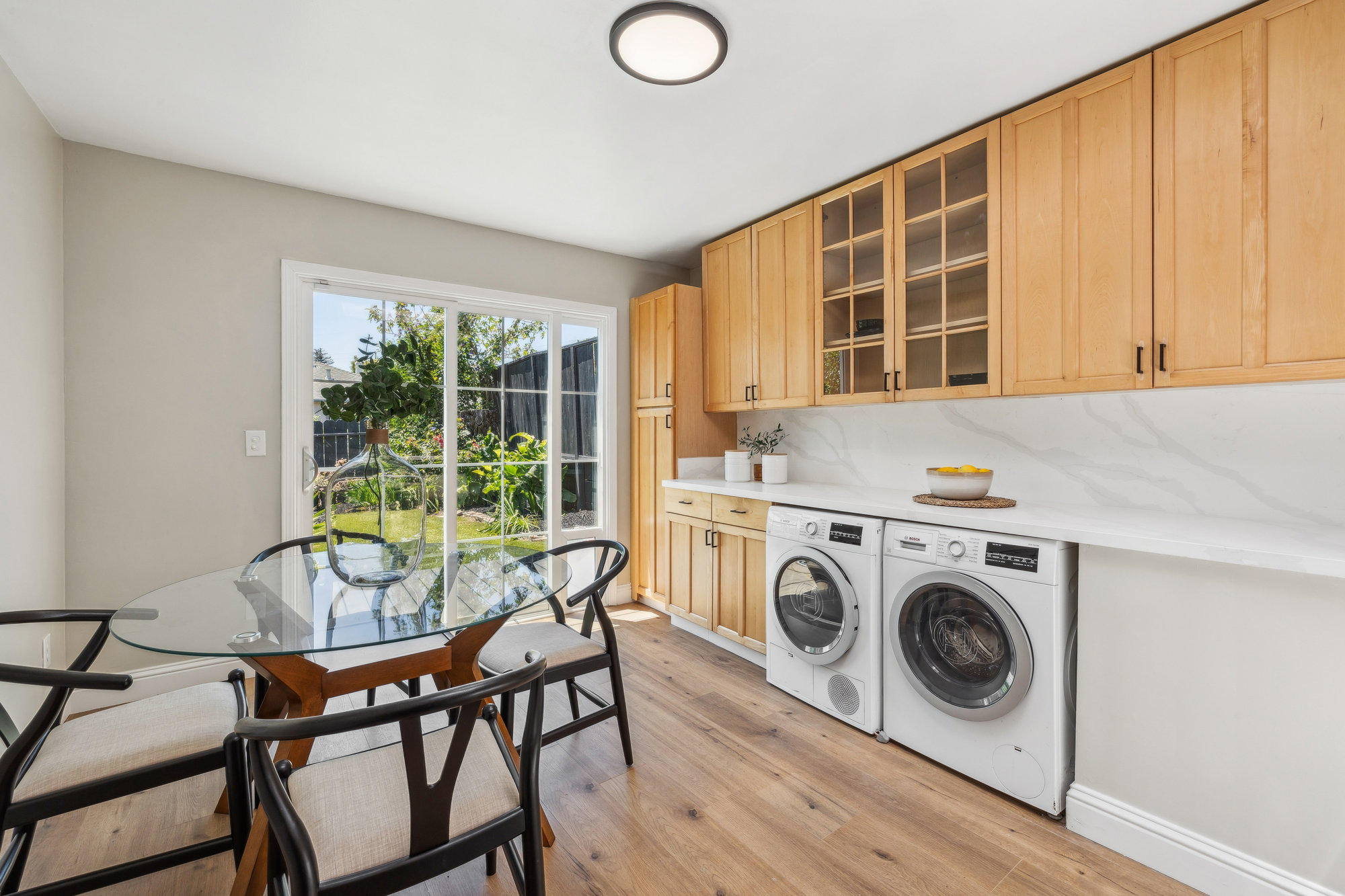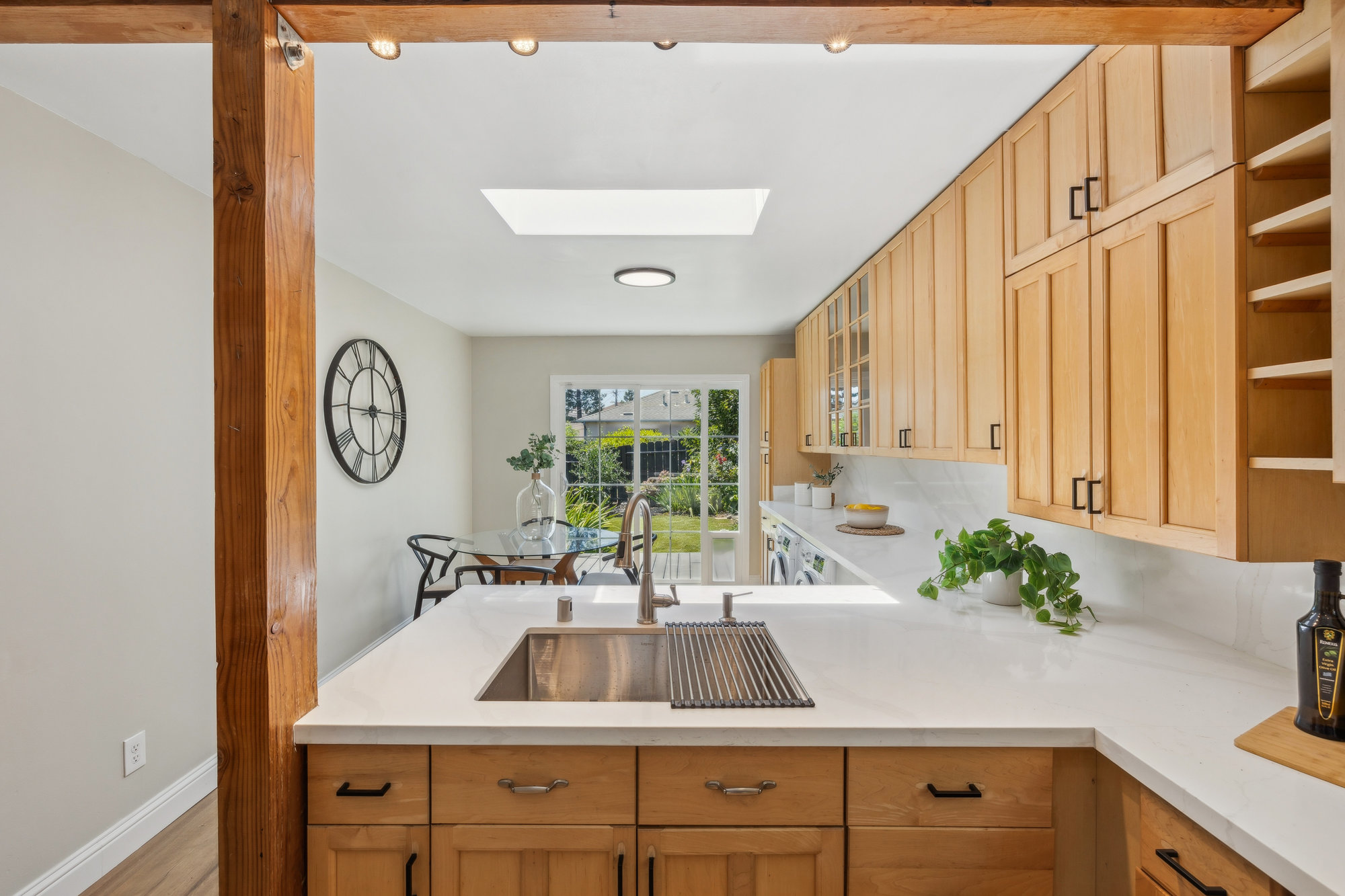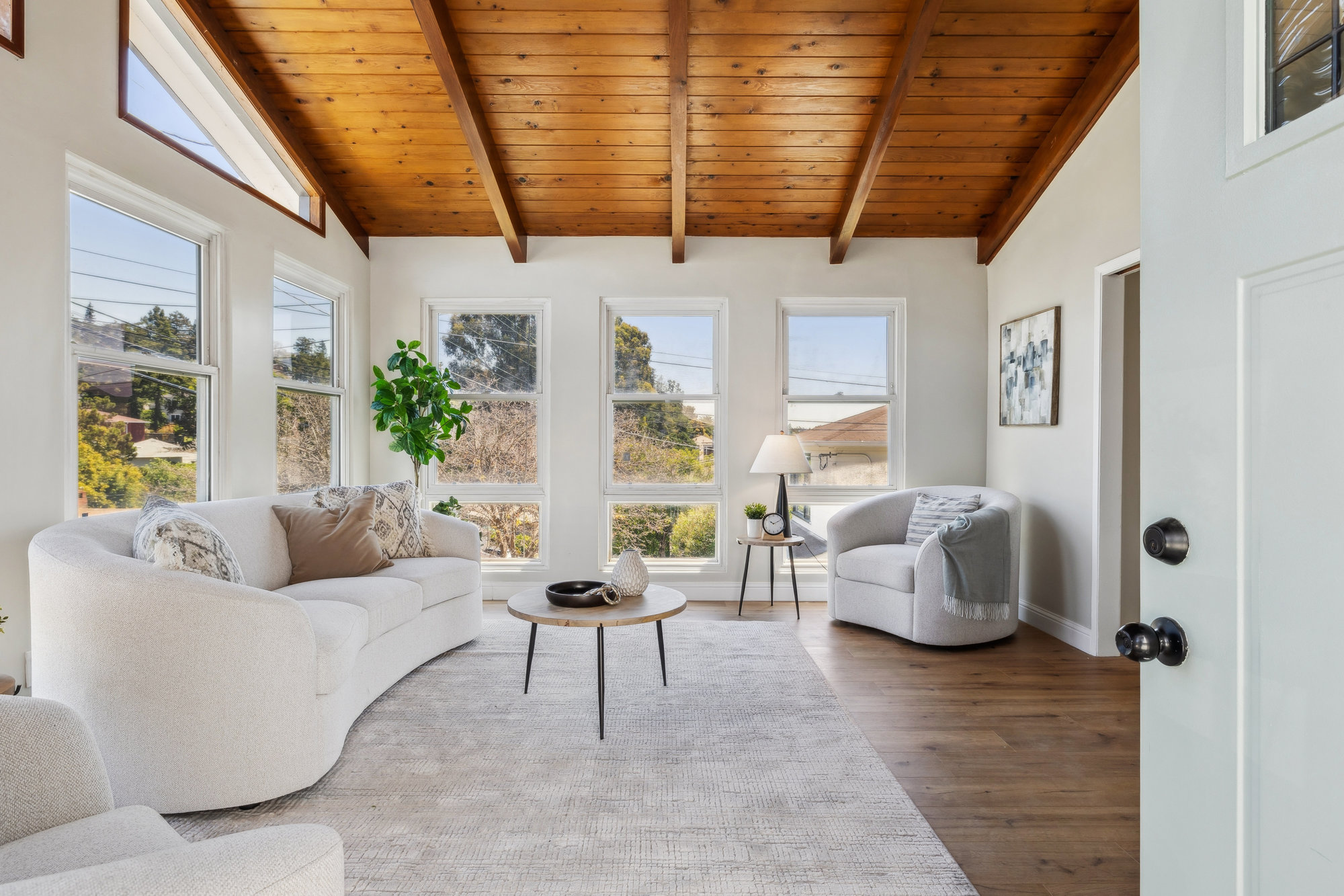 Tucked in the heart of Laurel Heights, this three-bedroom home offers soaring ceilings, abundant natural light, and thoughtful updates that create a welcoming and versatile space to call home. The living room makes a bold first impression with vaulted ceilings, walls of glass, and transom windows that draw in the sun throughout the day. A wood-burning stove adds cozy charm, while the updated bathroom features modern designer finishes with timeless appeal. The light-filled kitchen offers quartz countertops, ample cabinetry, and a clean, contemporary feel—opening directly onto a family room that leads to private gardens through double glass doors. Out back, the fenced yard blends turf and mature landscaping to create a space that’s equal parts play-friendly and peaceful. A separate bonus room on the lower level adds flexibility for a home office, gym, creative studio, or guest retreat.