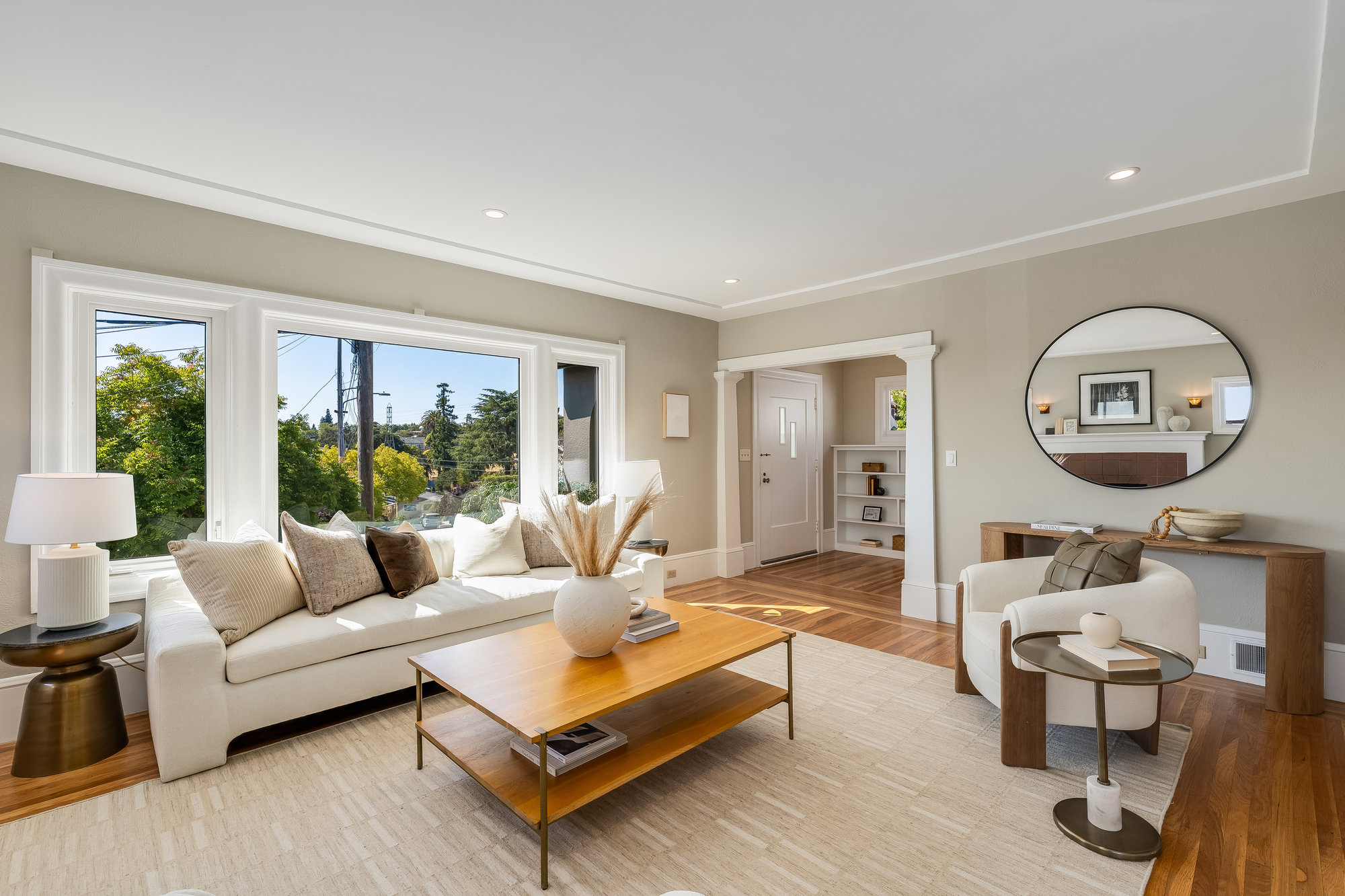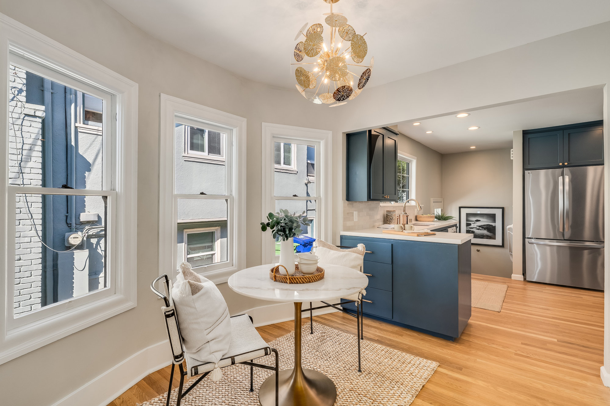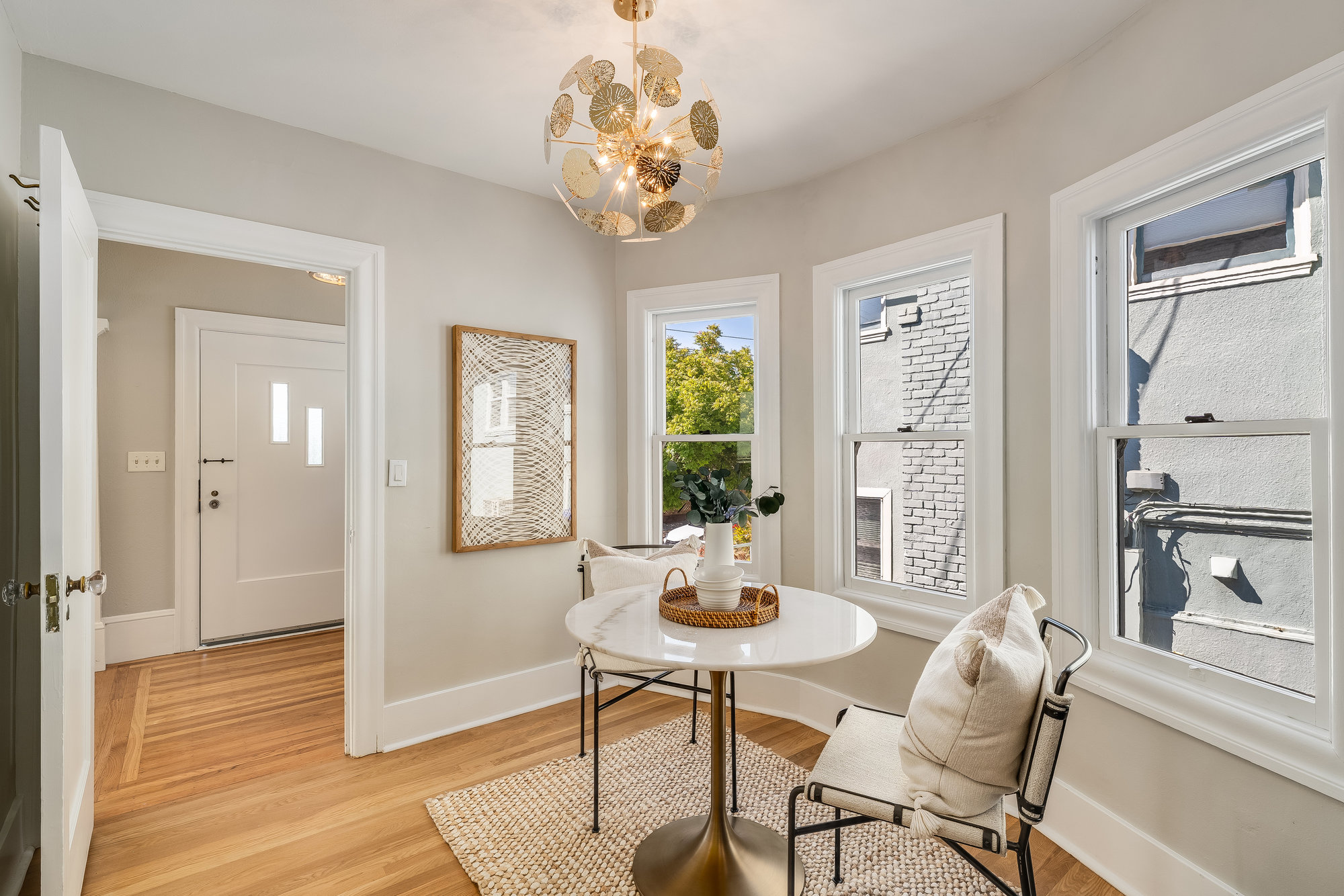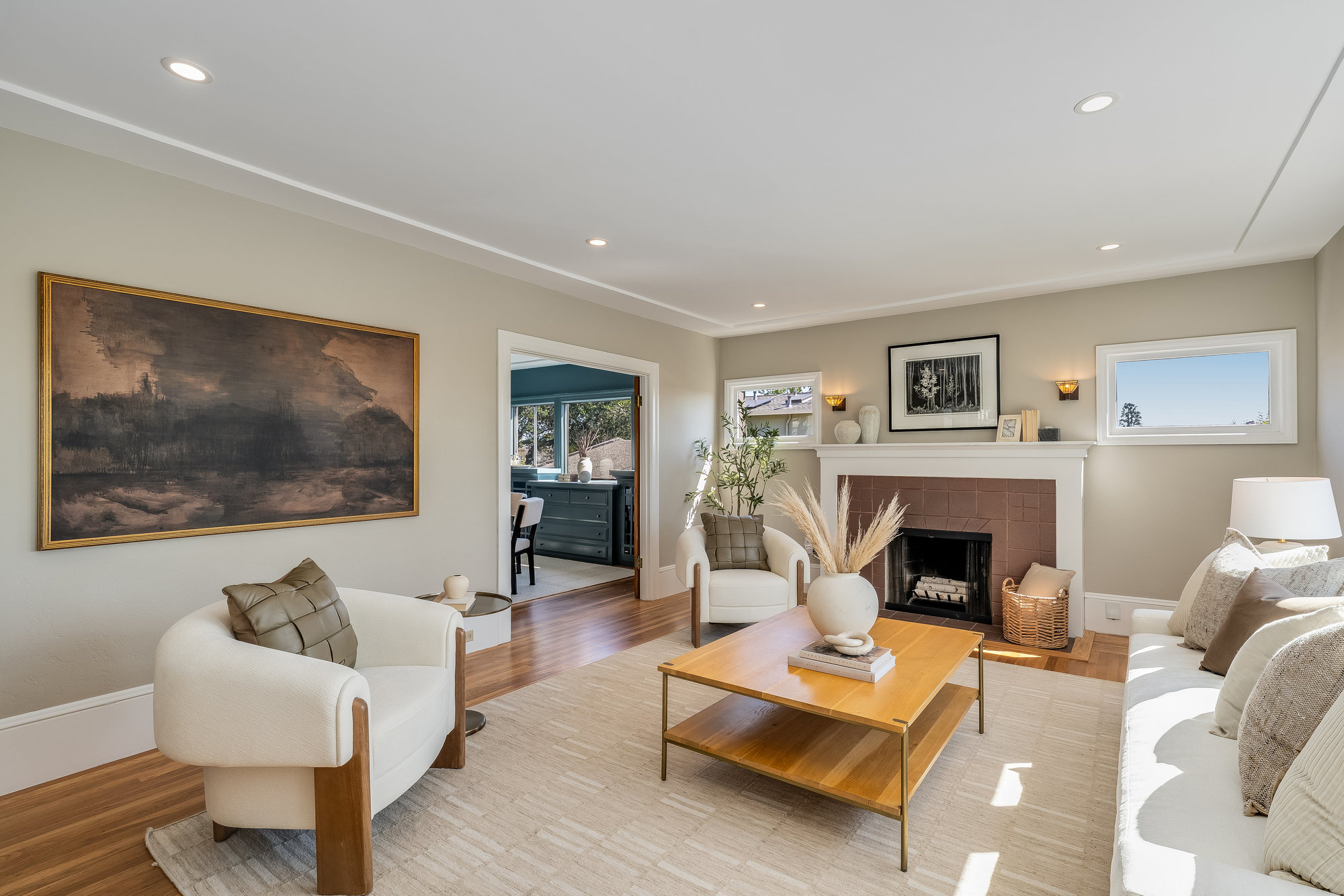 Inside, you'll find a thoughtfully updated layout that retains its classic bungalow character. The inviting living room is filled with natural light and showcases original built-ins, elegant gumwood accents, a wood-burning fireplace, and stunning views of the Bay and sunsets from both the living room and the front stoop. The formal dining room transitions beautifully into a refreshed kitchen featuring quartz countertops, shaker cabinetry, and stainless steel appliances.