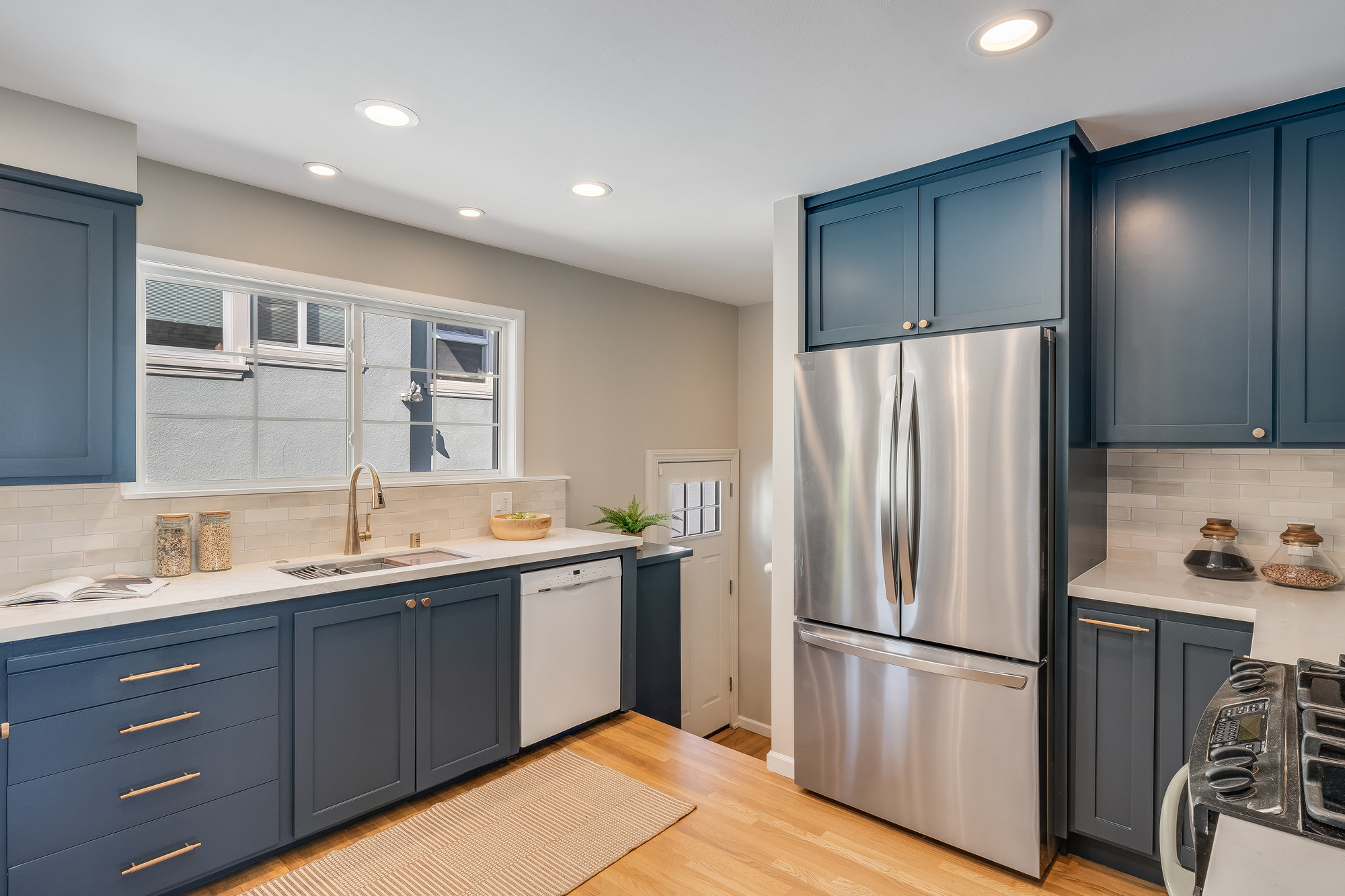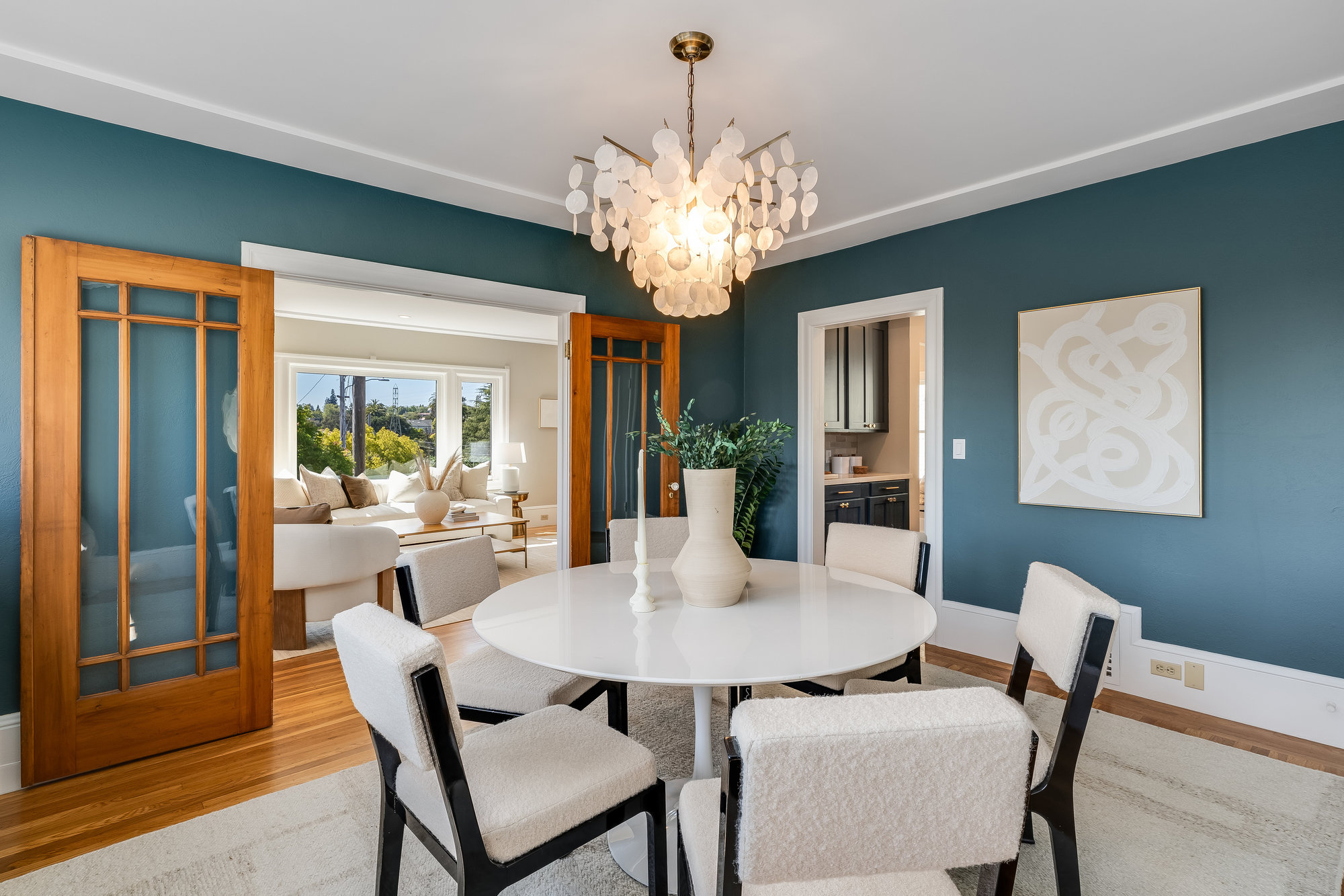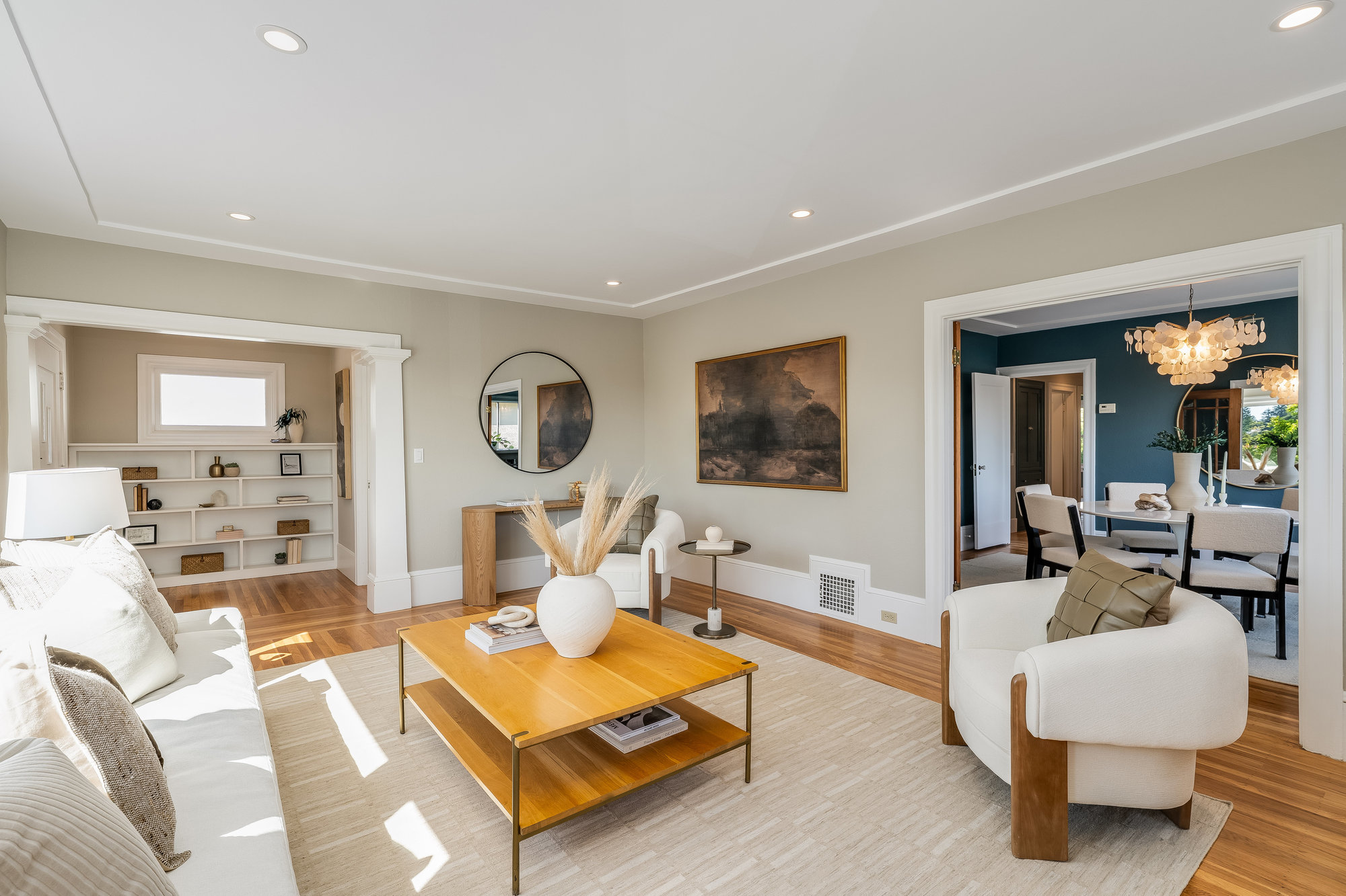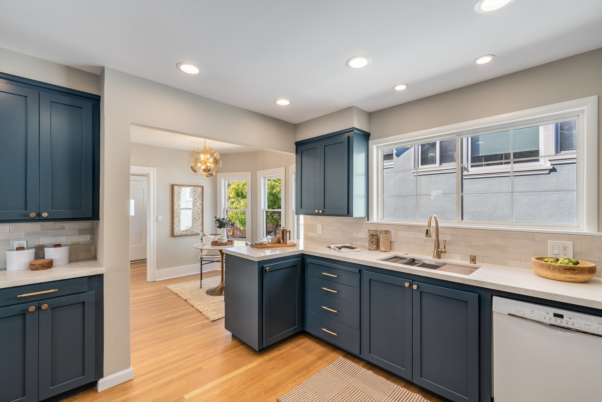 Inside, you'll find a thoughtfully updated layout that retains its classic bungalow character. The inviting living room is filled with natural light and showcases original built-ins, elegant gumwood accents, a wood-burning fireplace, and stunning views of the Bay and sunsets from both the living room and the front stoop. The formal dining room transitions beautifully into a refreshed kitchen featuring quartz countertops, shaker cabinetry, and stainless steel appliances.