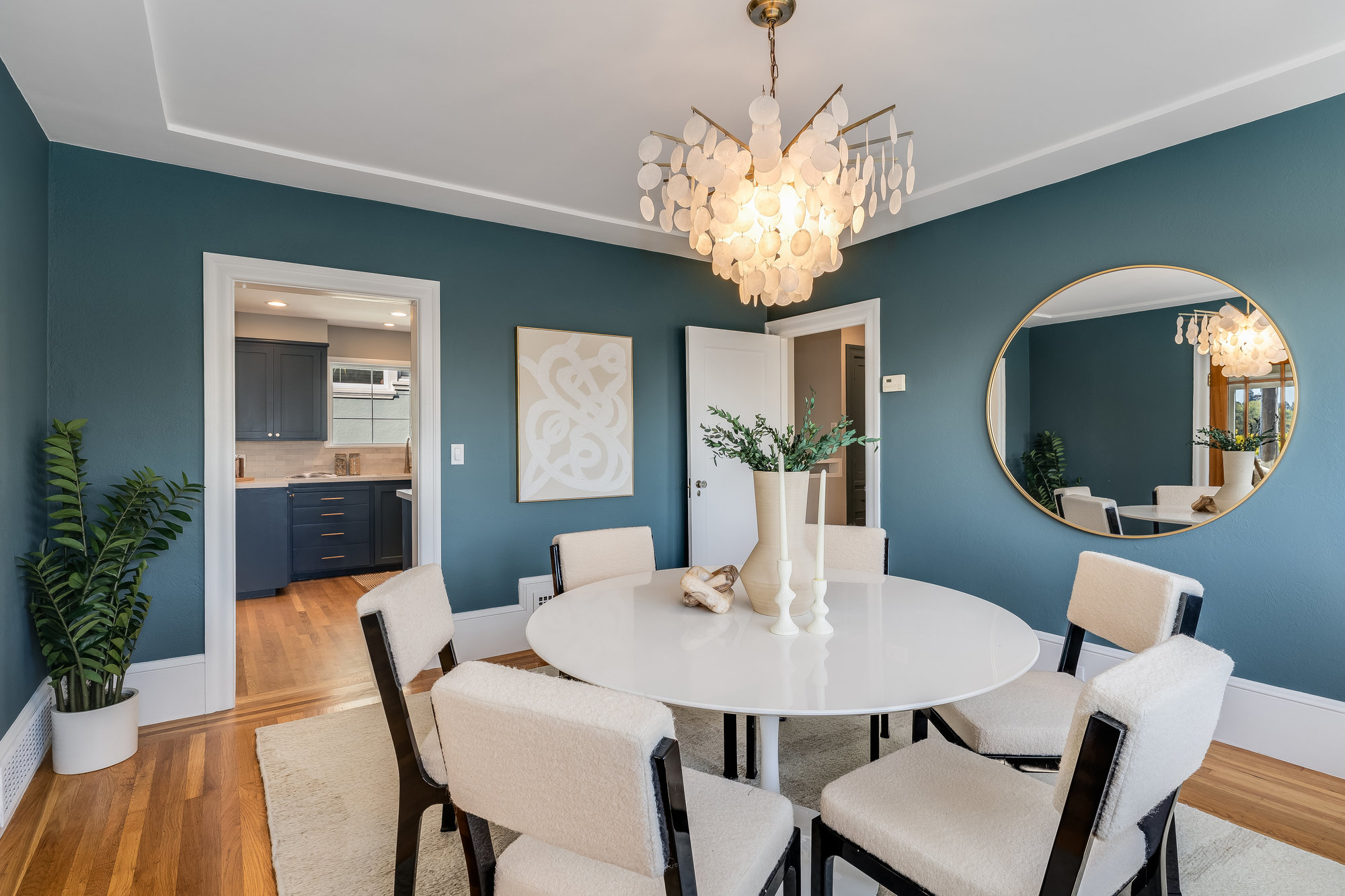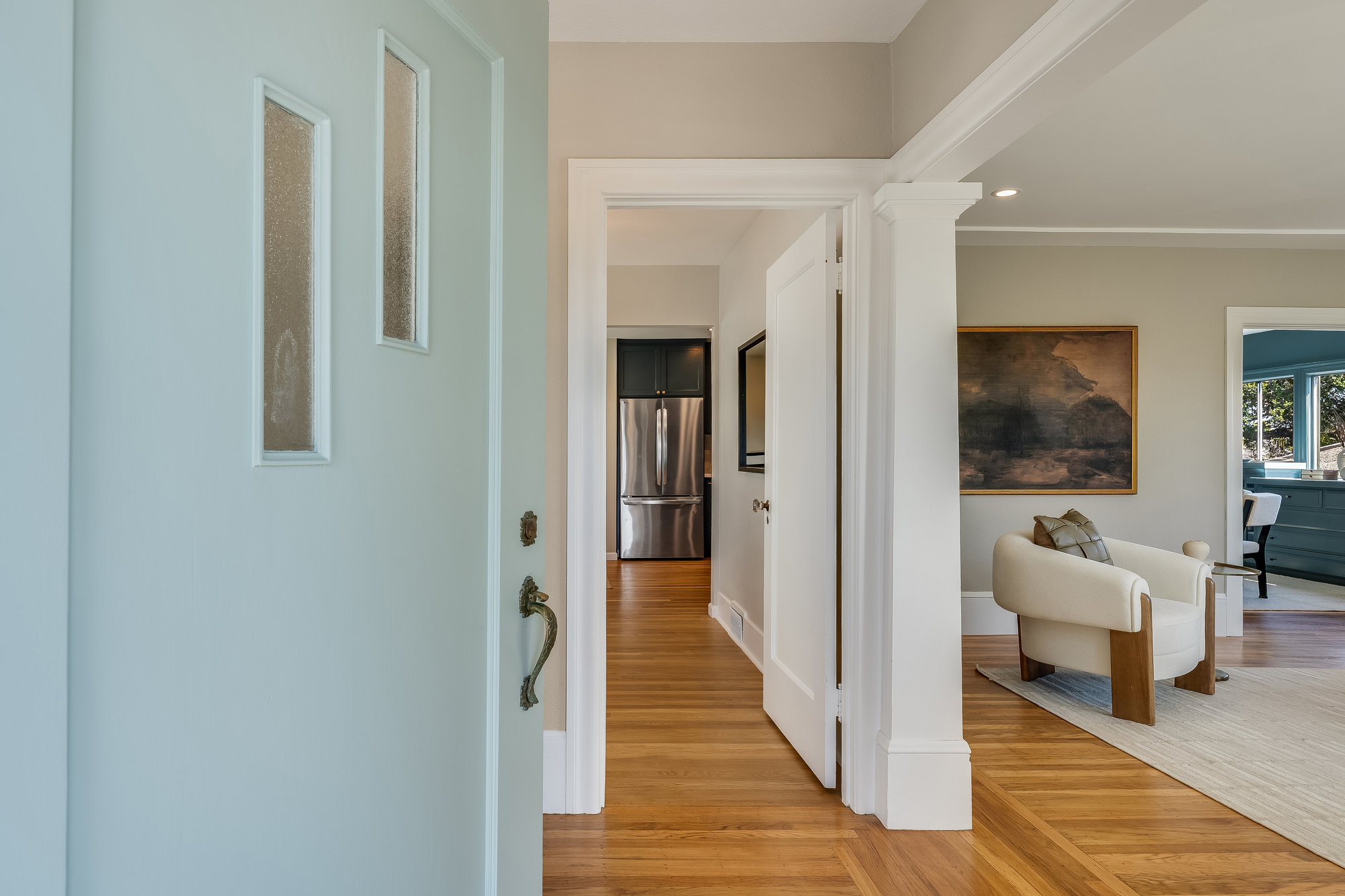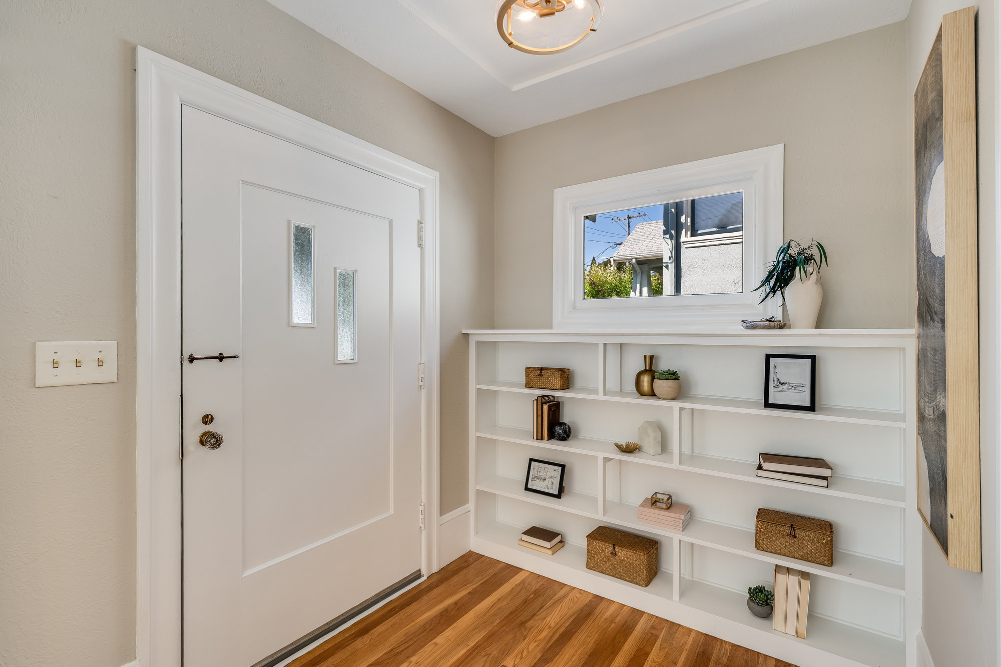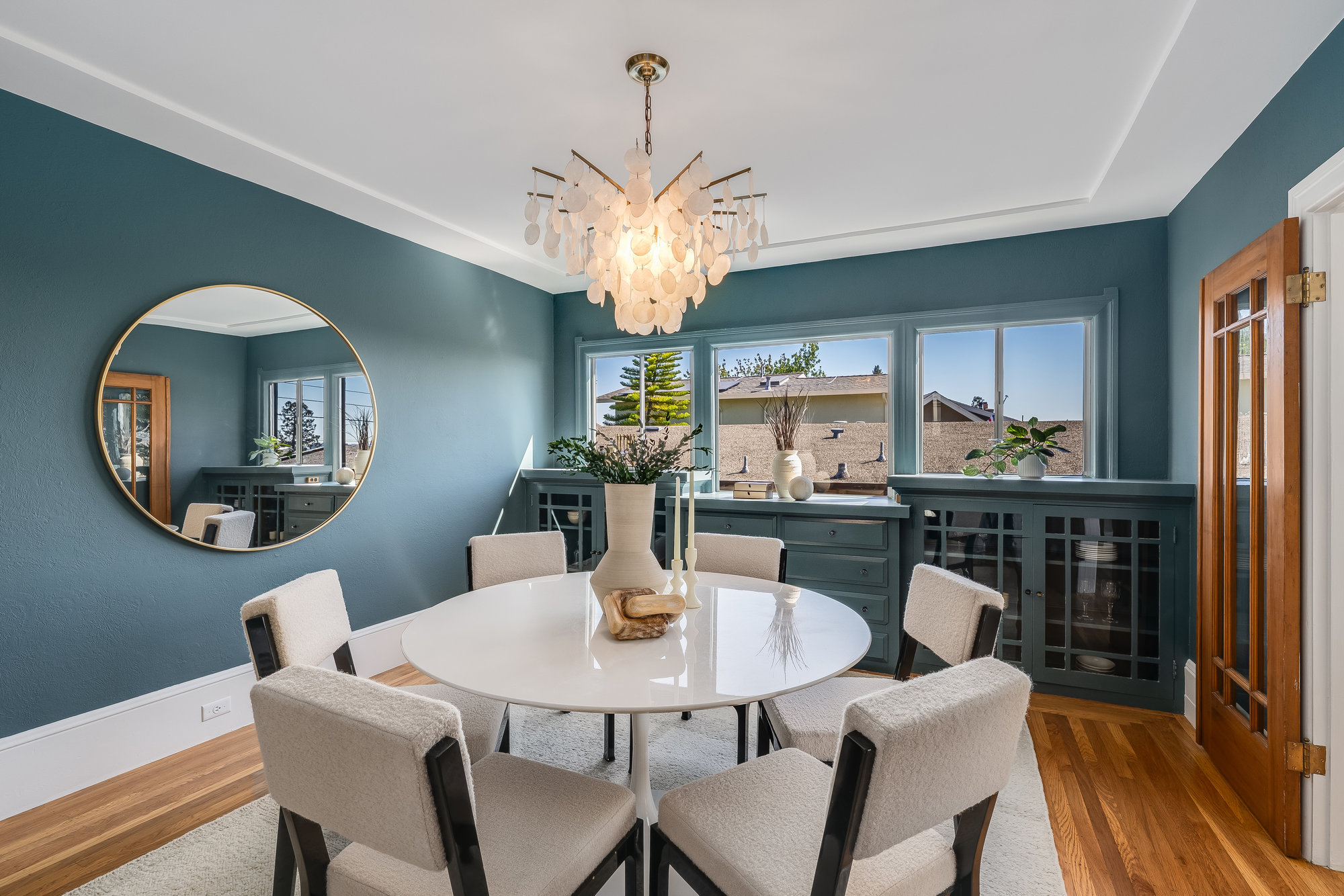 Inside, you'll find a thoughtfully updated layout that retains its classic bungalow character. The inviting living room is filled with natural light and showcases original built-ins, elegant gumwood accents, a wood-burning fireplace, and stunning views of the Bay and sunsets from both the living room and the front stoop. The formal dining room transitions beautifully into a refreshed kitchen featuring quartz countertops, shaker cabinetry, and stainless steel appliances.
