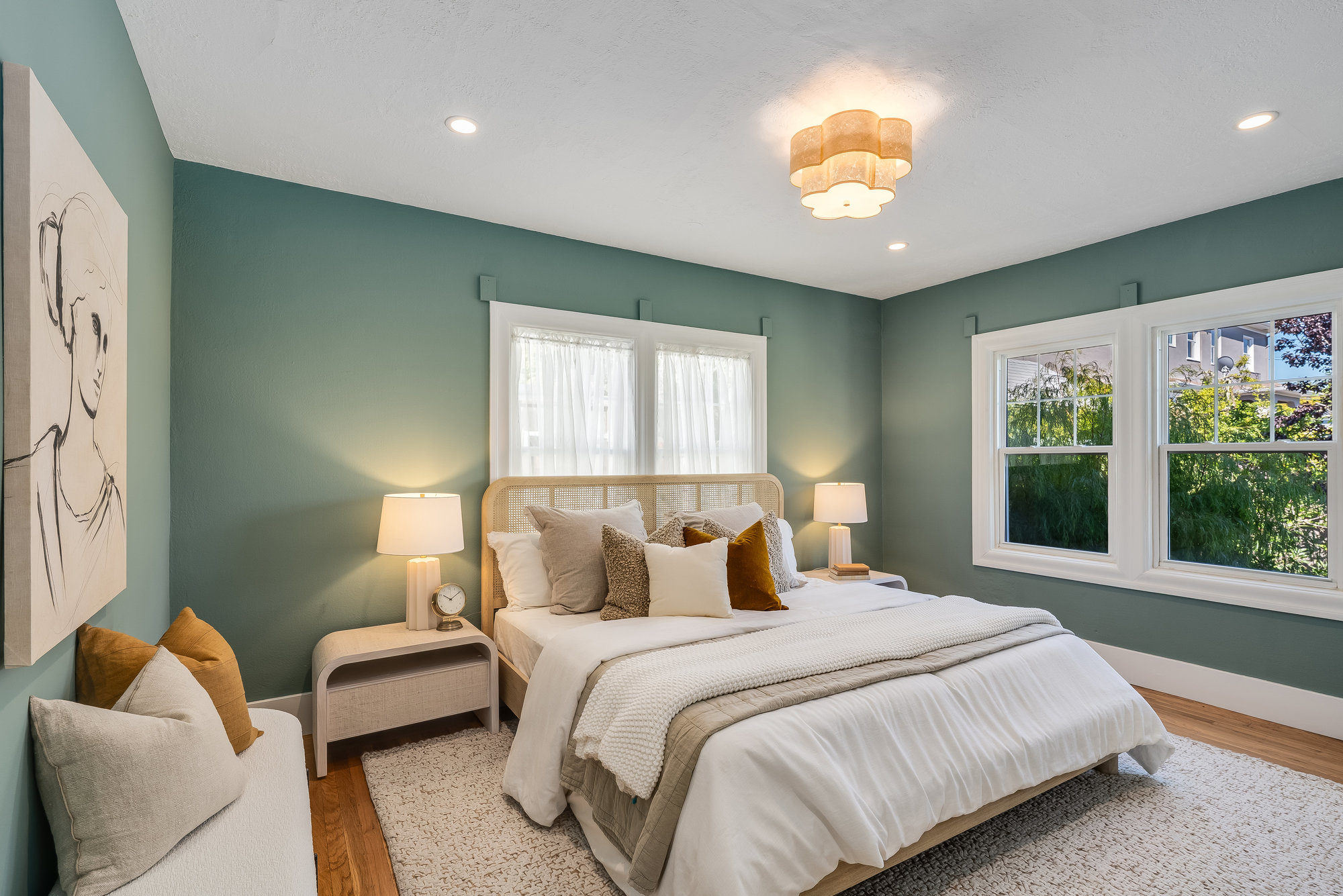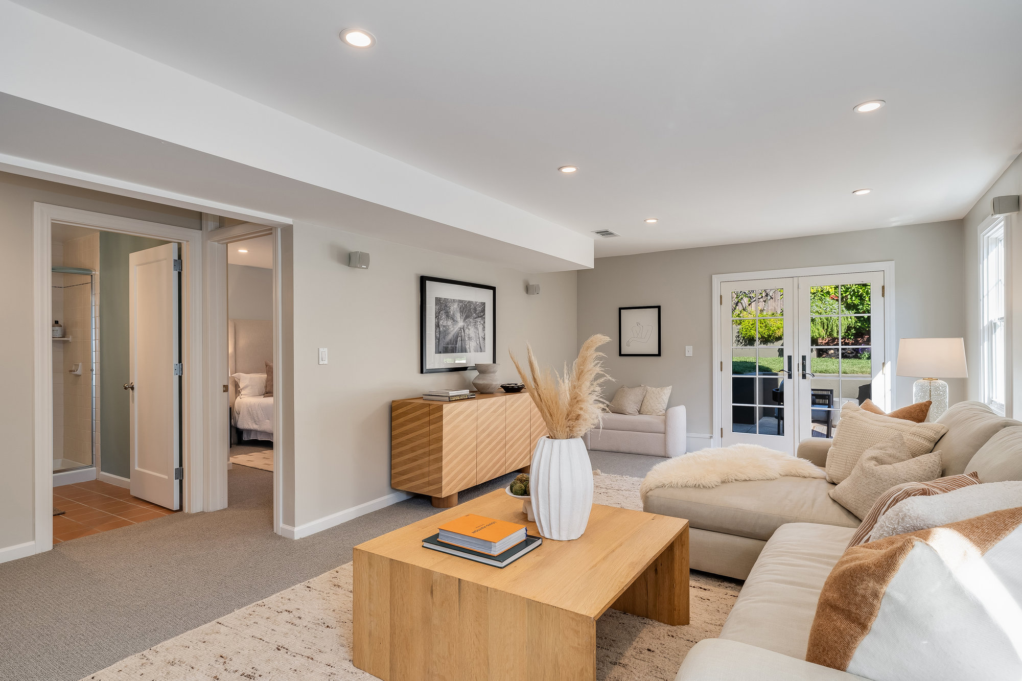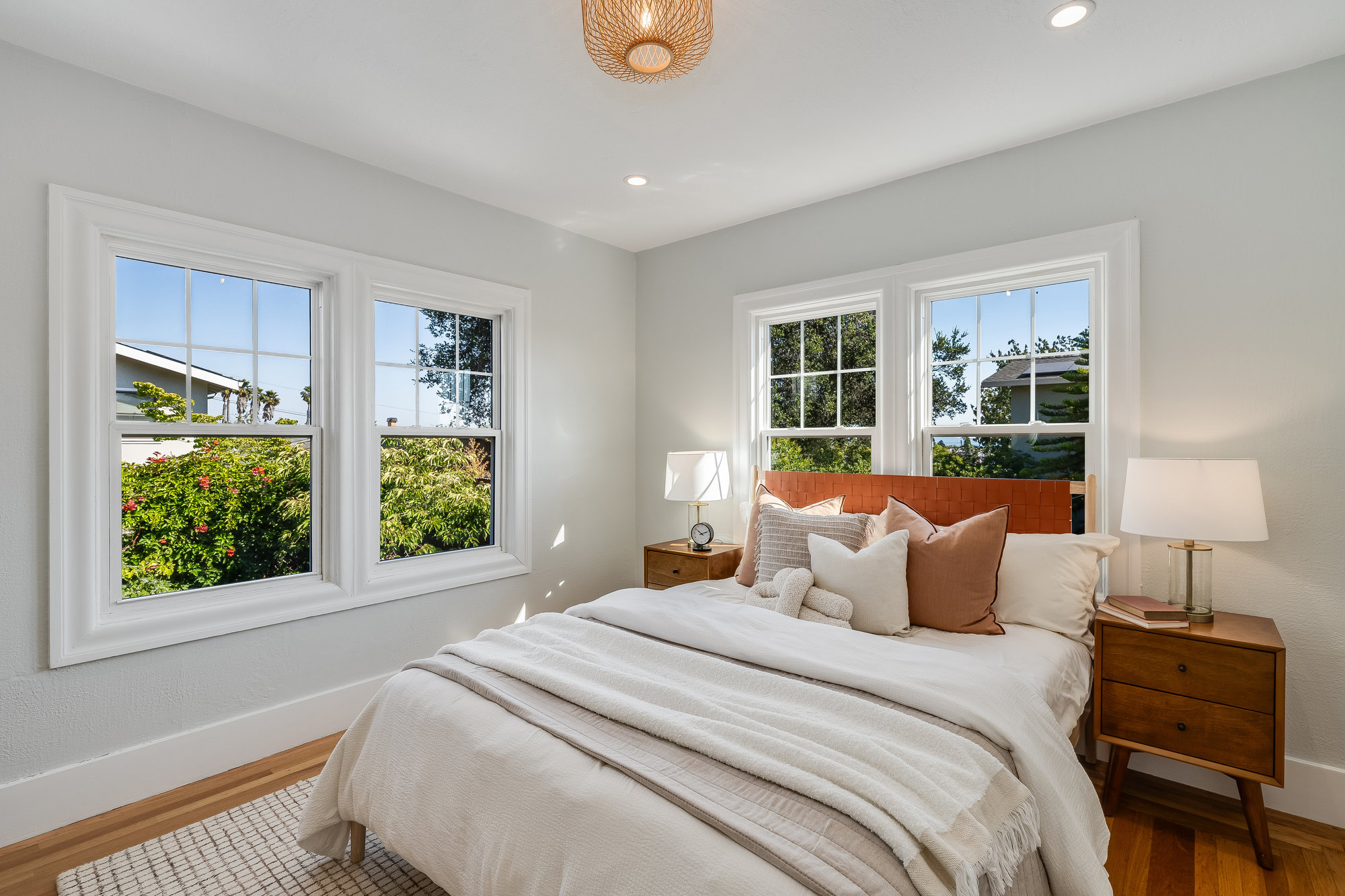 The spacious home includes 4 bedrooms and 2 bathrooms, spread across two levels. Three of the bedrooms are located on the upper level, offering comfortable accommodations with abundant natural light. The lower level offers a versatile fourth bedroom—perfect for guests, a home office, or extended family accommodations. Downstairs, an expansive family room opens to the serene backyard, creating the perfect indoor-outdoor flow. French doors lead to a landscaped garden retreat with multiple seating areas, a manicured lawn, and mature apple and fig trees—ideal for relaxing, entertaining, or enjoying Oakland's sunny days.