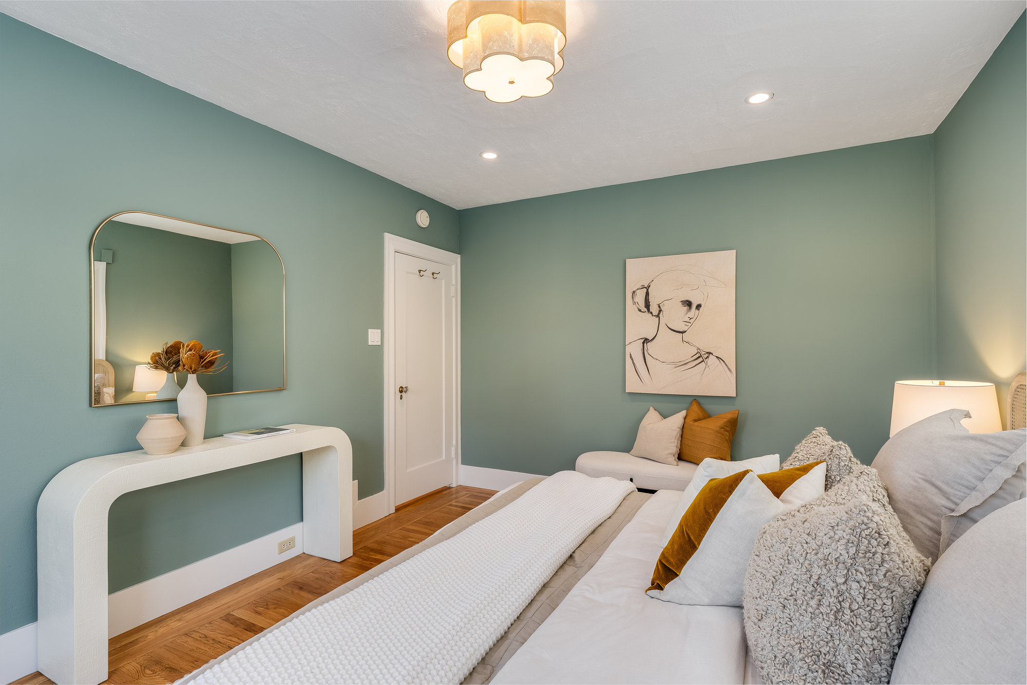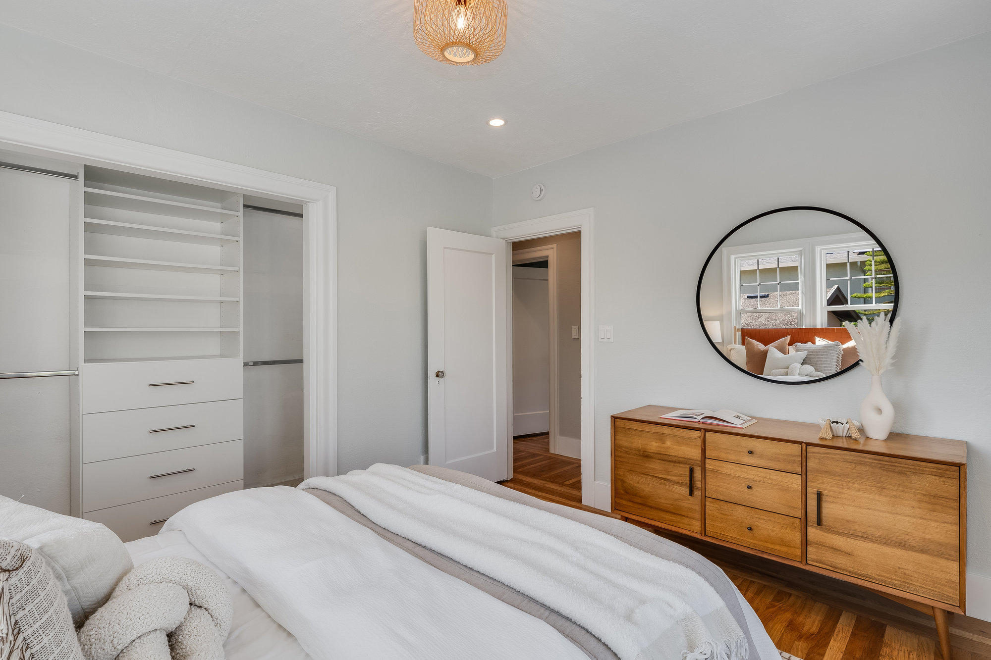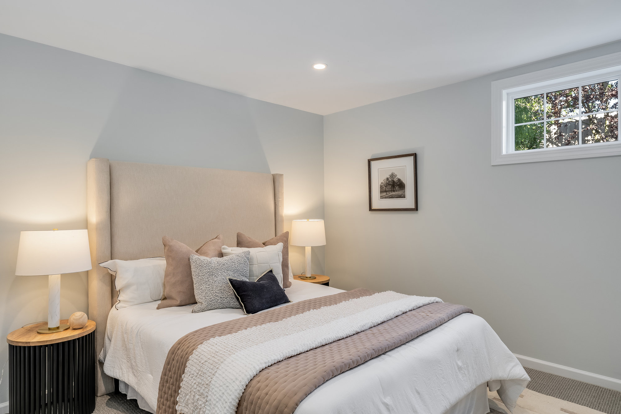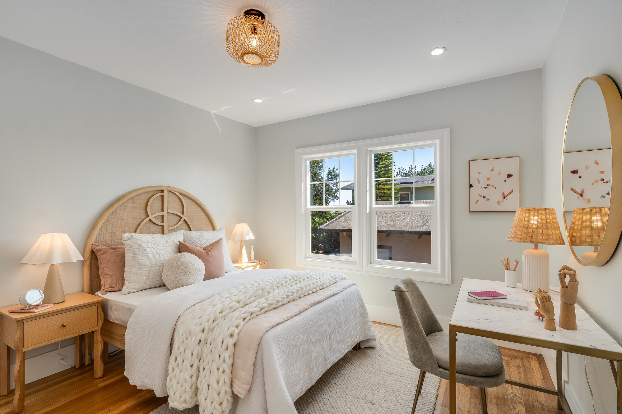 The spacious home includes 4 bedrooms and 2 bathrooms, spread across two levels. Three of the bedrooms are located on the upper level, offering comfortable accommodations with abundant natural light. The lower level offers a versatile fourth bedroom—perfect for guests, a home office, or extended family accommodations. Downstairs, an expansive family room opens to the serene backyard, creating the perfect indoor-outdoor flow. French doors lead to a landscaped garden retreat with multiple seating areas, a manicured lawn, and mature apple and fig trees—ideal for relaxing, entertaining, or enjoying Oakland's sunny days.