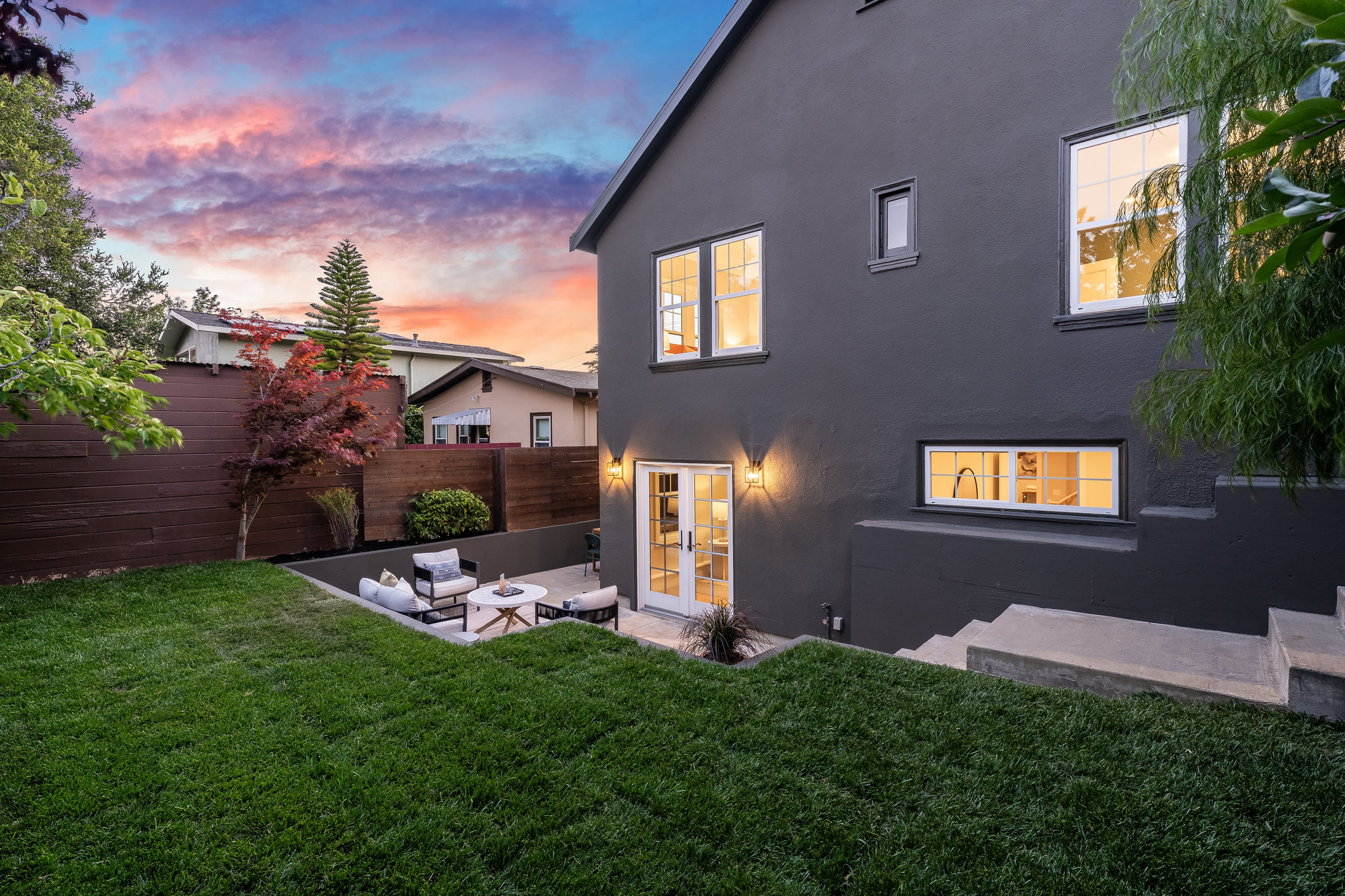 Terraced backyard with mature trees and privacy fencing