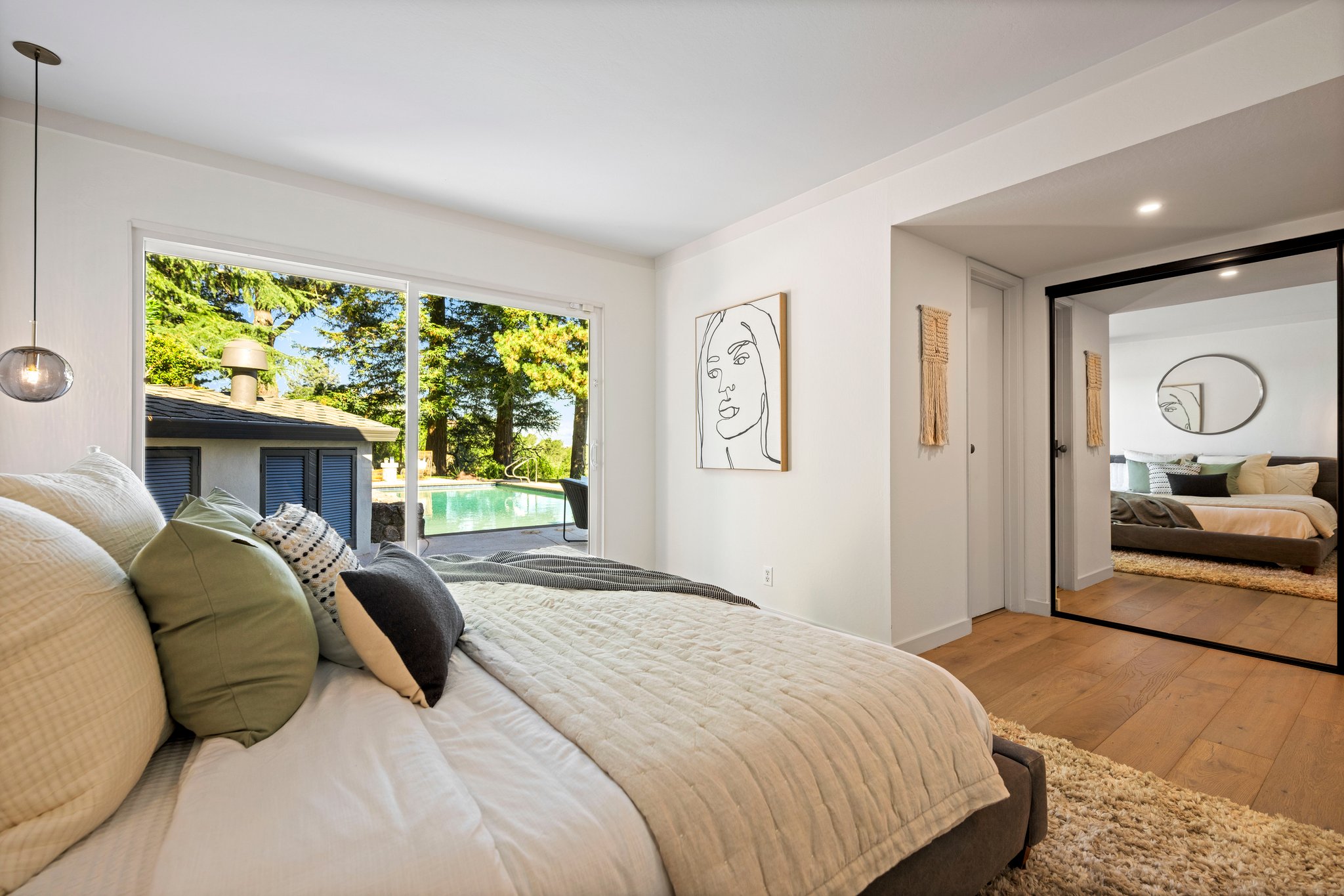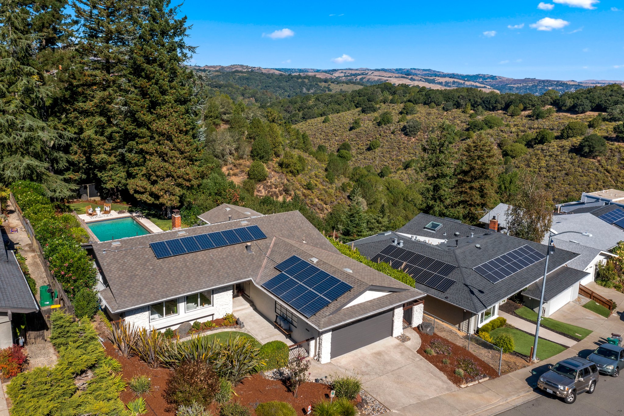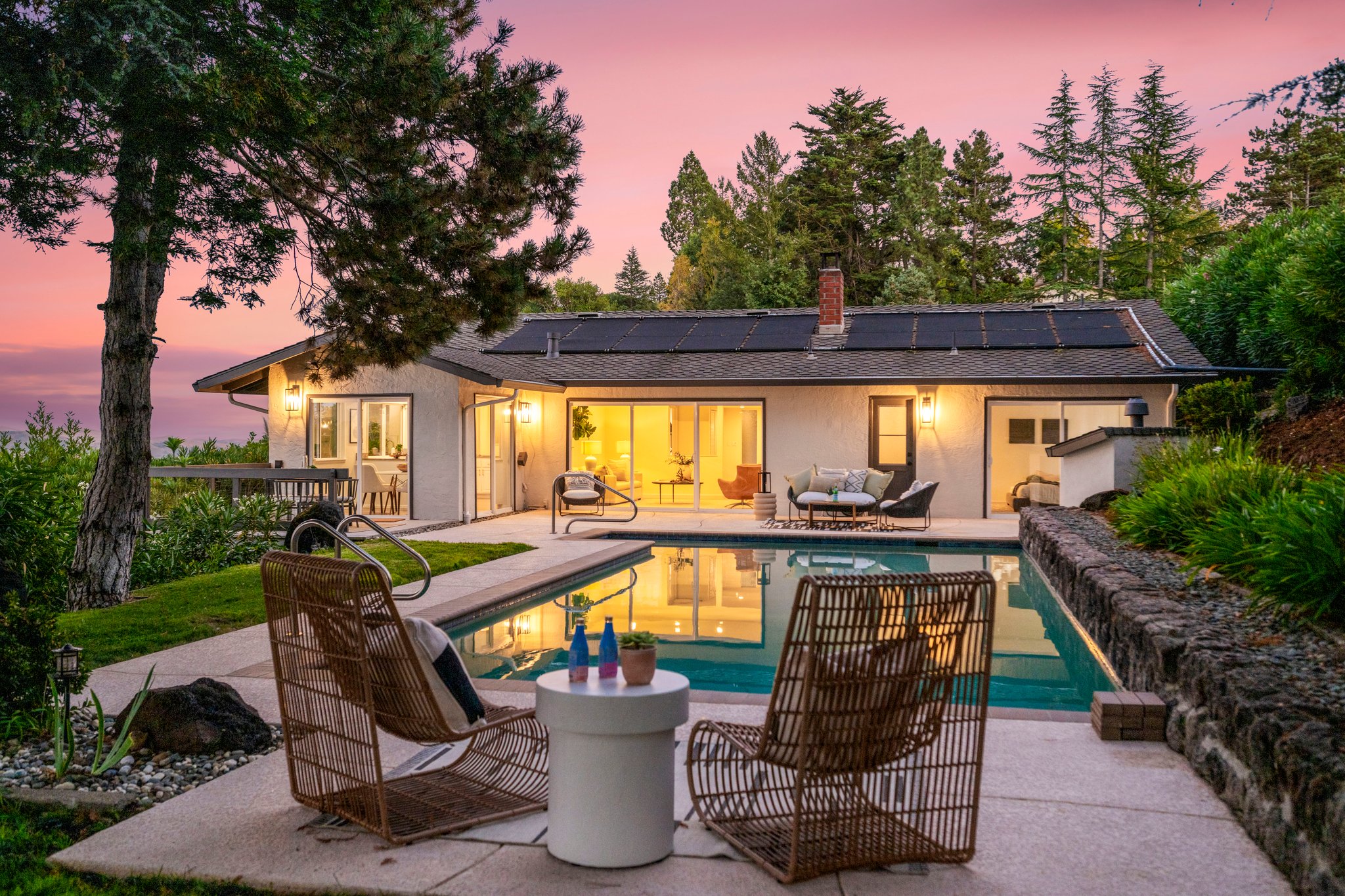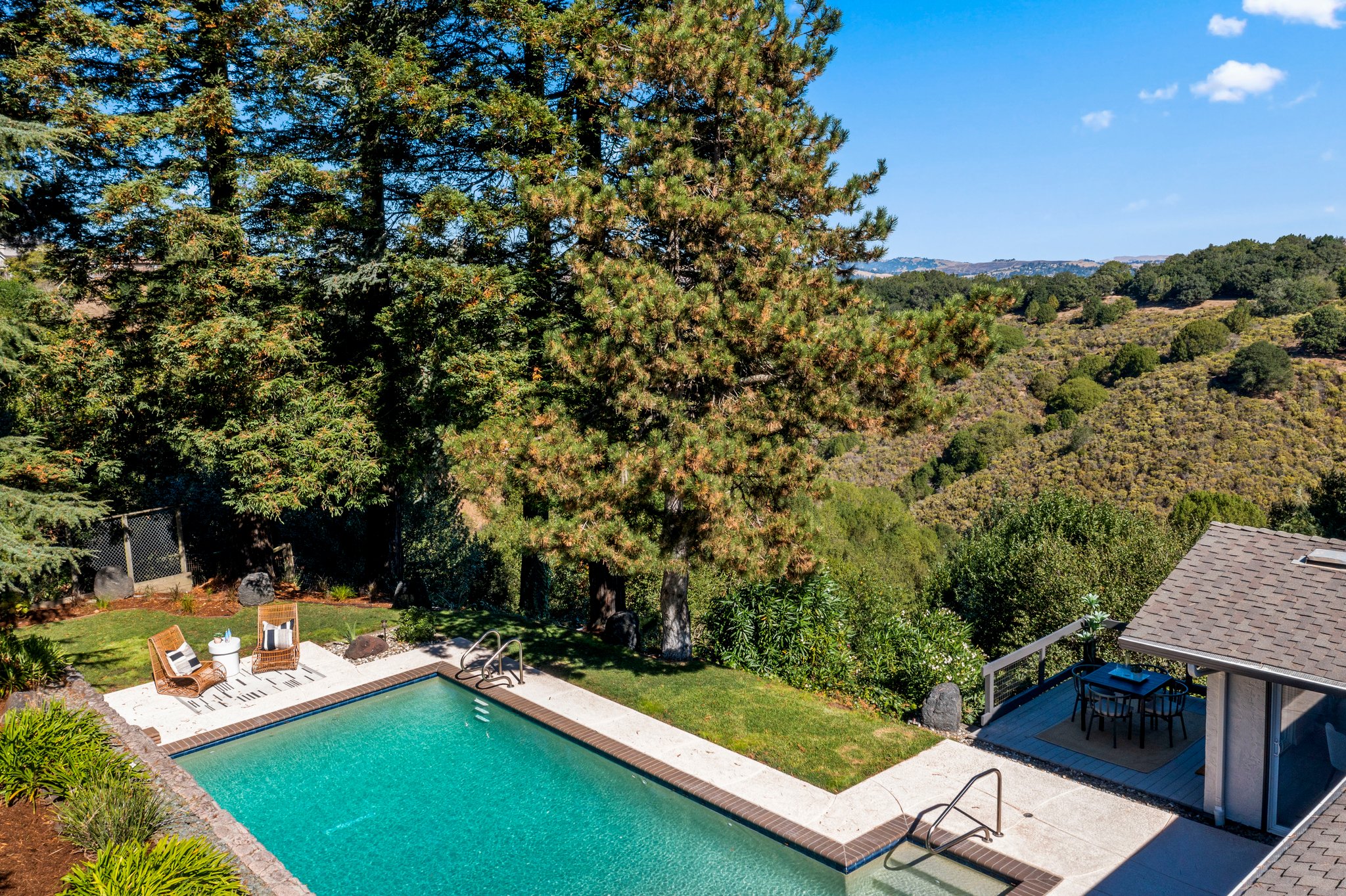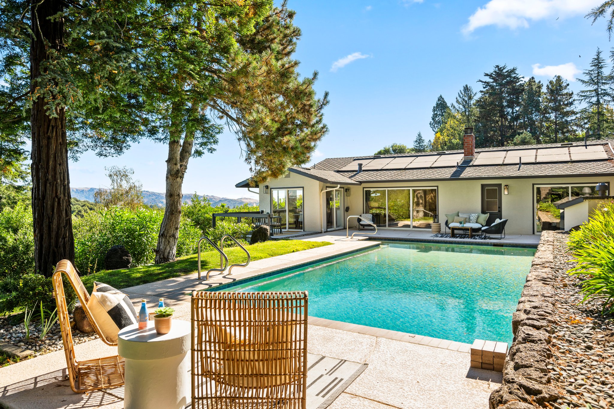 The primary suite has a luxurious remodeled bathroom with a dual vanity sink, designer lighting, and floor to ceiling tile. The sparkling swimming pool overlooking the vast hills of Moraga Canyon is what makes this home an extraordinary place for entertaining, family gathering, and peaceful reflection. Relax on the spacious lawn and watch the kids play in the pool! Attached two car garage with plenty of storage, laundry, and solar panels on the 50 year roof. The property feels worlds away from city life, but you’re only 15 minutes away from the center of town. Close to plenty of hiking trails, the equestrian center, and open space. Don’t miss this truly extraordinary retreat!