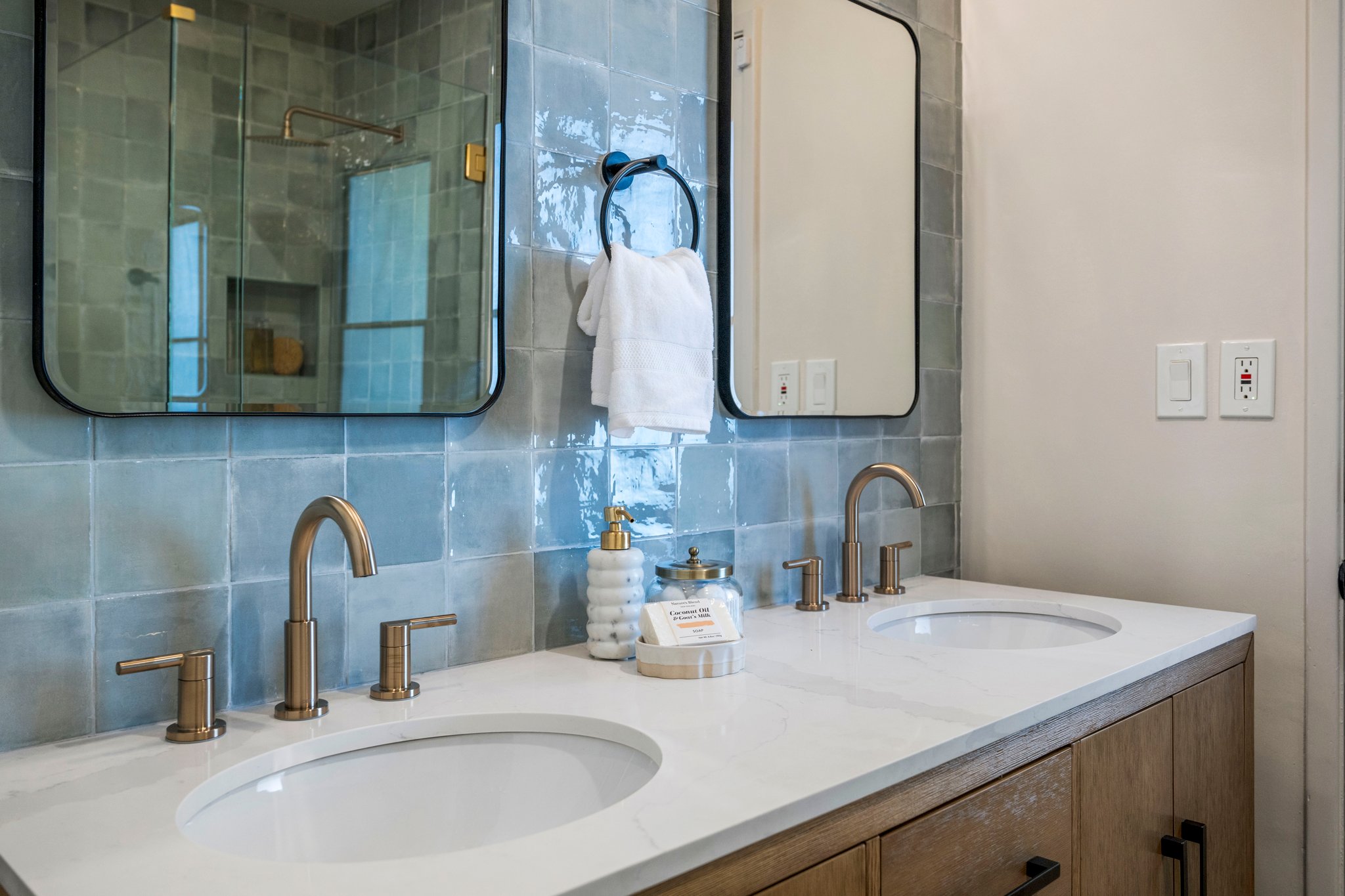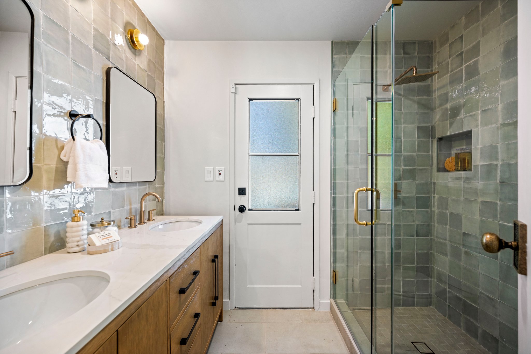 *Freshly remodeled master bathroom with floor to ceiling tile, dual vanity sinks, and designer lighting