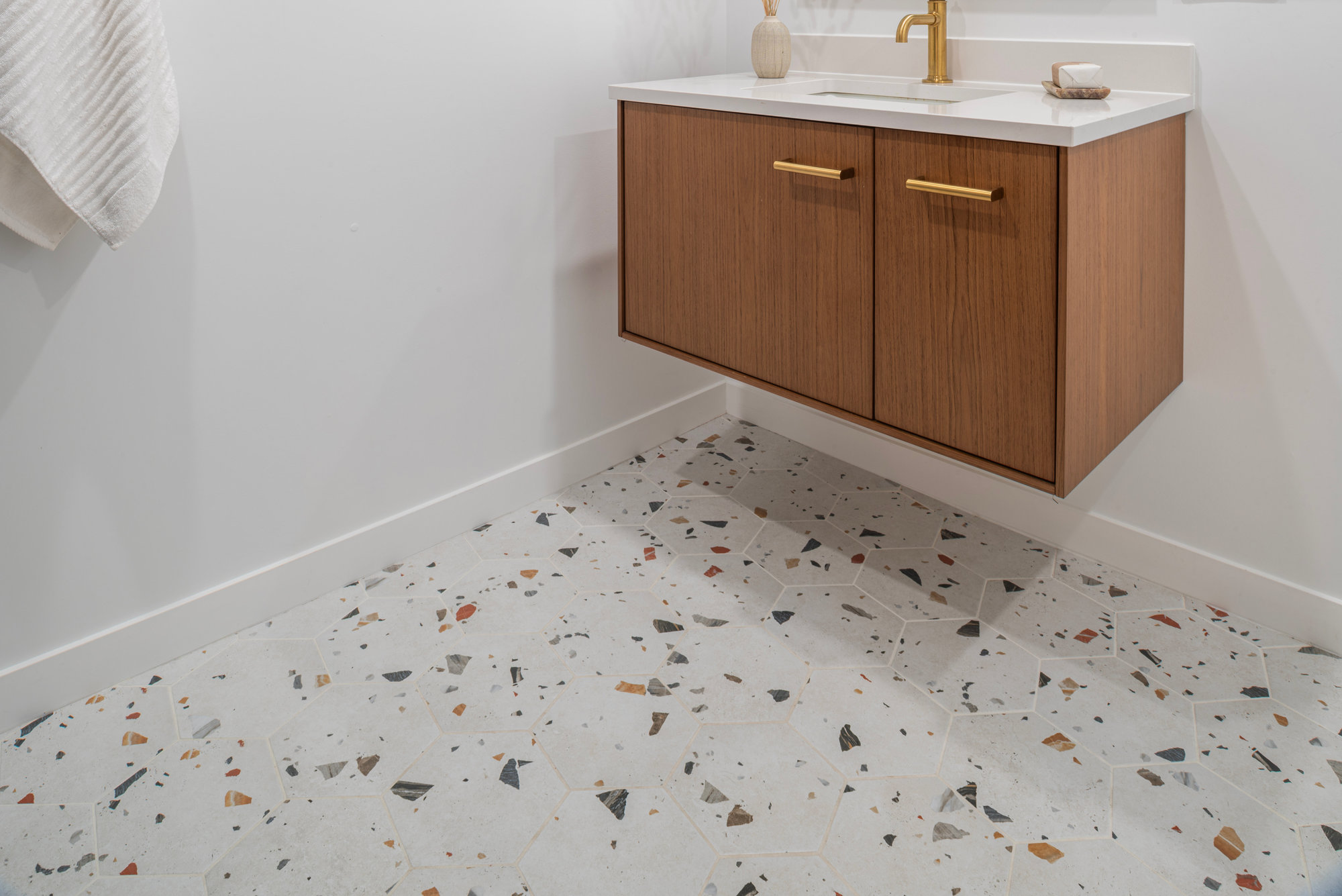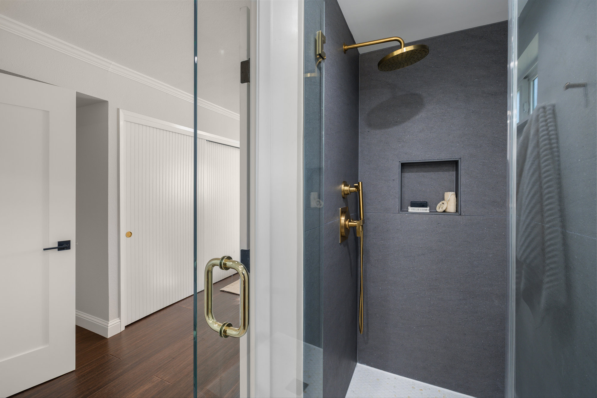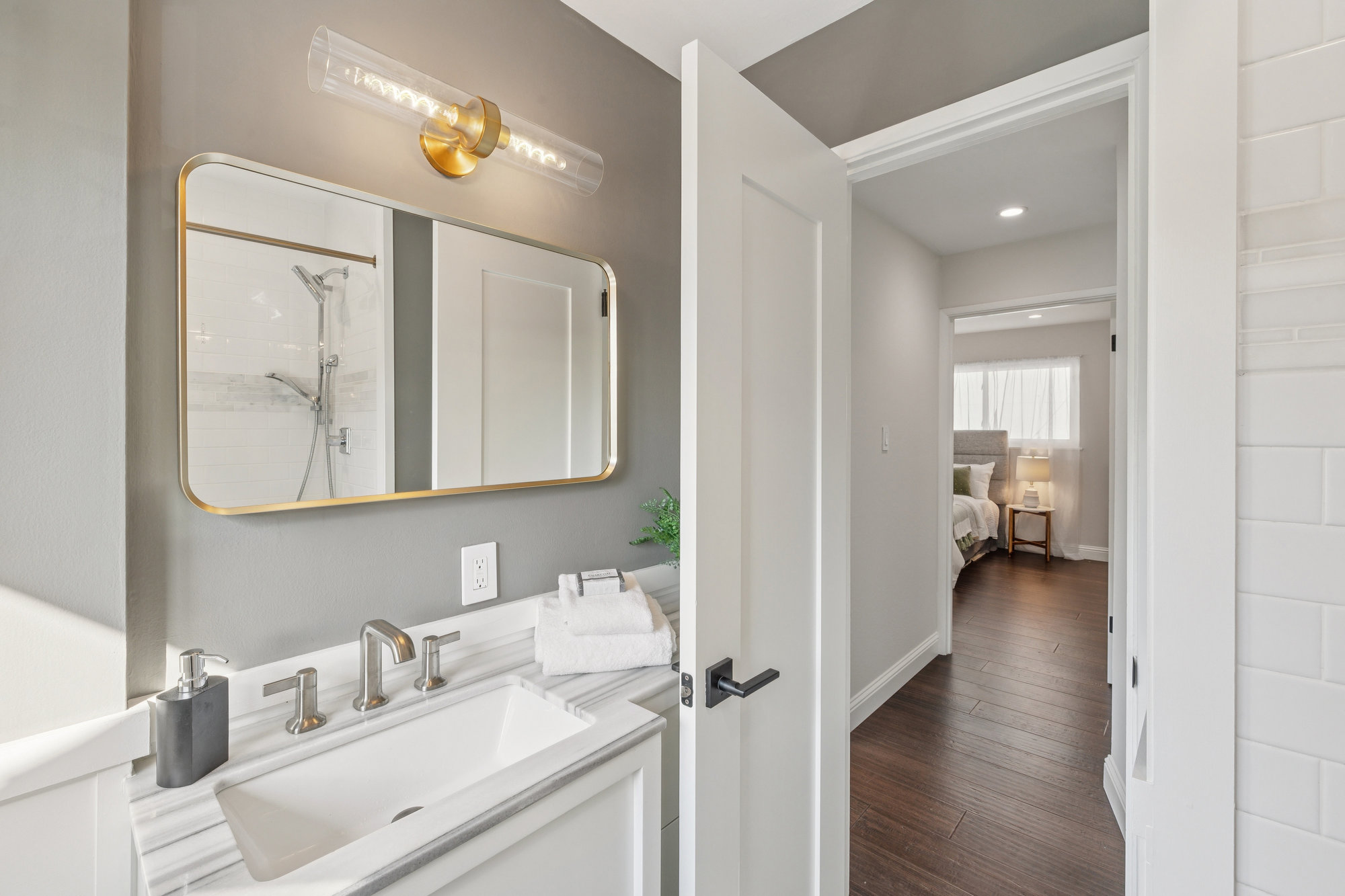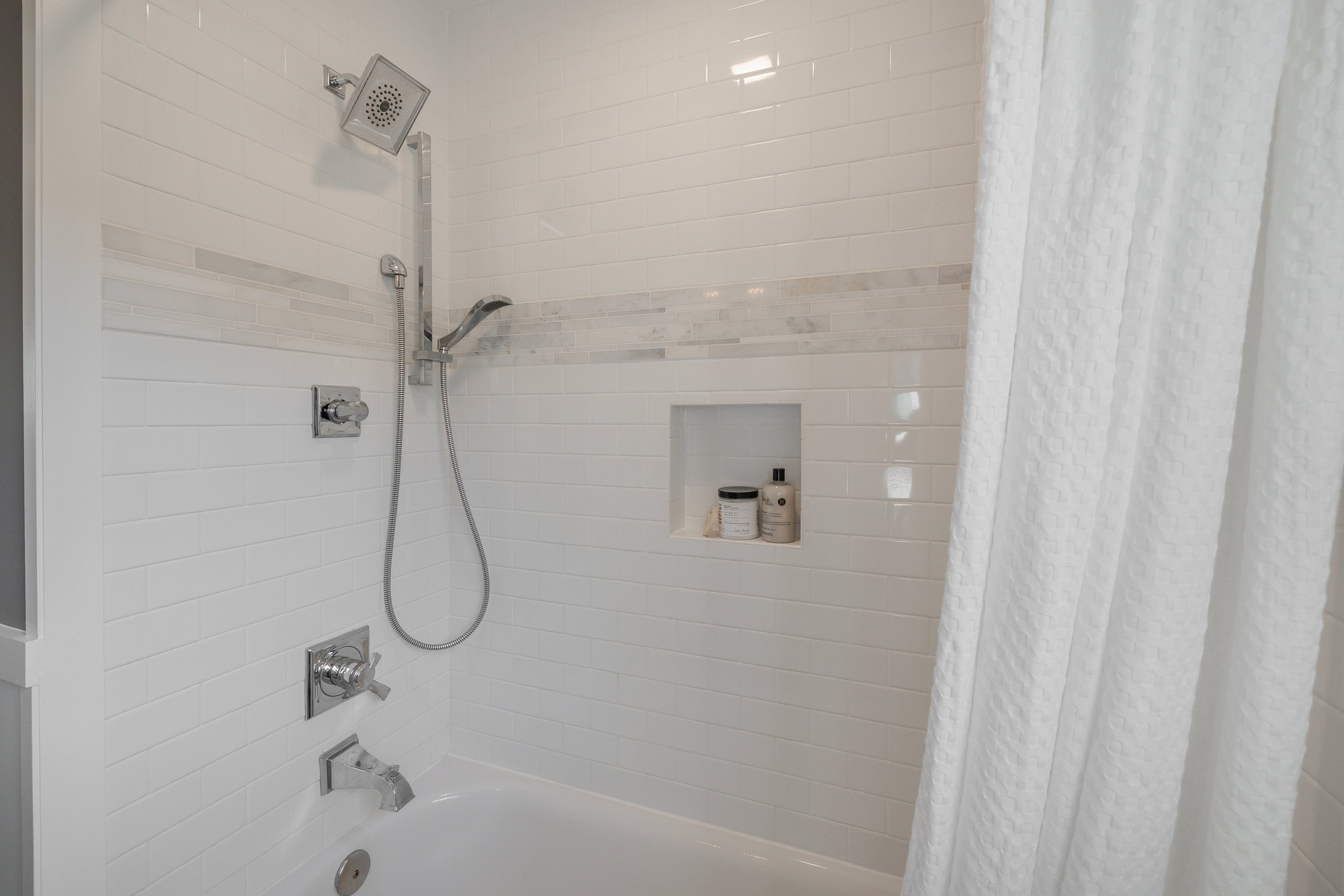 — Two remodeled designer bathrooms featuring new lighting and porcelain tile