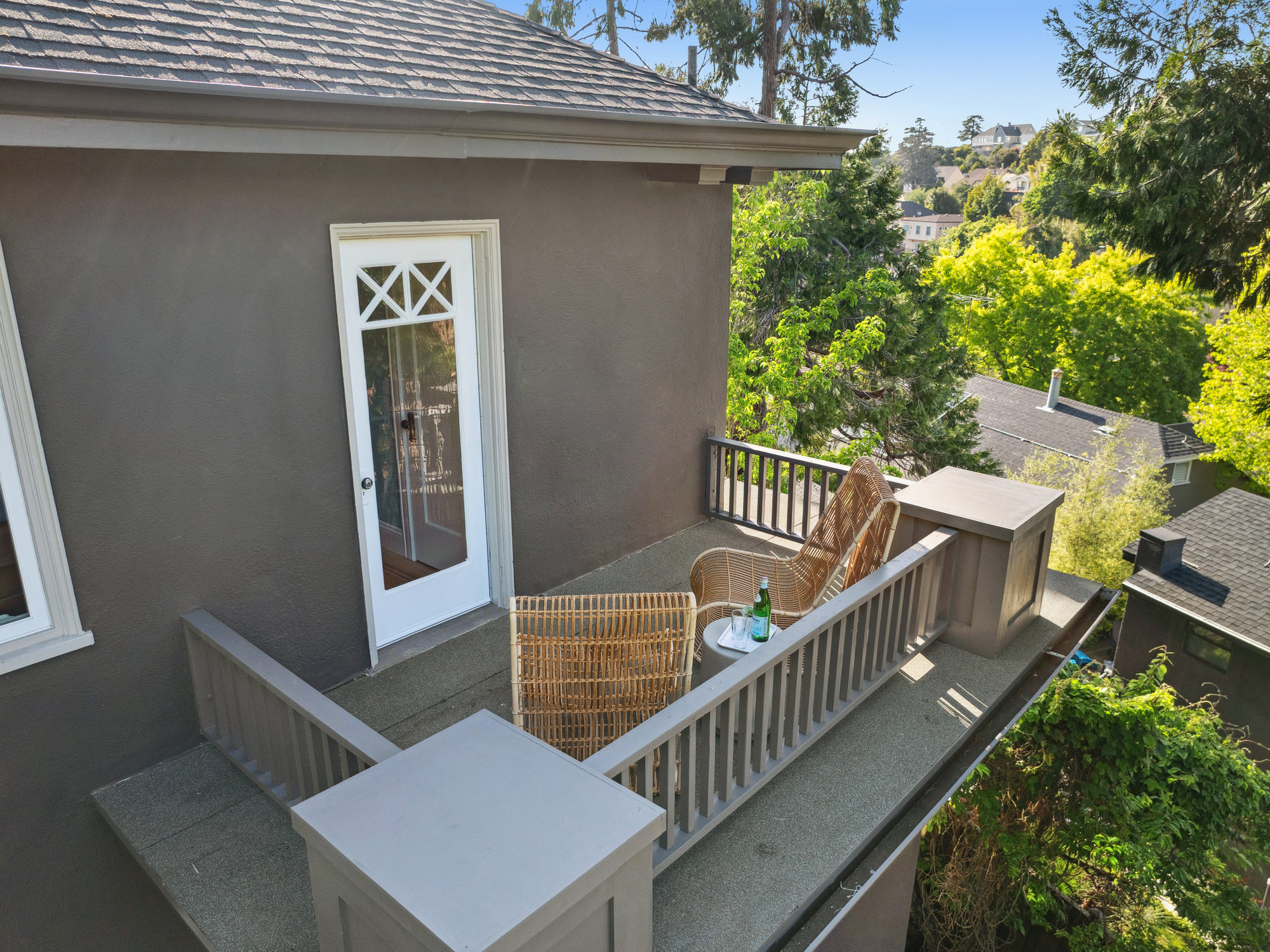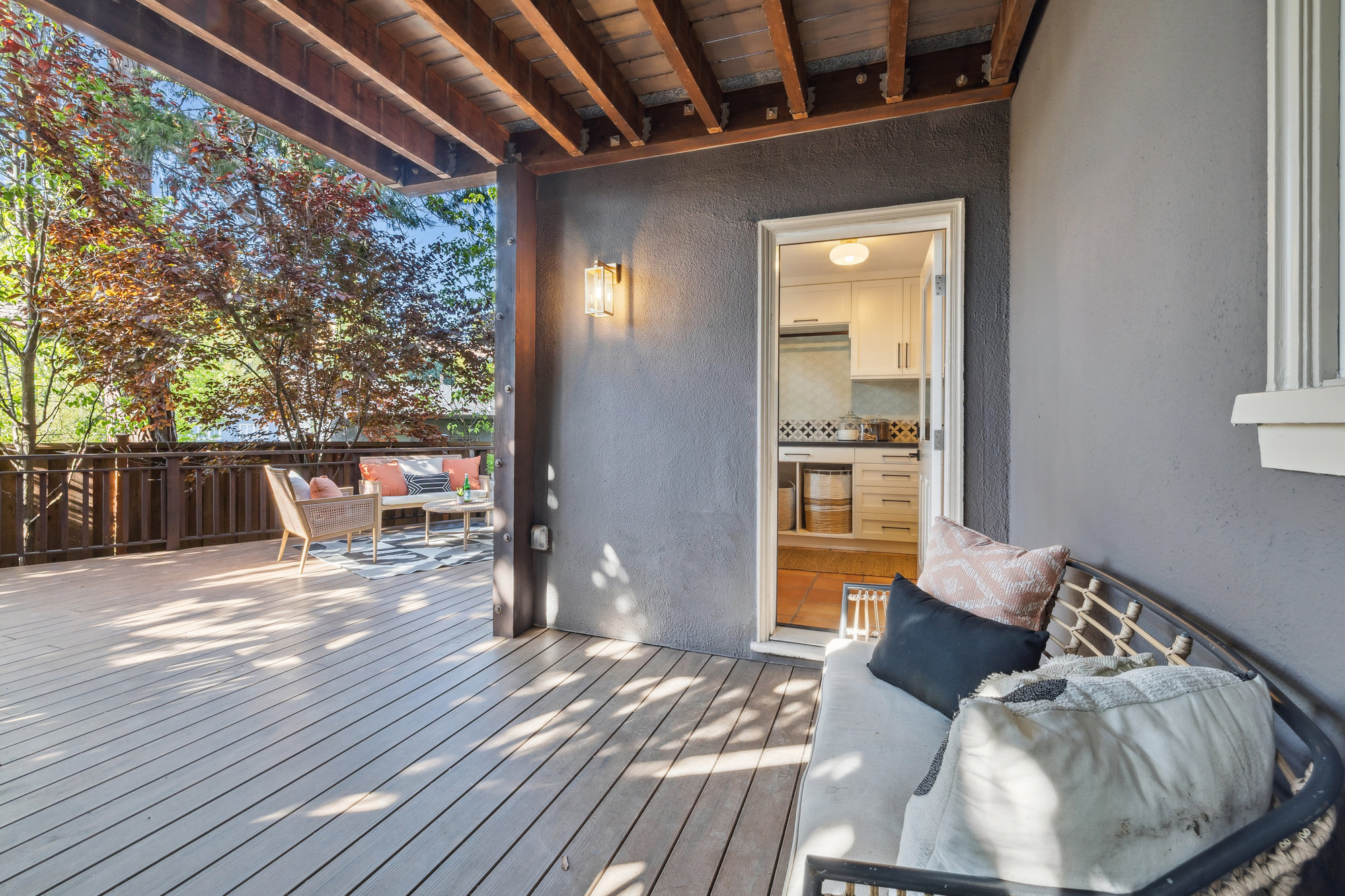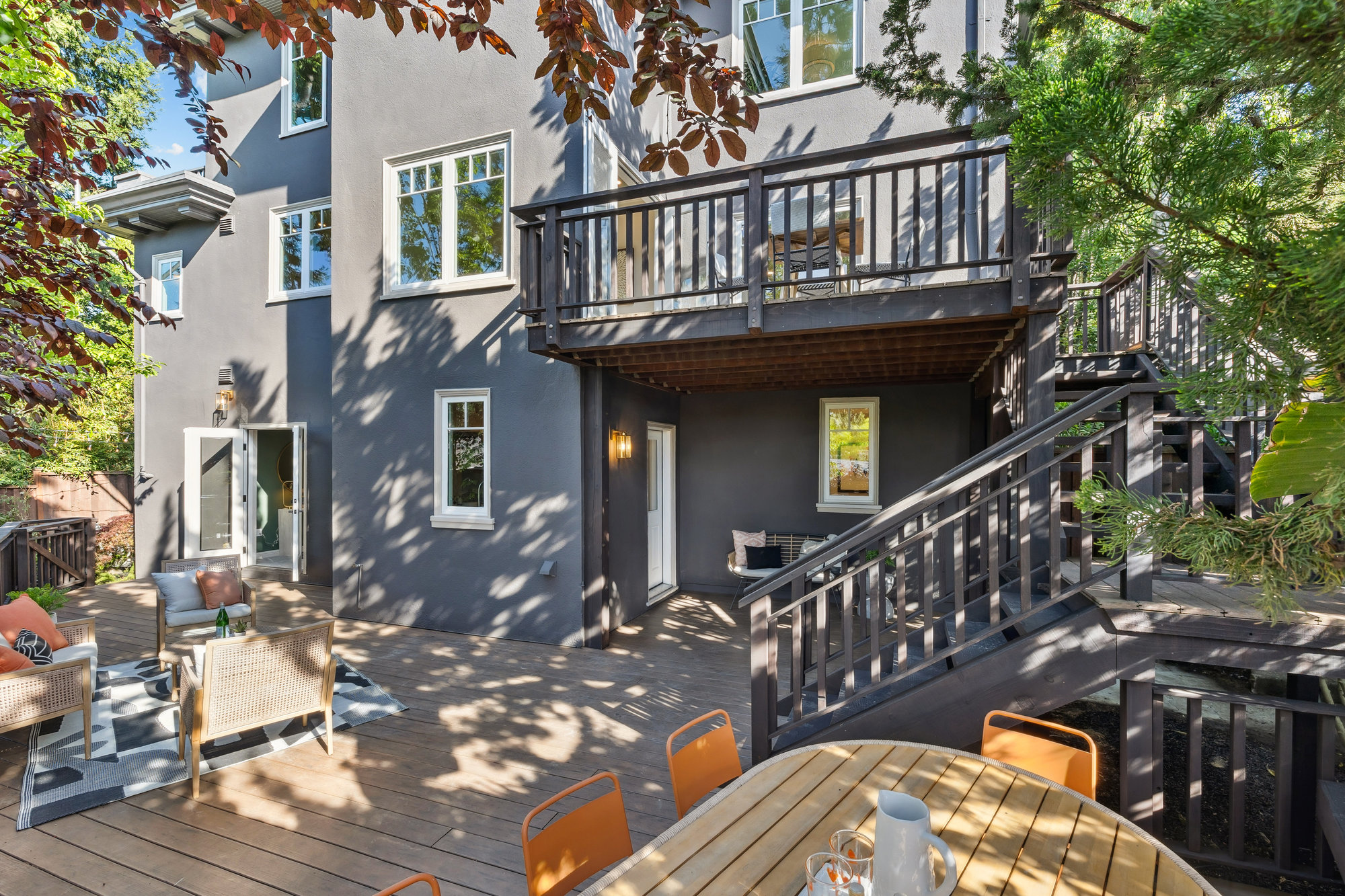 The updated kitchen features quartz countertops, stainless steel appliances, custom tile backsplash, and treetop views from the adjacent breakfast room—opening onto a private deck for effortless indoor-outdoor dining. A charming powder room with designer touches completes the main level. Upstairs, three bedrooms and a renovated hall bath offer comfort and charm, with balconies that take in neighborhood vistas. The bath includes a soaking tub, frameless glass shower, matte gold fixtures, and subway tile surround.