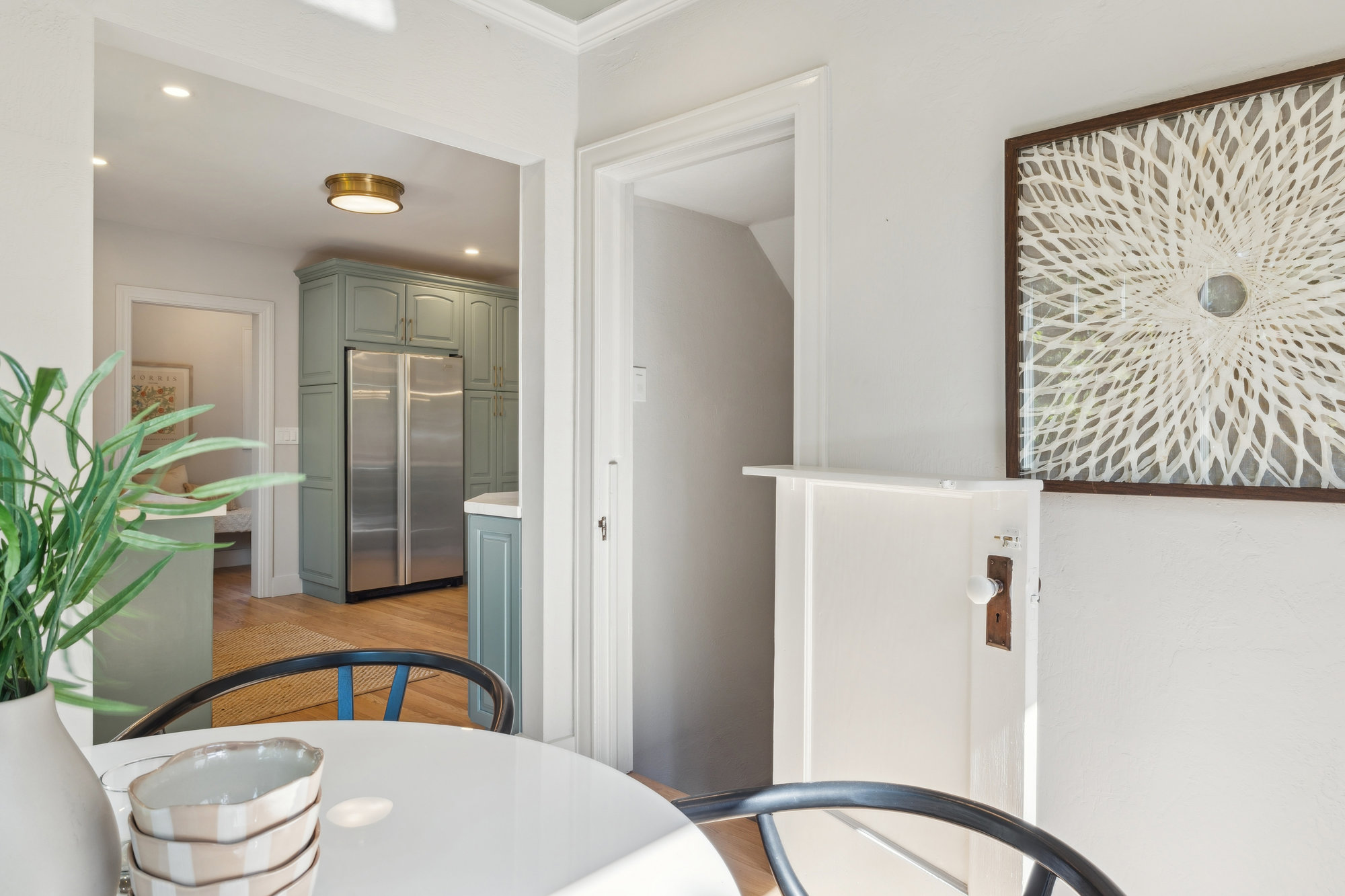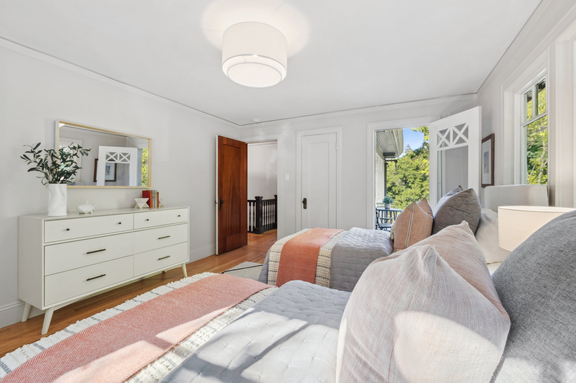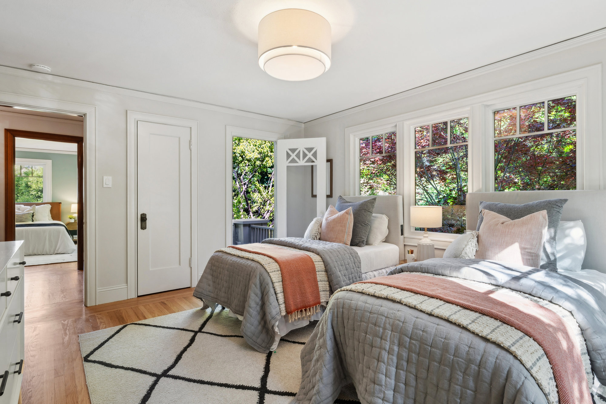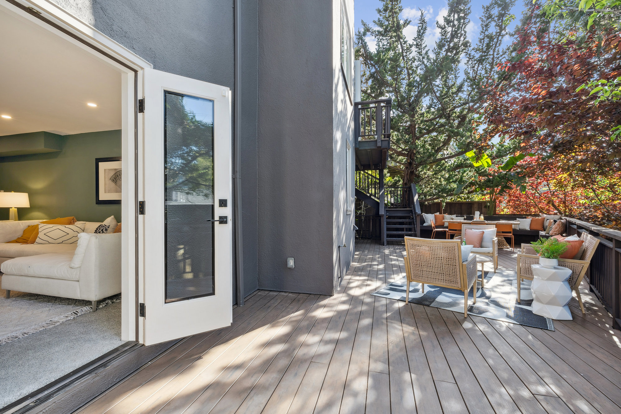 The updated kitchen features quartz countertops, stainless steel appliances, custom tile backsplash, and treetop views from the adjacent breakfast room—opening onto a private deck for effortless indoor-outdoor dining. A charming powder room with designer touches completes the main level. Upstairs, three bedrooms and a renovated hall bath offer comfort and charm, with balconies that take in neighborhood vistas. The bath includes a soaking tub, frameless glass shower, matte gold fixtures, and subway tile surround.