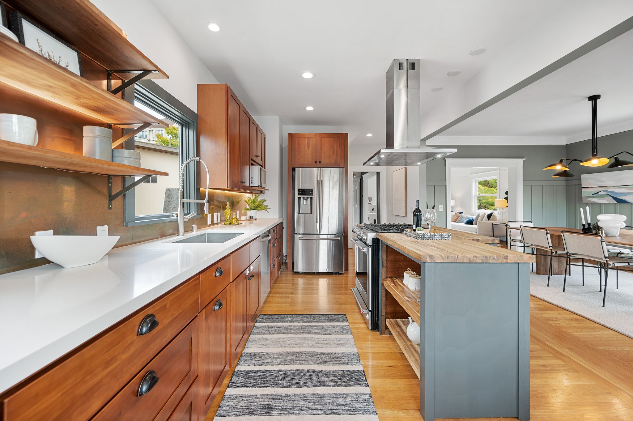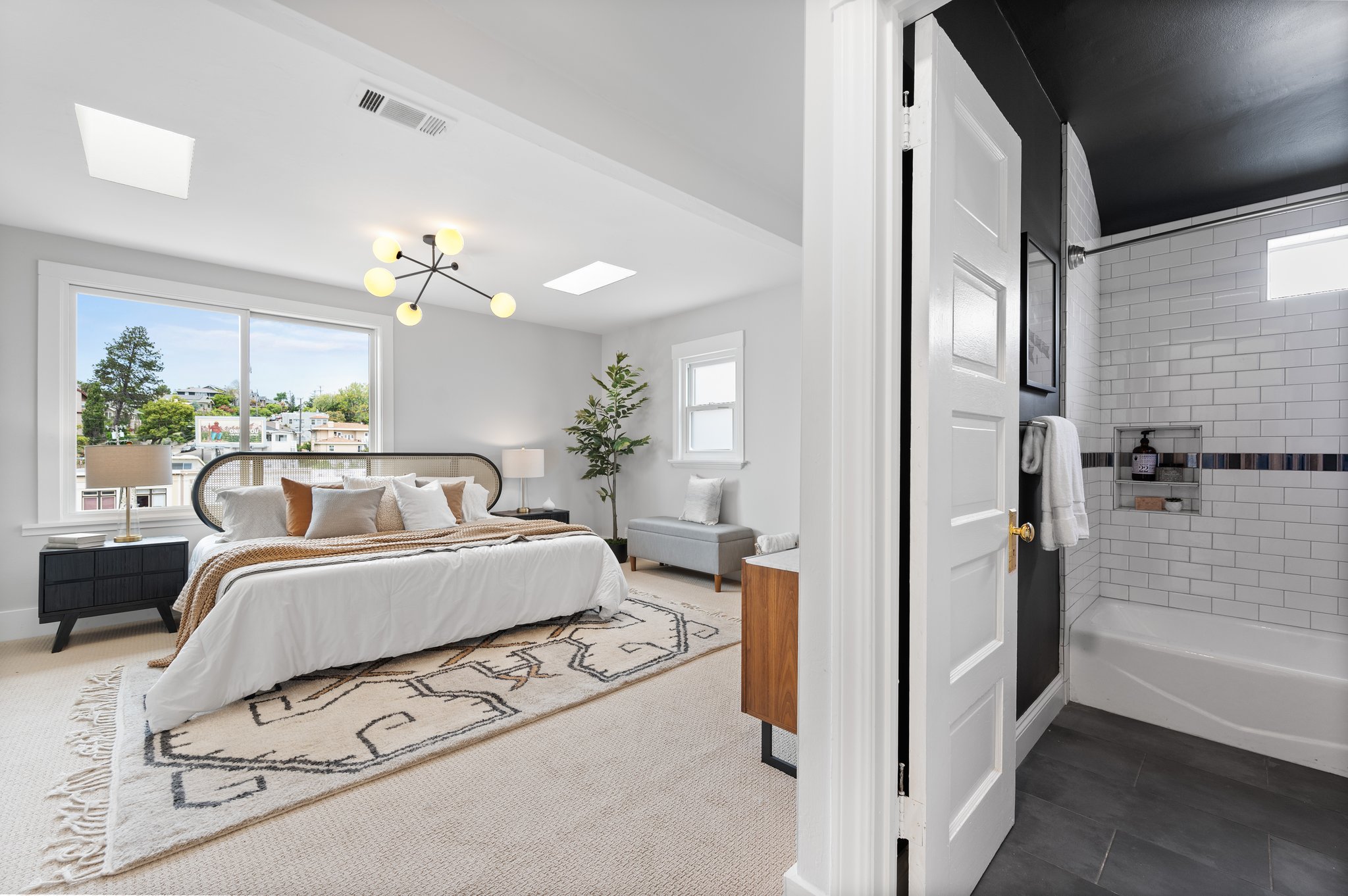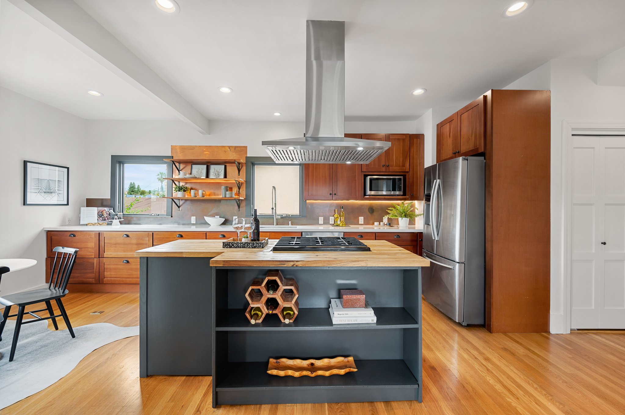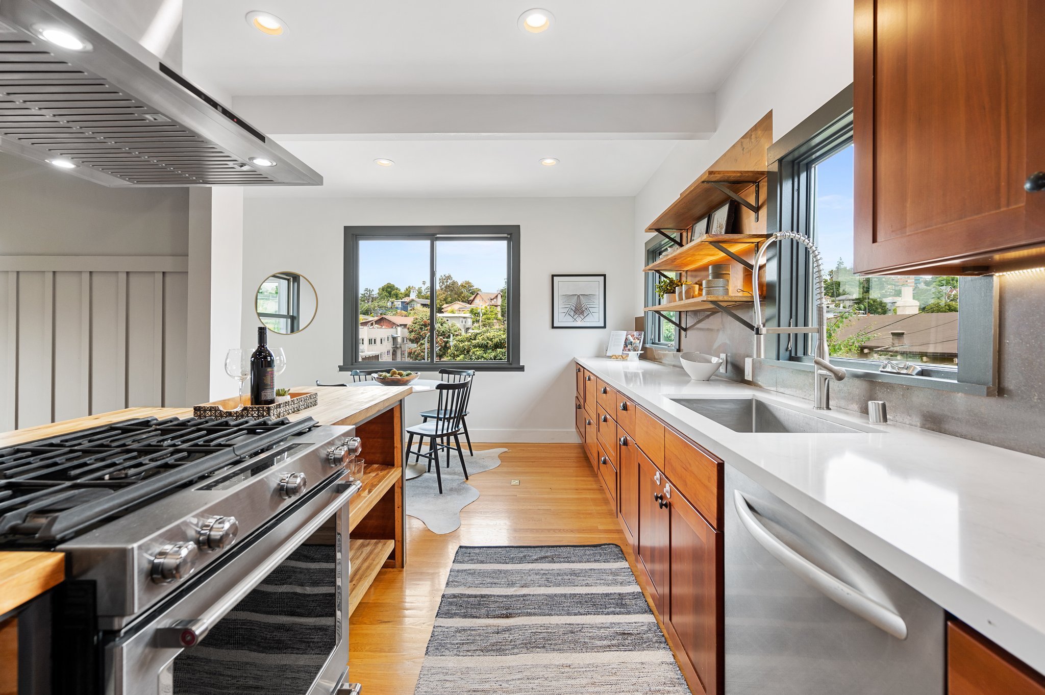 SOLD. 763 Walker Ave in Oakland! Stunning Grand Lake Craftsman Jewel on Walker in Oakland, with in-law, converted garage, and 99 WalkScore (Walkers Paradise WalkScore.com). Two-story Main House with sophisticated sun-filled Chef’s Kitchen offering stainless appliances, island with built-in range and hood, quartz counters, and breakfast nook. Stylized living and dining areas with designer lighting and vintage finishes. A spacious primary suite with custom skylights, ensuite bath, and commanding neighborhood views, along with a refreshed hall bath, and three more bedrooms are located on the upper level.