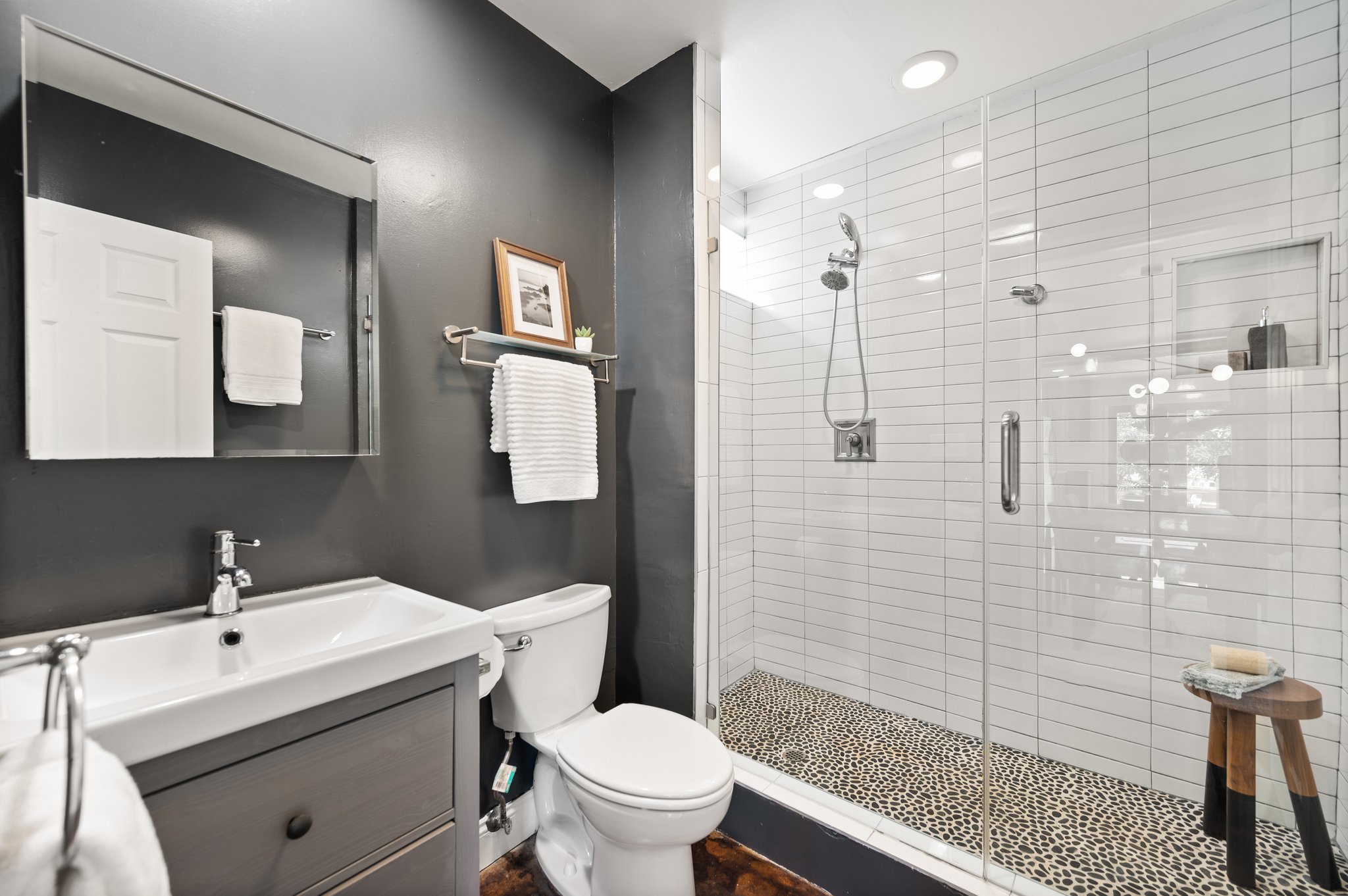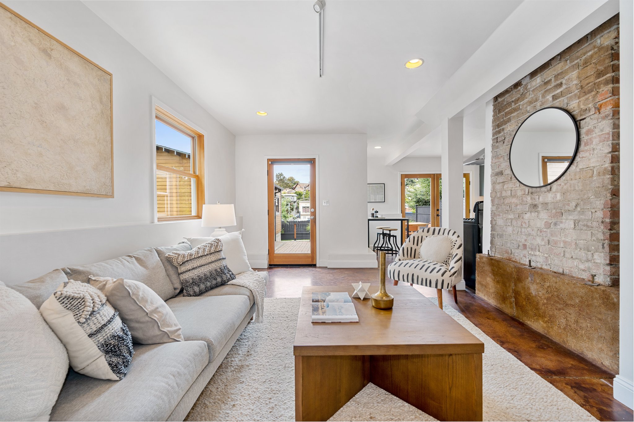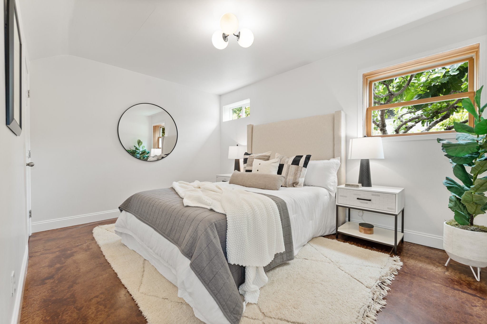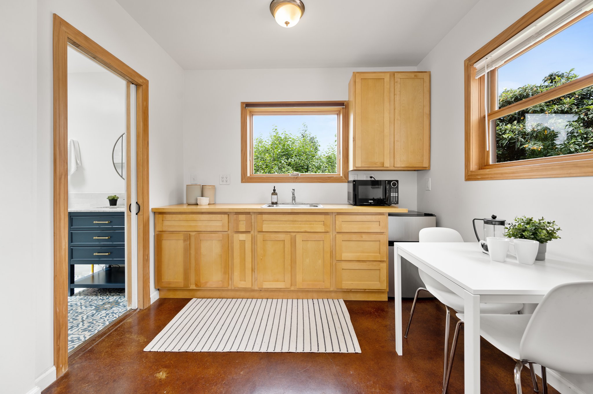 Below, the vacant one-bedroom apartment flaunts polished concrete floors, industrial brick accents, dwell inspired bath, and large bedroom with a walk-in closet and laundry. The detached garage has been partitioned with 1/2 converted into what has been a thriving Airbnb. Fully furnished and updated with renovated bath, frameless glass shower, and kitchenette, this space is ideal for multiple purposes.