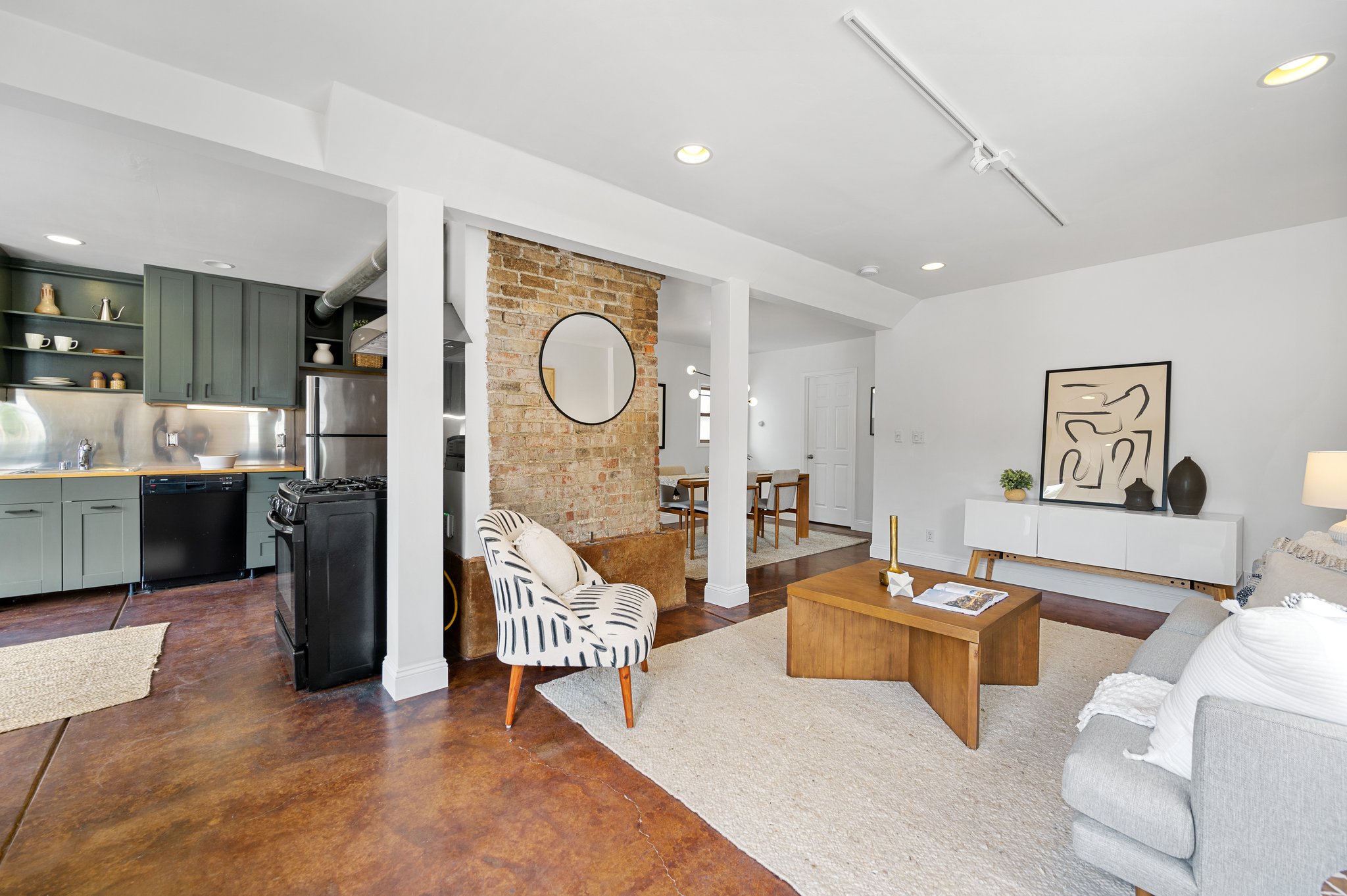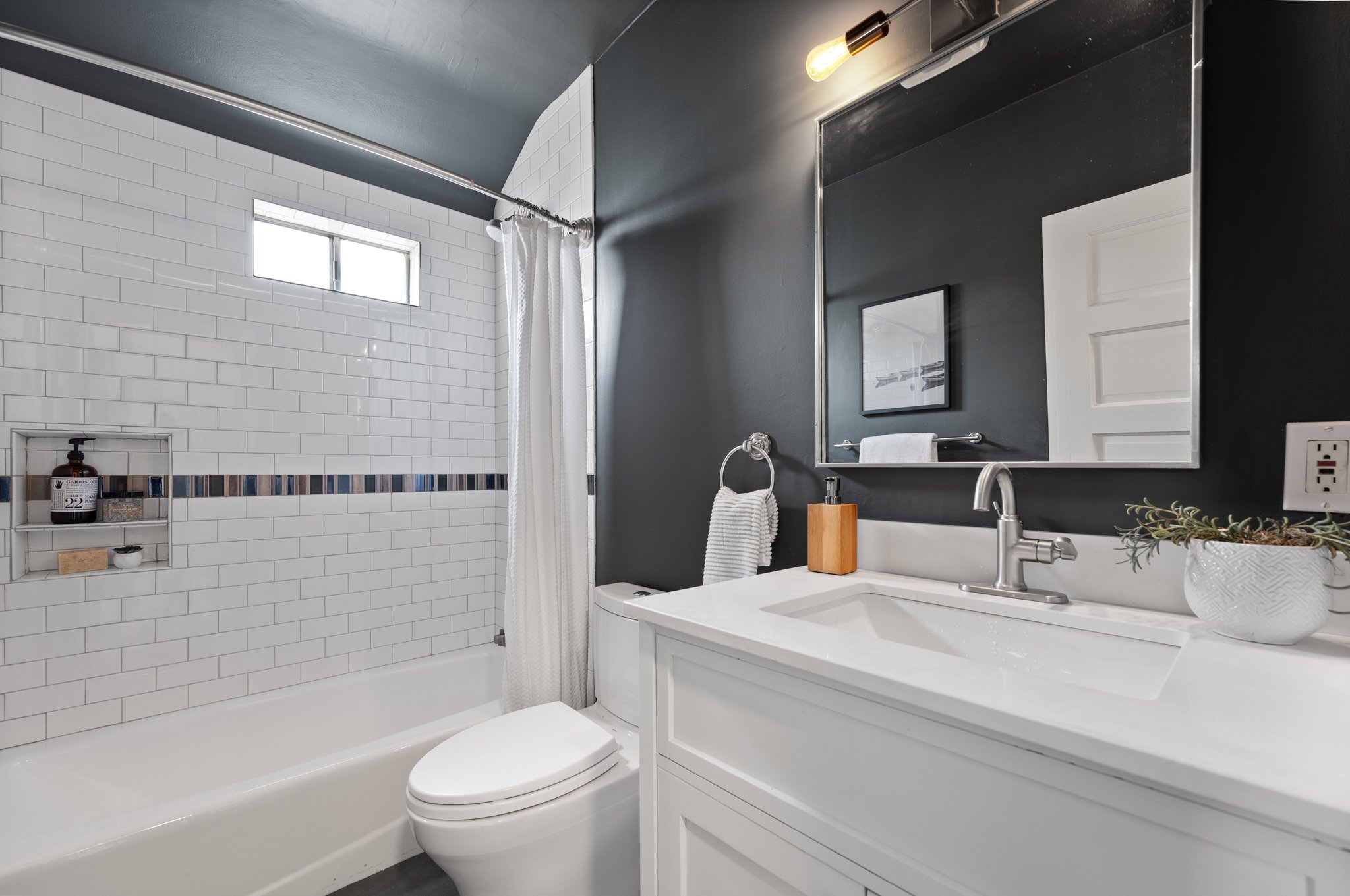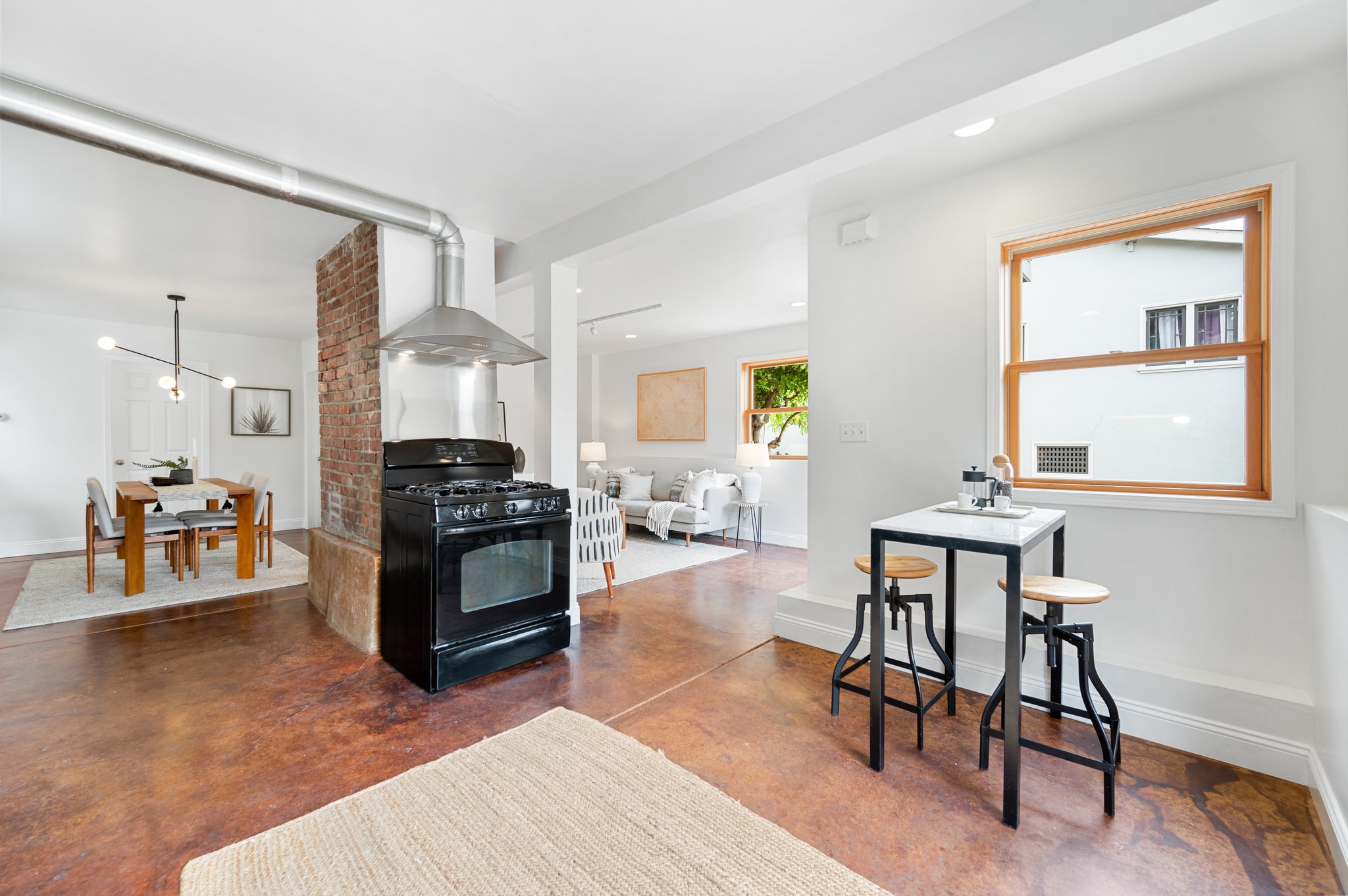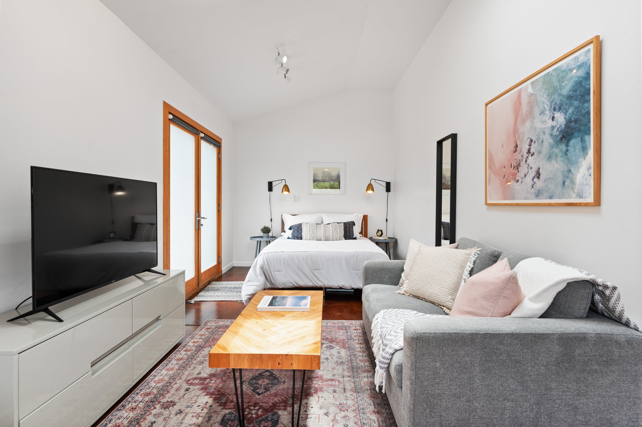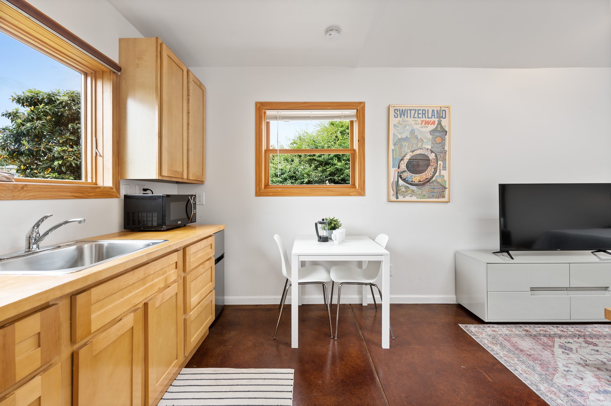 Below, the vacant one-bedroom apartment flaunts polished concrete floors, industrial brick accents, dwell inspired bath, and large bedroom with a walk-in closet and laundry. The detached garage has been partitioned with 1/2 converted into what has been a thriving Airbnb. Fully furnished and updated with renovated bath, frameless glass shower, and kitchenette, this space is ideal for multiple purposes.