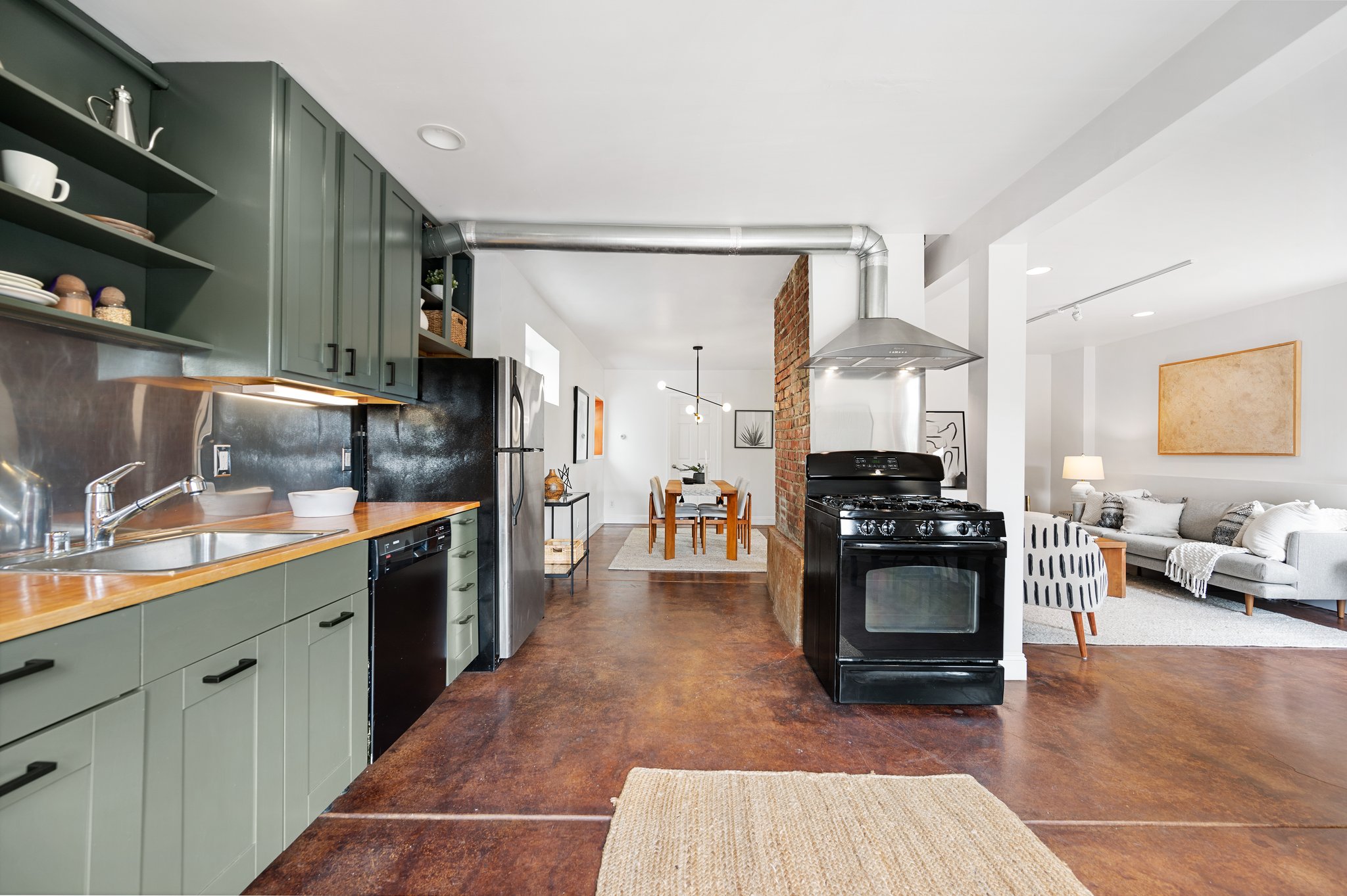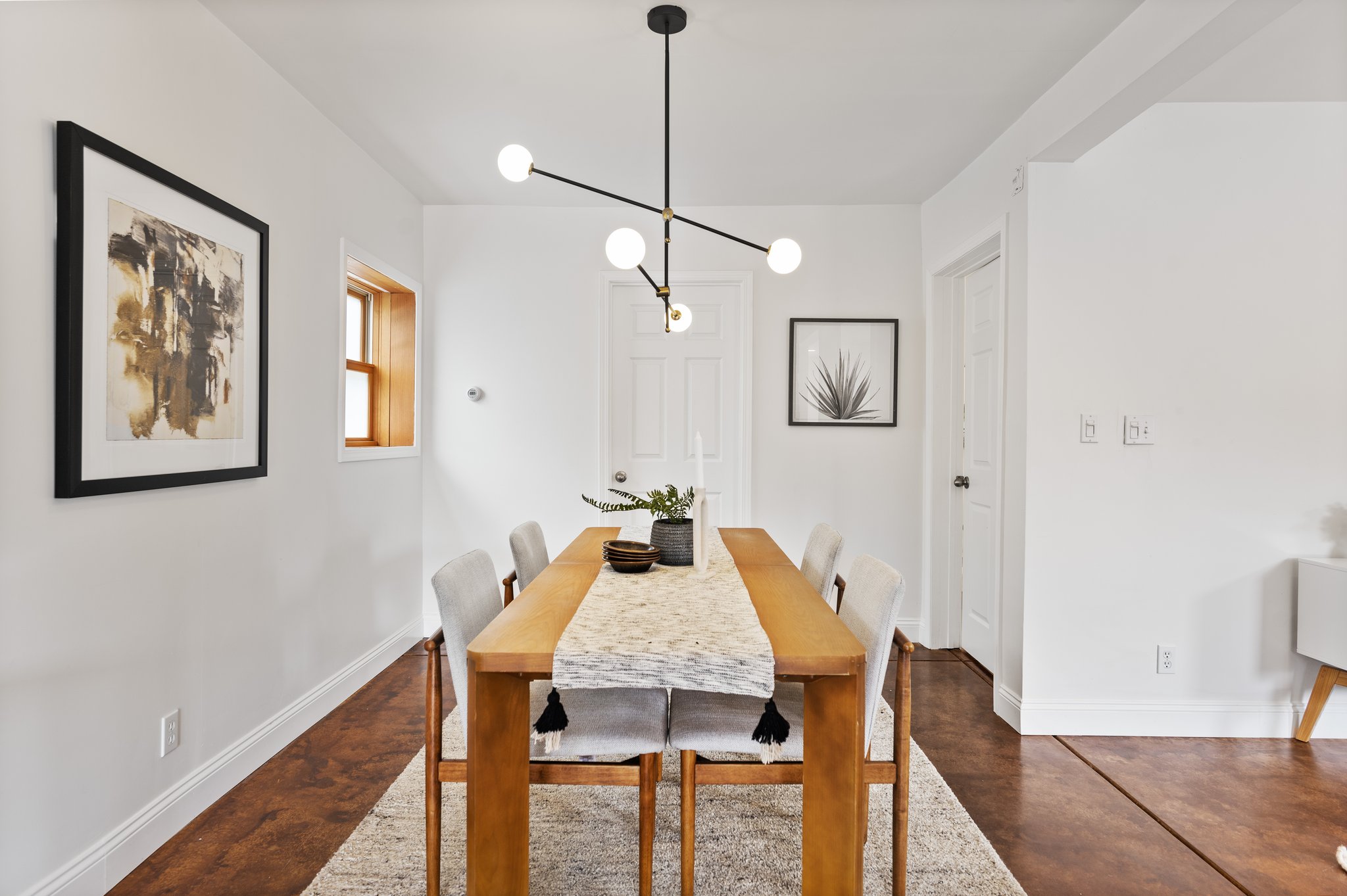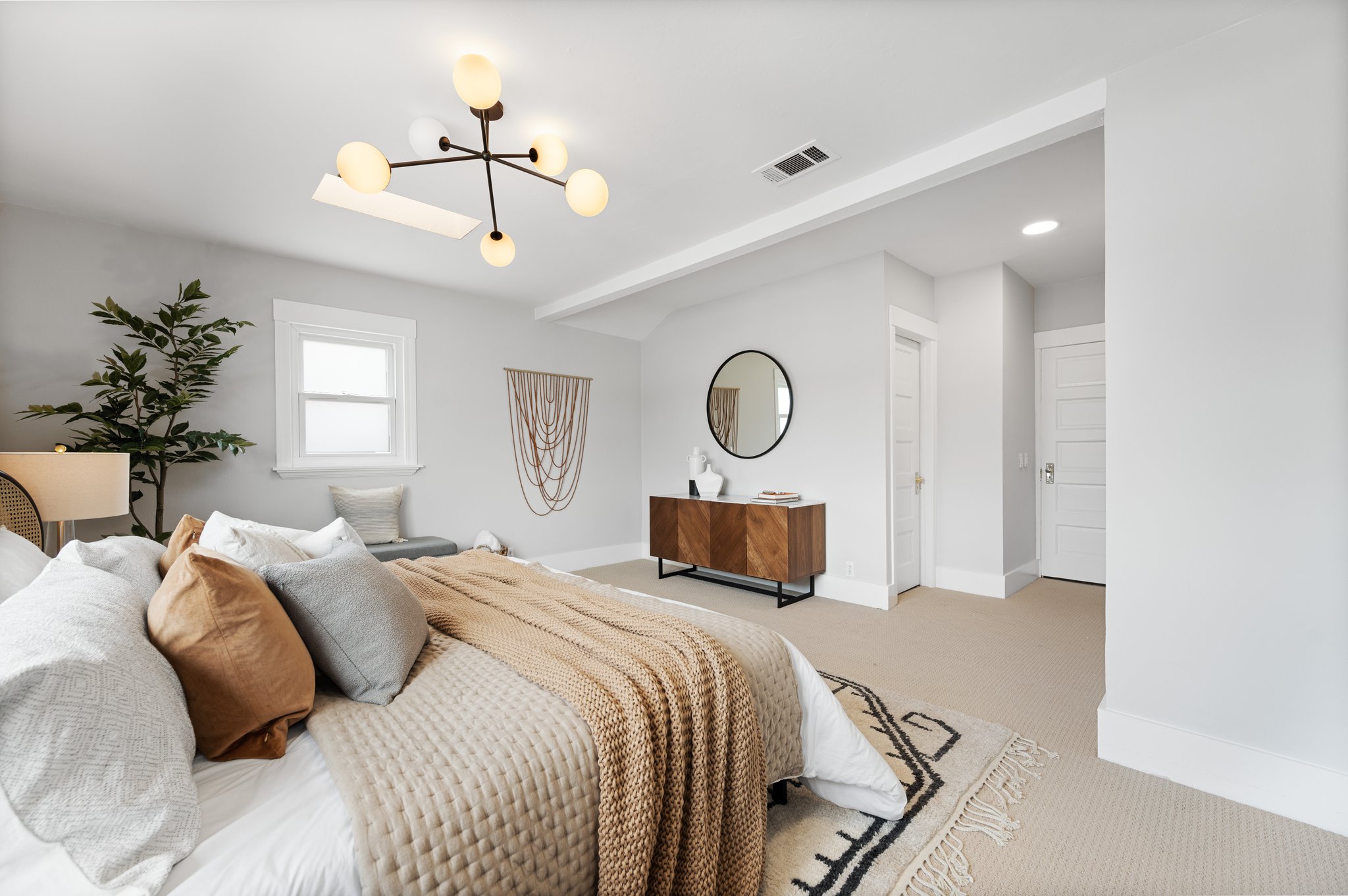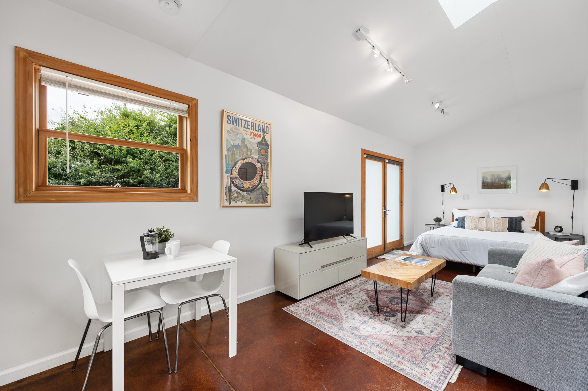 Below, the vacant one-bedroom apartment flaunts polished concrete floors, industrial brick accents, dwell inspired bath, and large bedroom with a walk-in closet and laundry. The detached garage has been partitioned with 1/2 converted into what has been a thriving Airbnb. Fully furnished and updated with renovated bath, frameless glass shower, and kitchenette, this space is ideal for multiple purposes.