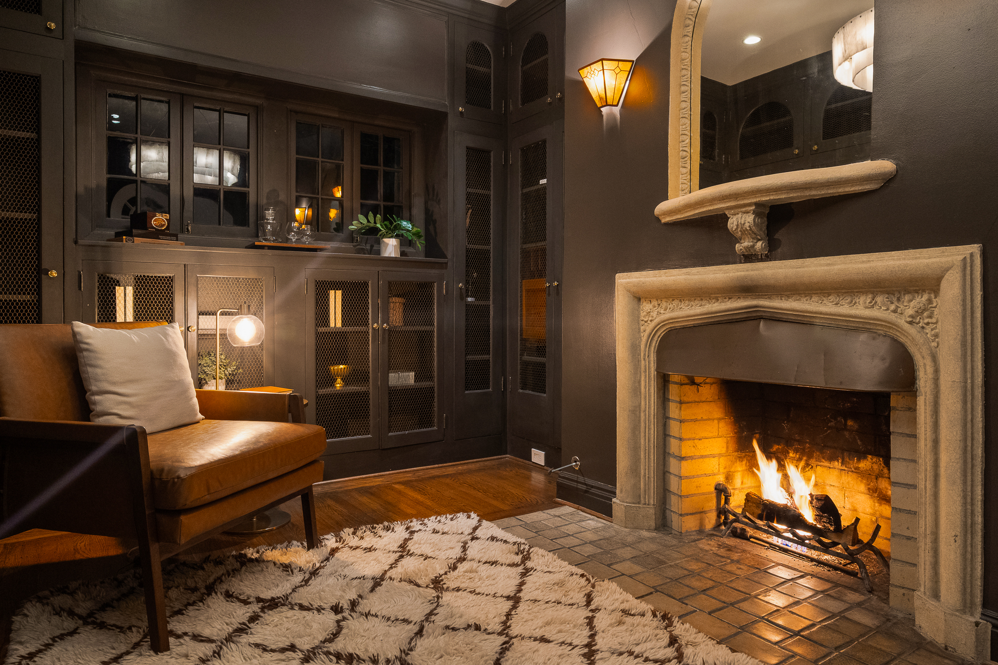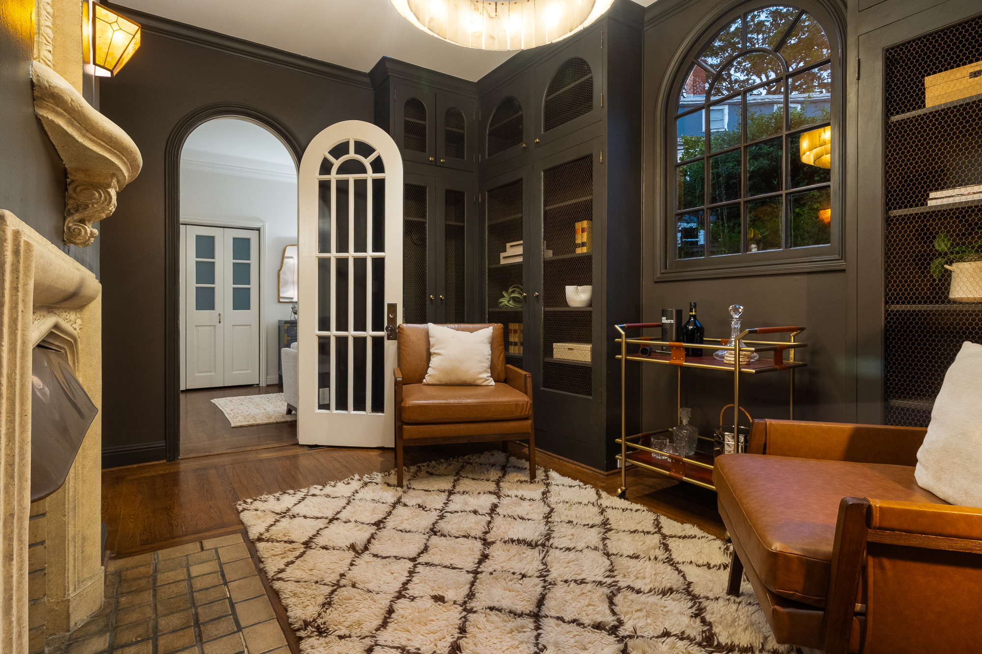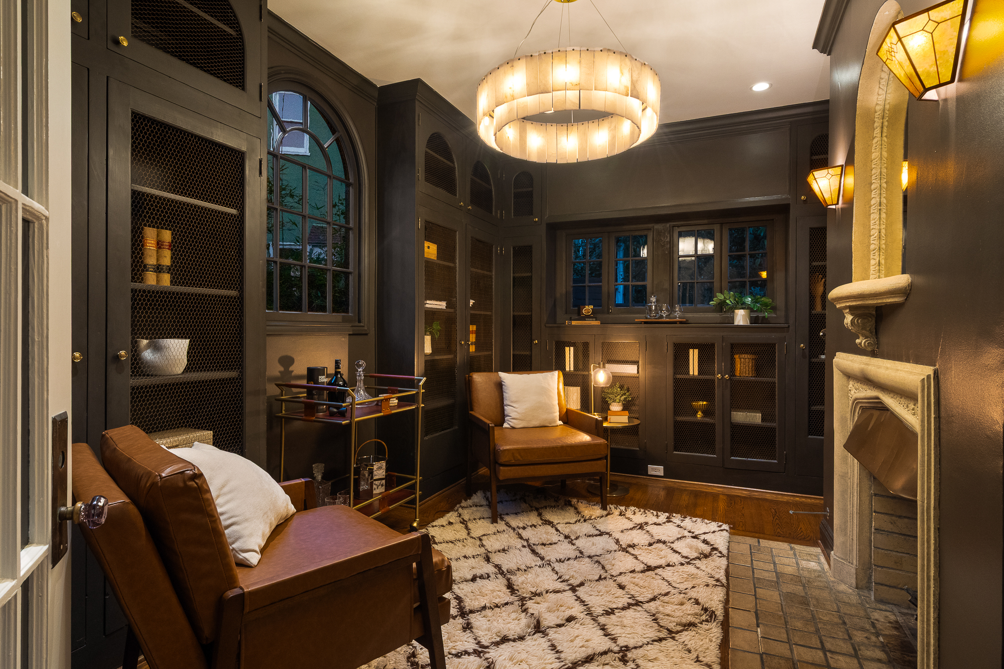 — Sultry library & elegant living room each with dedicated fireplace