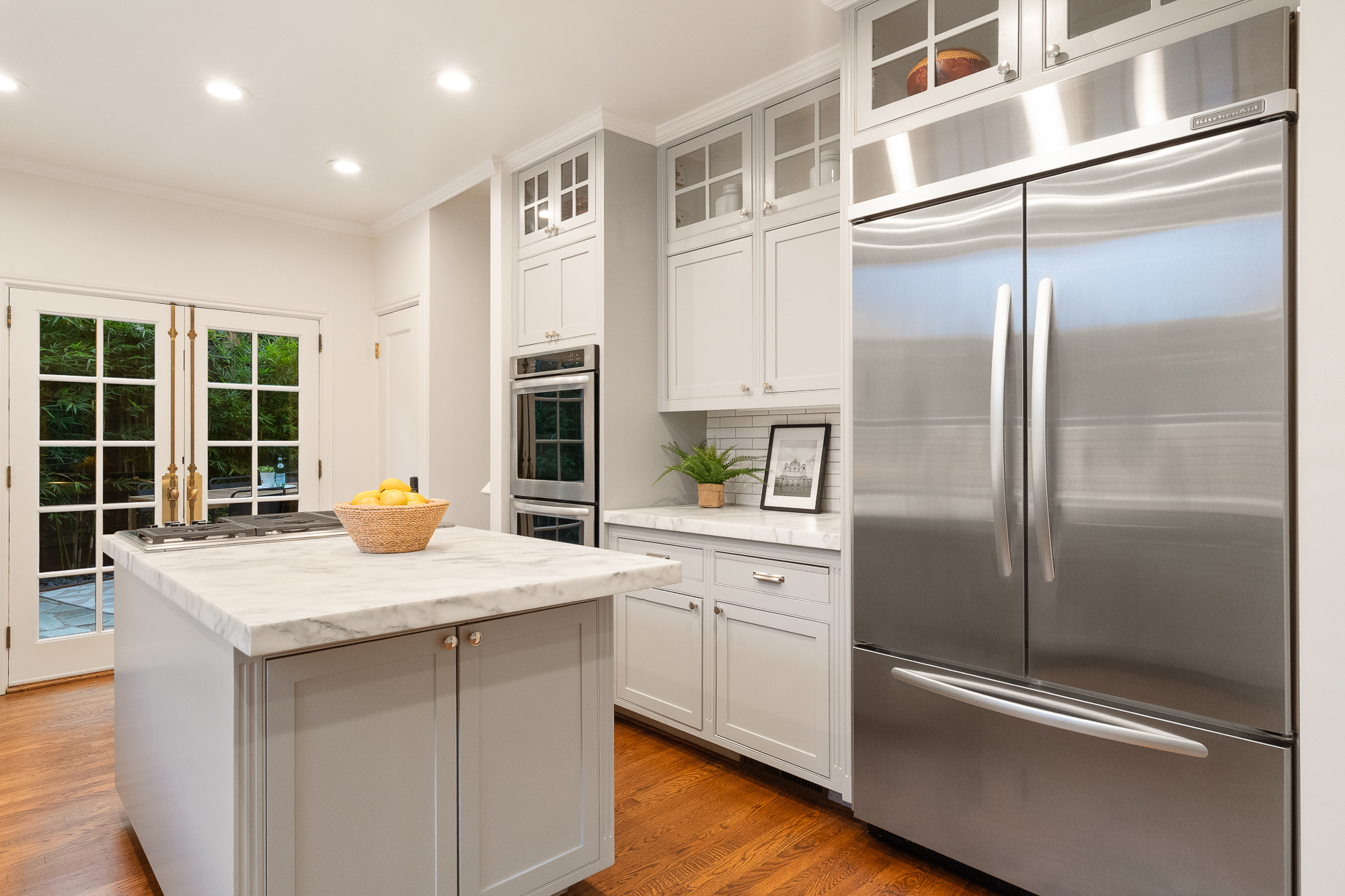 — Chef’s kitchen with marble counter top & stainless appliances