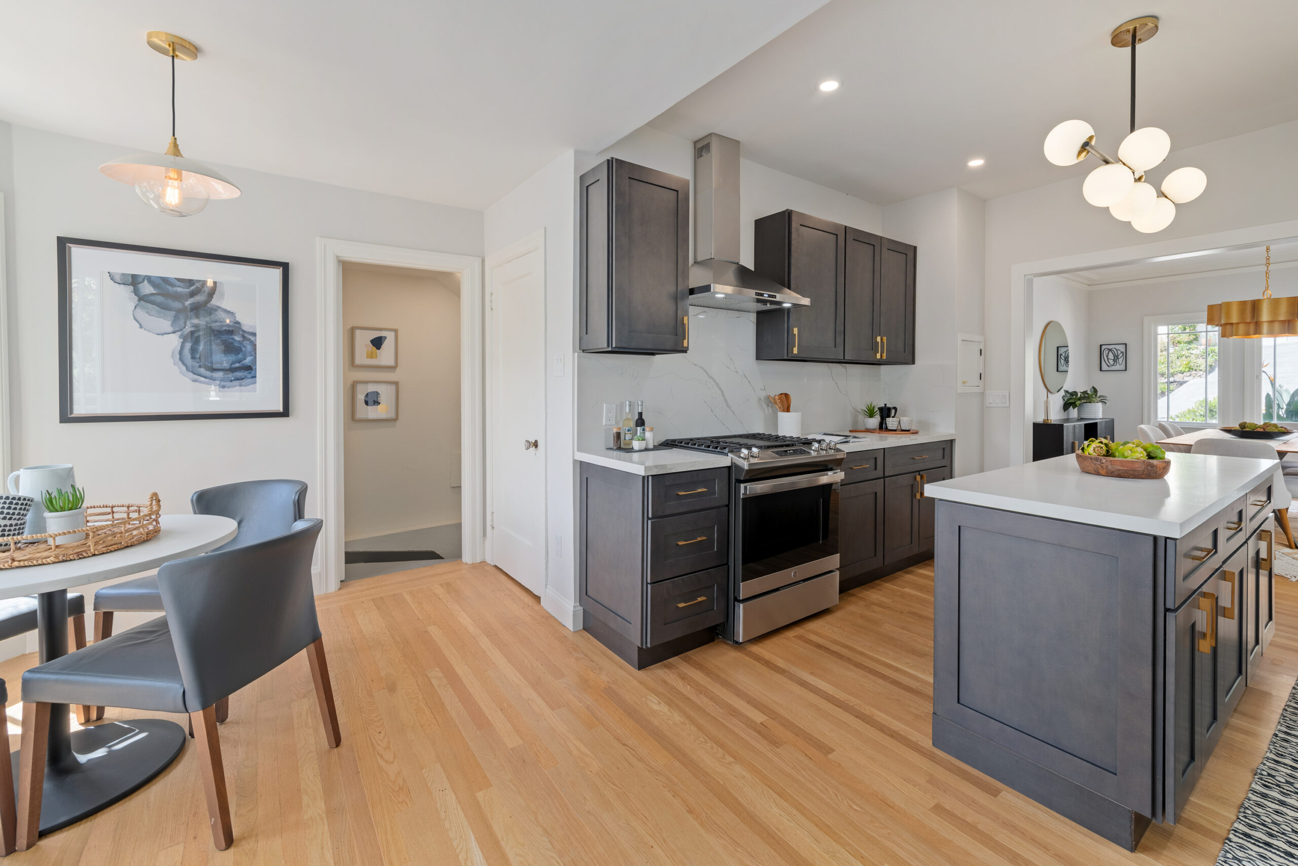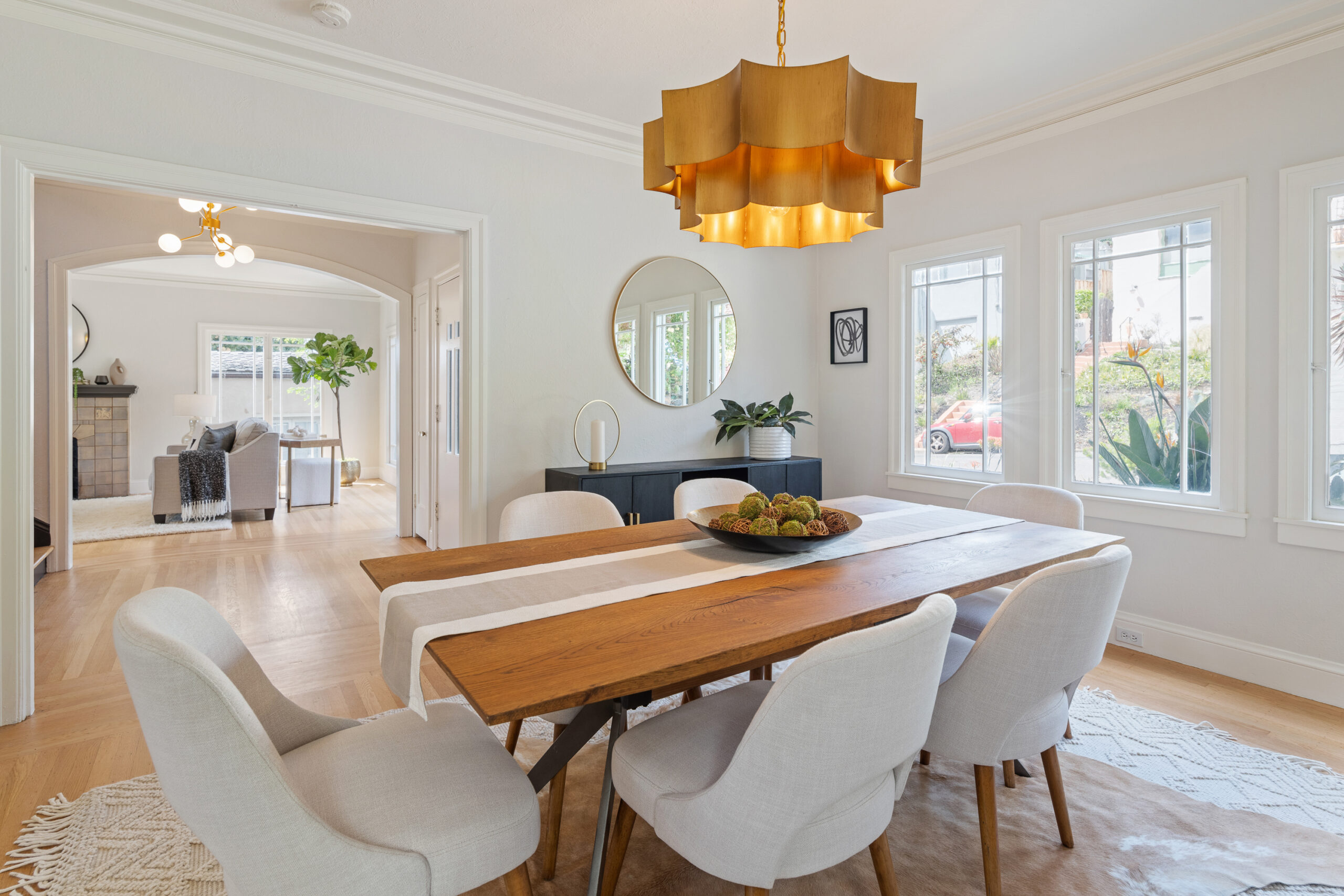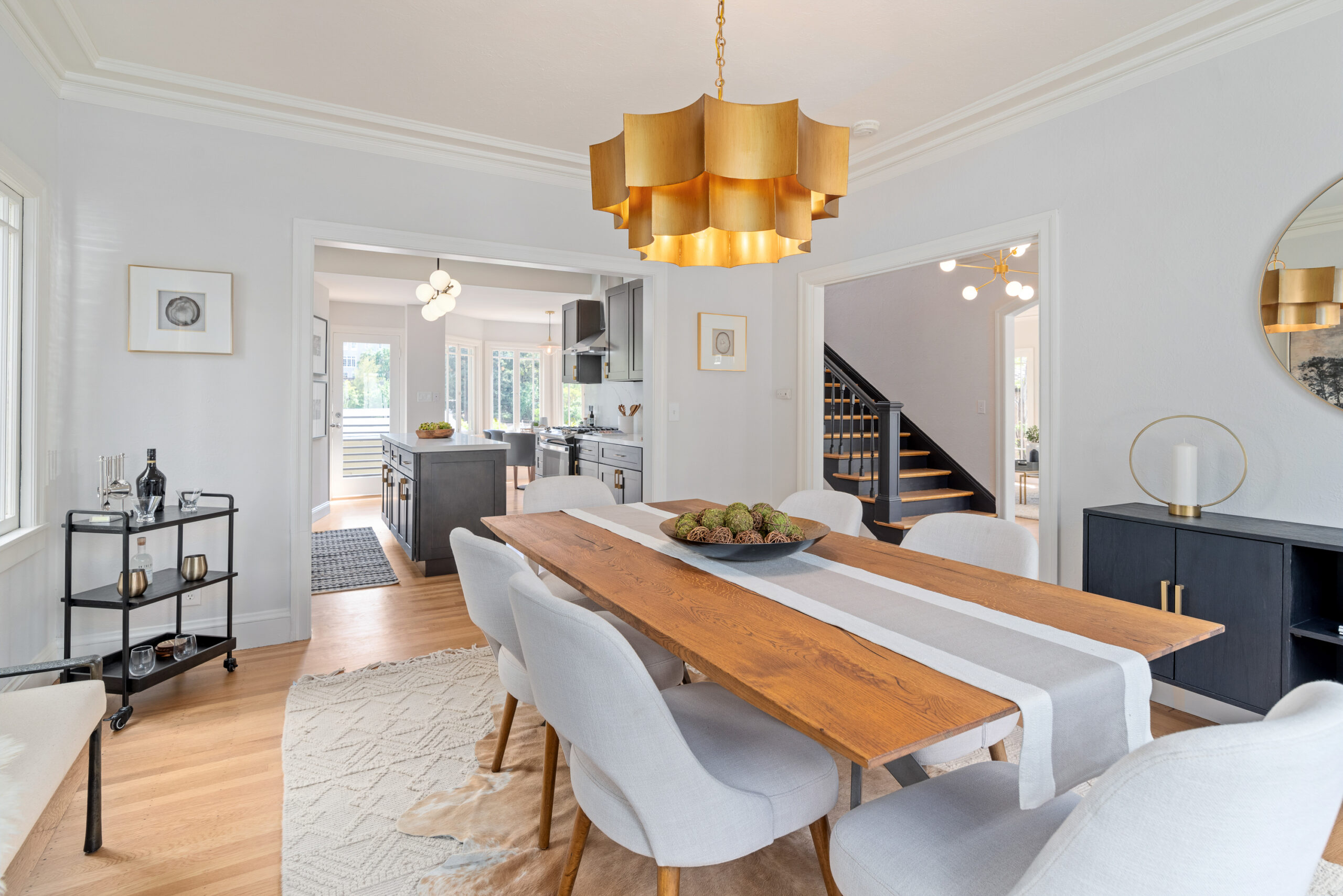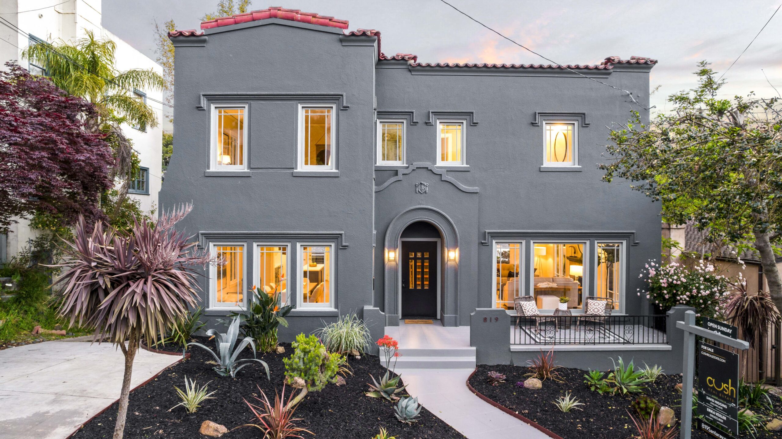 Stunning Crocker Highlands Mediterranean featuring Dwell inspired finishes. Light filled formal living and dining rooms, recently renovated kitchen with stone counters, inset sink, center island and stainless appliances including gas range and 4-door LG refrigerator. Dramatic foyer with designer lighting, wallpaper and impressive staircase leading to three well proportioned bedrooms including a primary suite with modernized full bath and a highly stylized full hall bathroom.