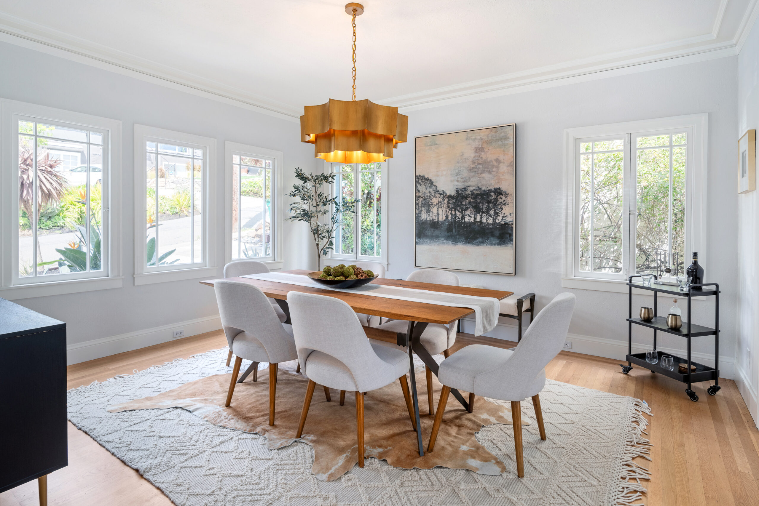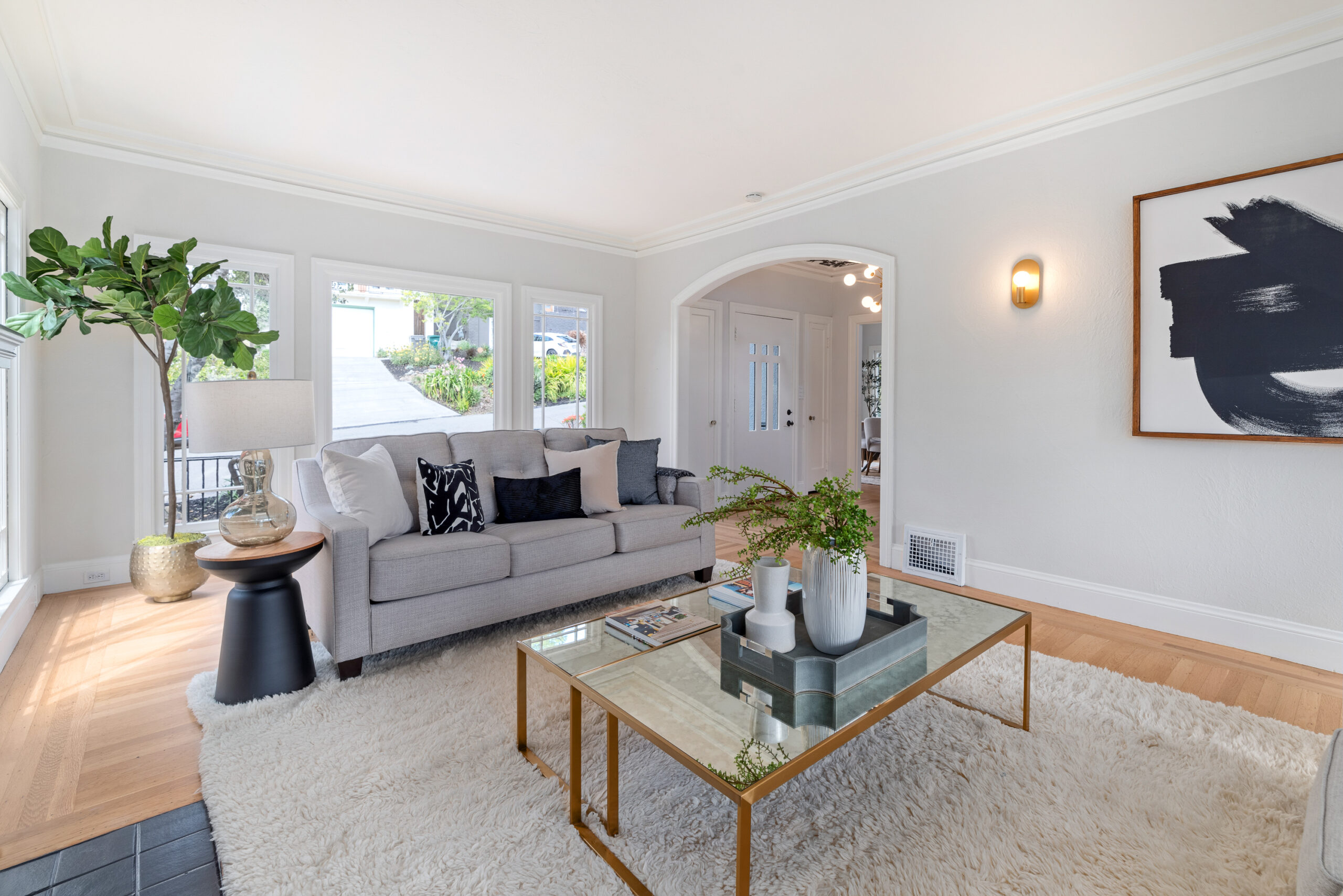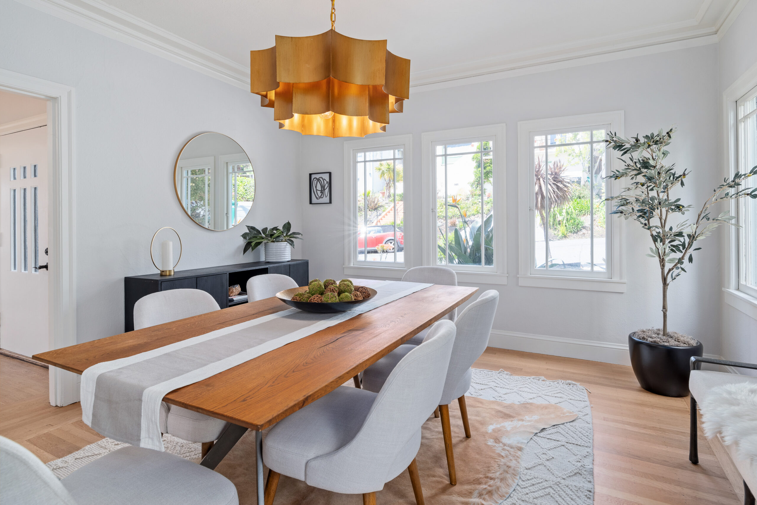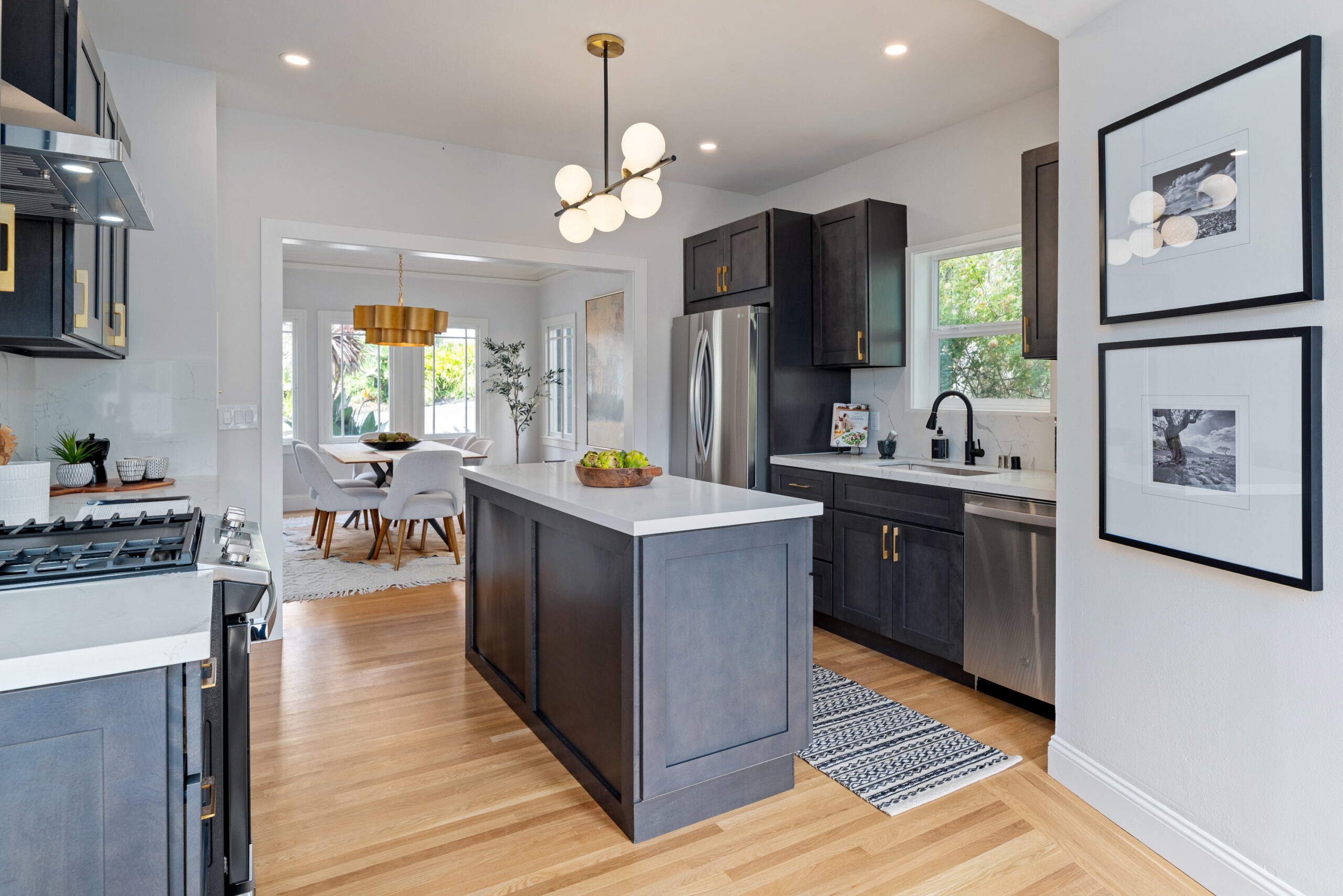 Stunning Crocker Highlands Mediterranean featuring Dwell inspired finishes. Light filled formal living and dining rooms, recently renovated kitchen with stone counters, inset sink, center island and stainless appliances including gas range and 4-door LG refrigerator. Dramatic foyer with designer lighting, wallpaper and impressive staircase leading to three well proportioned bedrooms including a primary suite with modernized full bath and a highly stylized full hall bathroom.