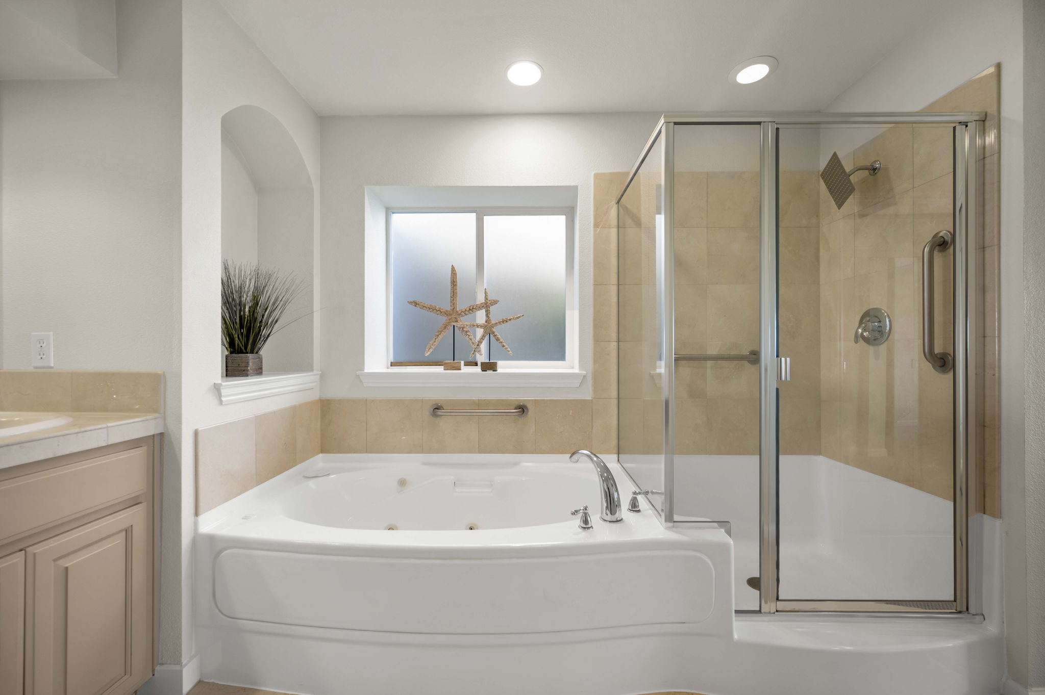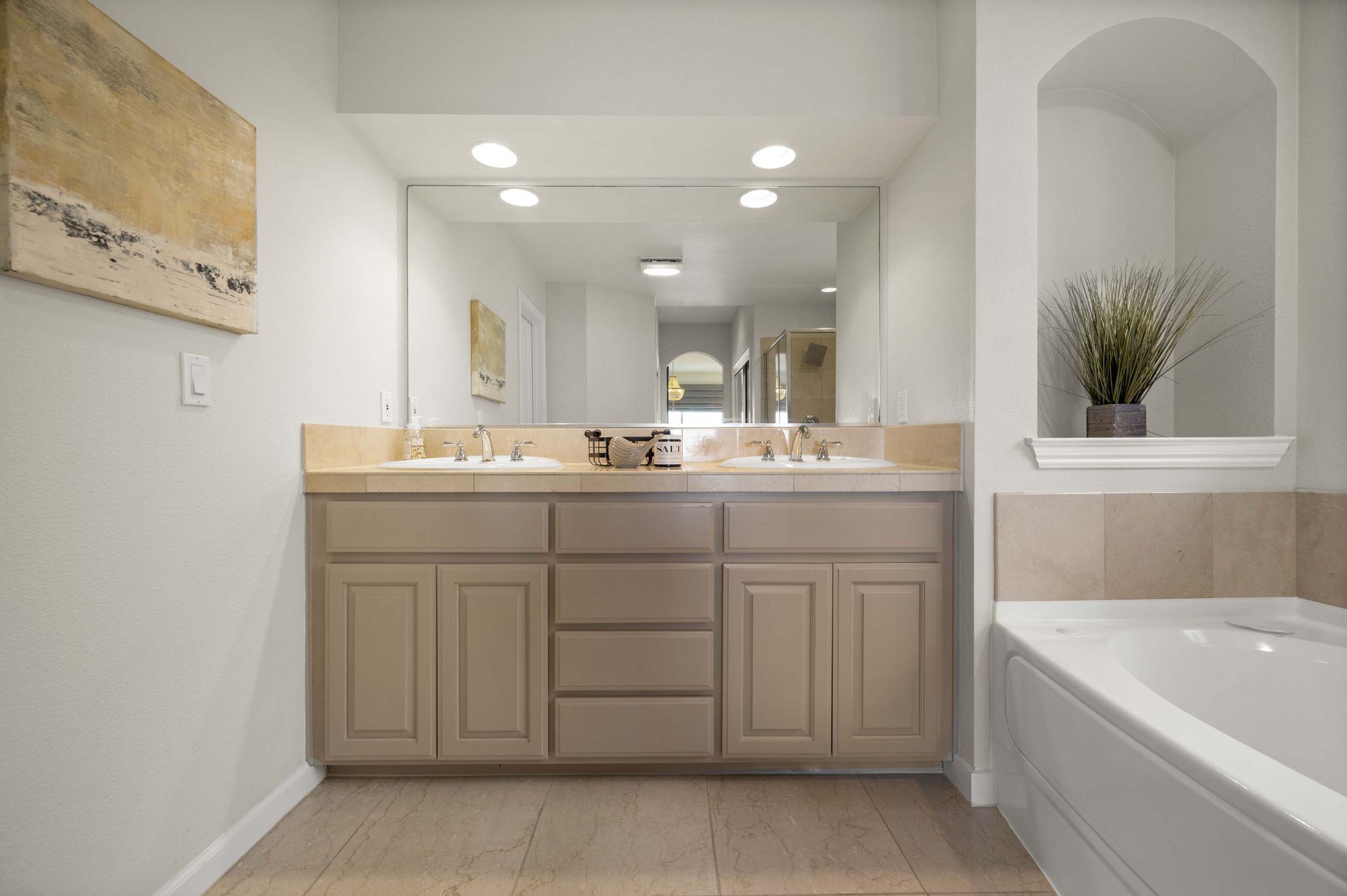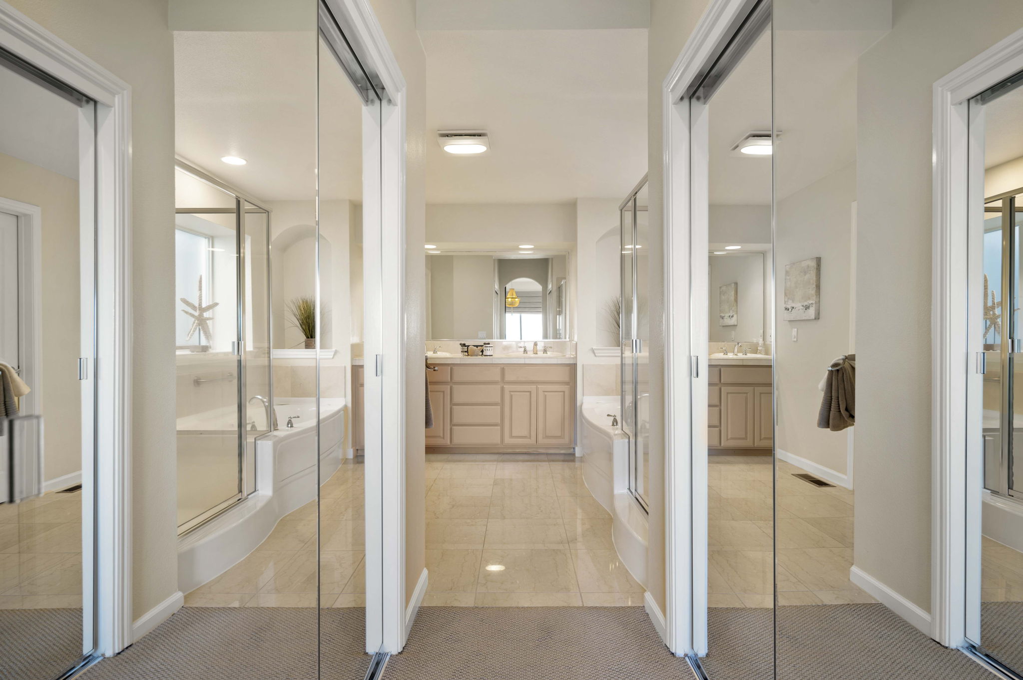 *Sophisticated primary suite with oversized tub, separate shower, and two walk-in closets