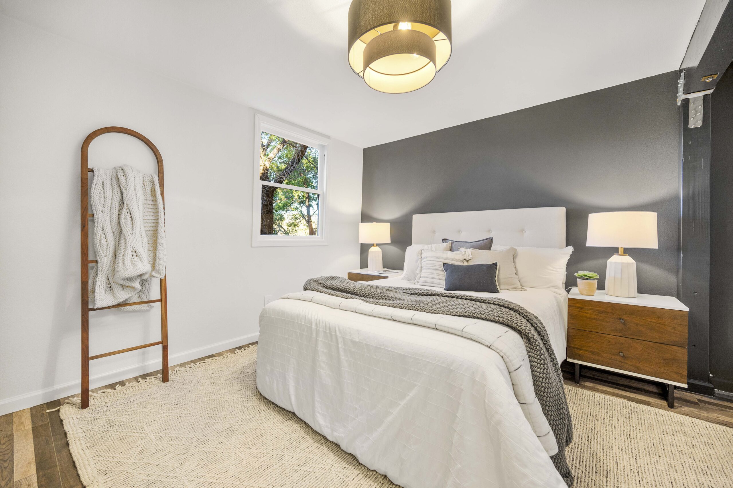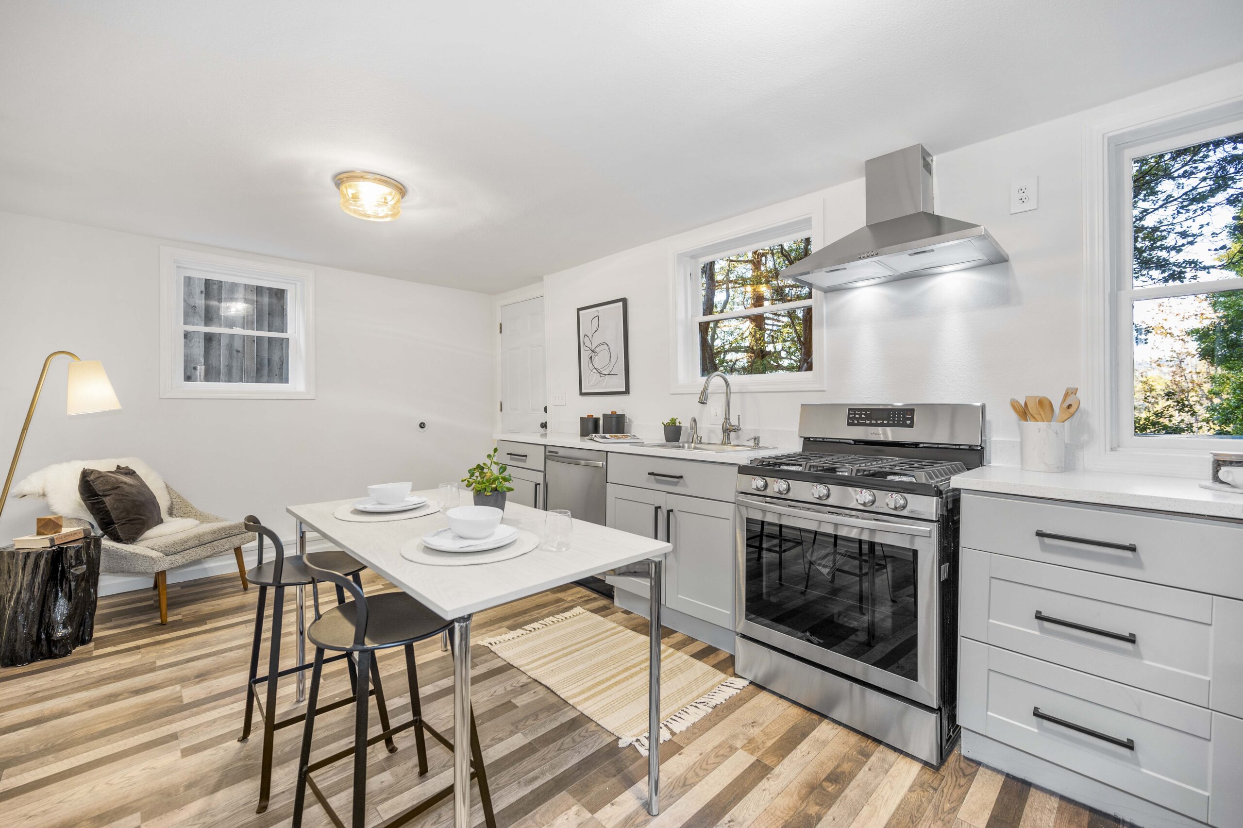 Three spacious bedrooms, including a primary suite and additional spa-inspired hall bath are located on the upper level. The lower level one bedroom apartment is perfect as an in-law suite or au-pair. With its own entrance, it includes a new kitchen with stone counters and stainless appliances, spacious bathroom and large bedroom with walk-in closet. The rear private gardens are perfect for evenings of relaxation. The tranquil deck and abundant green space make it ideal for frolicking and play.