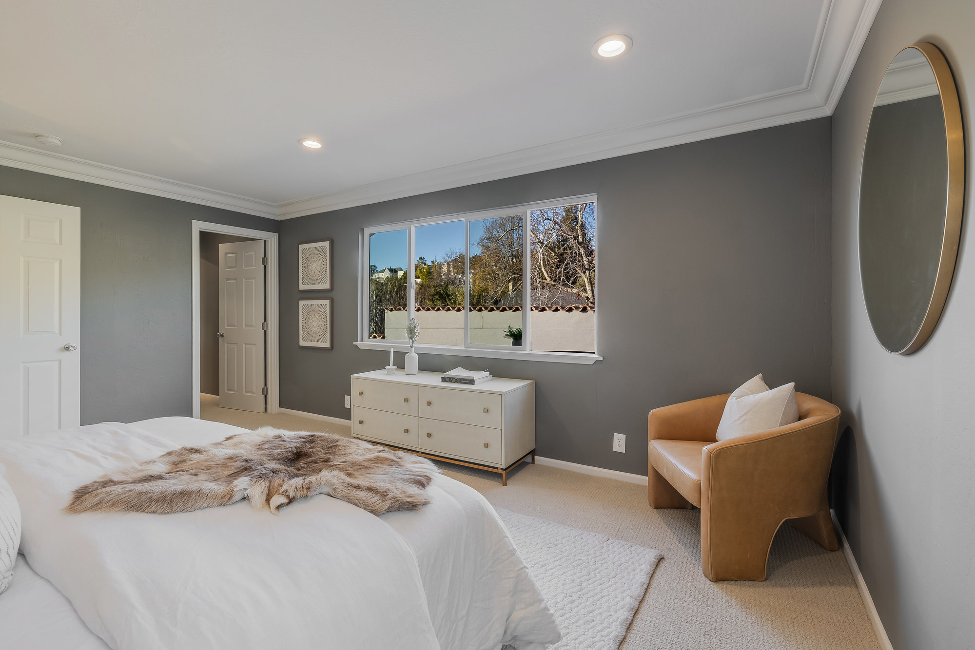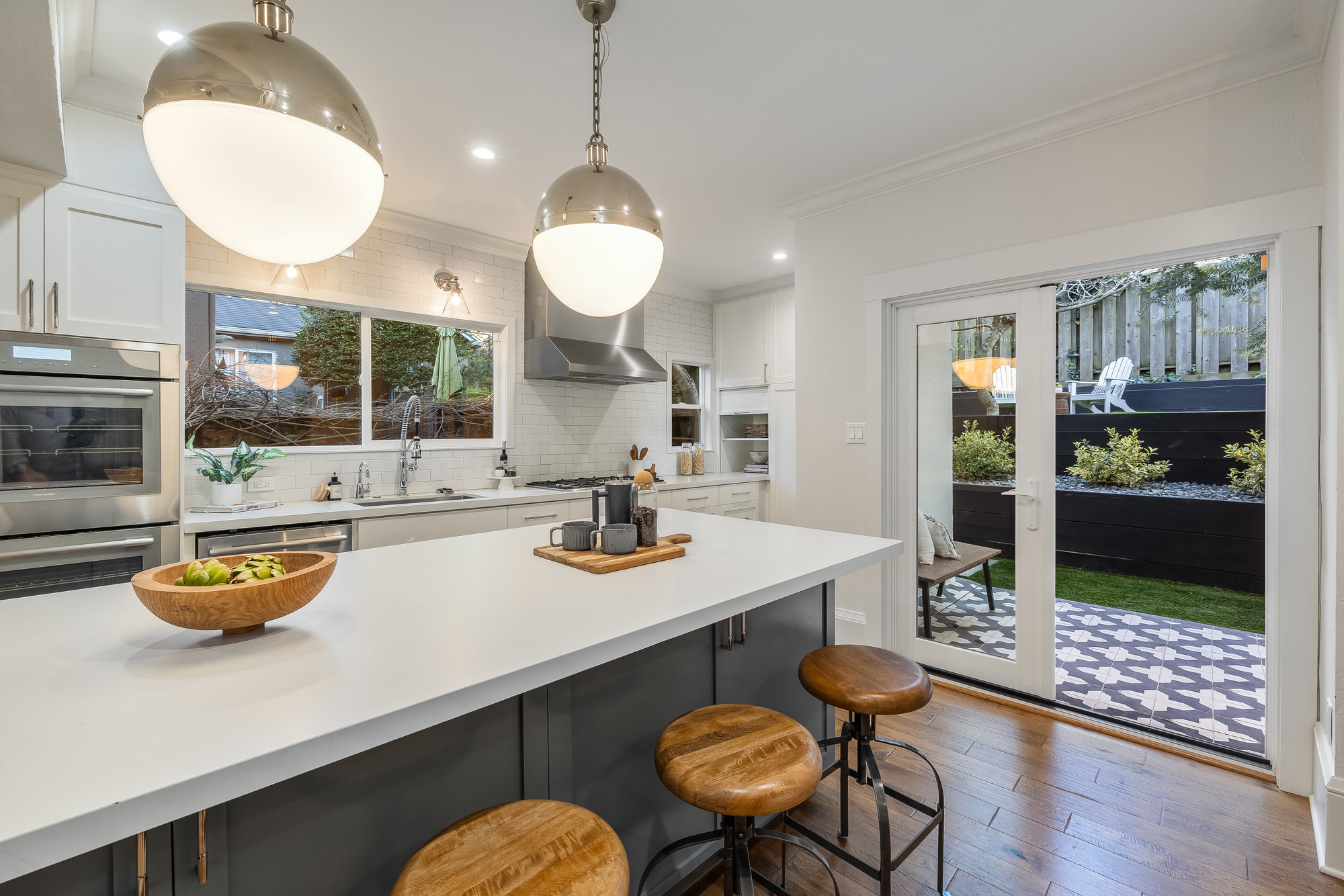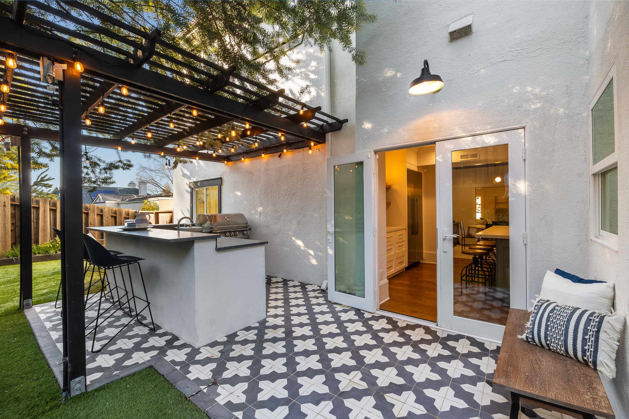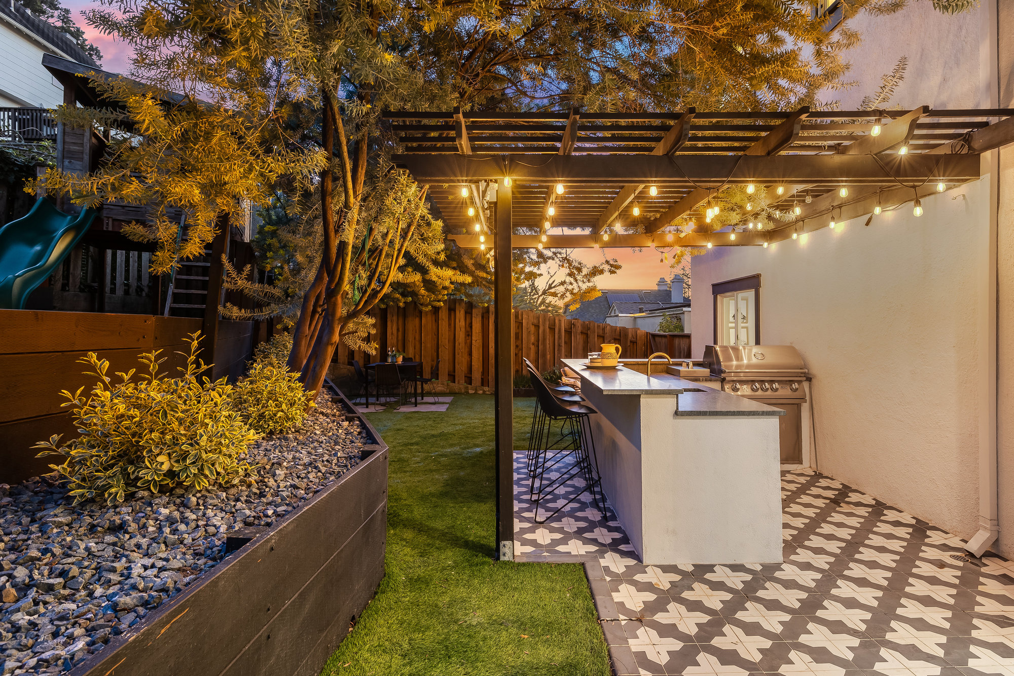 Striking Crocker Highlands Spanish-Mediterranean with modern finishes throughout. Open floor plan with stunning details including an elegant gas burning fireplace, dining room with built-in buffet and shelving, bespoke crown moldings accent ceilings and spectacular Chef’s kitchen. Featuring custom cabinetry, floating shelves, quartz counters, artisan tile backsplash and stainless Thermador appliances this space guarantees to spark creativity, joy and memories. From there, French doors open to tranquil, private gardens with turf for play that are perfectly balanced by a pergola-covered outdoor kitchen and bar with vibrant Alhambra tile floor. With a refrigerator, sink, gas burner and BBQ, this outdoor space is unrivaled for outdoor fun, all while the playhouse with slide keeps the younger ones entertained.