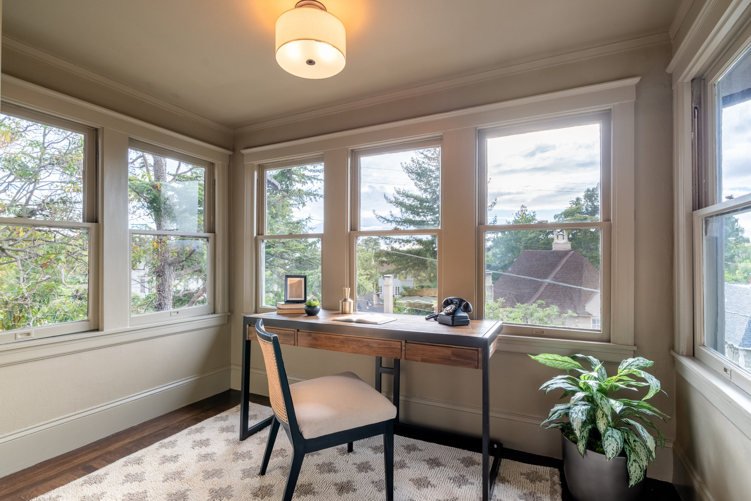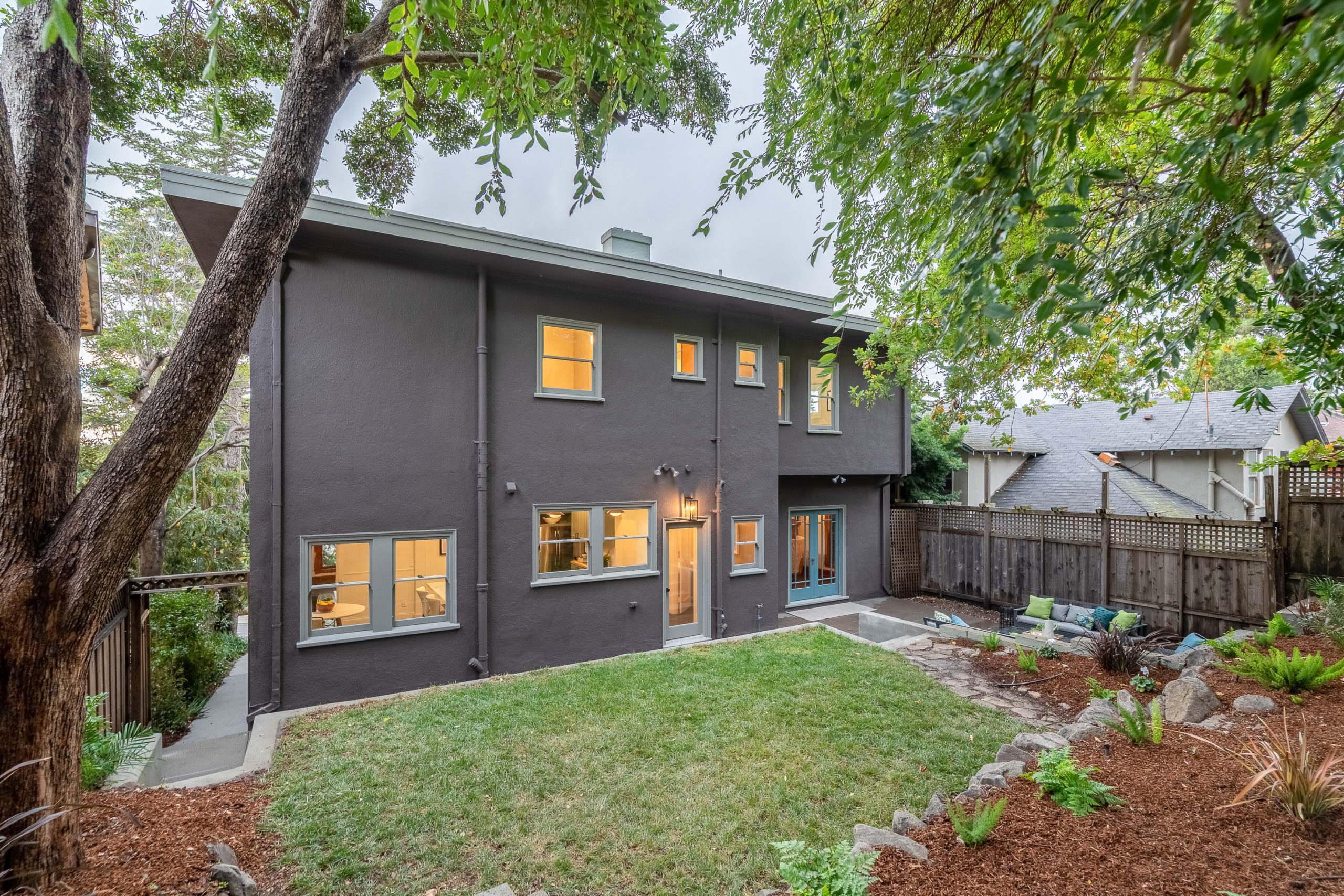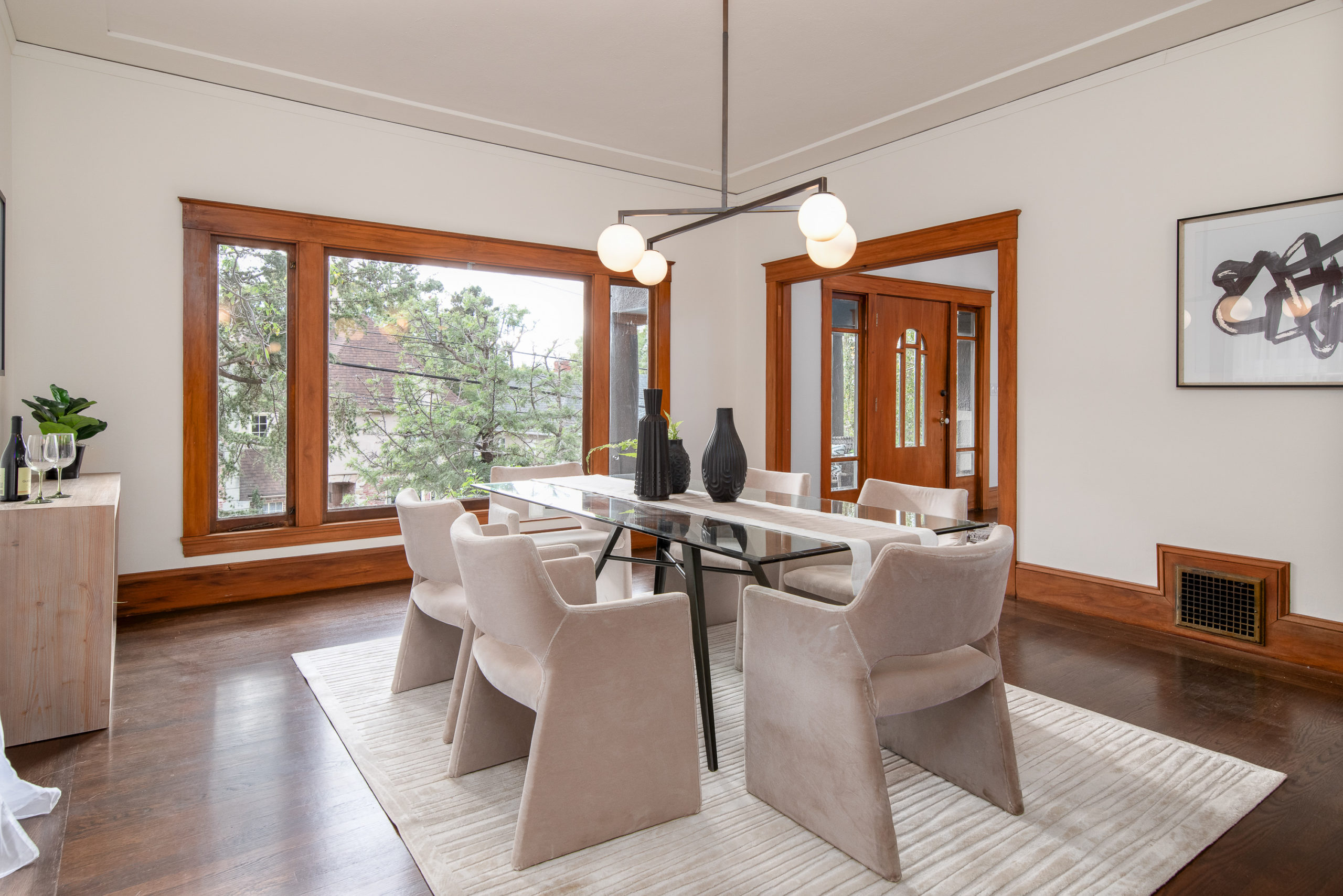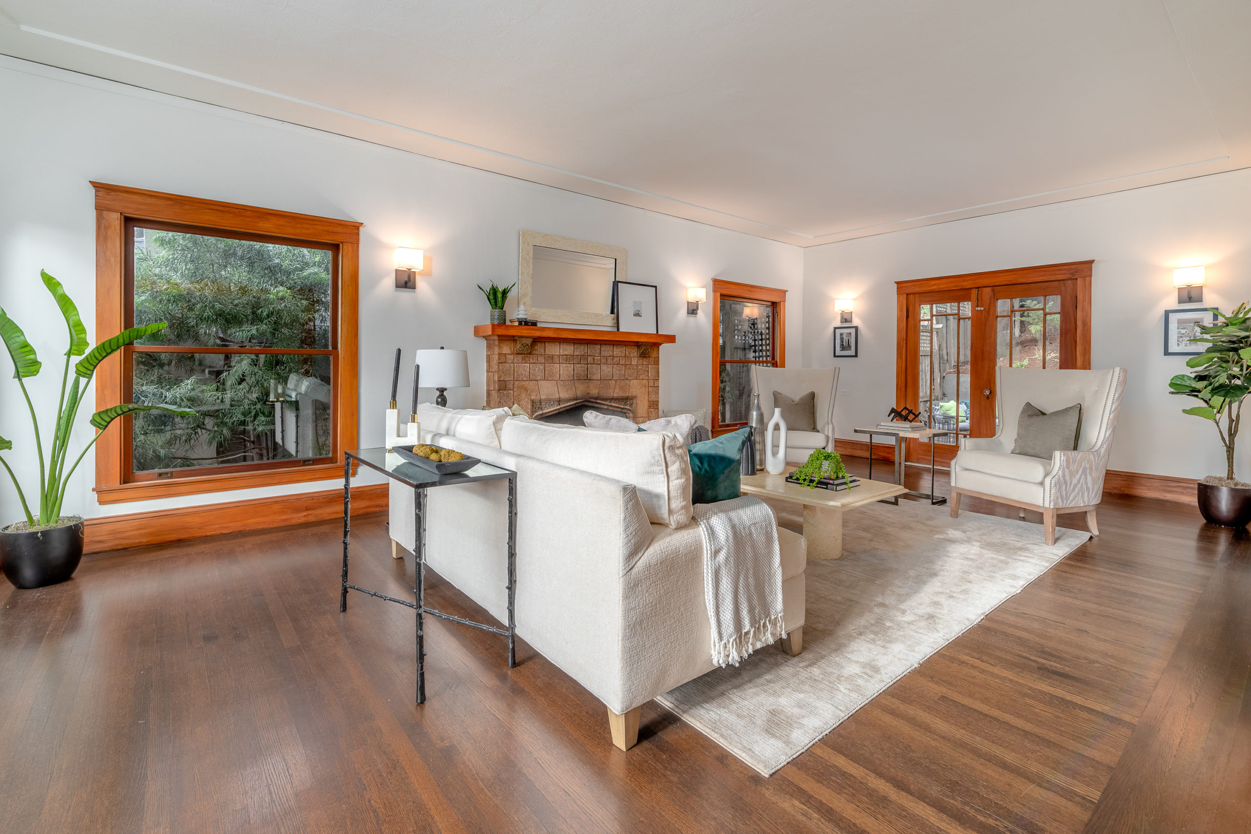 Rare Crocker Highlands Prairie Style Craftsman, just blocks from the award winning elementary offering both commanding neighborhood views and abundant privacy. Exterior stairs lead to a delightful covered front porch and into an impressive foyer that lends to the homes magnificent scale and quality. Pristine trim and moldings, high ceilings and artisan boxed ceilings are centered by a magnificent Craftsman staircase. The living room is planked with original Oak hardwoods and anchored by a handsome fireplace. French doors from the room open to the rear gardens, perfect for entertaining. The elegant formal dining room is large enough for the biggest of upcoming holiday gatherings and boasts a pristine original built-in buffet with cabinets and leaded glass. Doors from the dining room lead you to the chef’s eat-in kitchen. Freshly updated with stone counters and a door leading to the rear patio, this kitchen is sure to thrill the epicurean of the household. Heading back to the foyer, the Mission Style Arts and Crafts bannister leads you up the staircase, arriving at the spacious upper landing with sun room that acts as a lounge, home office or play area. With all bedrooms upstairs, the primary suite is overly spacious with updated bathroom and large walk-in closet. Two additional bedrooms and cheerful full bathroom with custom tile work are also found on this level. Off the kitchen, you’ll find access to the lower level staircase leading to the laundry room, additional flex area perfect as an office, den or home gym and a door directly to the attached two-car garage. Whether entertaining, relaxing, or enjoying play, the rear gardens offer perfect privacy. The gently rolling lawn and patios are framed by lovely trees and add great privacy. Positioned just blocks from award winning Crocker Highlands Elementary and just minutes to the shops and restaurants of Grand Lake, Lake Merritt and the Bay Bridge to S.F.