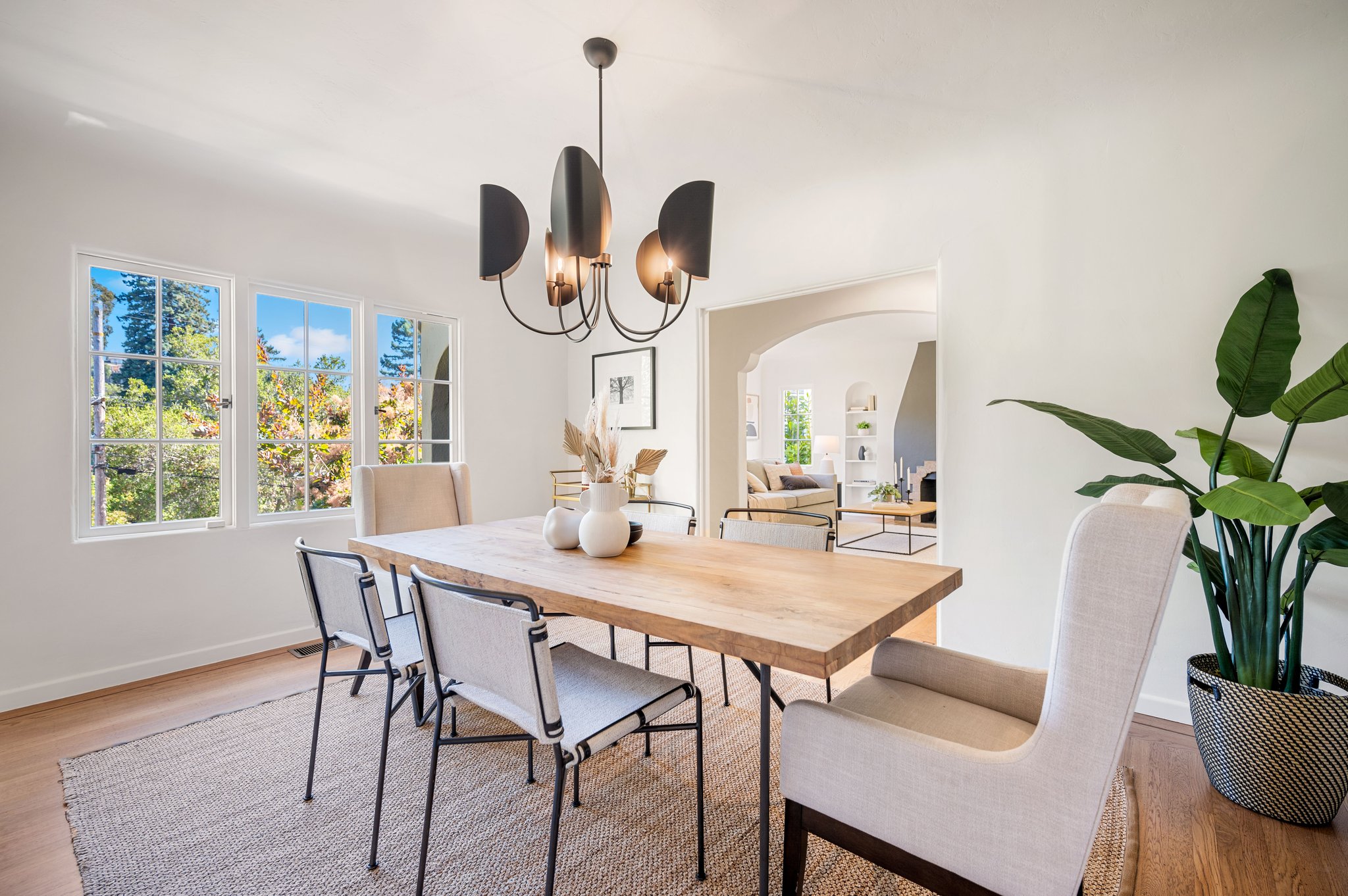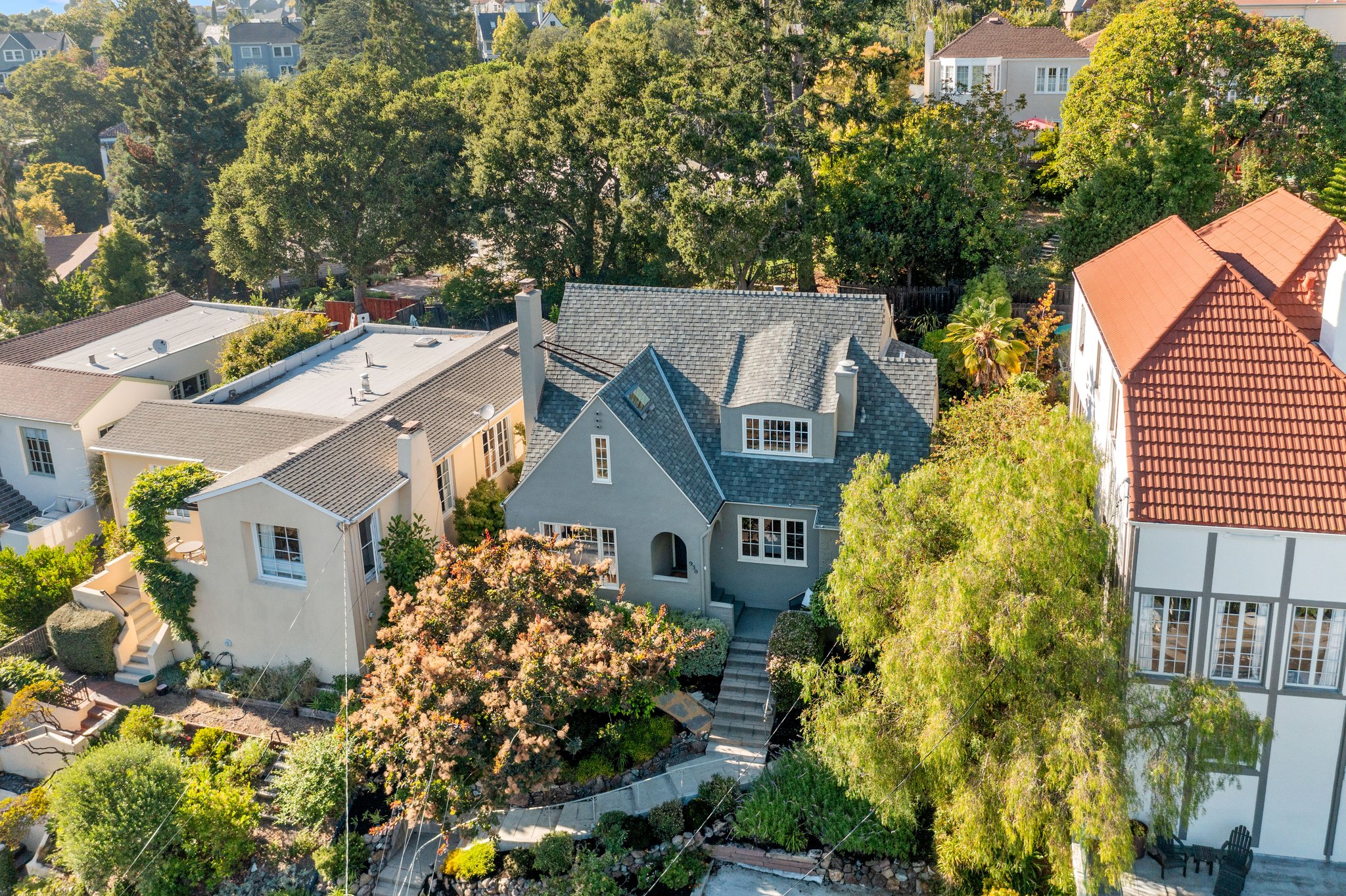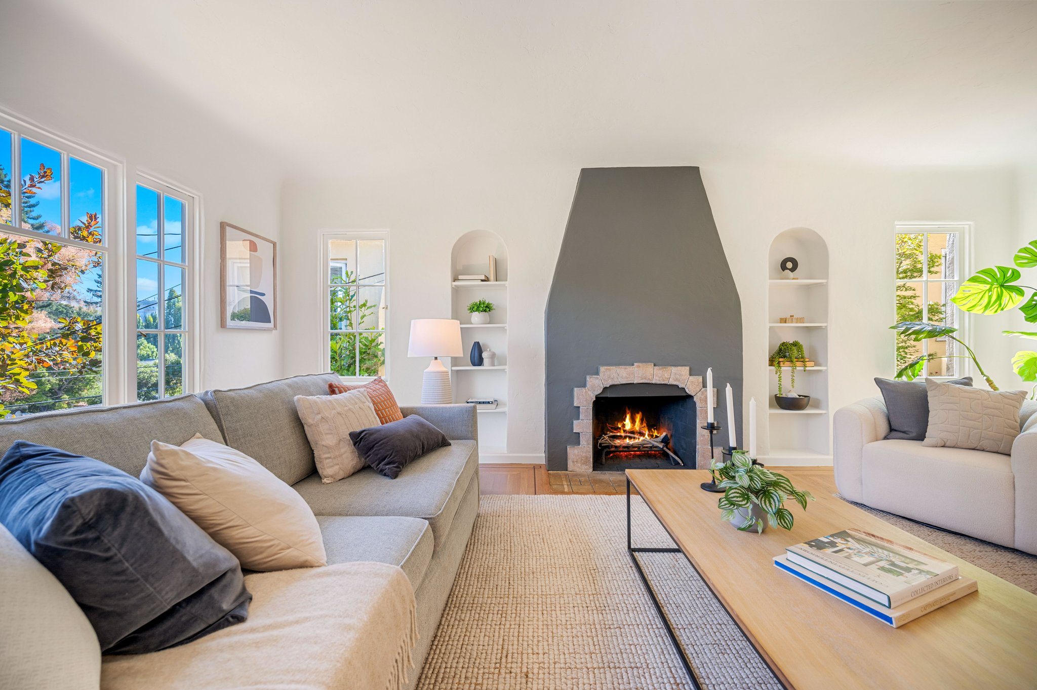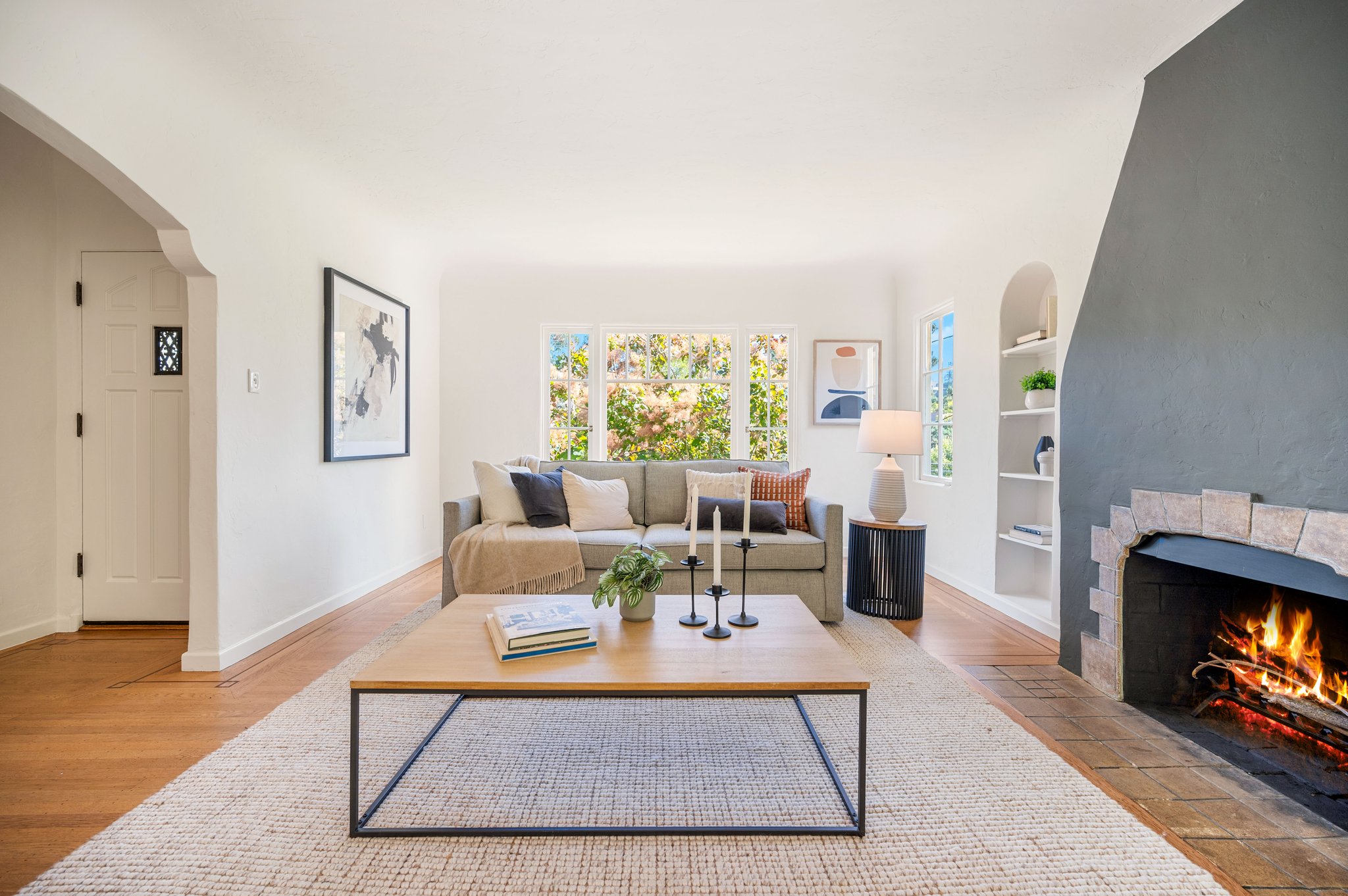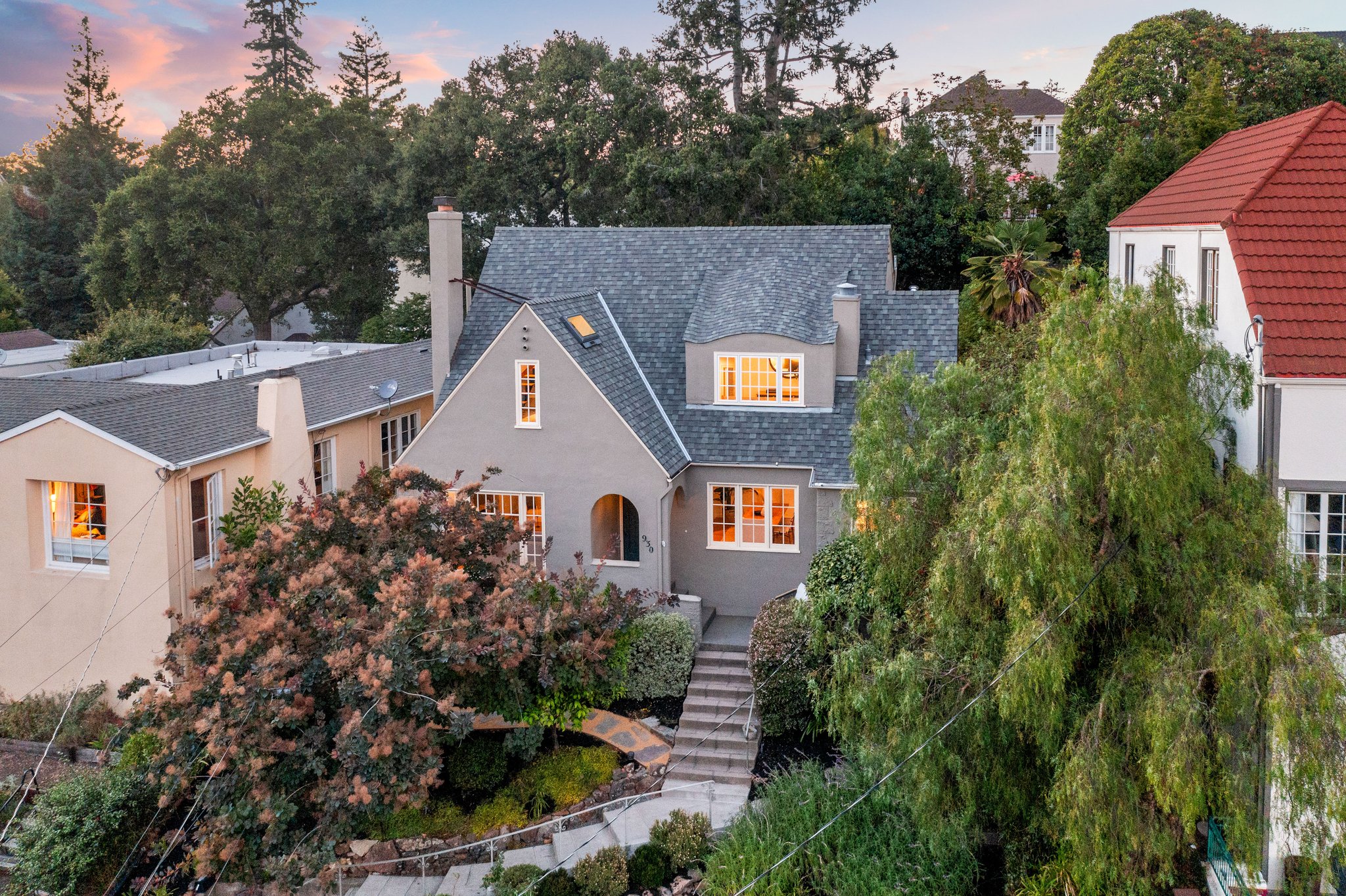 Crocker Highlands Storybook Tudor with captivating neighborhood views. Upon approach meander through mature gardens, a magnificent Smoke Tree and stone walled paths leading to the front entry. Once inside elegant plaster walls with coved edges, glistening hardwood floors and a stunning designer fireplace set the tone. Enjoy peaceful, light filled views gracing the formal living and dining rooms and the elegant chef’s kitchen with stone counters, stainless appliances, custom cabinetry and cozy breakfast nook.