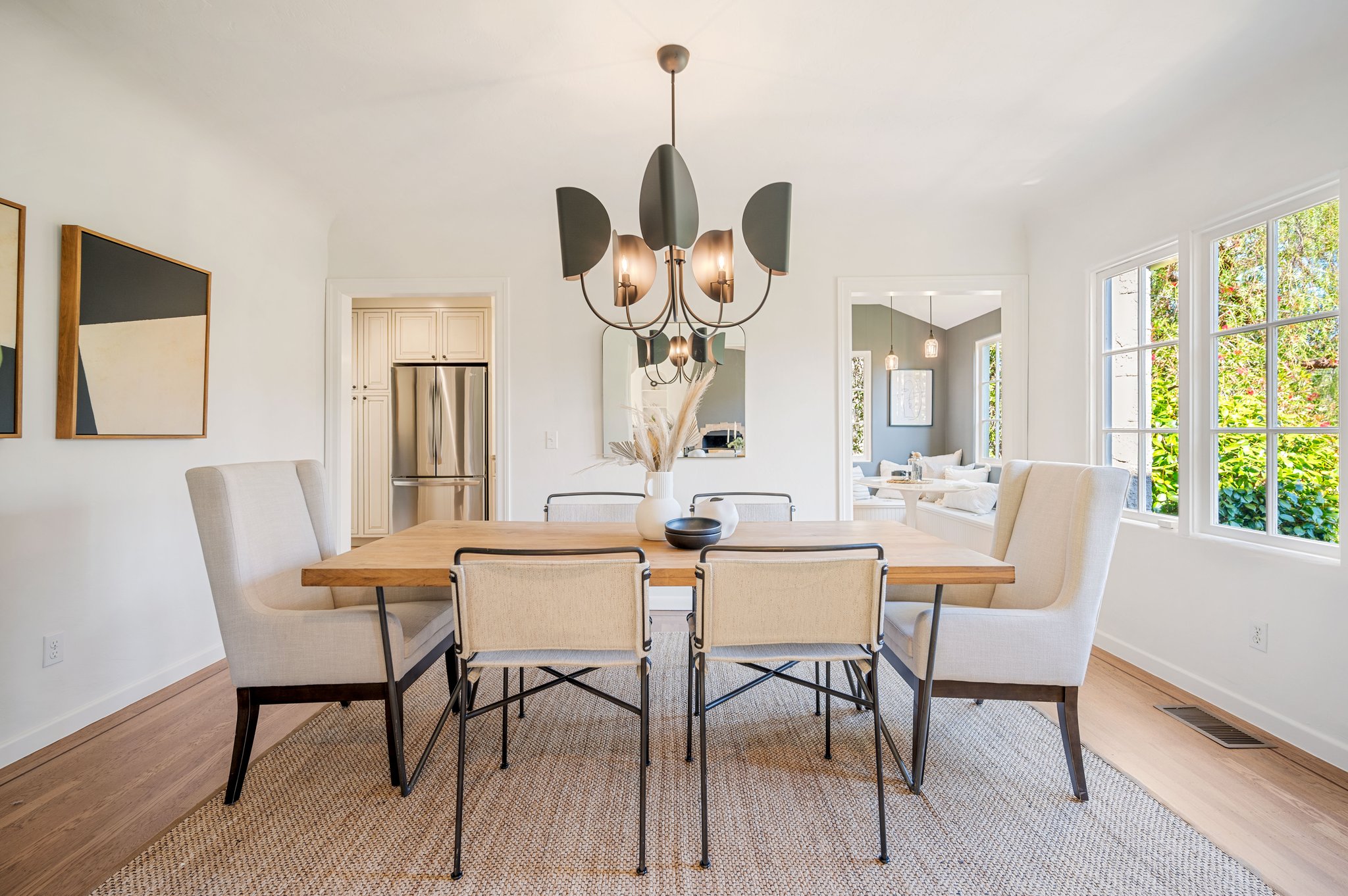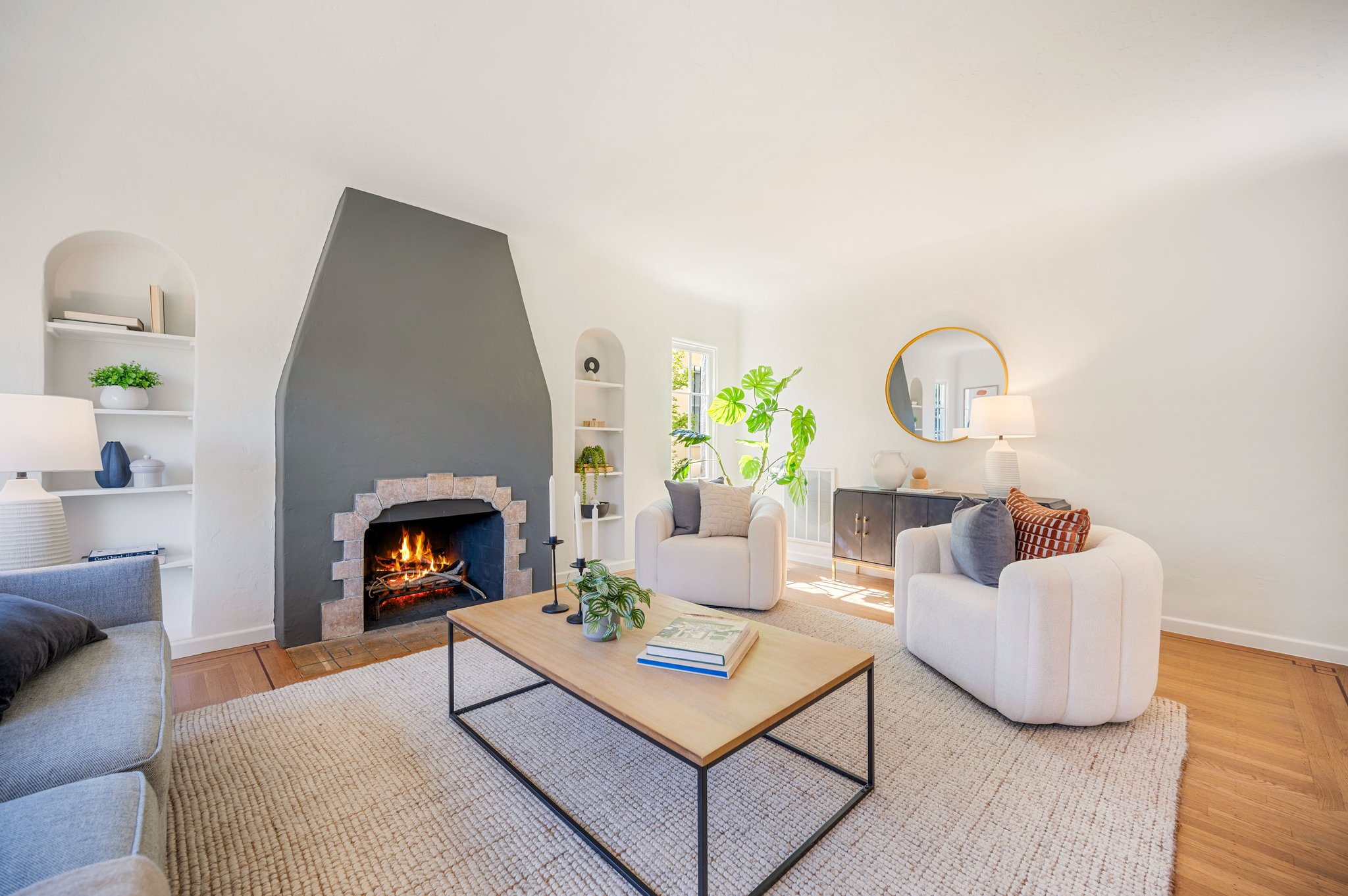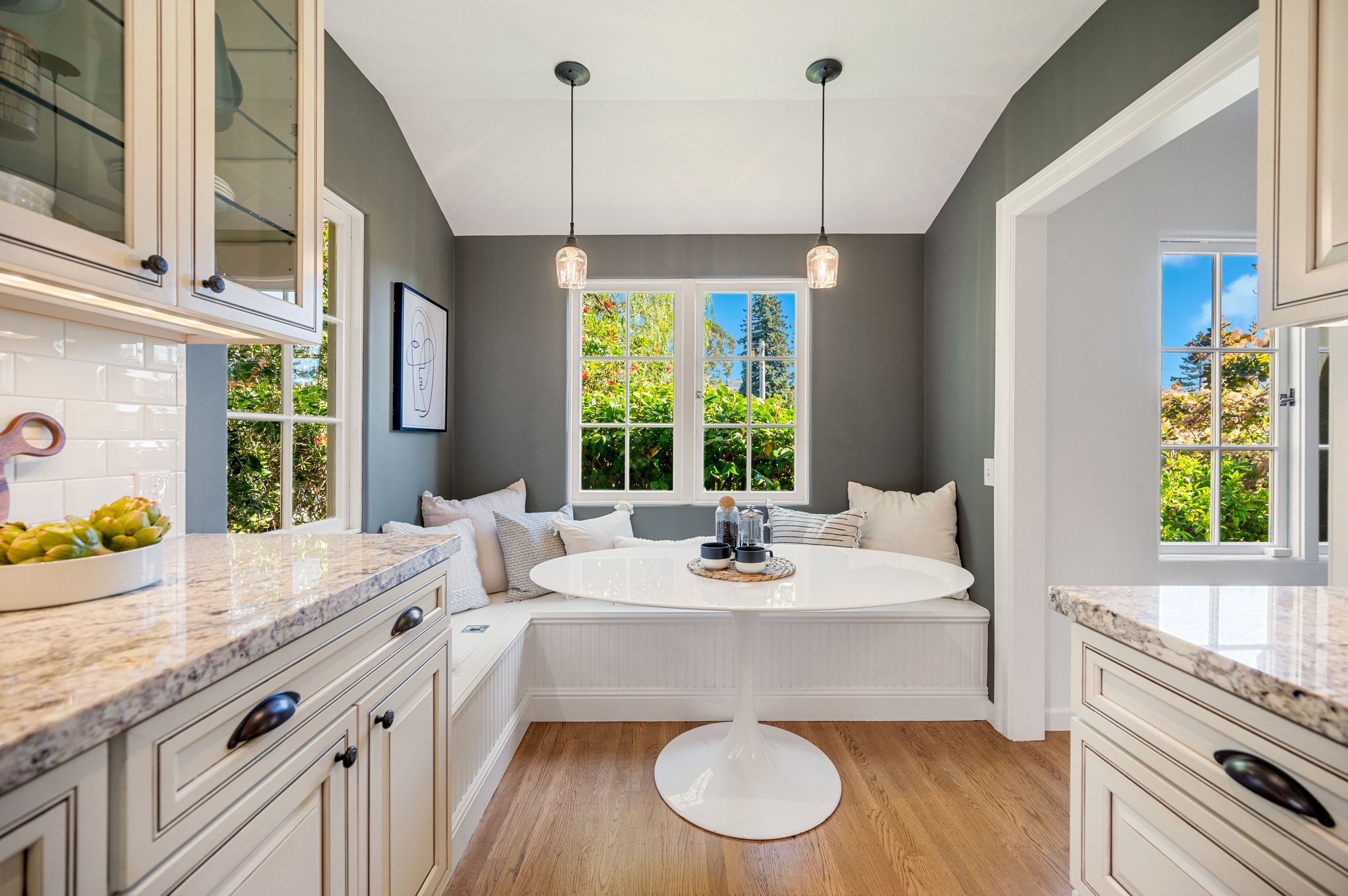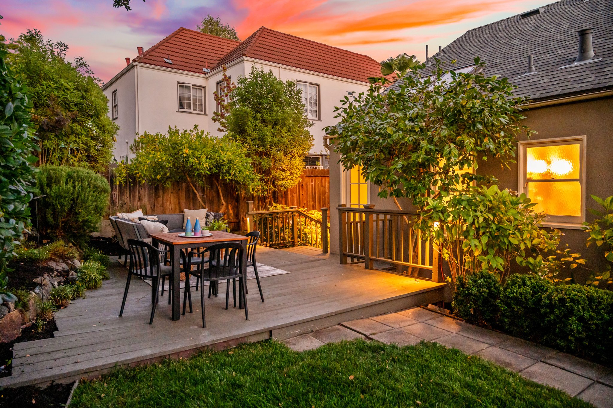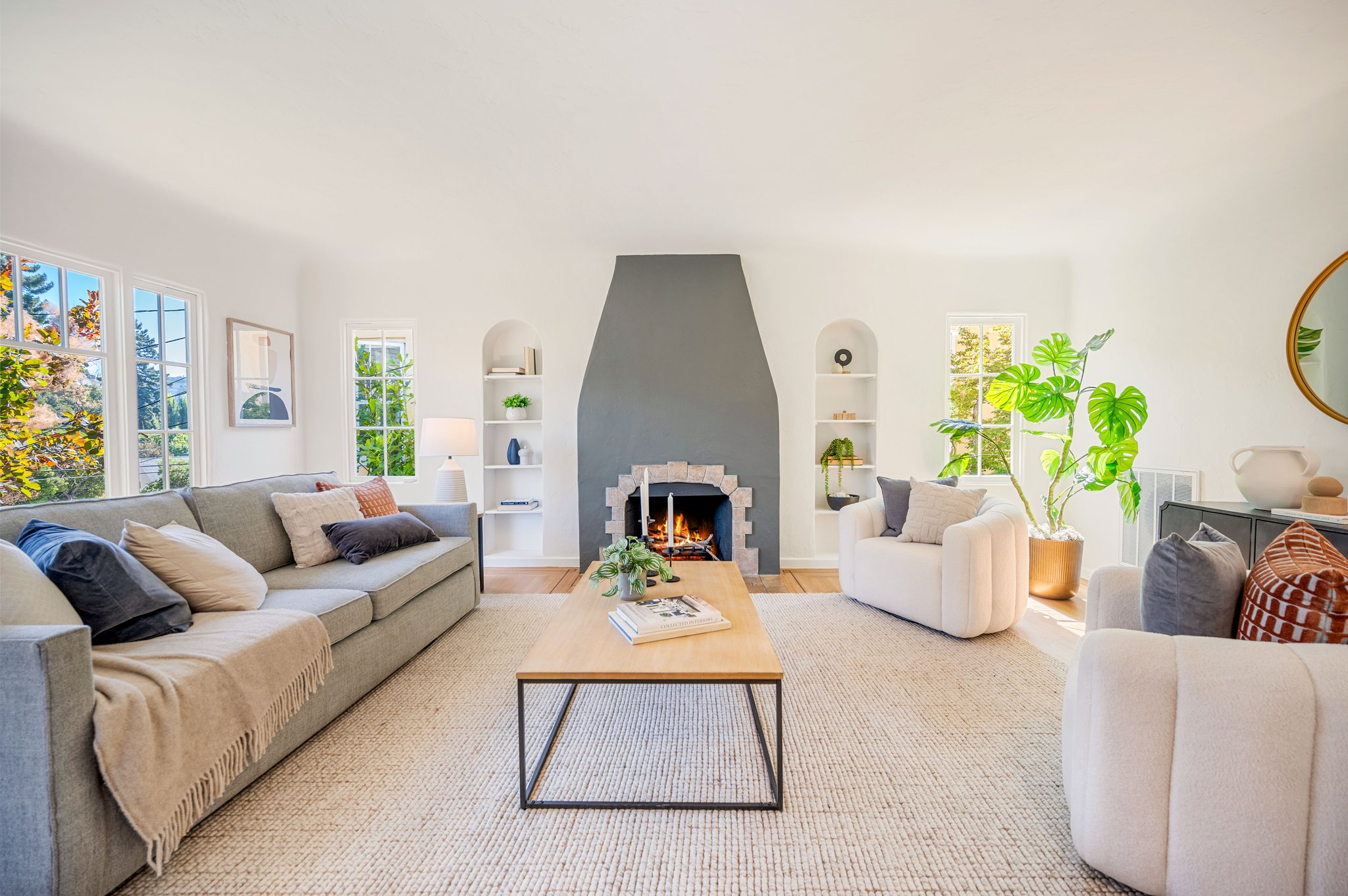 Crocker Highlands Storybook Tudor with captivating neighborhood views. Upon approach meander through mature gardens, a magnificent Smoke Tree and stone walled paths leading to the front entry. Once inside elegant plaster walls with coved edges, glistening hardwood floors and a stunning designer fireplace set the tone. Enjoy peaceful, light filled views gracing the formal living and dining rooms and the elegant chef’s kitchen with stone counters, stainless appliances, custom cabinetry and cozy breakfast nook.