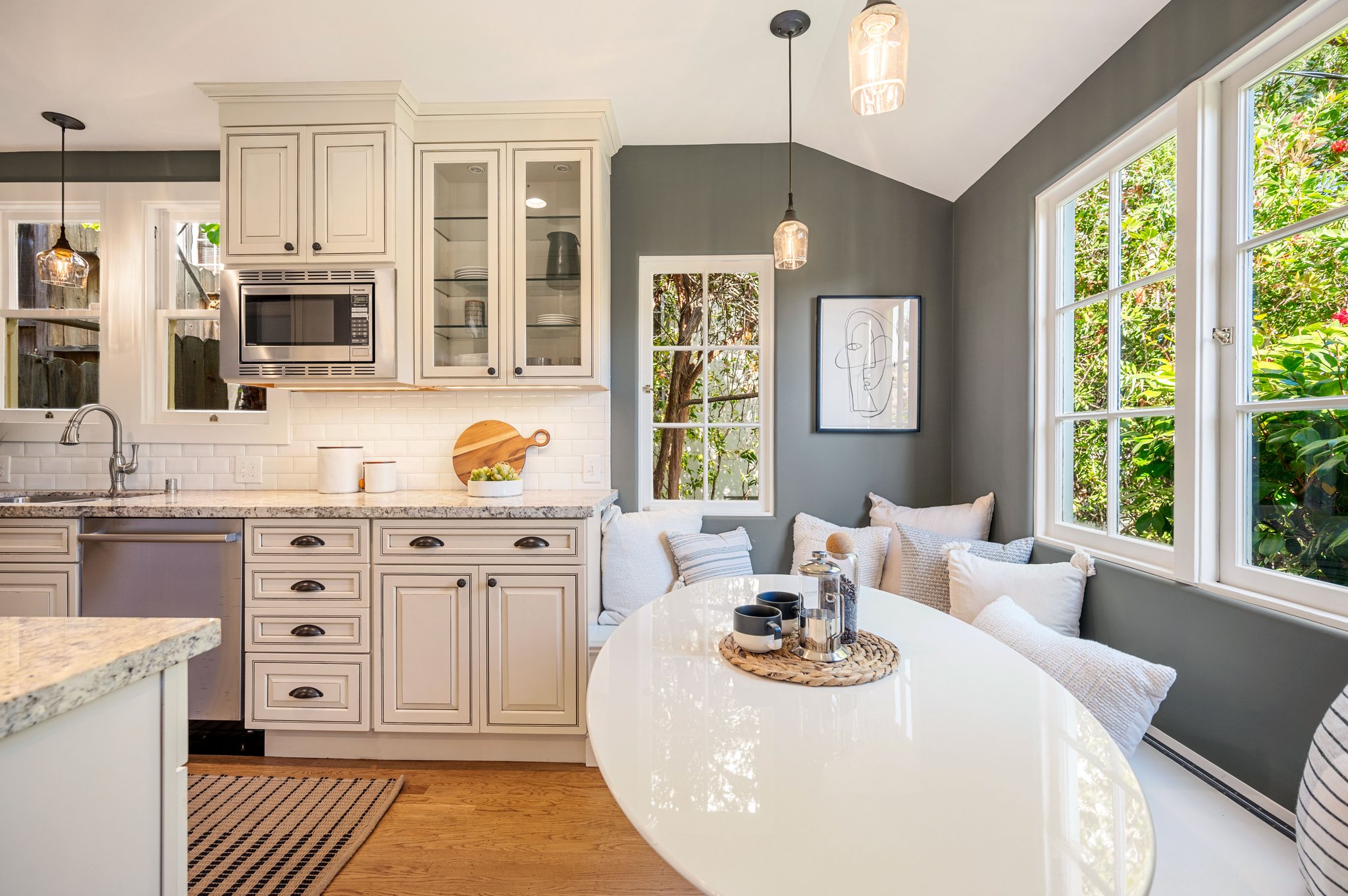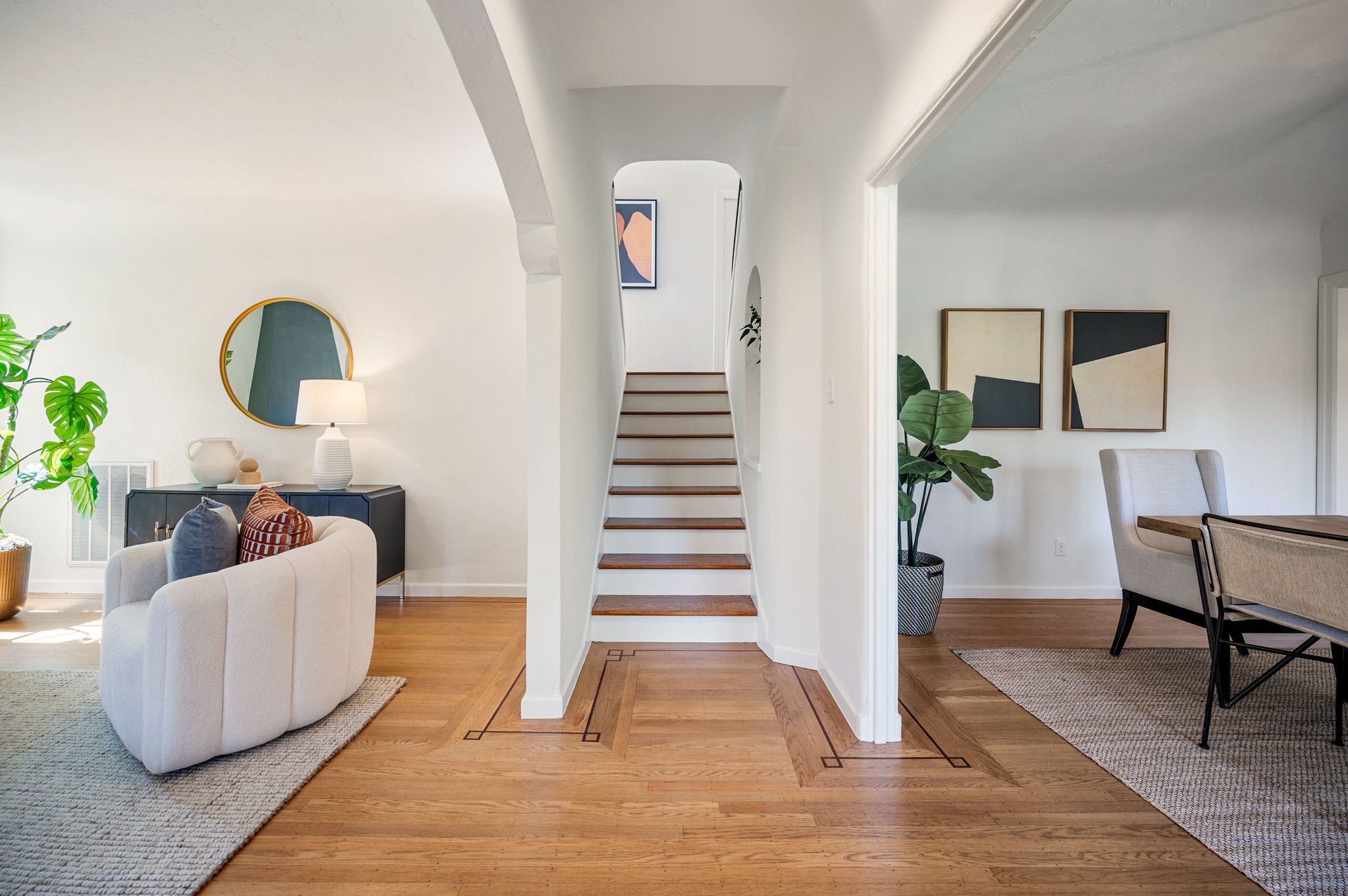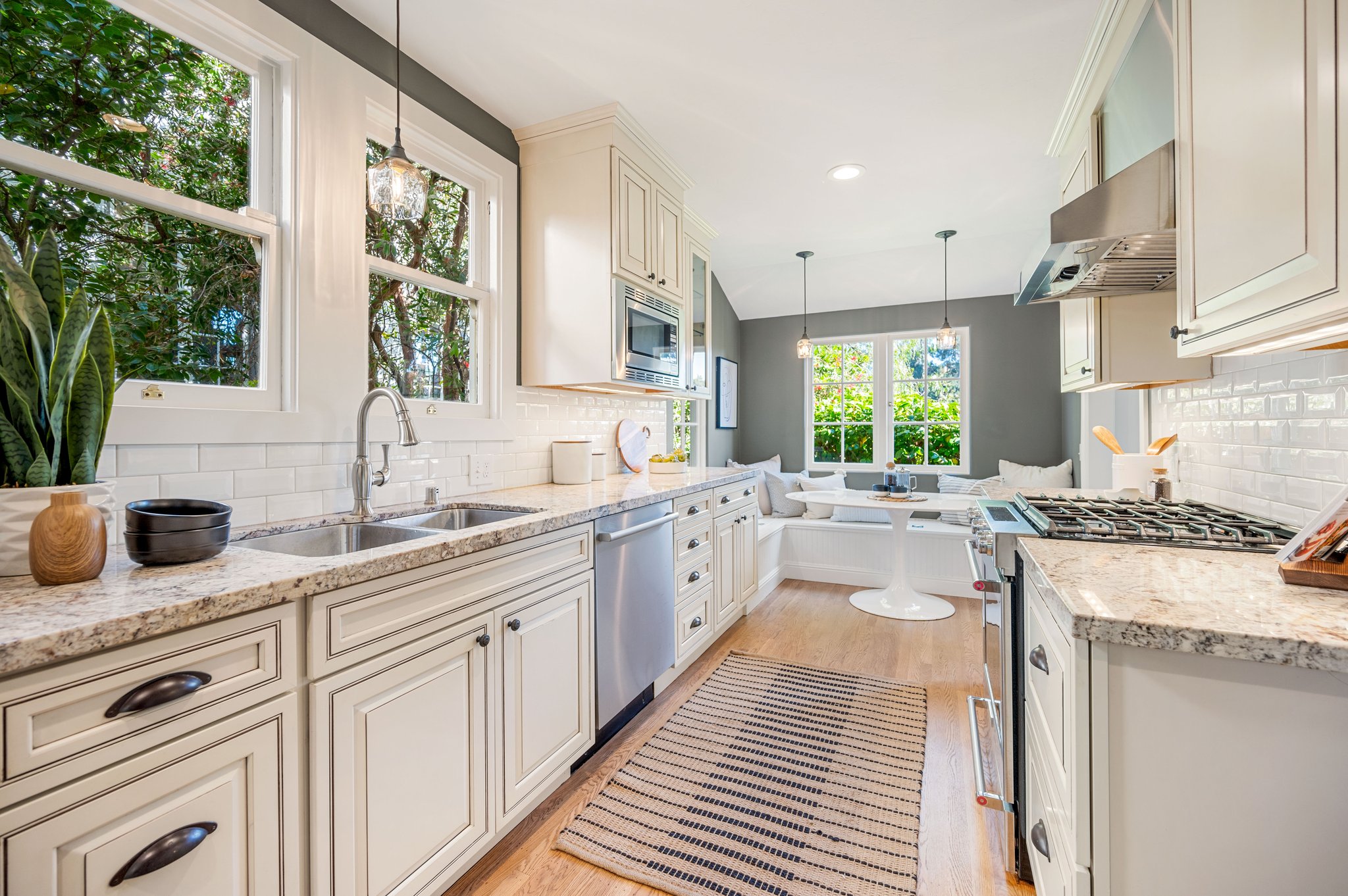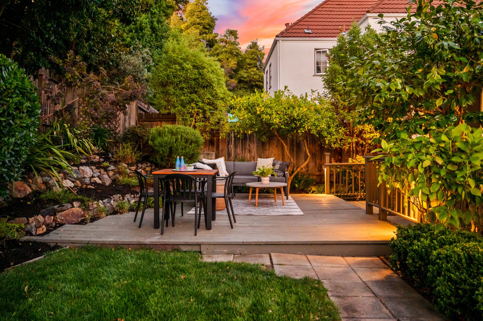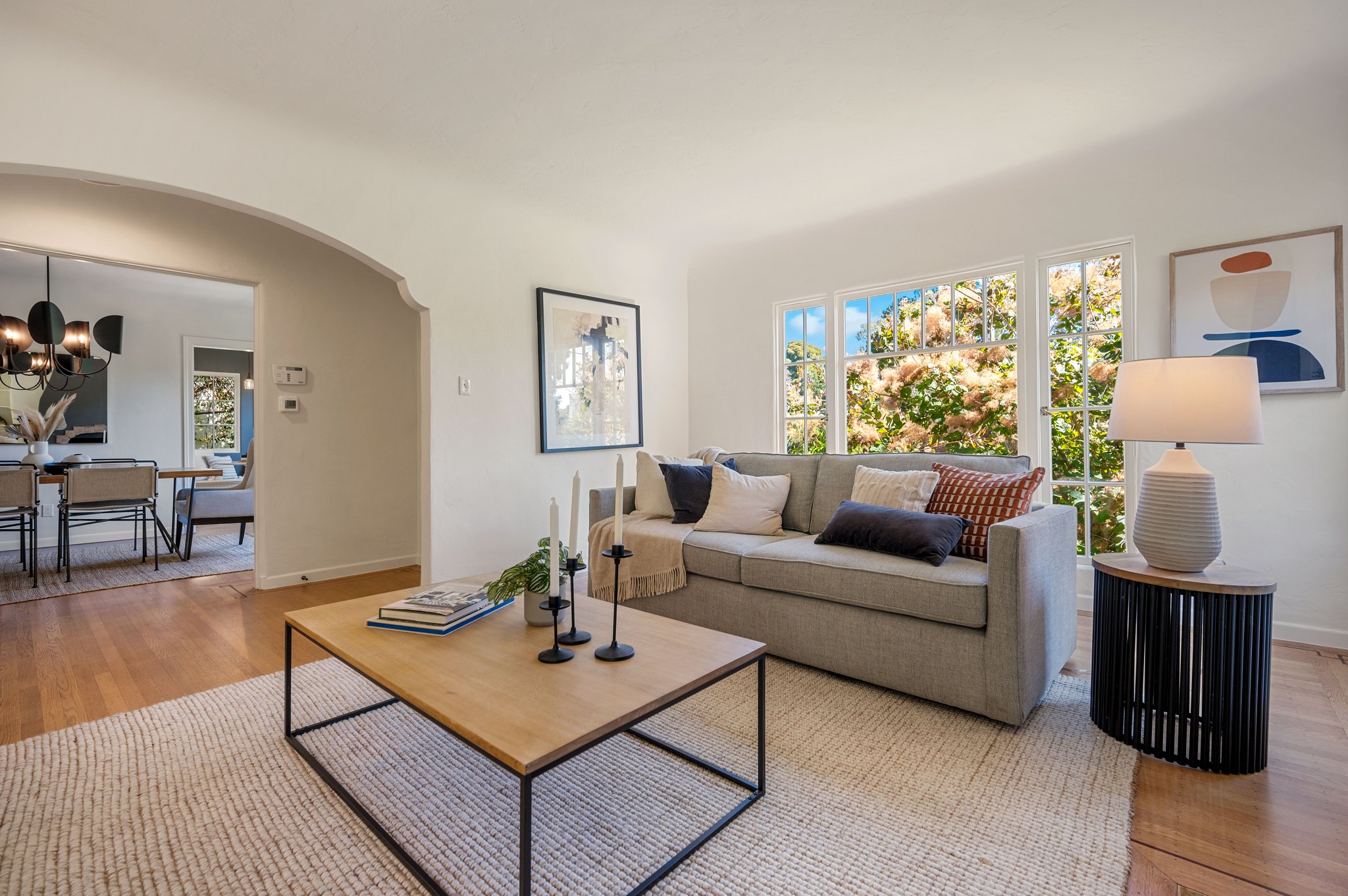 Crocker Highlands Storybook Tudor with captivating neighborhood views. Upon approach meander through mature gardens, a magnificent Smoke Tree and stone walled paths leading to the front entry. Once inside elegant plaster walls with coved edges, glistening hardwood floors and a stunning designer fireplace set the tone. Enjoy peaceful, light filled views gracing the formal living and dining rooms and the elegant chef’s kitchen with stone counters, stainless appliances, custom cabinetry and cozy breakfast nook.