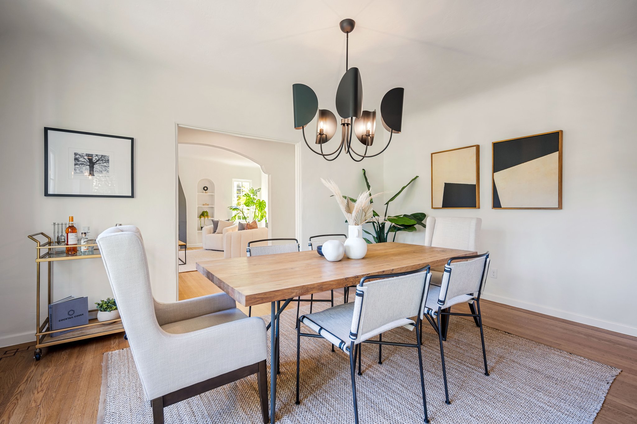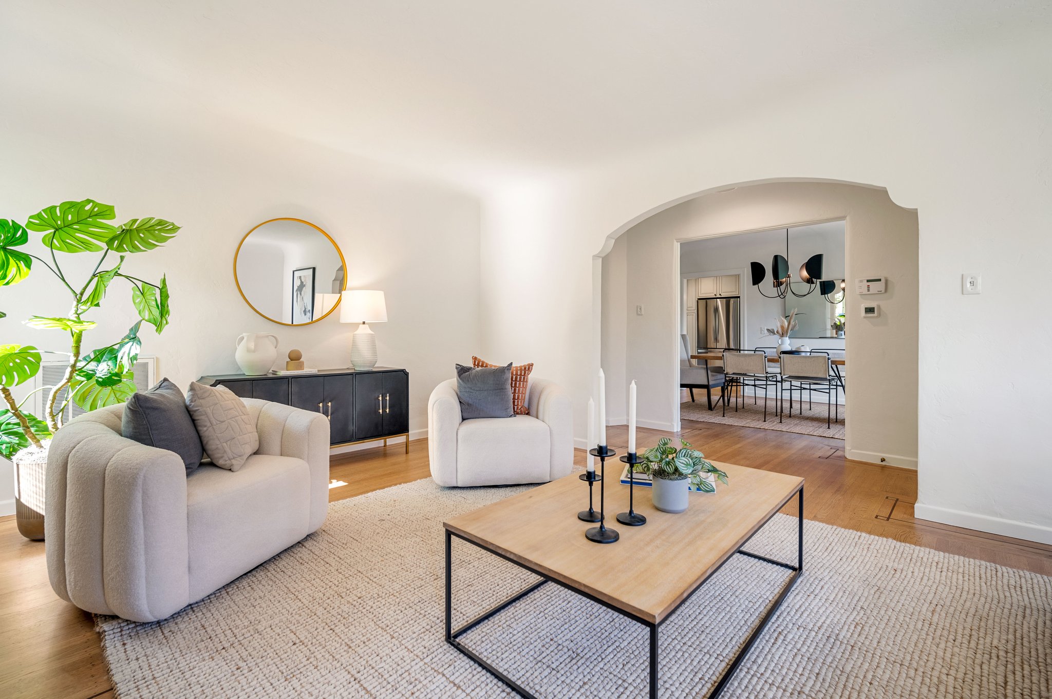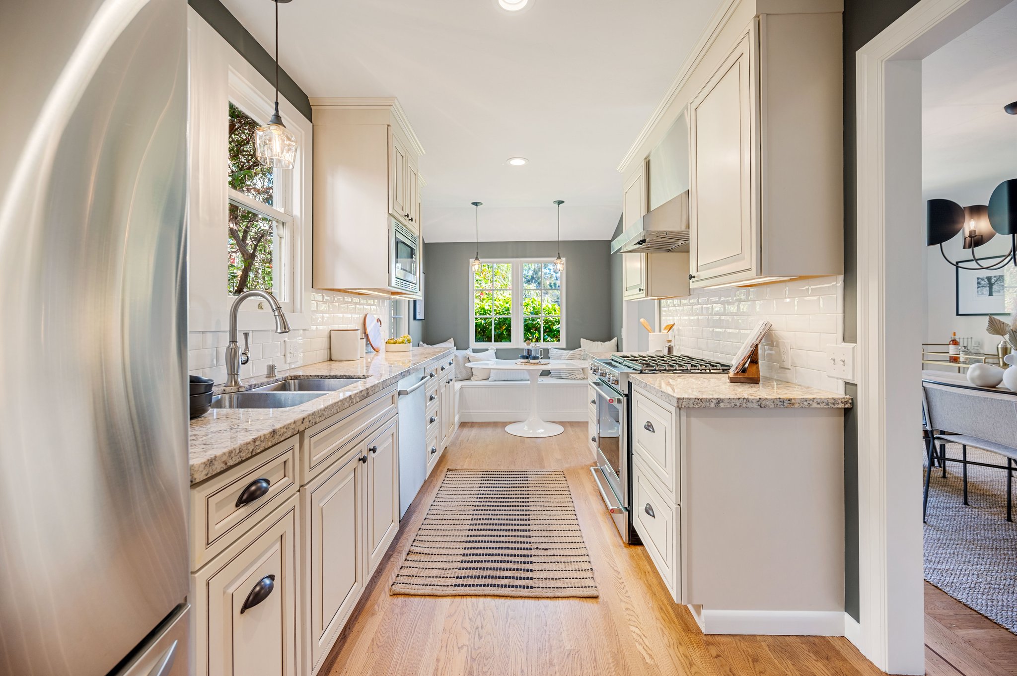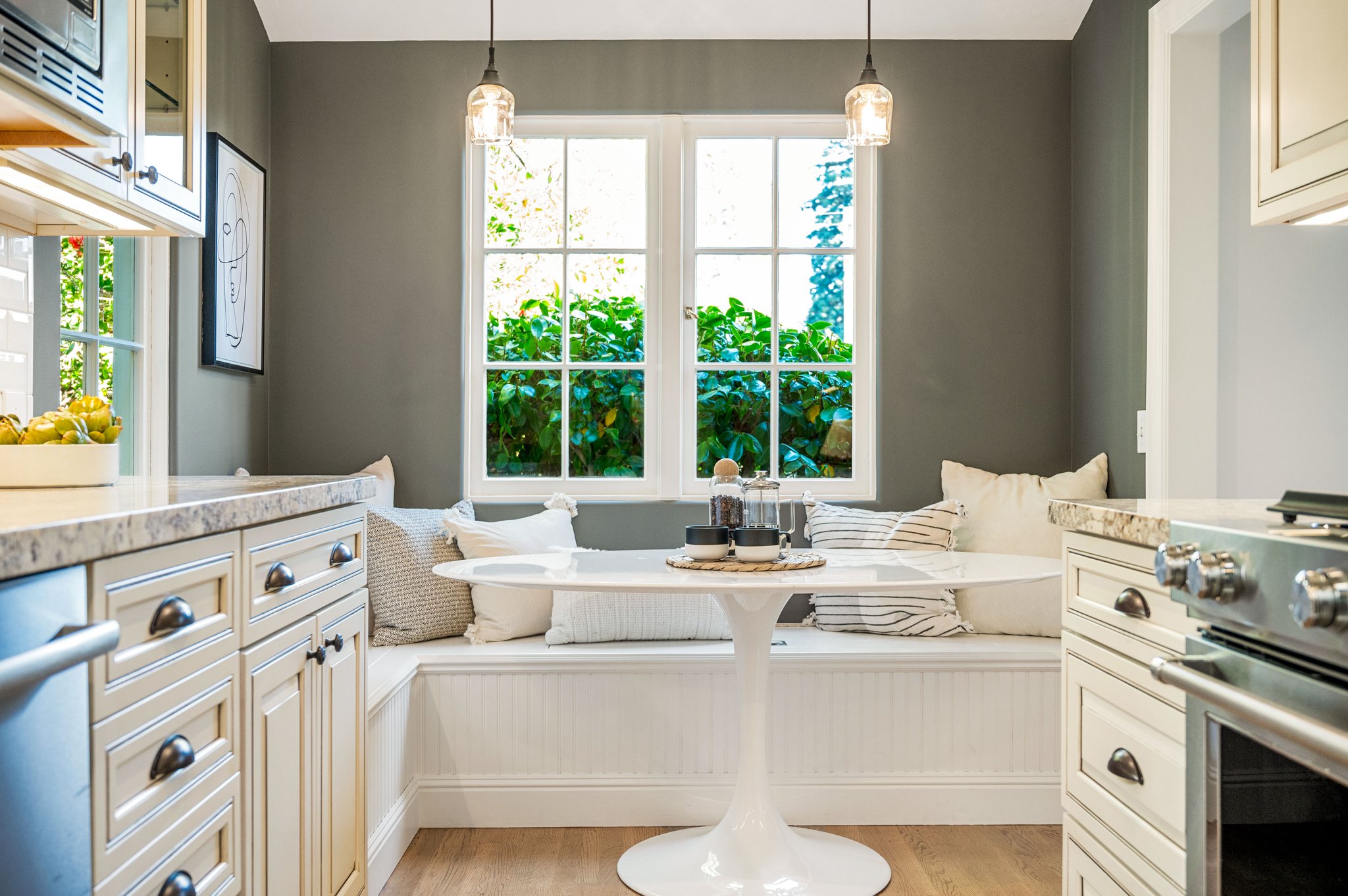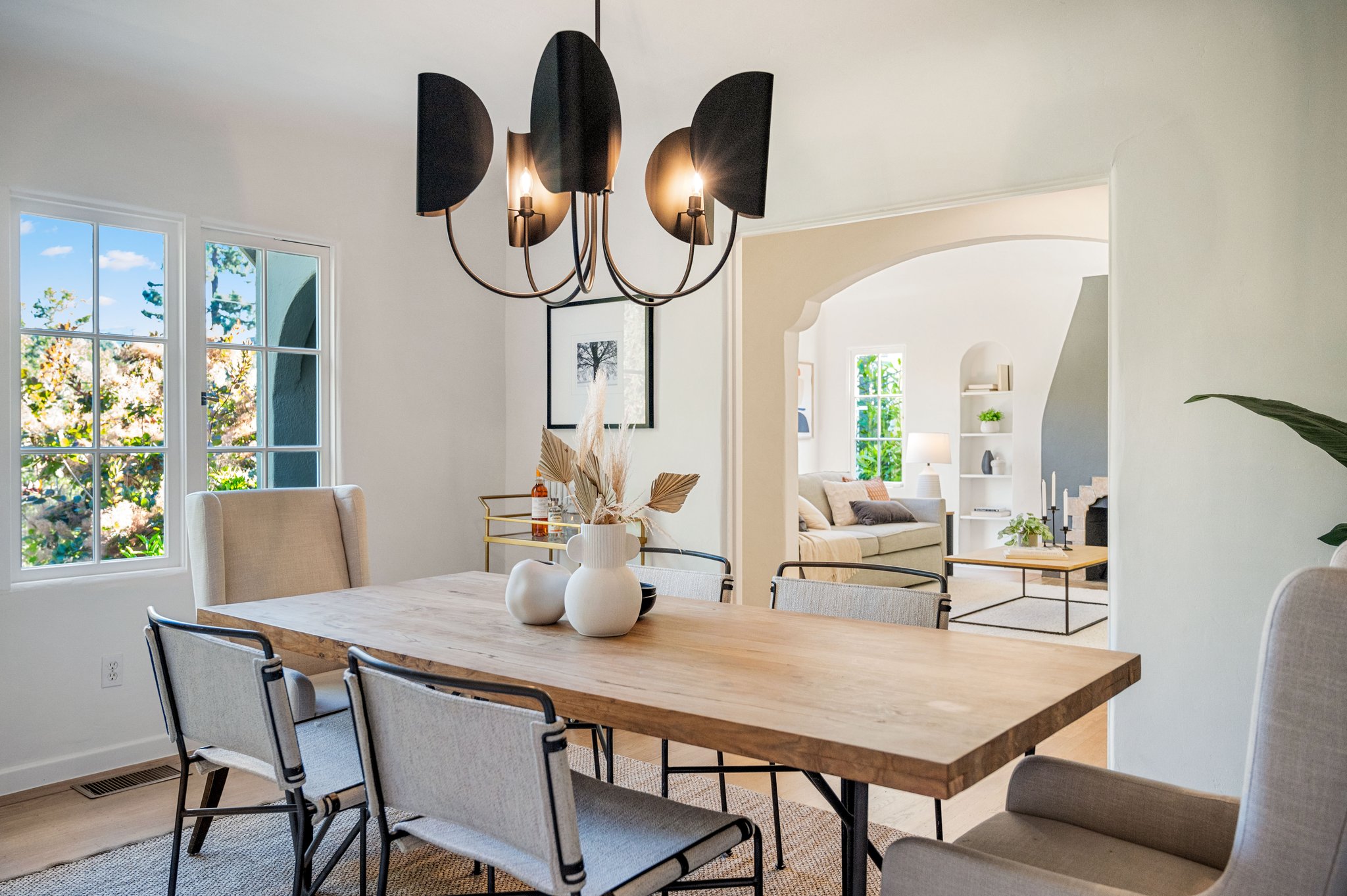 Crocker Highlands Storybook Tudor with captivating neighborhood views. Upon approach meander through mature gardens, a magnificent Smoke Tree and stone walled paths leading to the front entry. Once inside elegant plaster walls with coved edges, glistening hardwood floors and a stunning designer fireplace set the tone. Enjoy peaceful, light filled views gracing the formal living and dining rooms and the elegant chef’s kitchen with stone counters, stainless appliances, custom cabinetry and cozy breakfast nook.