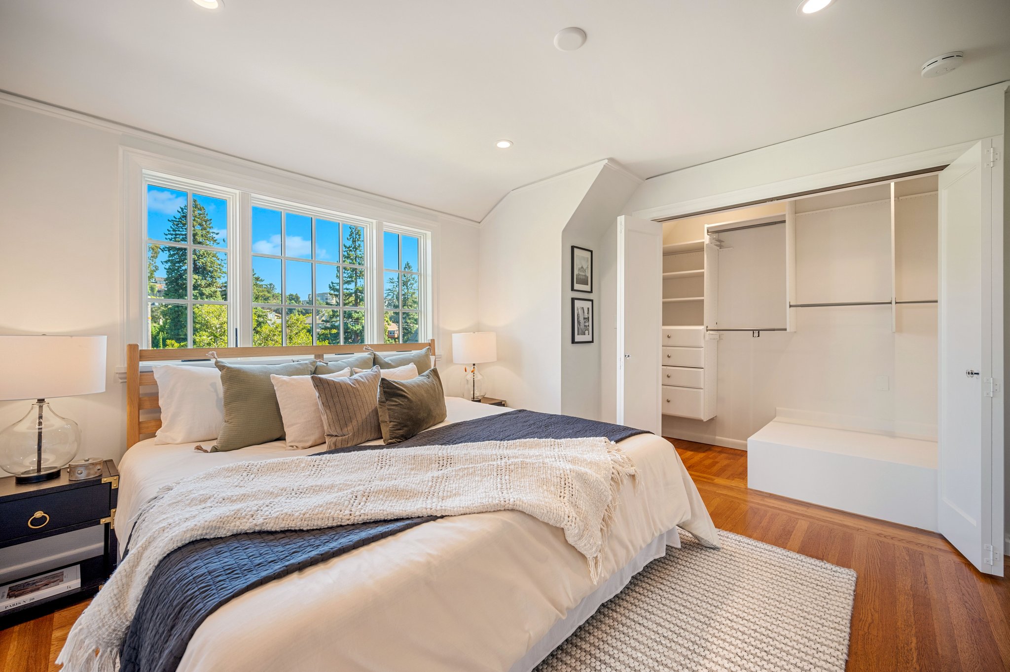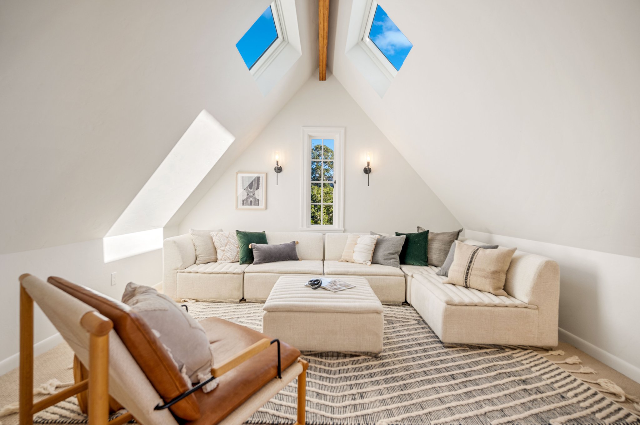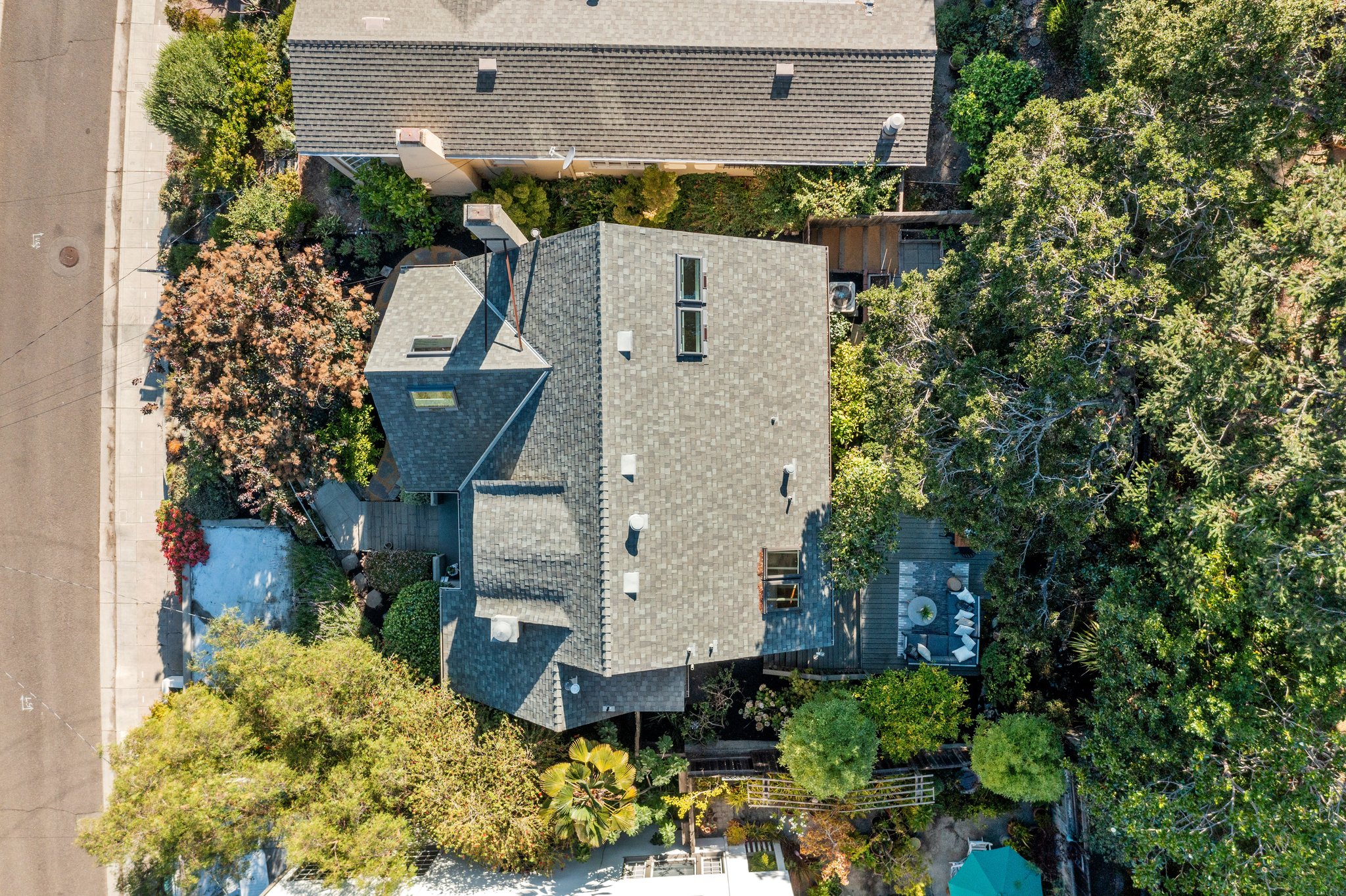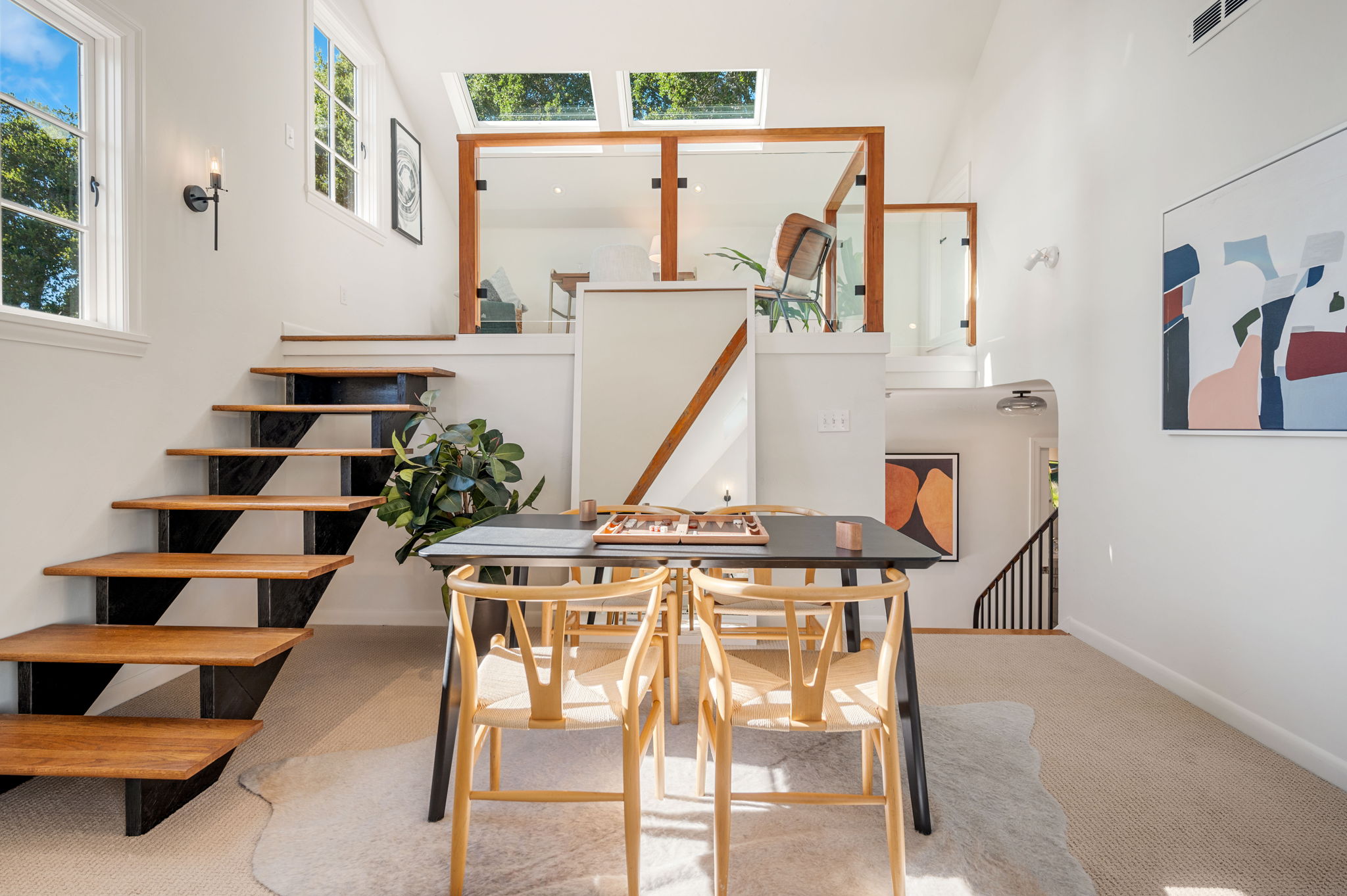 A stunning upper level loft space with elevated office combines modern elements, exposed beams and skylights making it a true flagship space. The adjacent primary suite offers wonderful vista views and a truly luxe spa bathroom, designed by Jack Backus, with stone counters, frameless glass shower and soaking tub. Down the hall, a freshly updated, RH inspired hall bath is a true delight and is situated between two additional bedrooms. Private rear garden are framed by mature plantings and offers both a level grassy area for play as well as deck for relaxation.