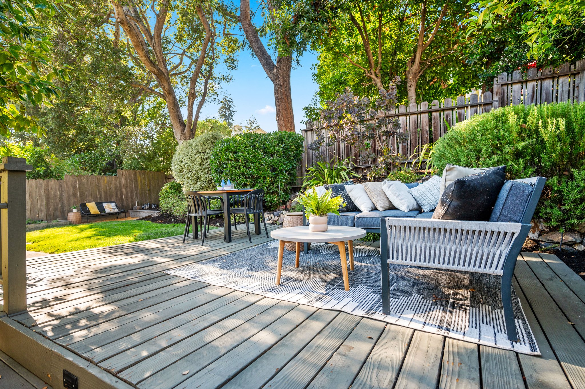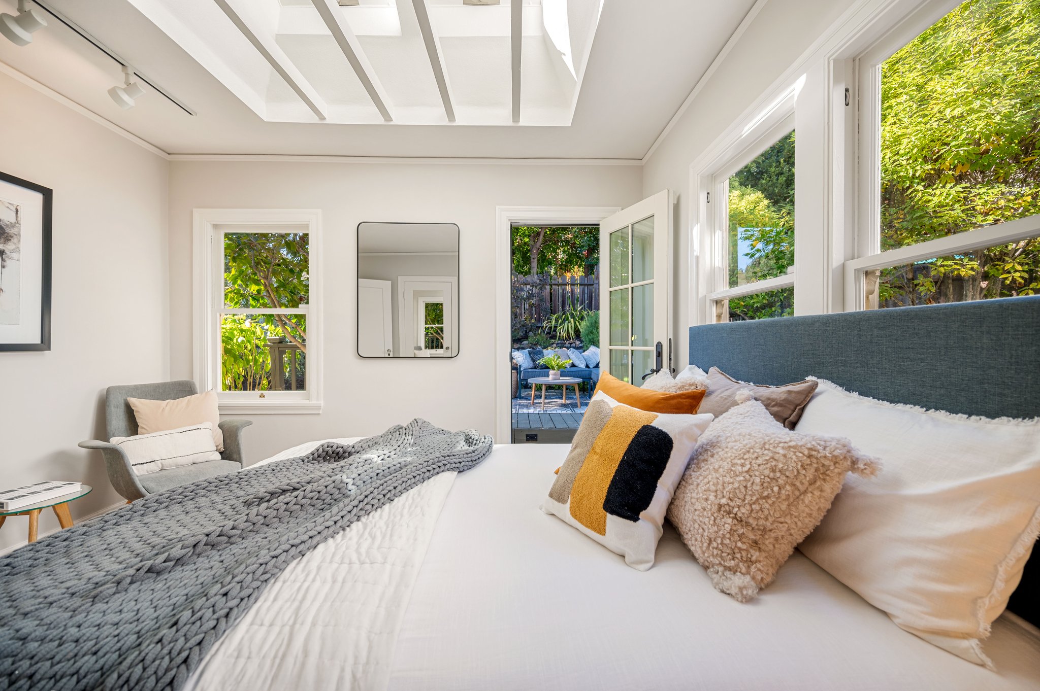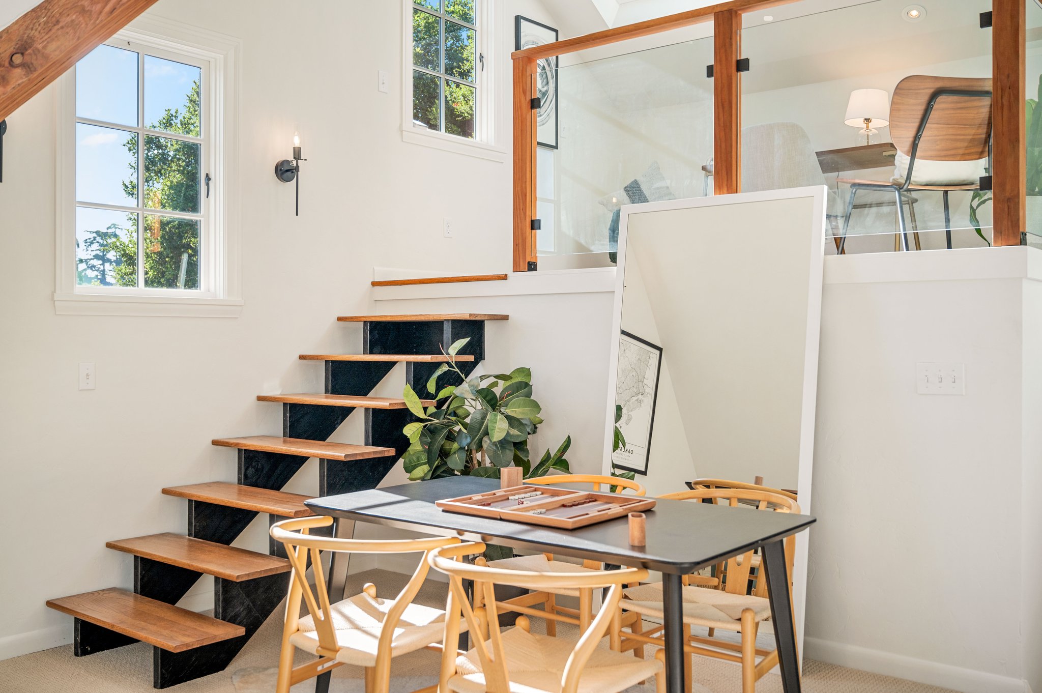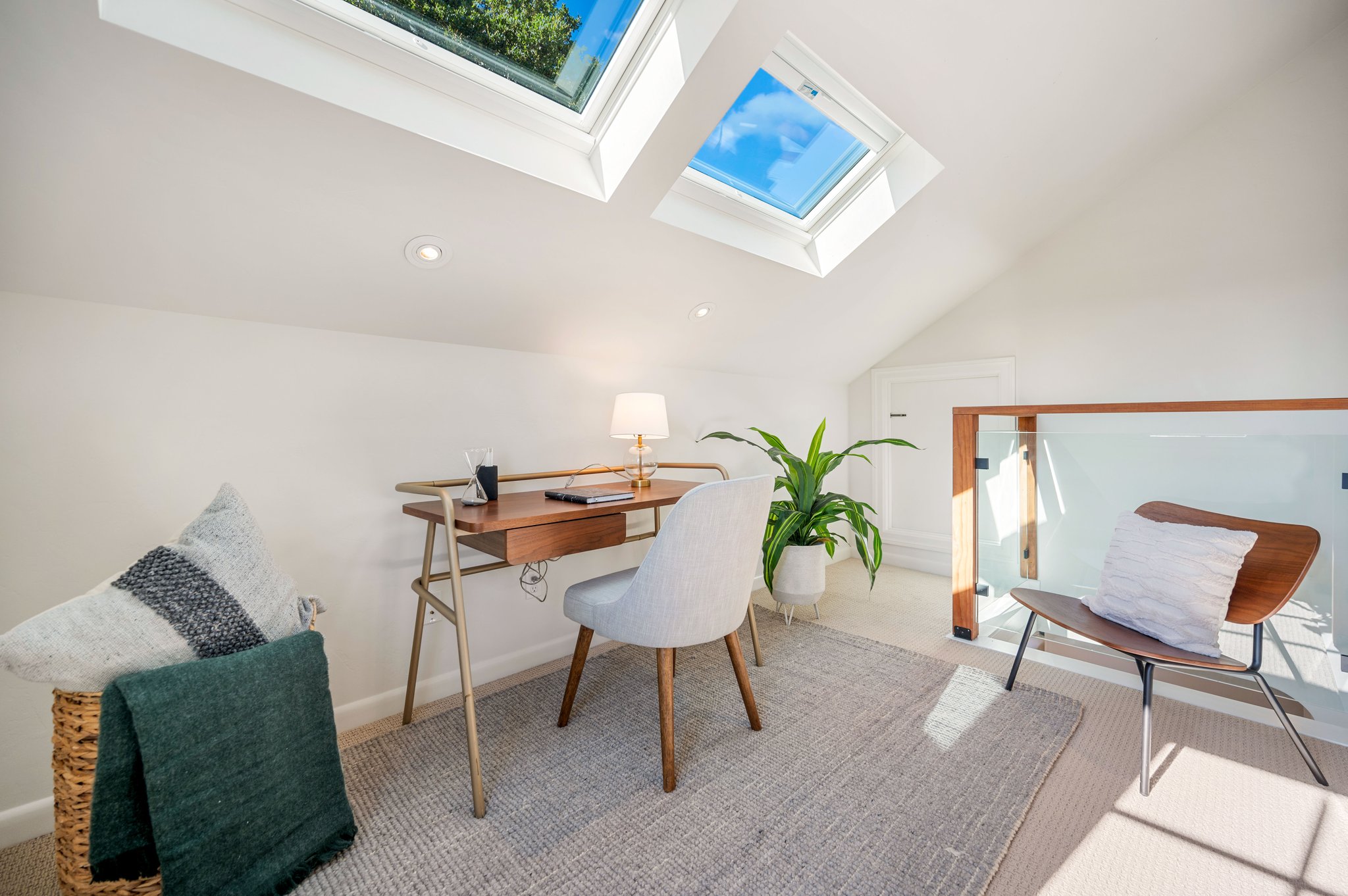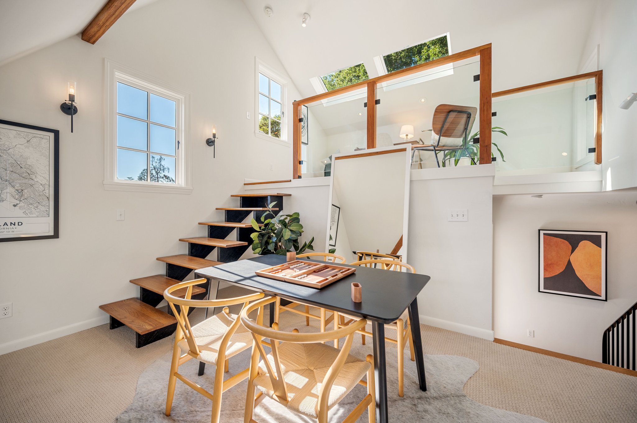 A stunning upper level loft space with elevated office combines modern elements, exposed beams and skylights making it a true flagship space. The adjacent primary suite offers wonderful vista views and a truly luxe spa bathroom, designed by Jack Backus, with stone counters, frameless glass shower and soaking tub. Down the hall, a freshly updated, RH inspired hall bath is a true delight and is situated between two additional bedrooms. Private rear garden are framed by mature plantings and offers both a level grassy area for play as well as deck for relaxation.