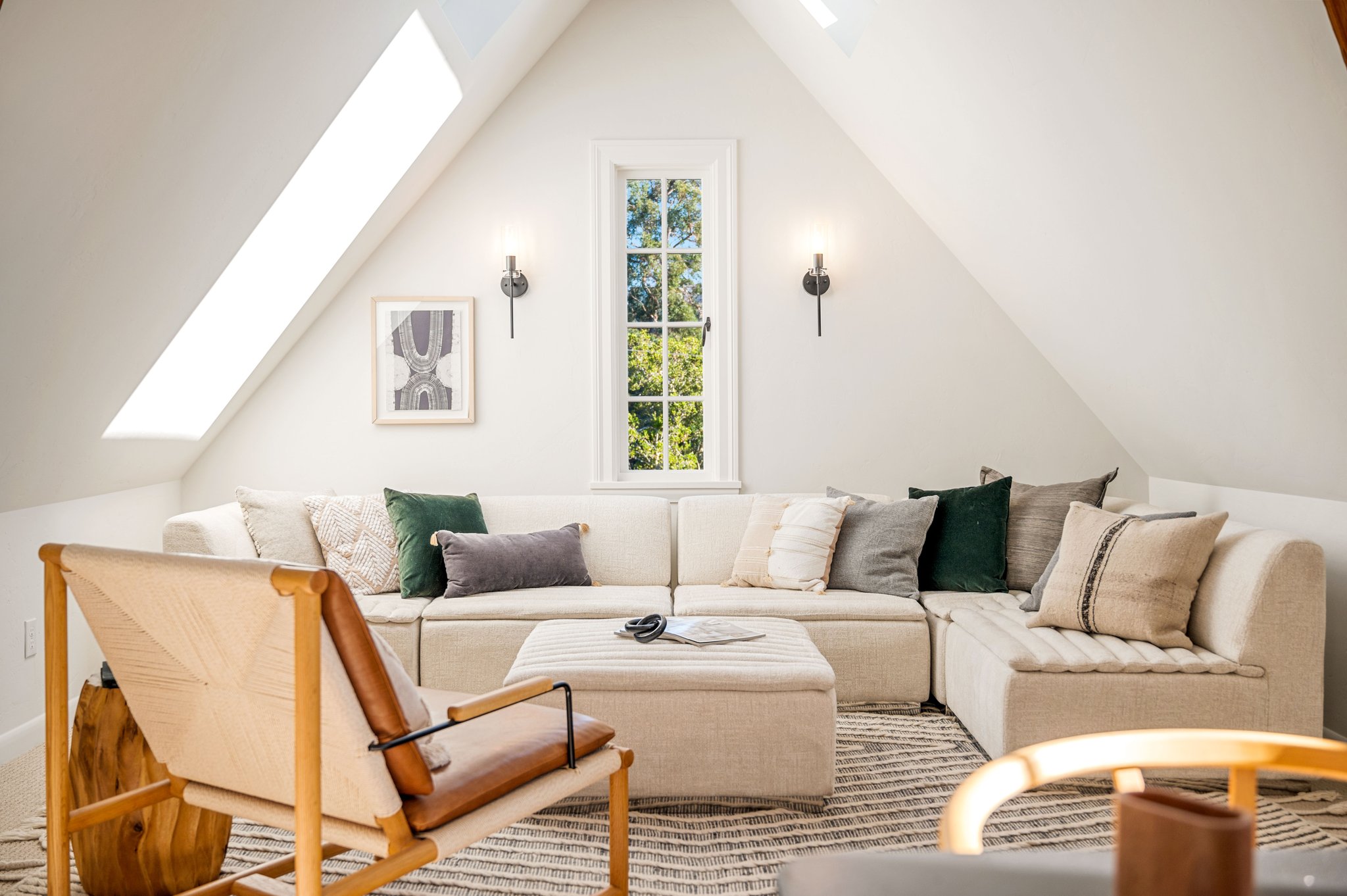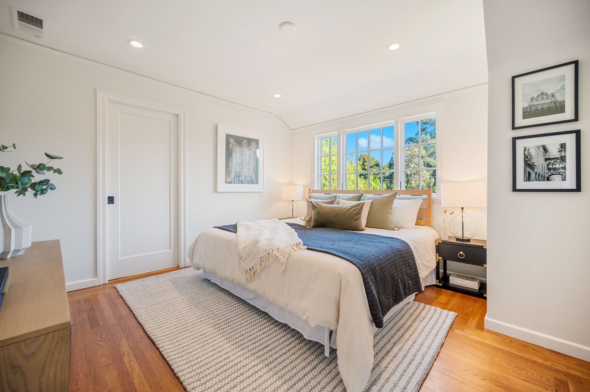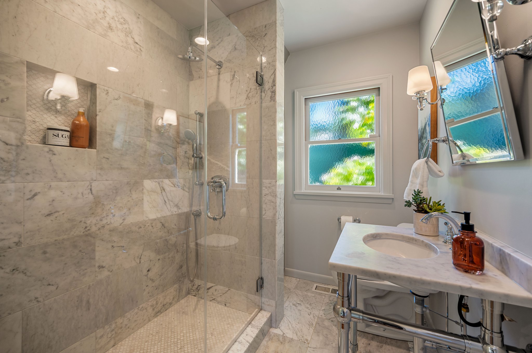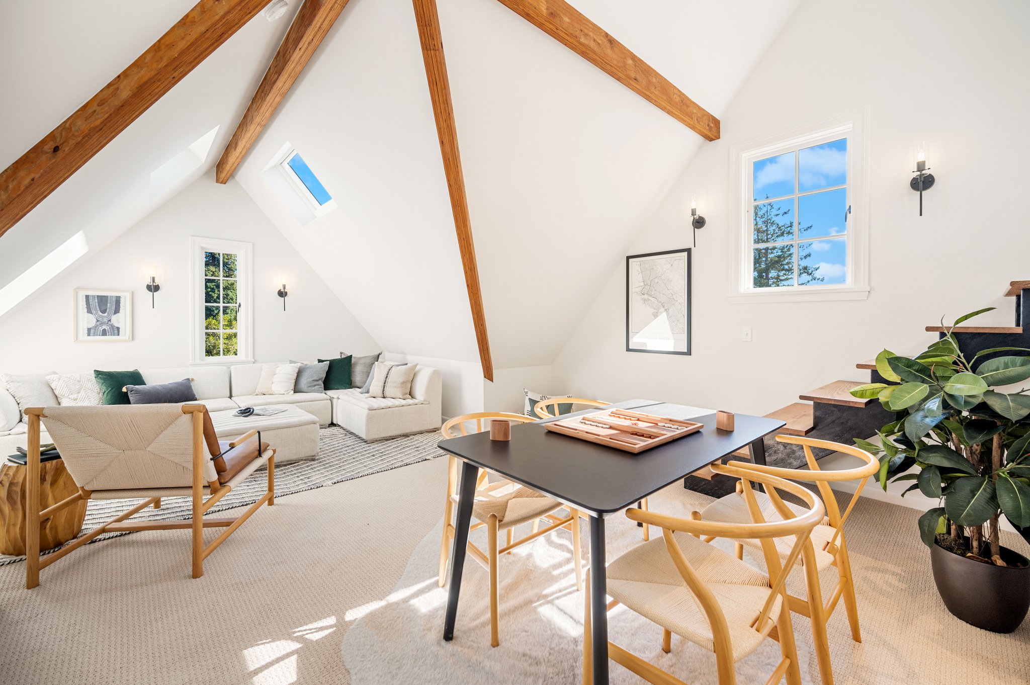 A stunning upper level loft space with elevated office combines modern elements, exposed beams and skylights making it a true flagship space. The adjacent primary suite offers wonderful vista views and a truly luxe spa bathroom, designed by Jack Backus, with stone counters, frameless glass shower and soaking tub. Down the hall, a freshly updated, RH inspired hall bath is a true delight and is situated between two additional bedrooms. Private rear garden are framed by mature plantings and offers both a level grassy area for play as well as deck for relaxation.