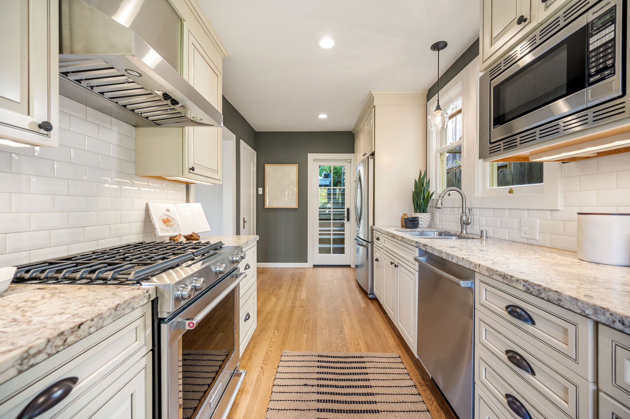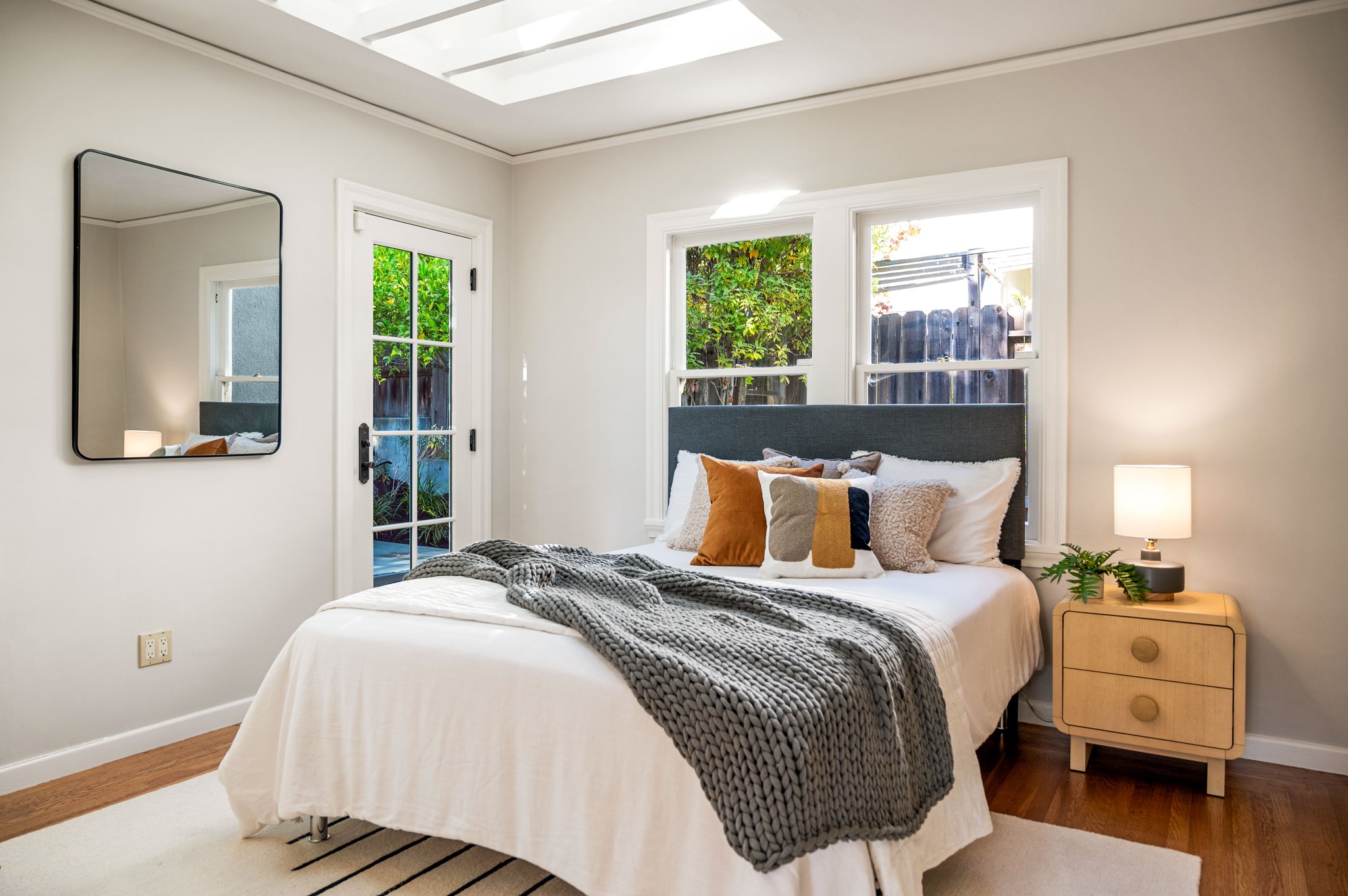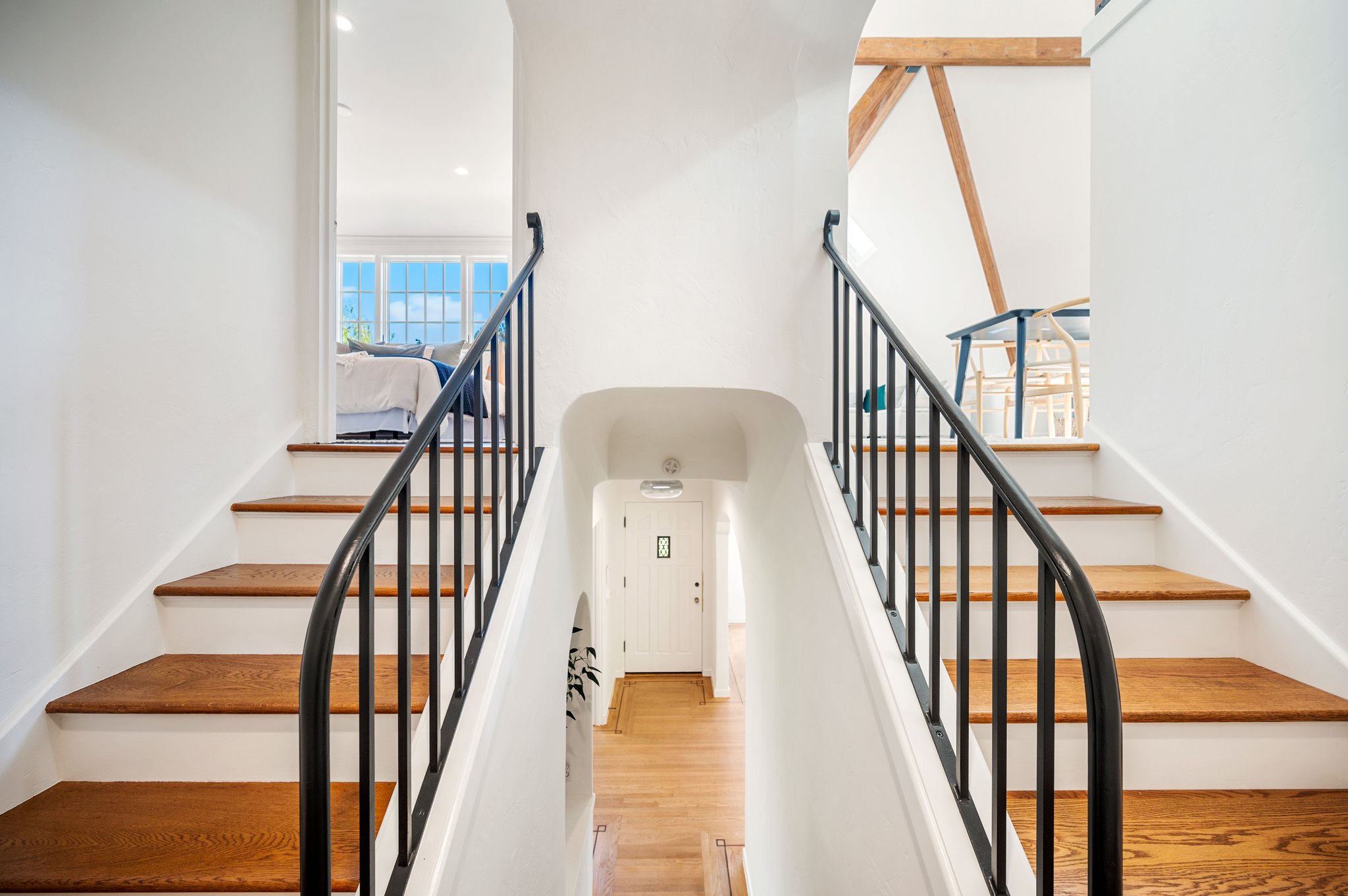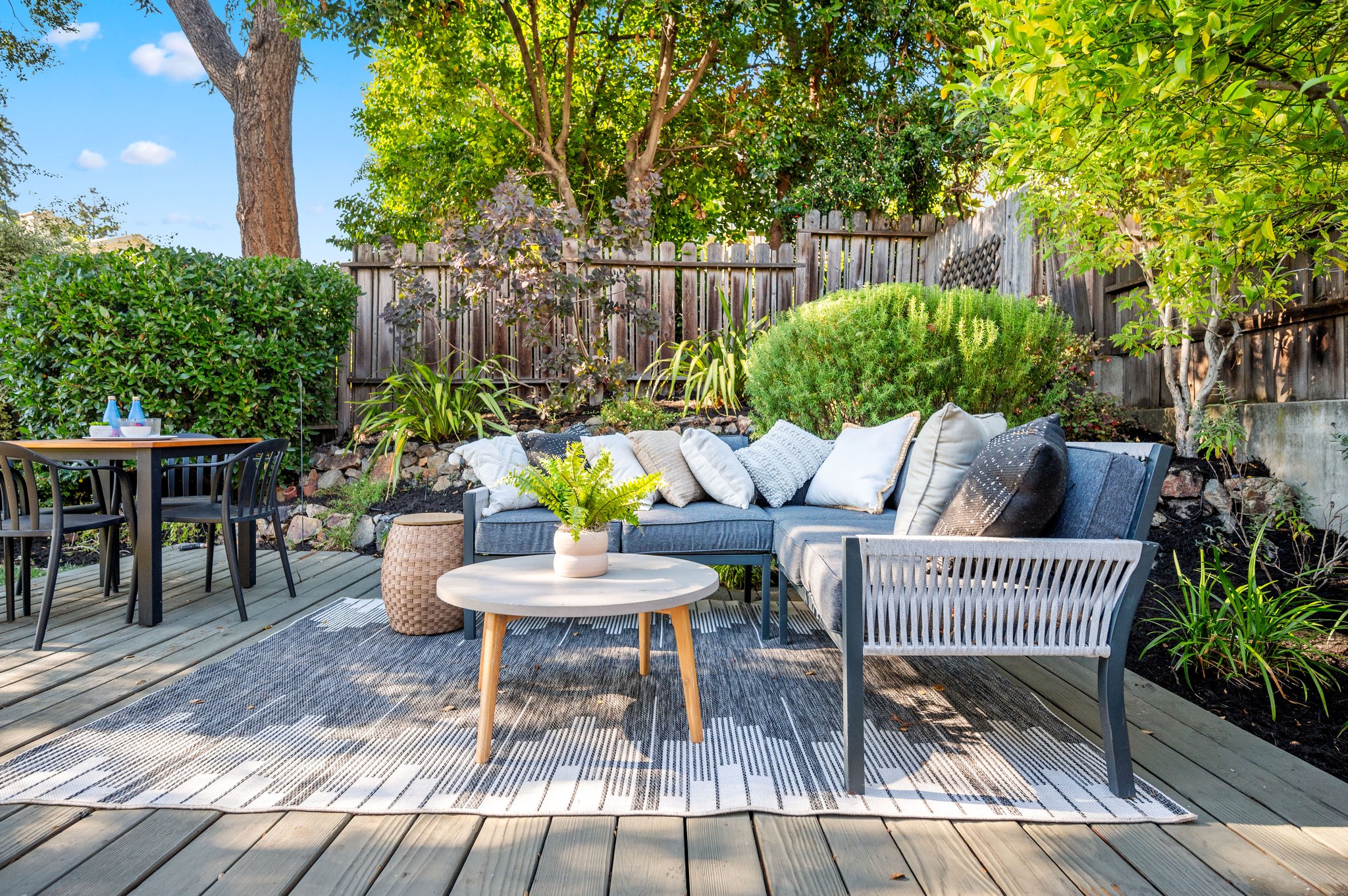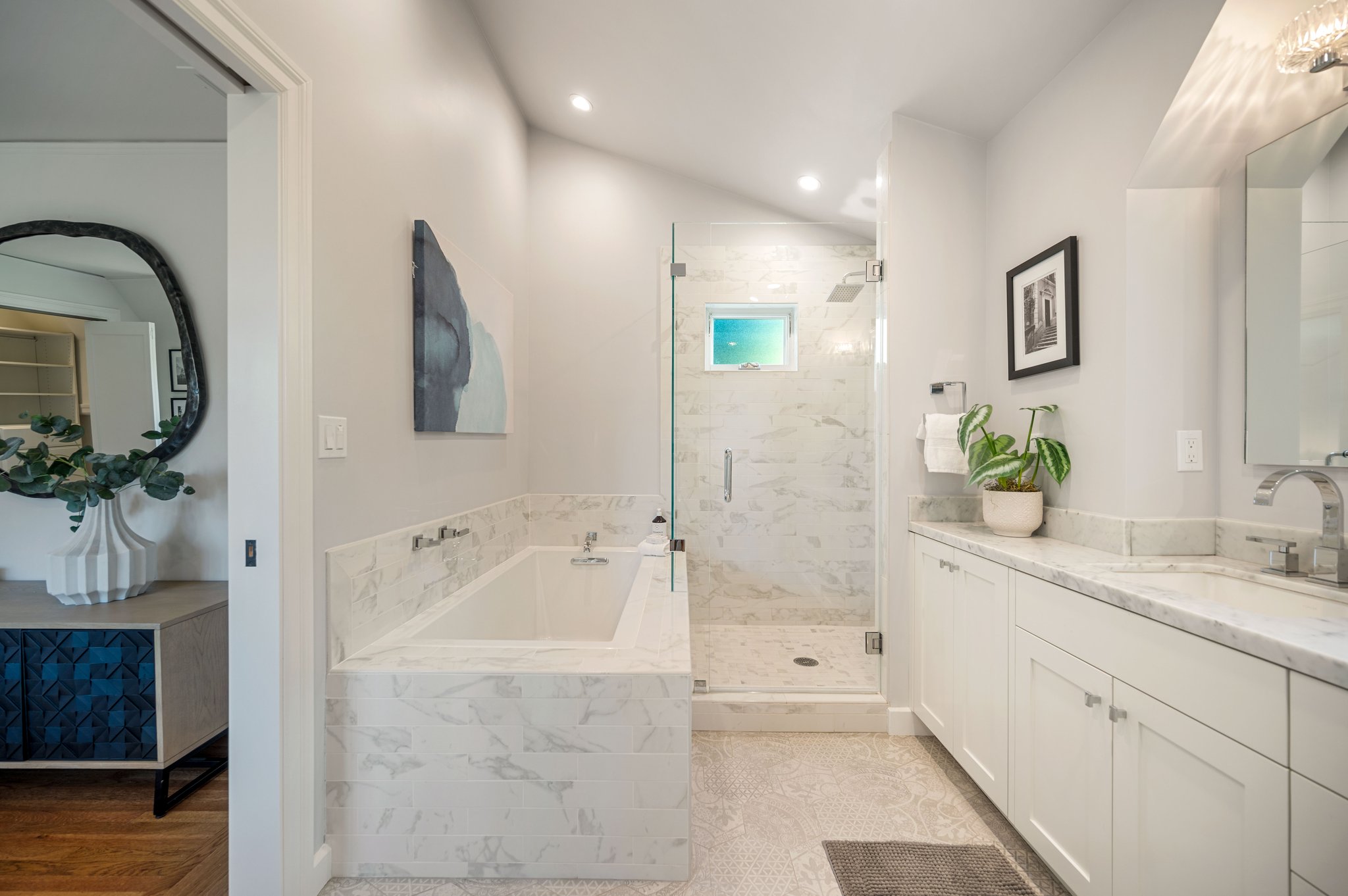 A stunning upper level loft space with elevated office combines modern elements, exposed beams and skylights making it a true flagship space. The adjacent primary suite offers wonderful vista views and a truly luxe spa bathroom, designed by Jack Backus, with stone counters, frameless glass shower and soaking tub. Down the hall, a freshly updated, RH inspired hall bath is a true delight and is situated between two additional bedrooms. Private rear garden are framed by mature plantings and offers both a level grassy area for play as well as deck for relaxation.