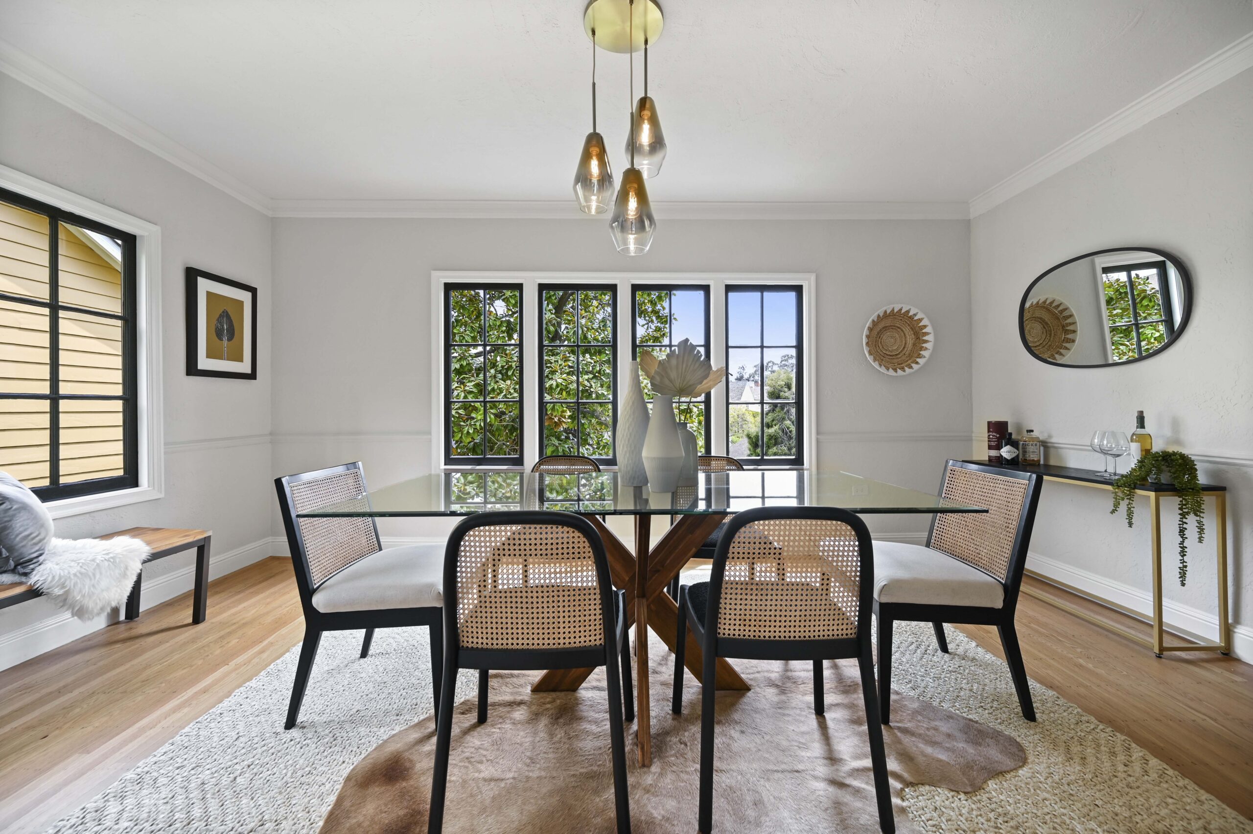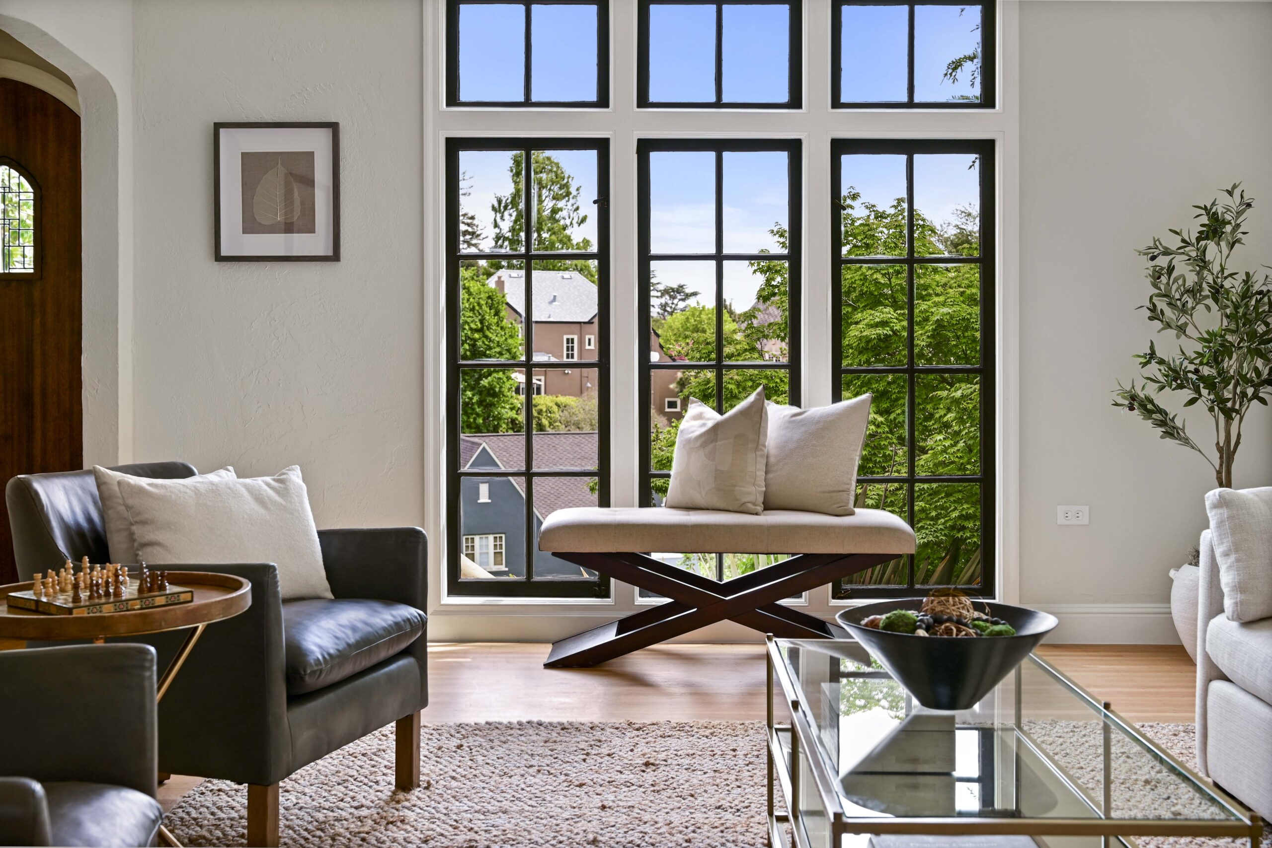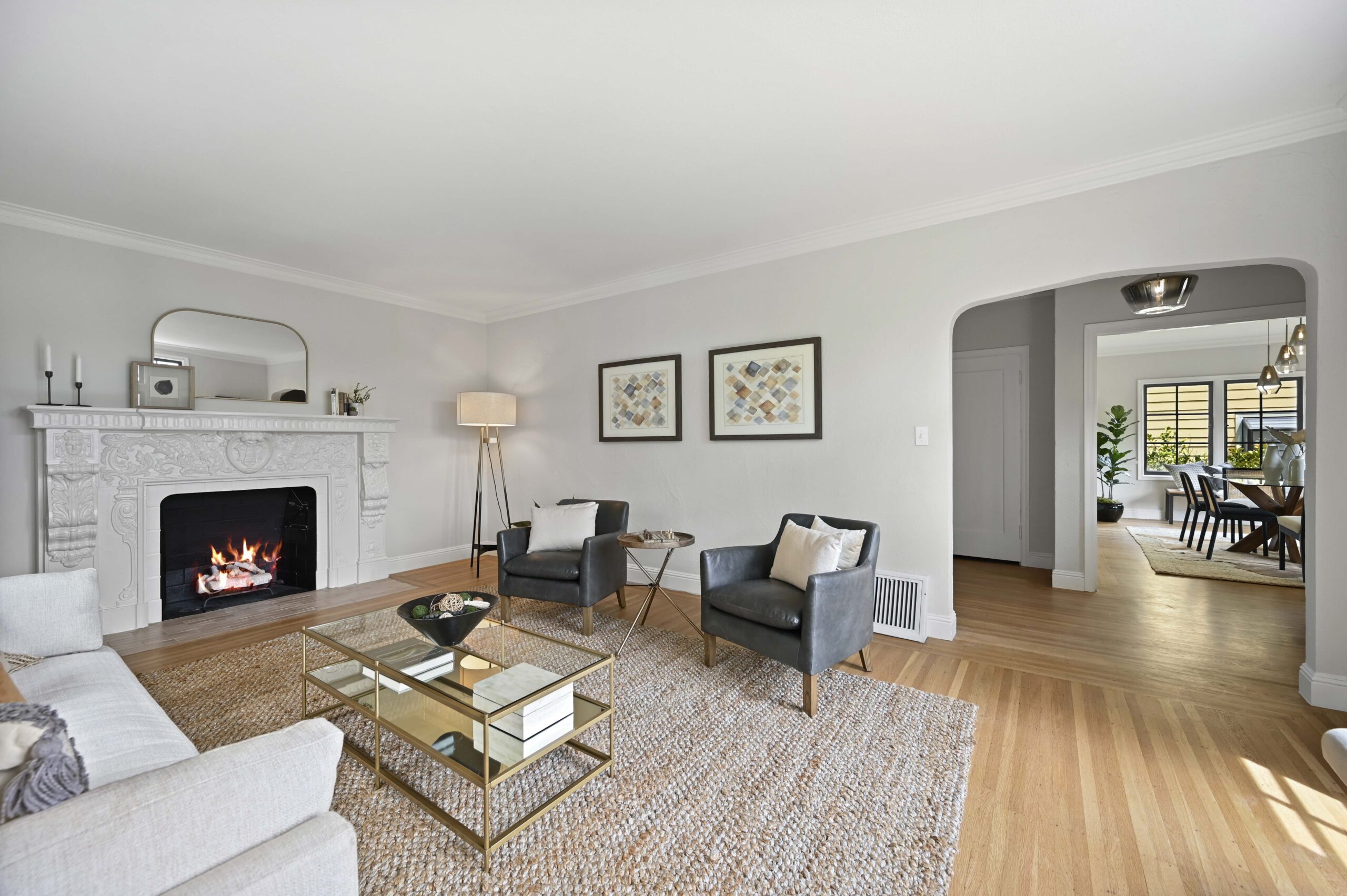 Enchanting Crocker Highlands Tudor with stunning neighborhood views! Storybook architecture blends with modern updates in this tranquil abode. Designer kitchen with stainless appliances, stone counters and custom cabinetry, with doors flowing onto the rear private patios, lawn, and gardens for entertaining and play. Formal, light-filled living and dining rooms with picture frame windows overlooking lovely neighborhood views.