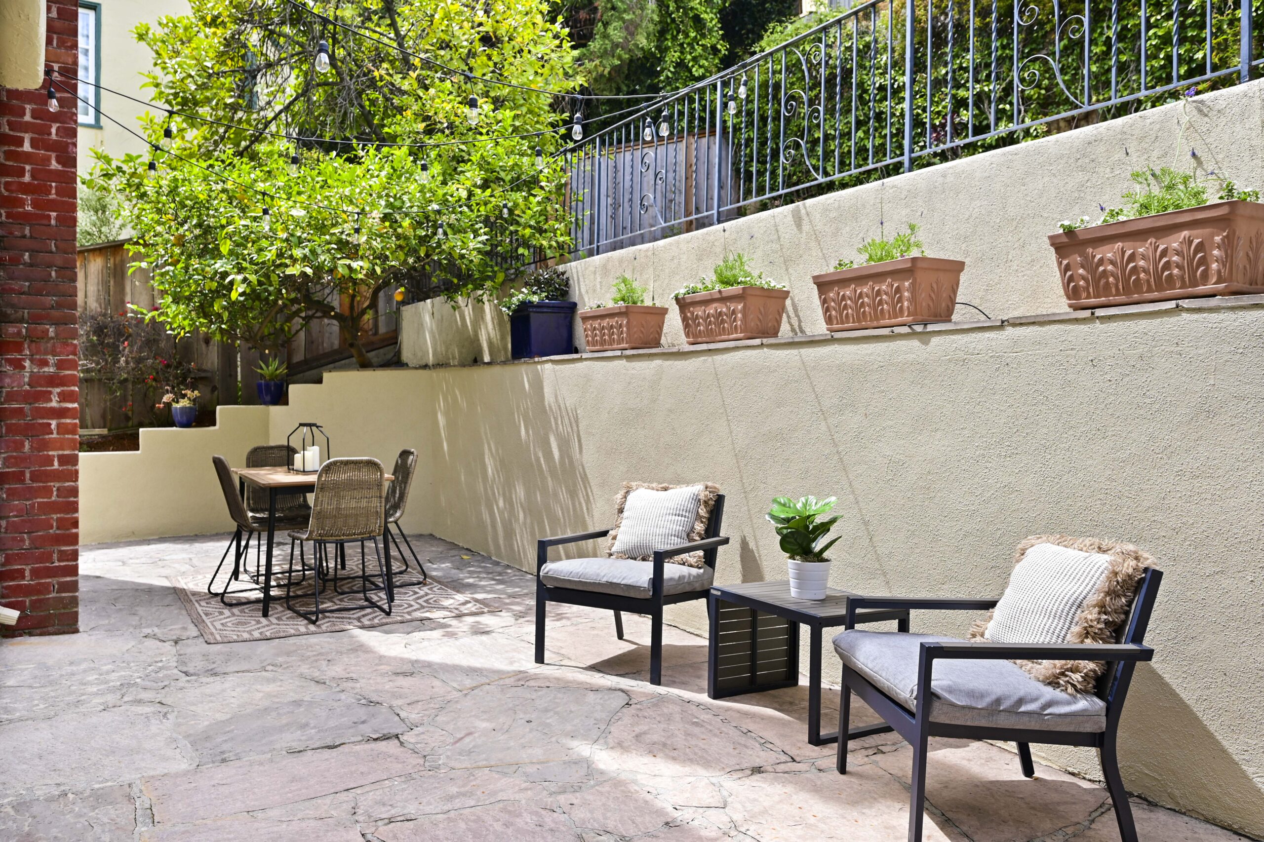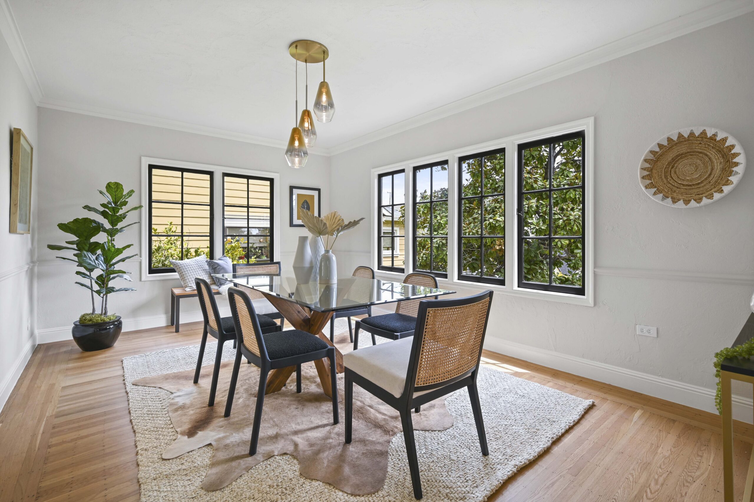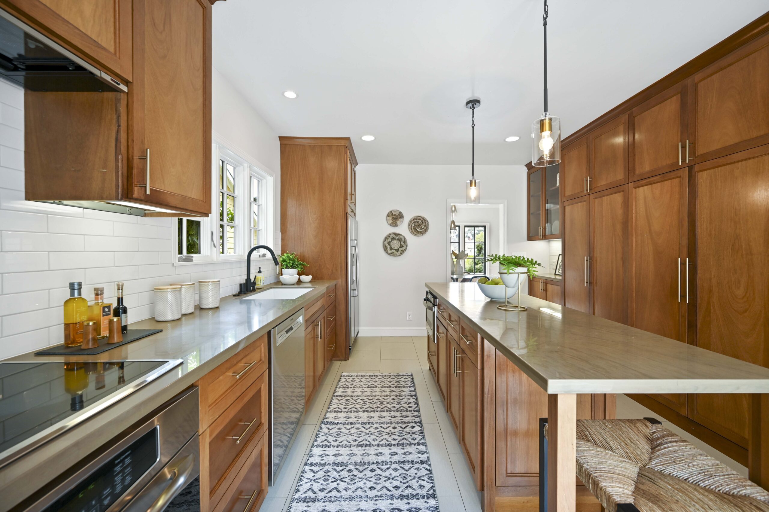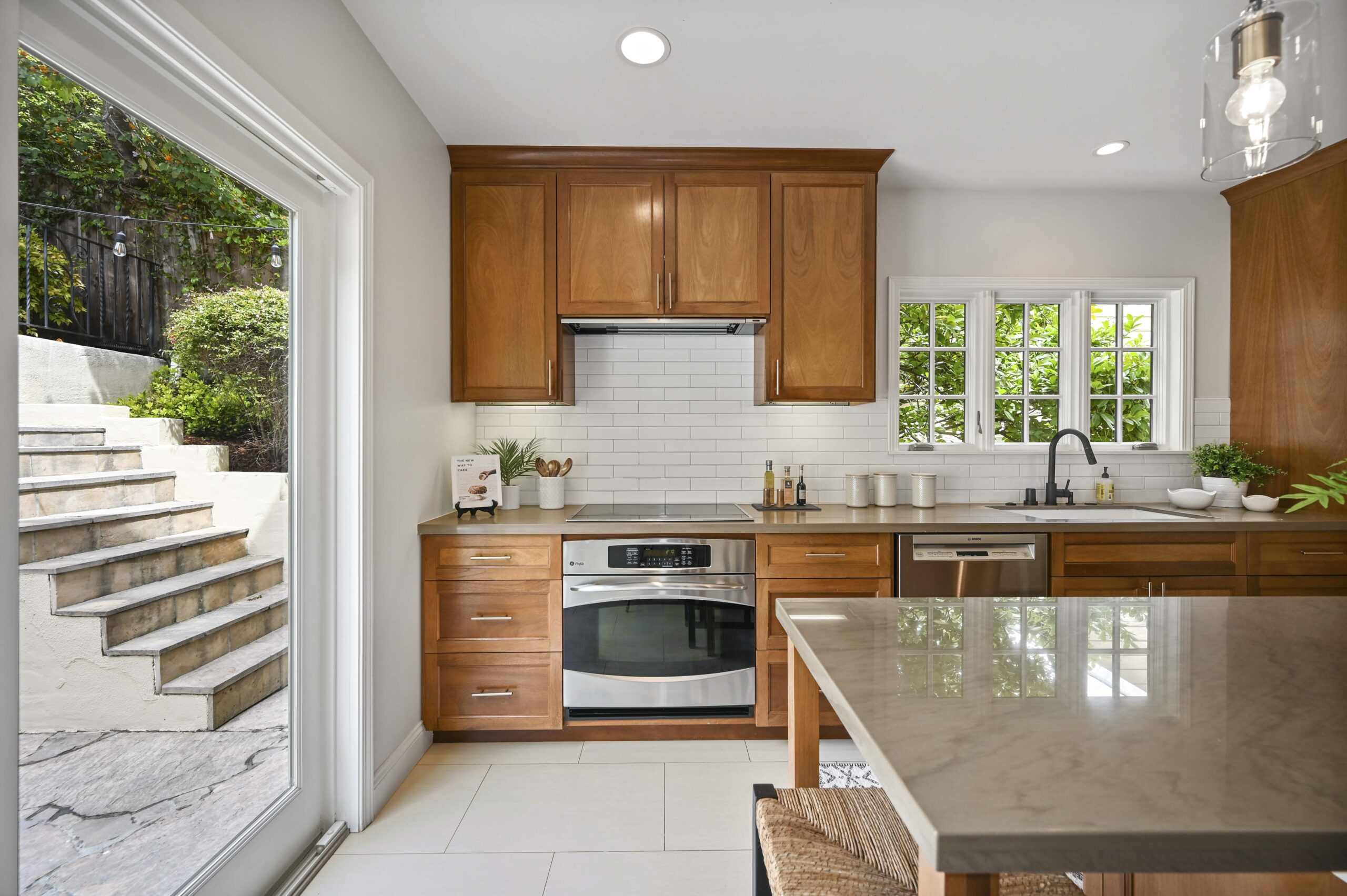 Enchanting Crocker Highlands Tudor with stunning neighborhood views! Storybook architecture blends with modern updates in this tranquil abode. Designer kitchen with stainless appliances, stone counters and custom cabinetry, with doors flowing onto the rear private patios, lawn, and gardens for entertaining and play. Formal, light-filled living and dining rooms with picture frame windows overlooking lovely neighborhood views.